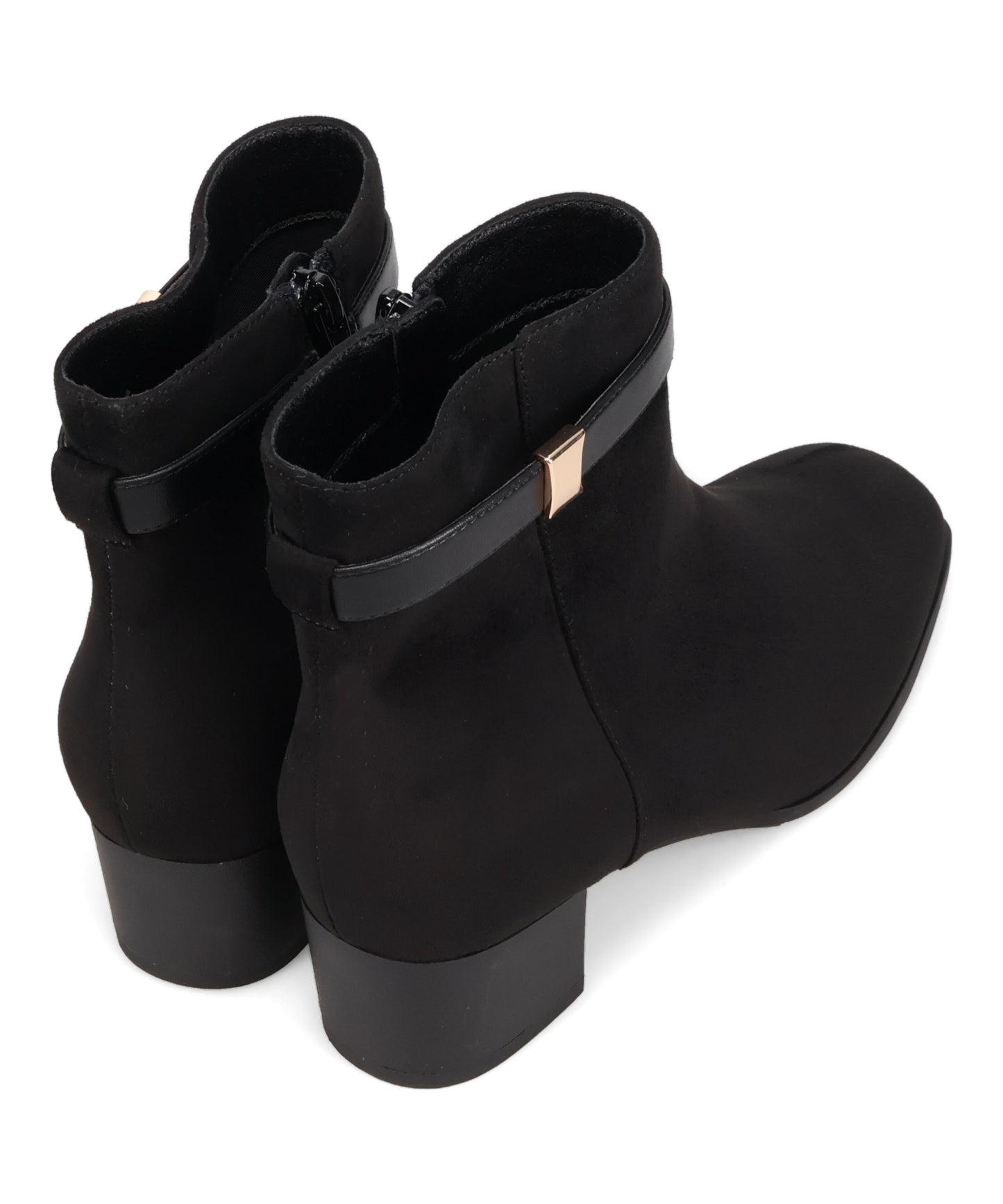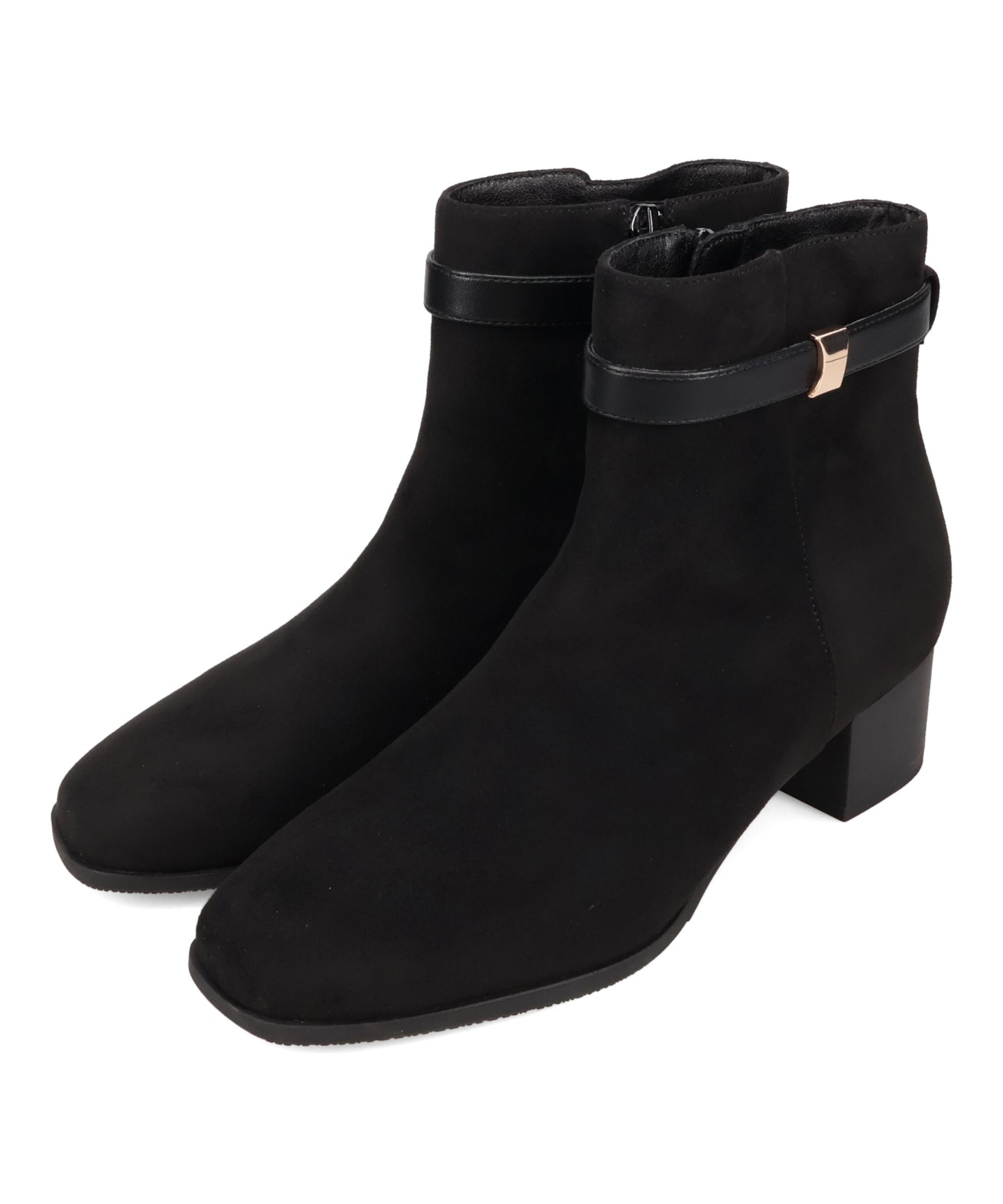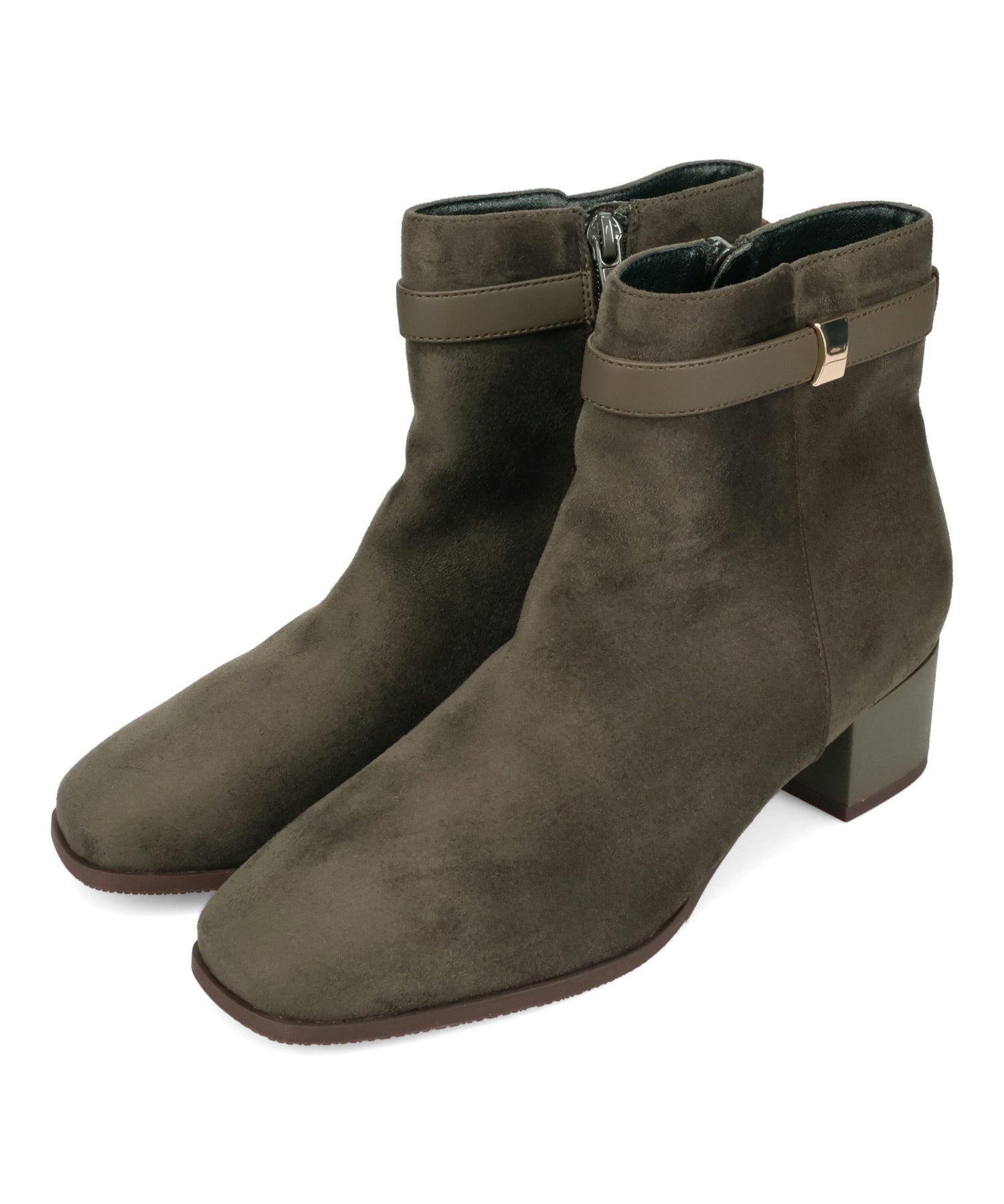 柔らかな印象のスエード素材のアッパーに、スムース素材のベルトデザインでメリハリをプラスしたブーツ。サイドに施した金具モチーフに、塗装したオーバーヒール、ほんのり丸みのあるスクエアトゥなど高見えするディテールやフォルムにもこだわった1足。足裏にしっかり感じる厚手クッションが入ったインソールで疲れにくく、安心して履ける仕様に。