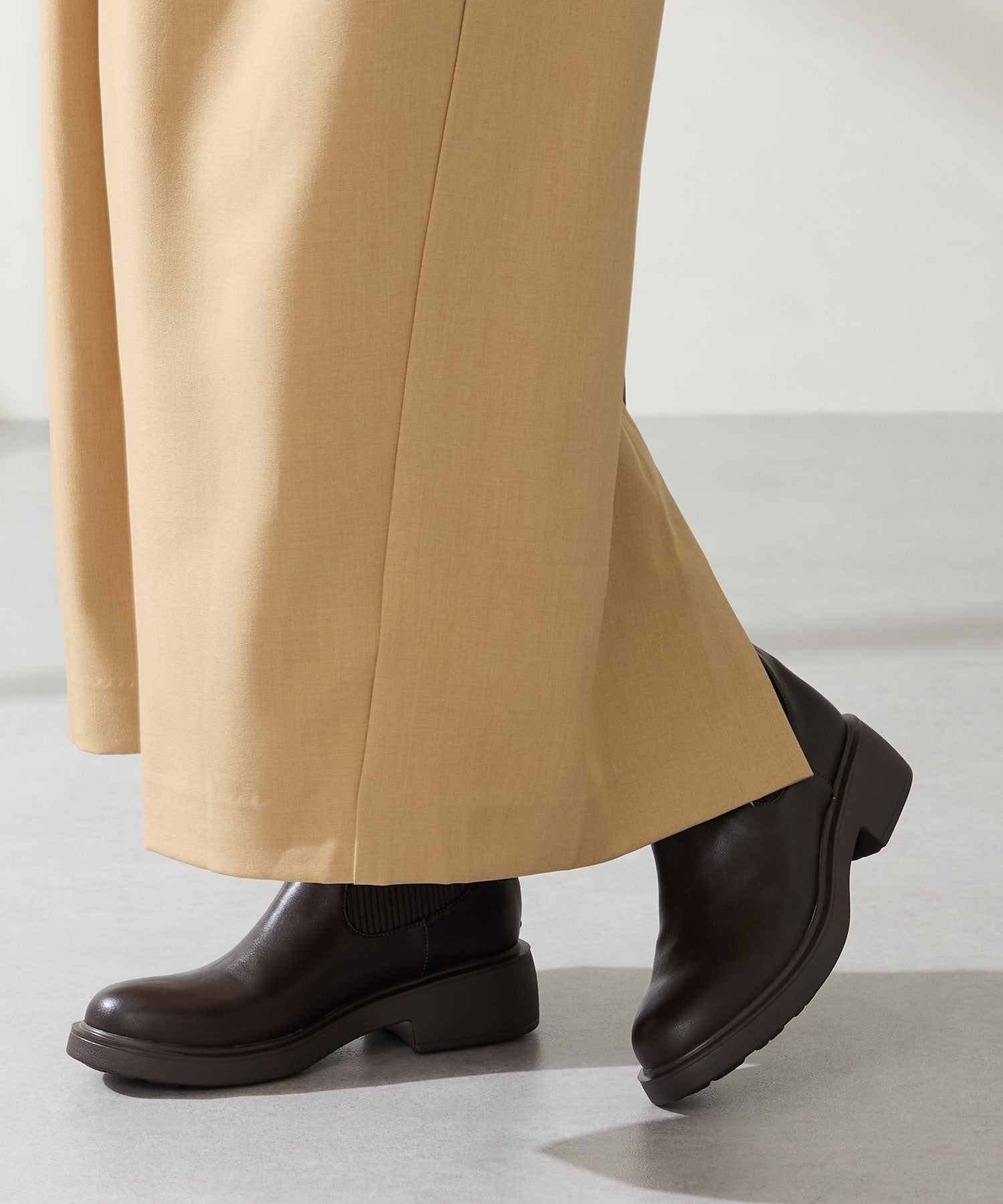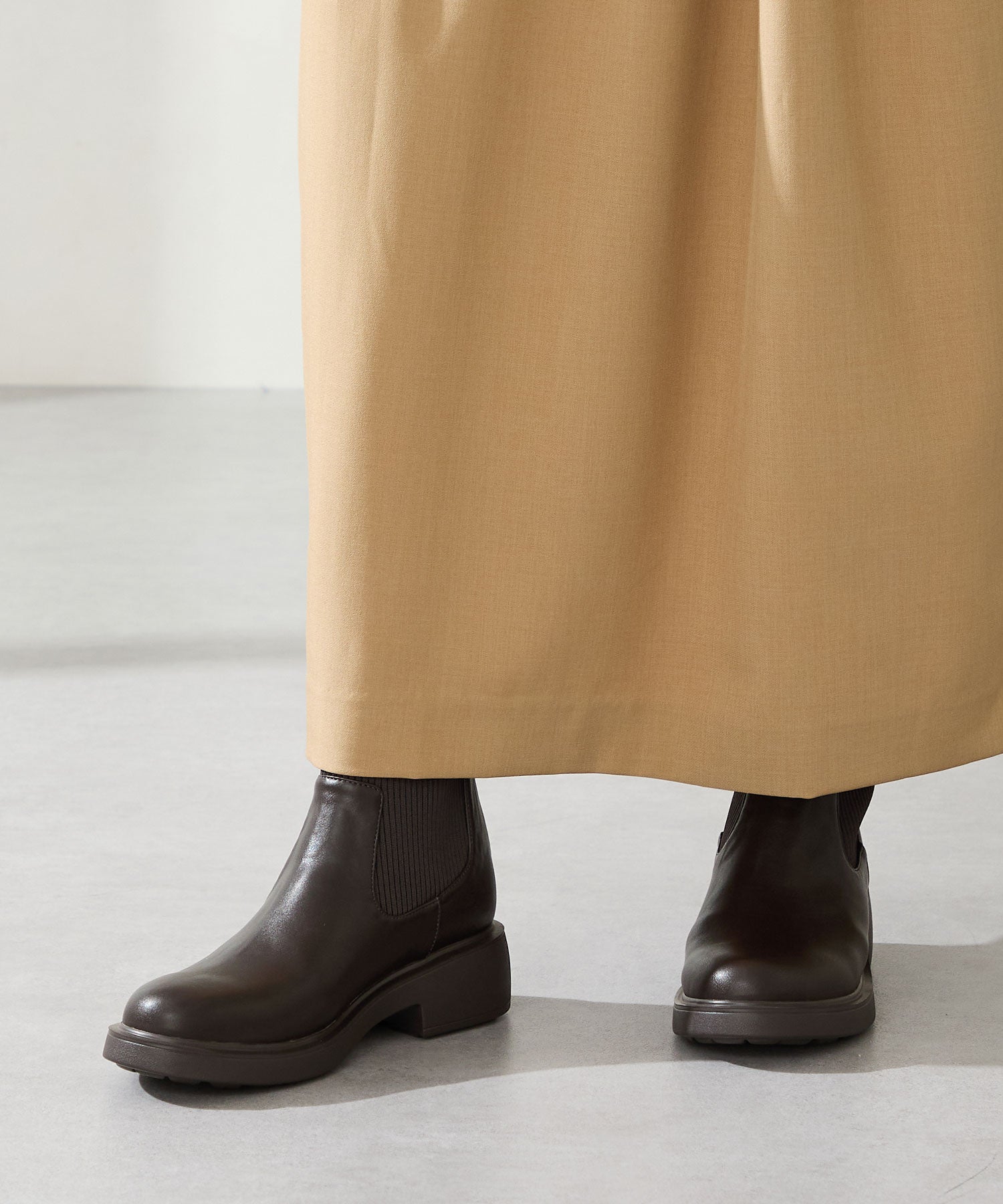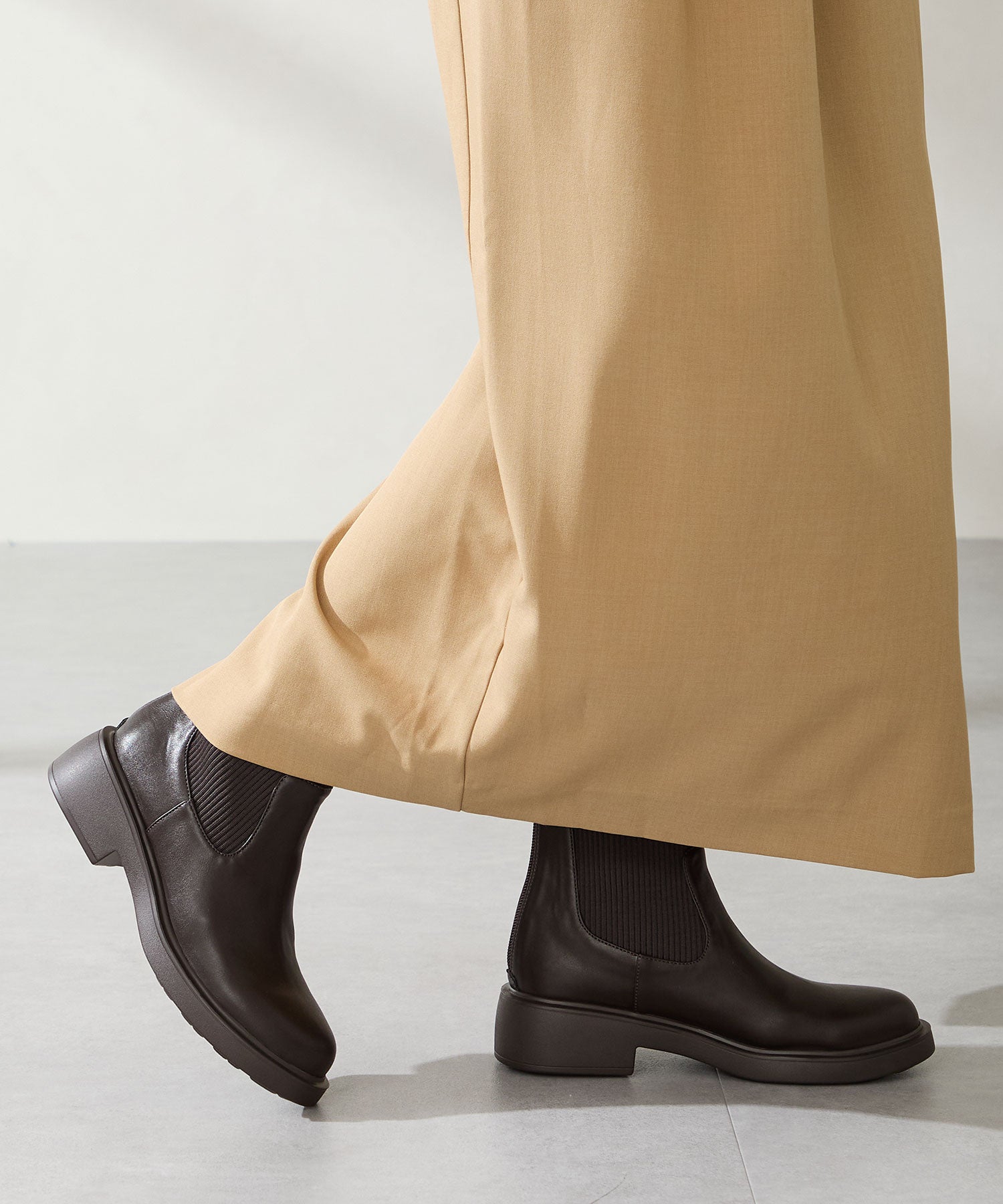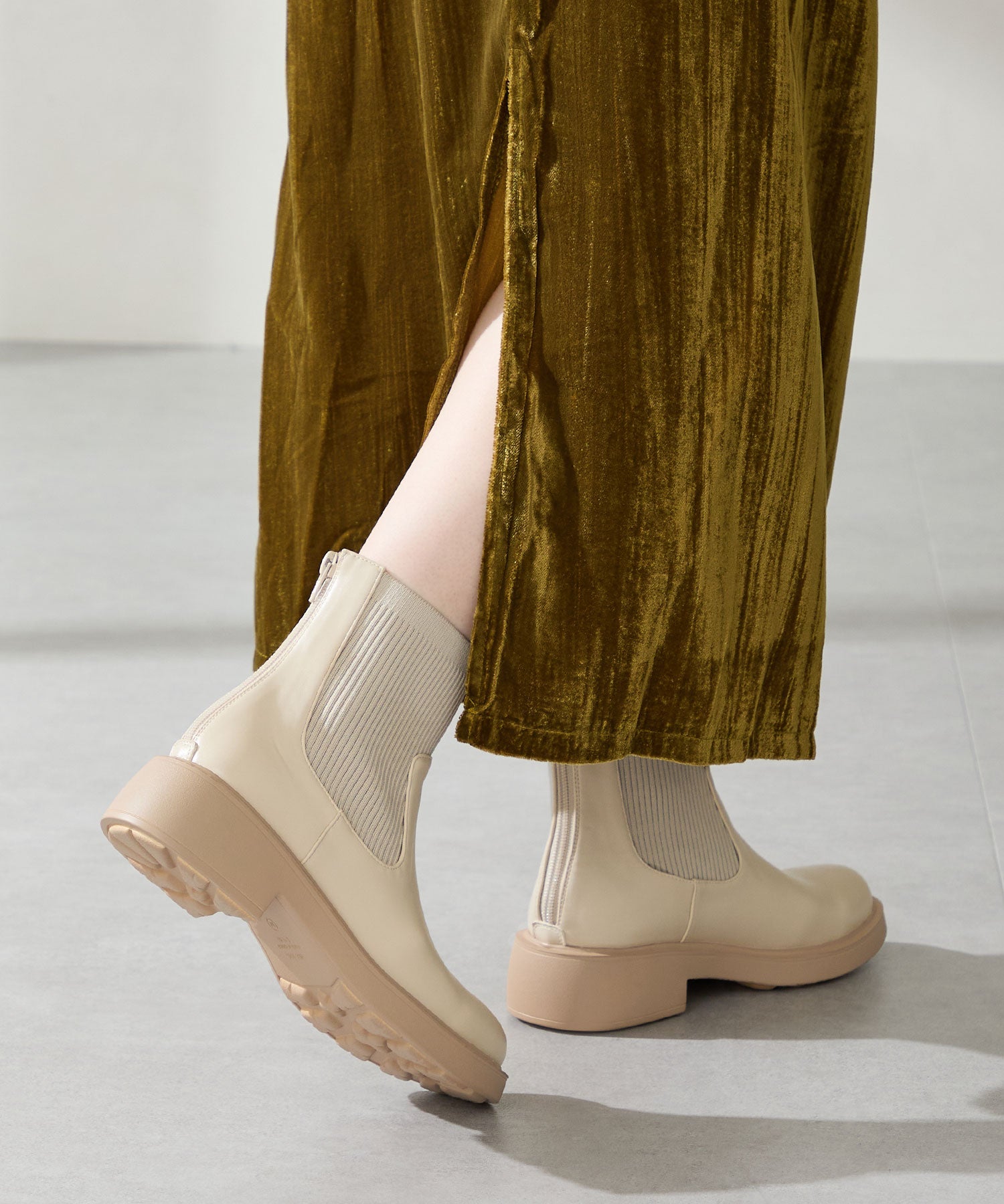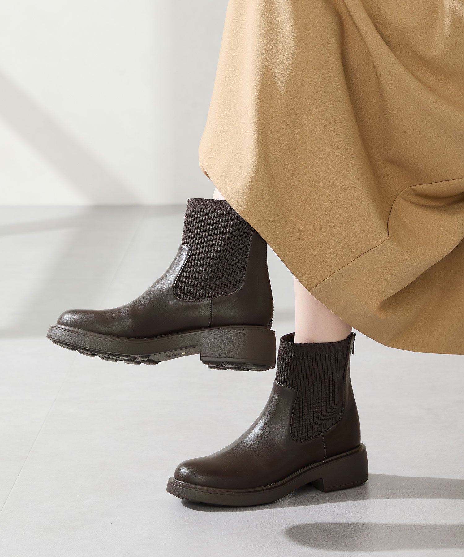伸縮性のある柔らかなニット素材で足首周りのストレスフリーな履き心地を実現させたブーツ。程よいボリュームの厚底ソールは、軽いので疲れにくく、凹凸を付けたクッション入りのインソールで足裏の負担も軽減。バックファスナー仕様で着脱しやすく、後ろ姿からも縦のラインを綺麗に見せてくれる。絶妙な丈感が幅広いスタイリングにマッチしてくれる万能アイテム。