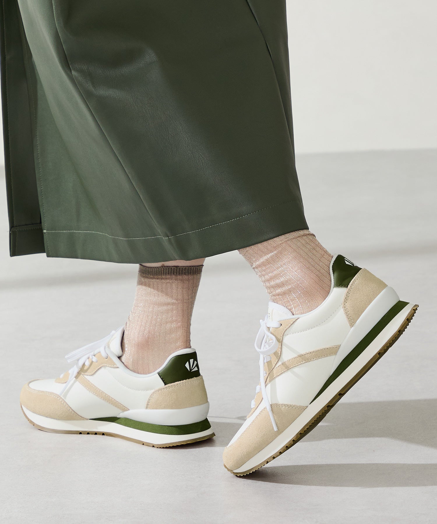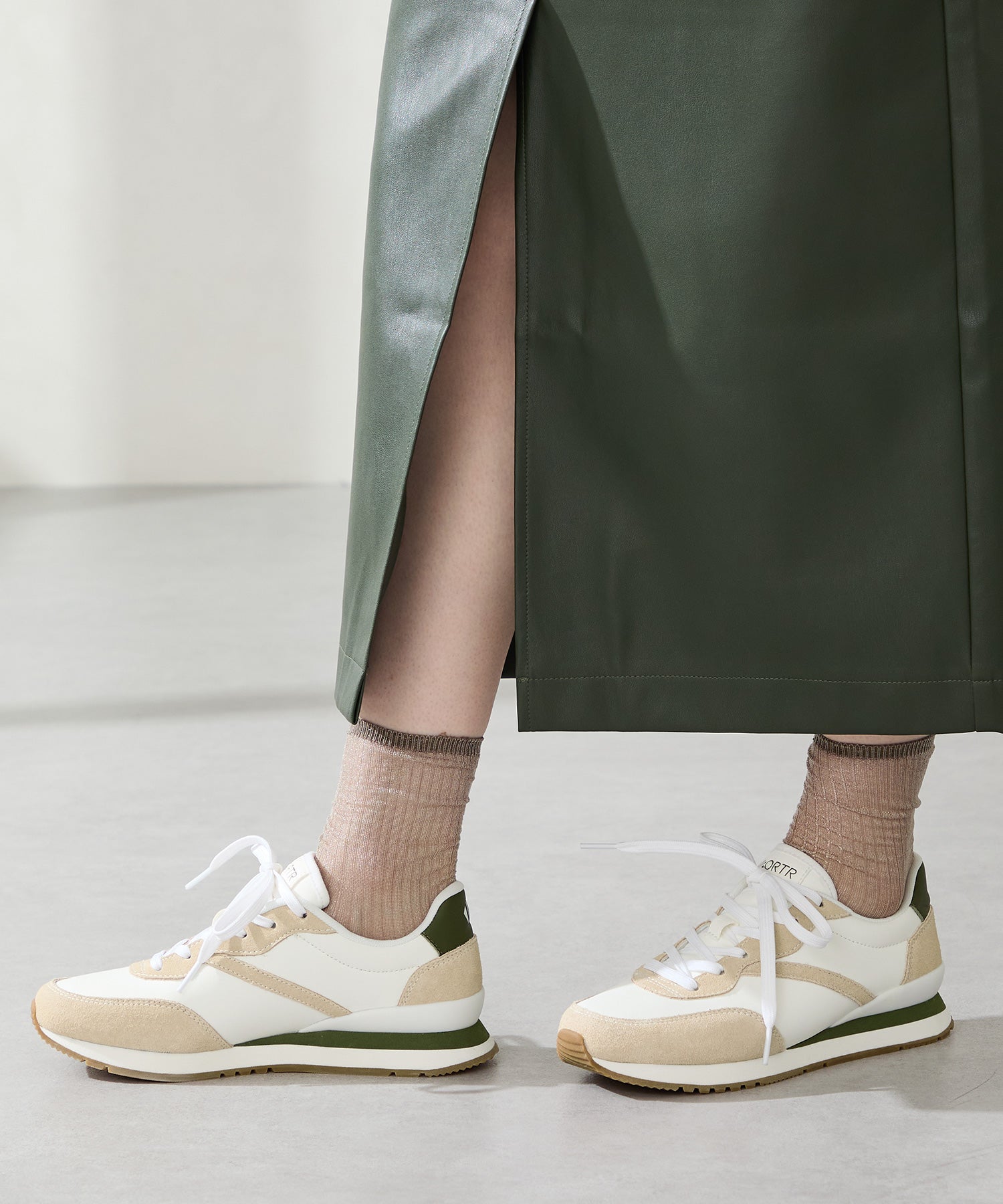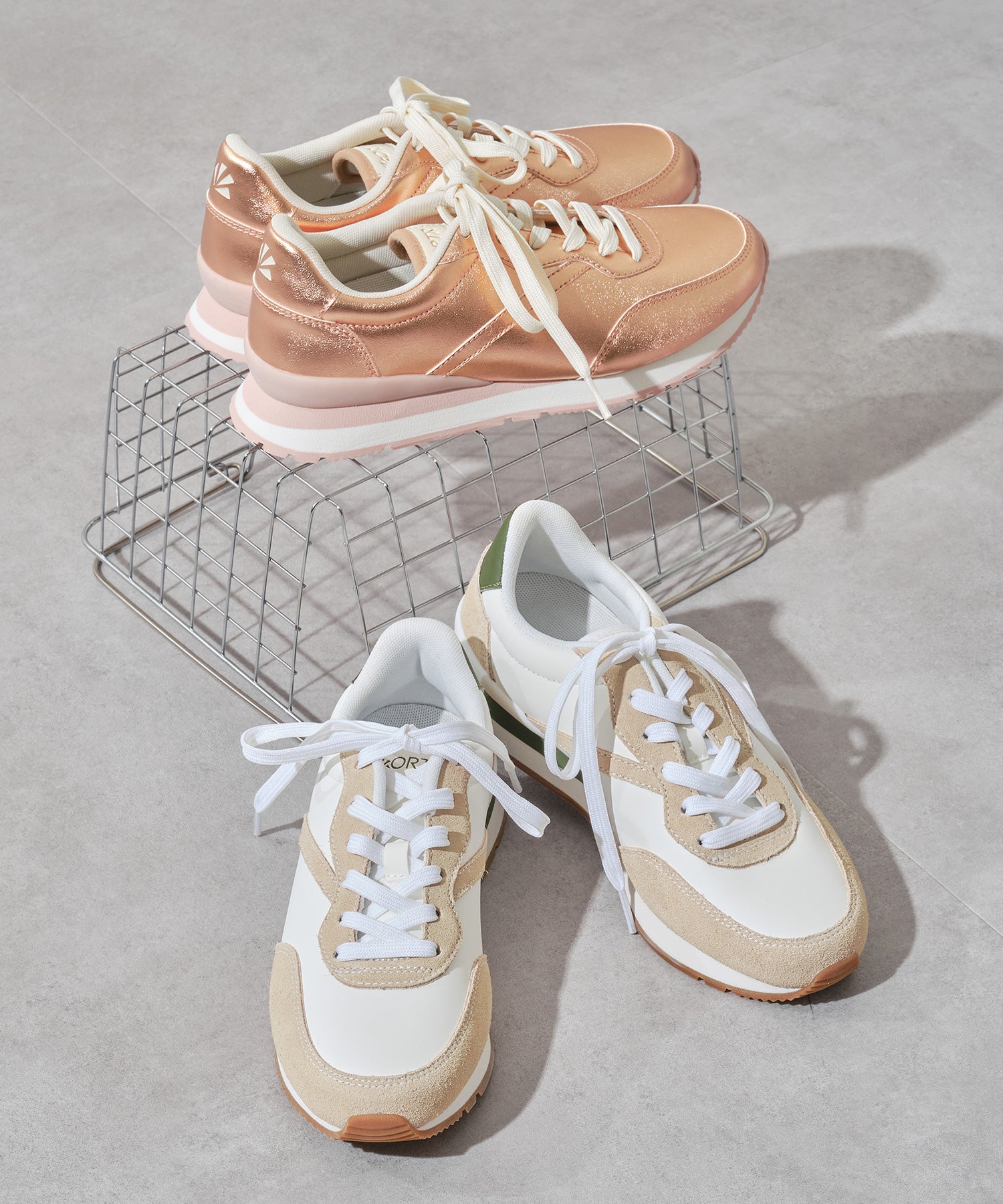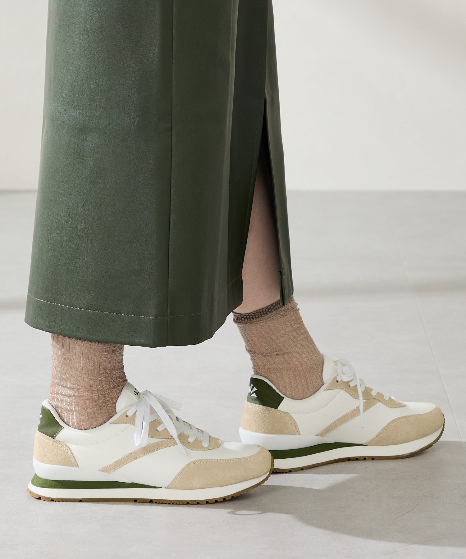台形にカットされた特徴的なソールのスニーカーはどこかレトロな雰囲気のアイテム。フラットソールでミニマムなシルエットと計算された切替パーツの配置が洗練された都会的な印象にしてくれる。ワントーンでまとめながらパーツごとの素材違いを楽しめるベージュはヒール部分に差した鮮やかなグリーンがポイントに。エッジの利いたメタリックカラーのピンクは他とは被らない個性を出せるカラー。