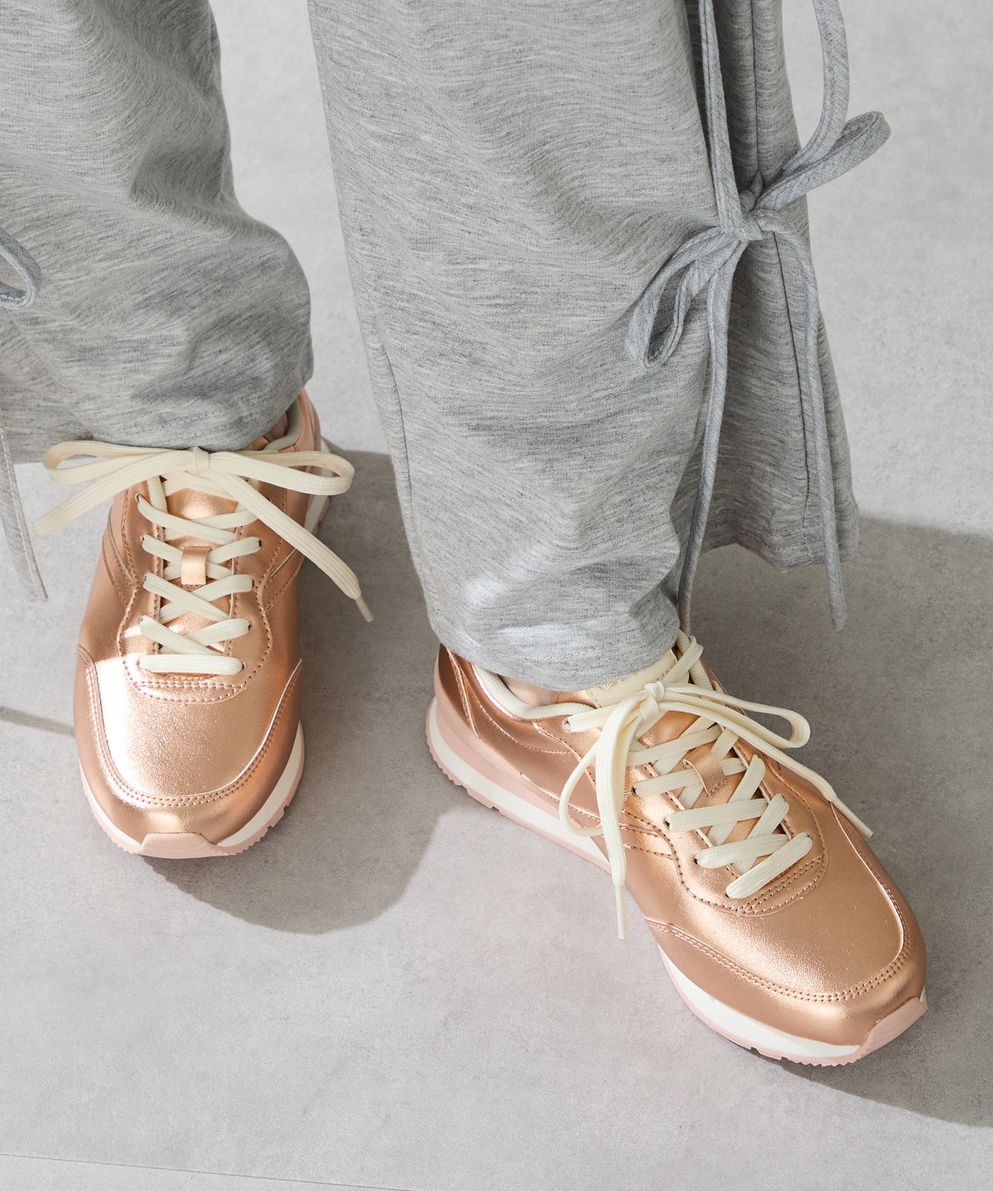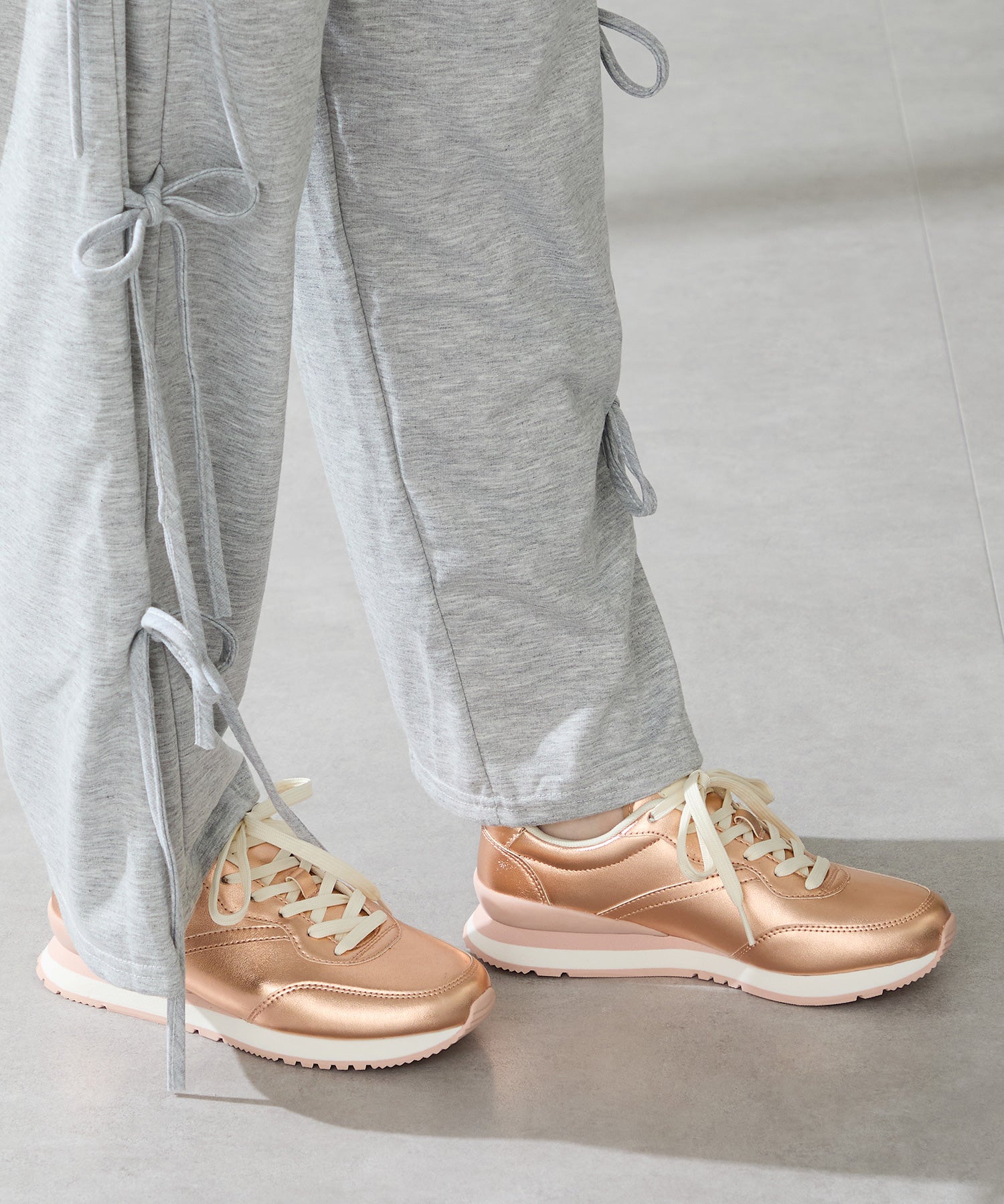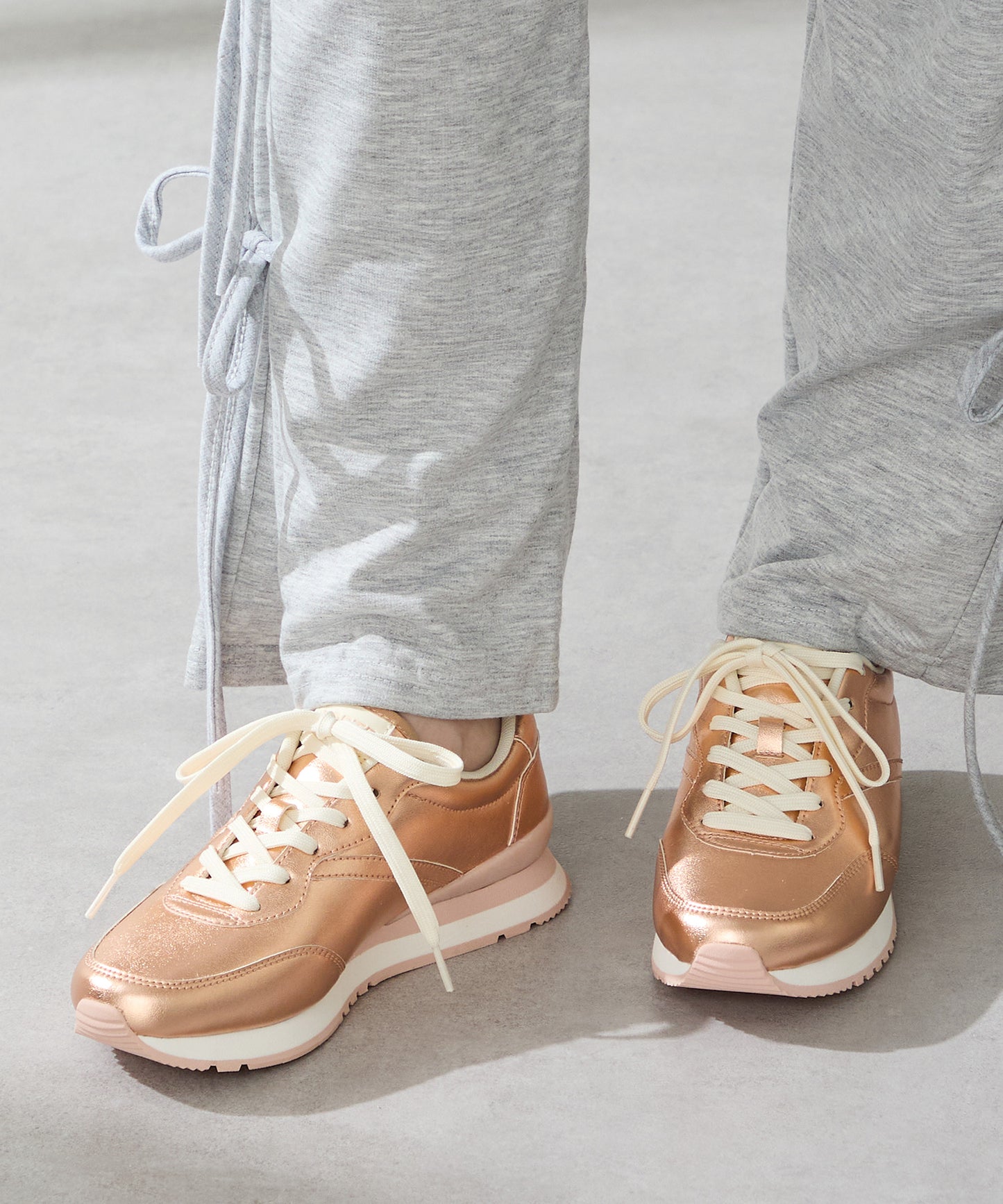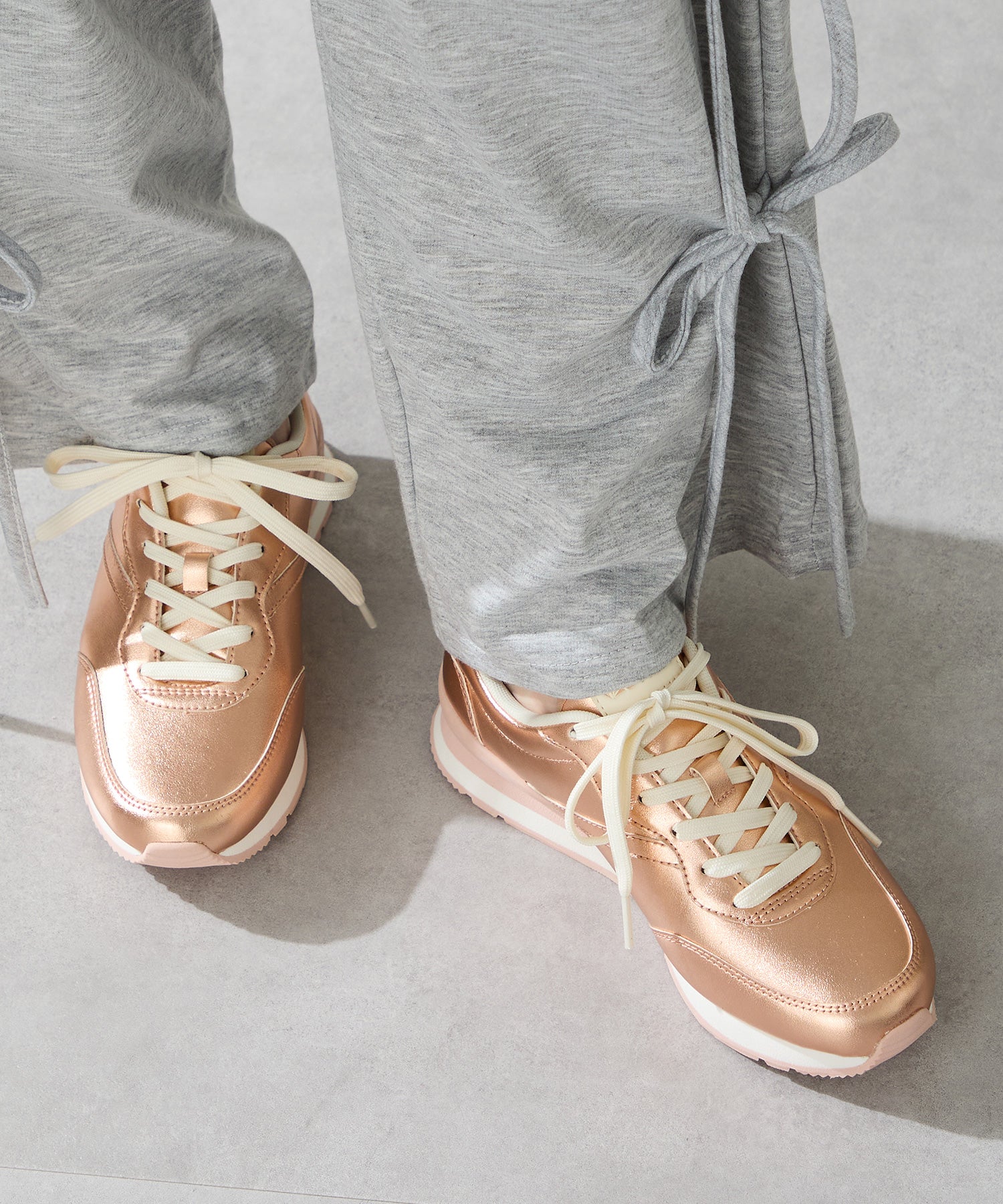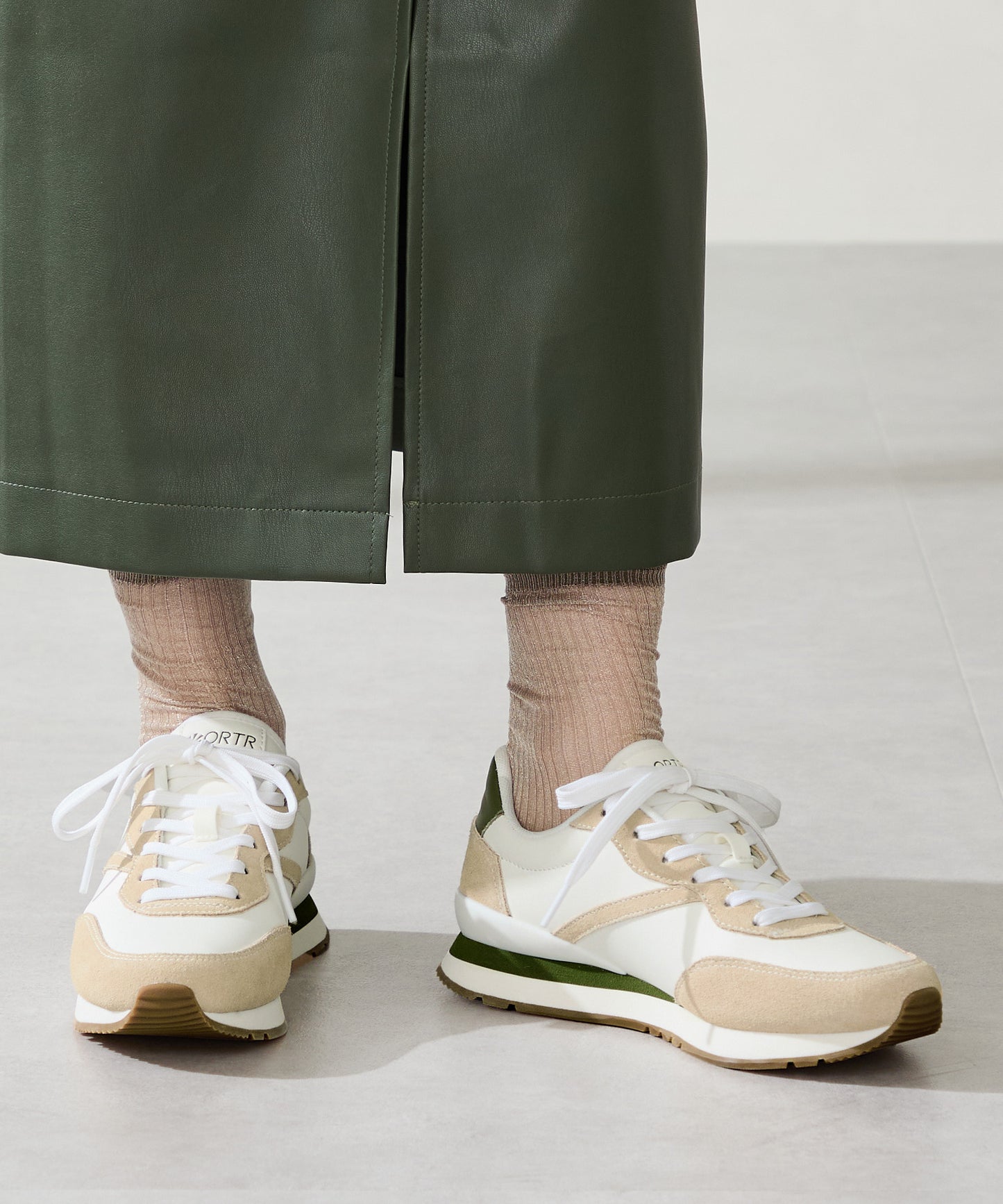 台形にカットされた特徴的なソールのスニーカーはどこかレトロな雰囲気のアイテム。フラットソールでミニマムなシルエットと計算された切替パーツの配置が洗練された都会的な印象にしてくれる。ワントーンでまとめながらパーツごとの素材違いを楽しめるベージュはヒール部分に差した鮮やかなグリーンがポイントに。エッジの利いたメタリックカラーのピンクは他とは被らない個性を出せるカラー。
