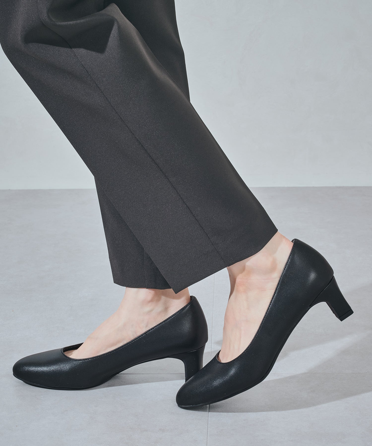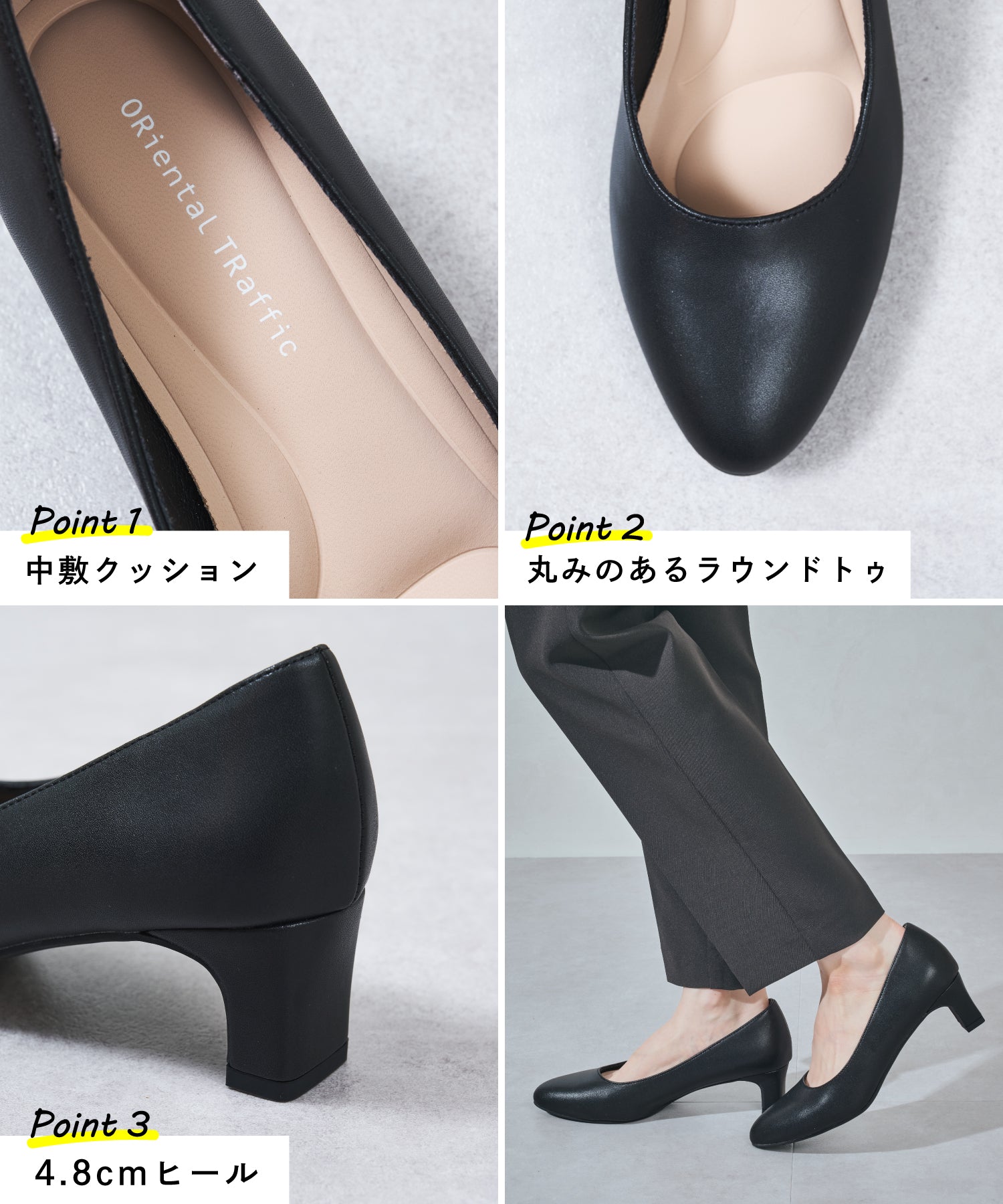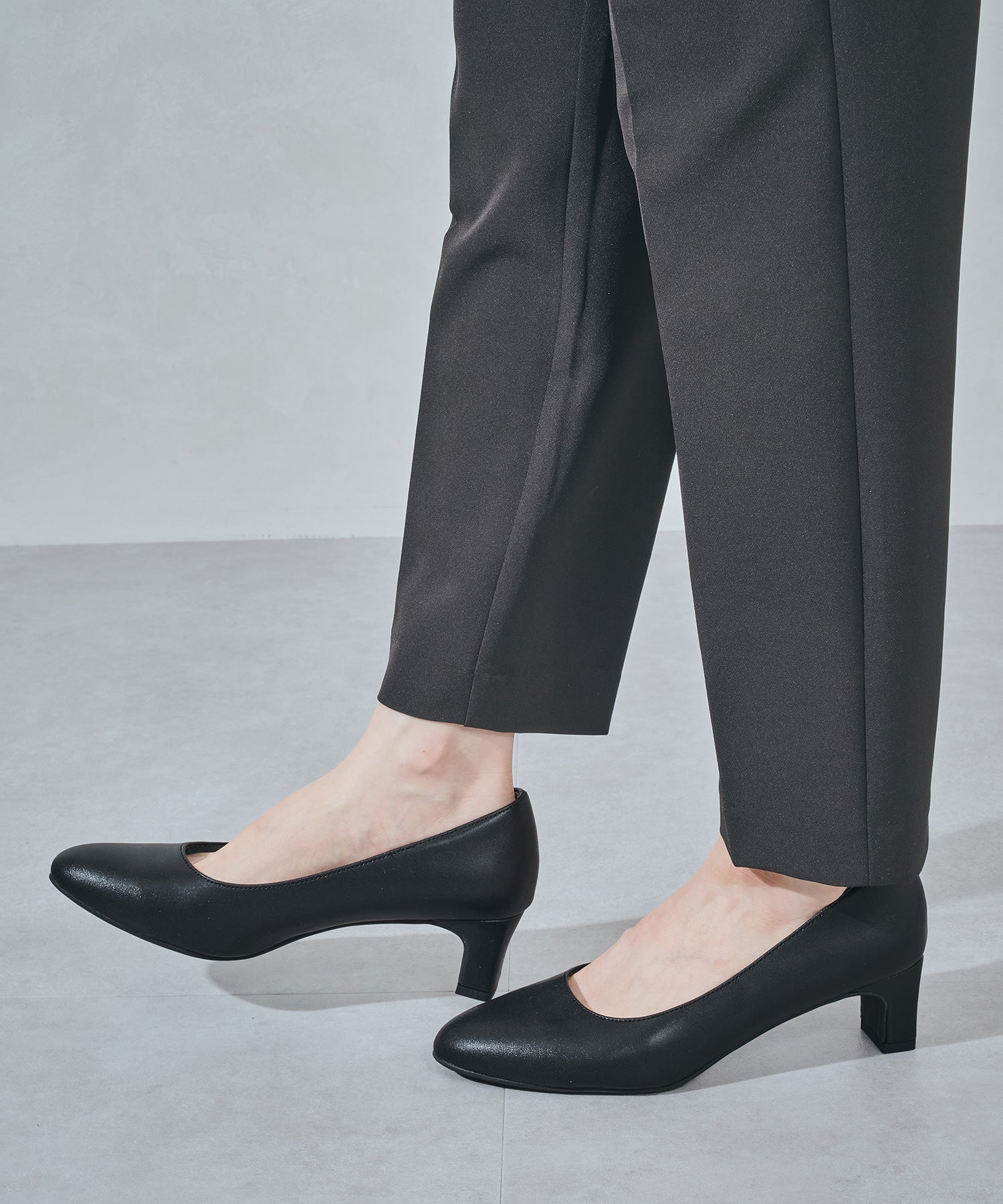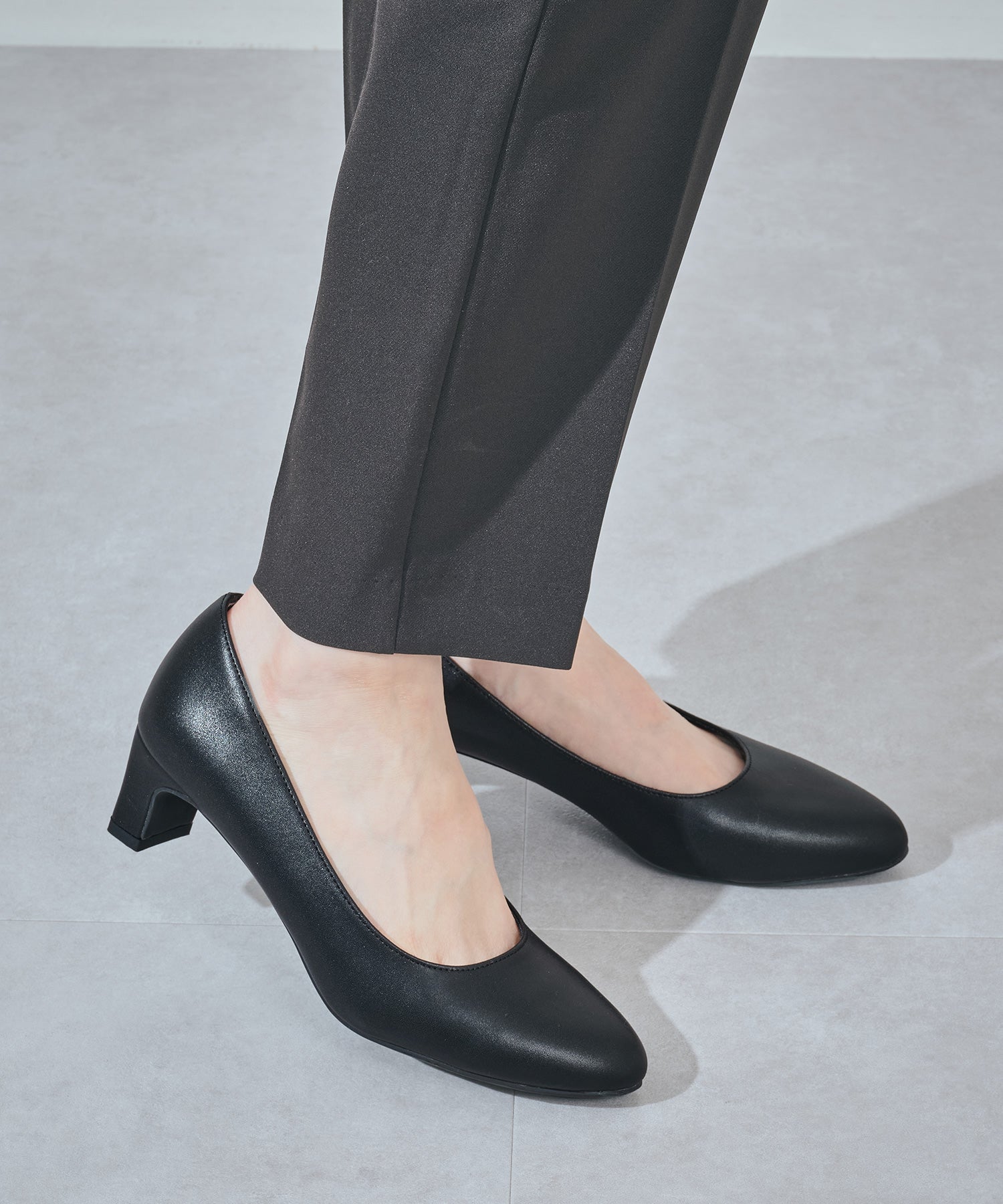 普段使いからビジネスシーンなど幅広く活躍するベーシックなプレーンパンプスは、丸みのあるラウンドトゥで女性らしい雰囲気に。厚手クッション入りの中敷は凹凸を付けたオリジナルのデザインで、より足裏に柔らかさを感じる仕様に。4.8cmの程よい高さのプレートヒールと、安心感のある履き心地で長時間の使用も楽なのでヒールが苦手な方にもおすすめの1足。