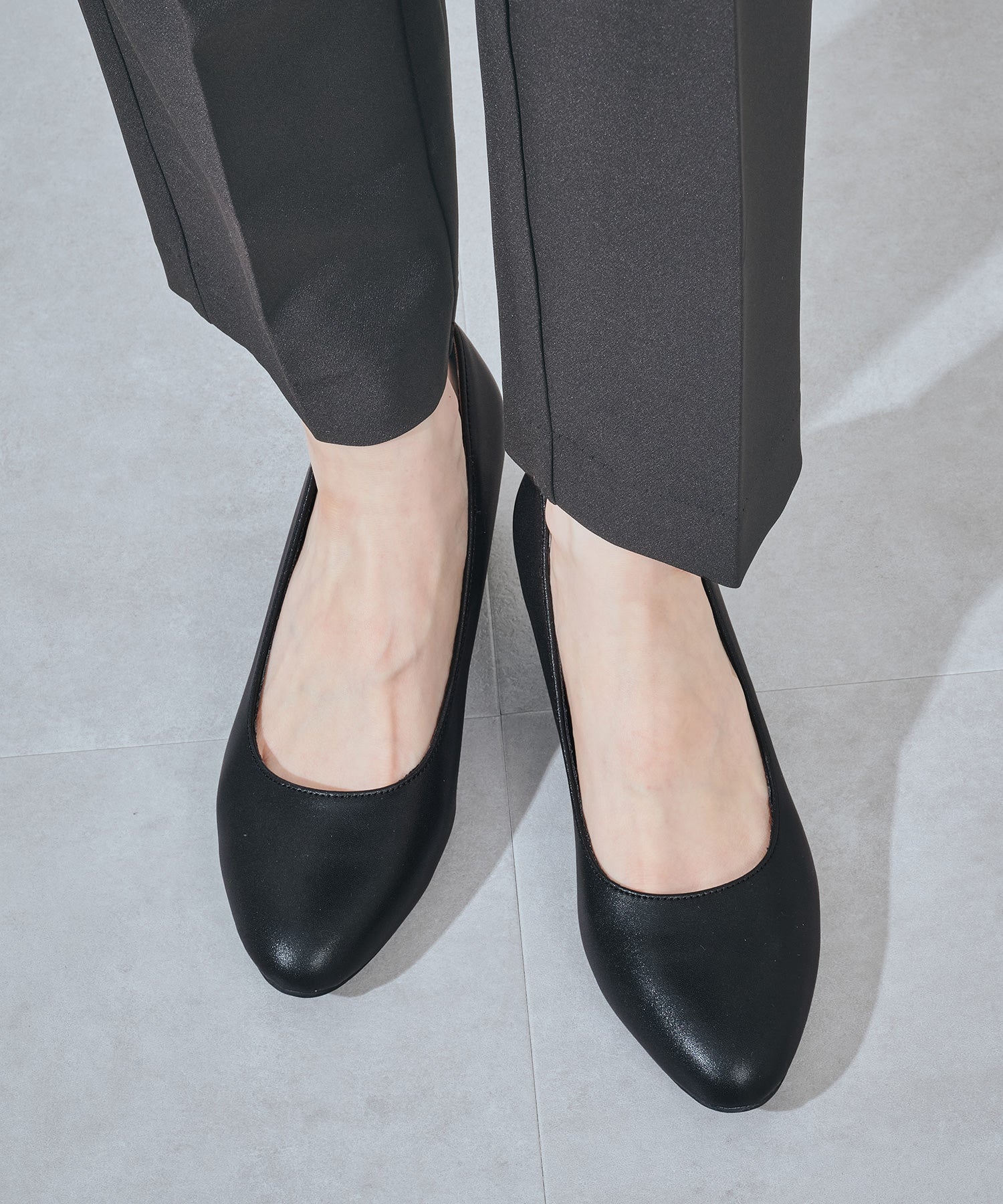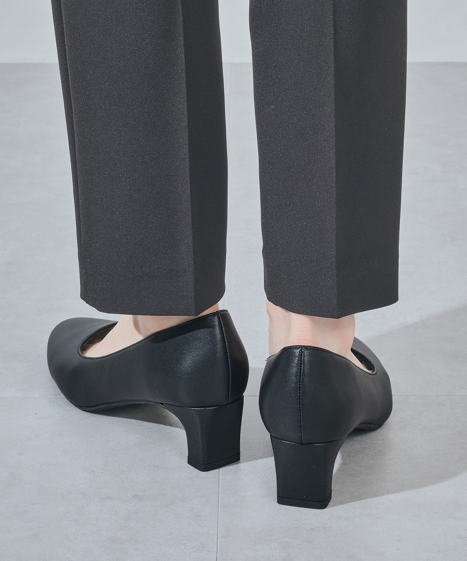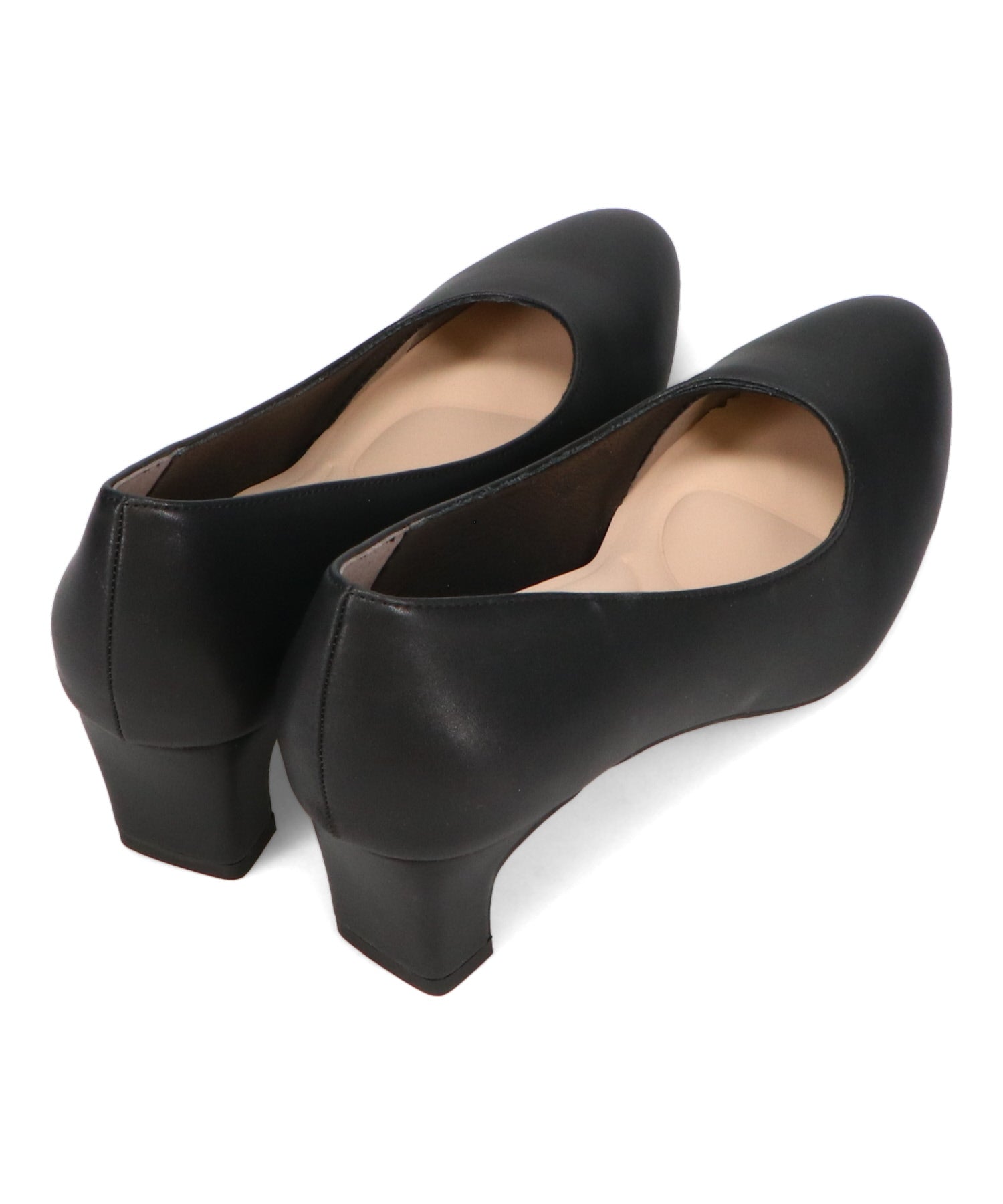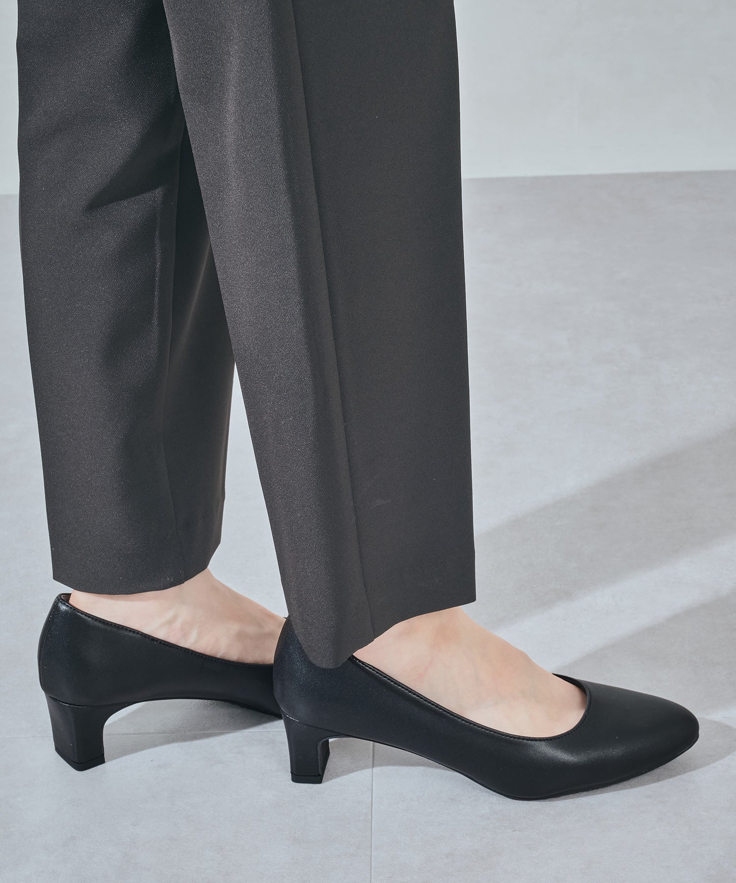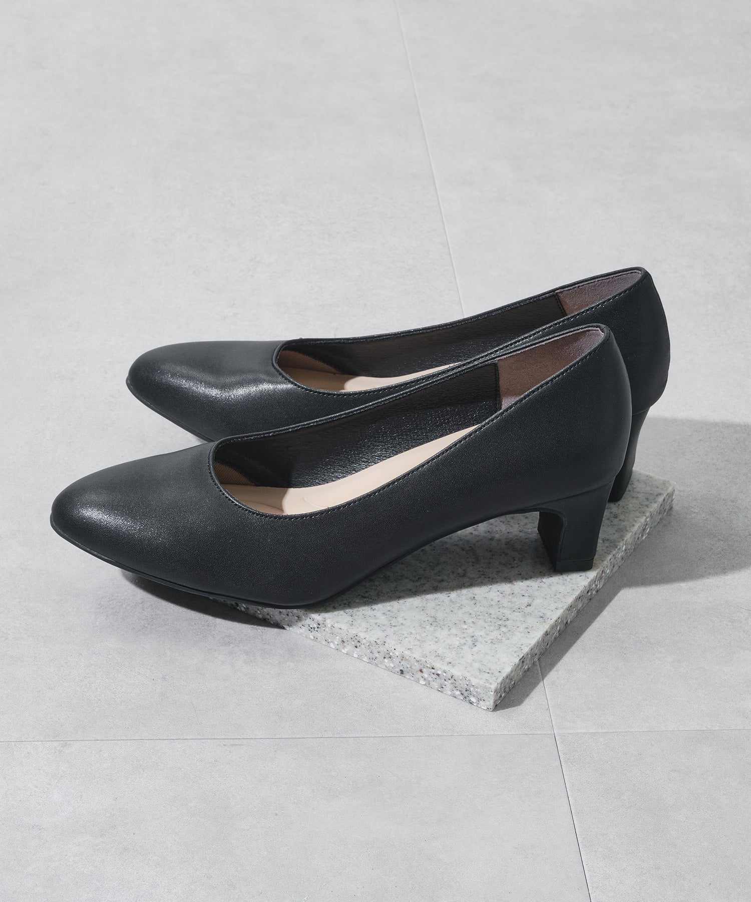普段使いからビジネスシーンなど幅広く活躍するベーシックなプレーンパンプスは、丸みのあるラウンドトゥで女性らしい雰囲気に。厚手クッション入りの中敷は凹凸を付けたオリジナルのデザインで、より足裏に柔らかさを感じる仕様に。4.8cmの程よい高さのプレートヒールと、安心感のある履き心地で長時間の使用も楽なのでヒールが苦手な方にもおすすめの1足。