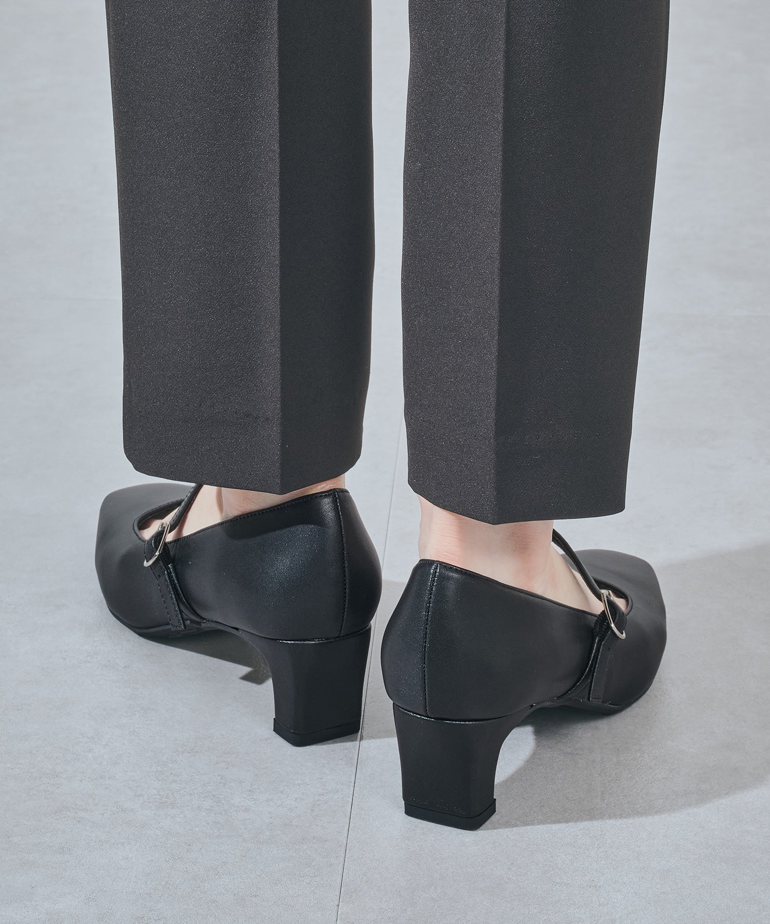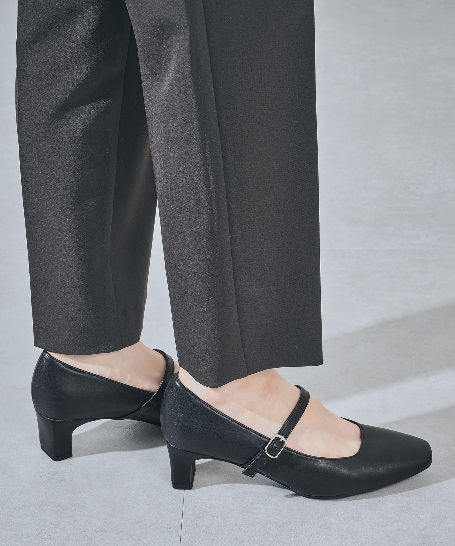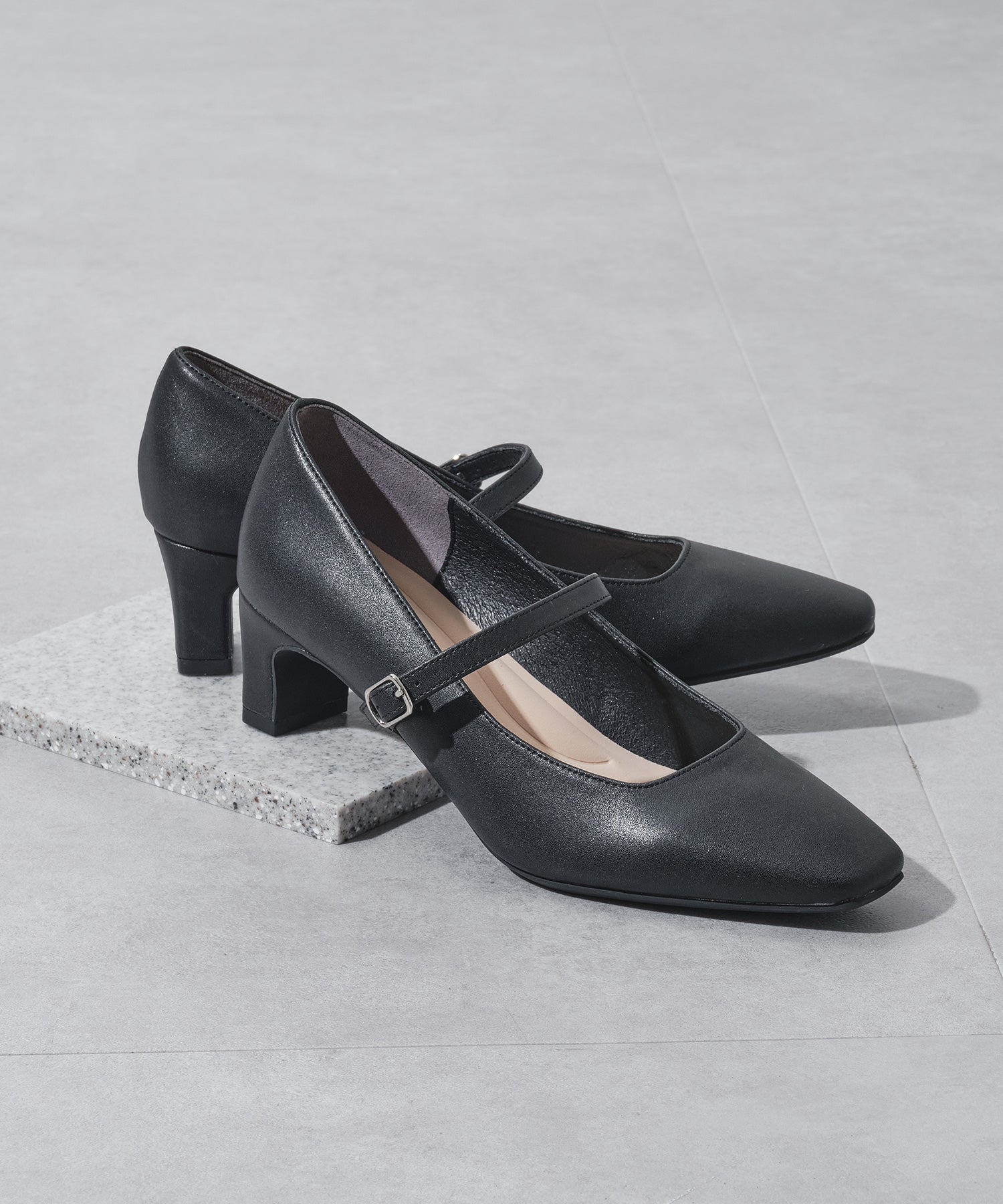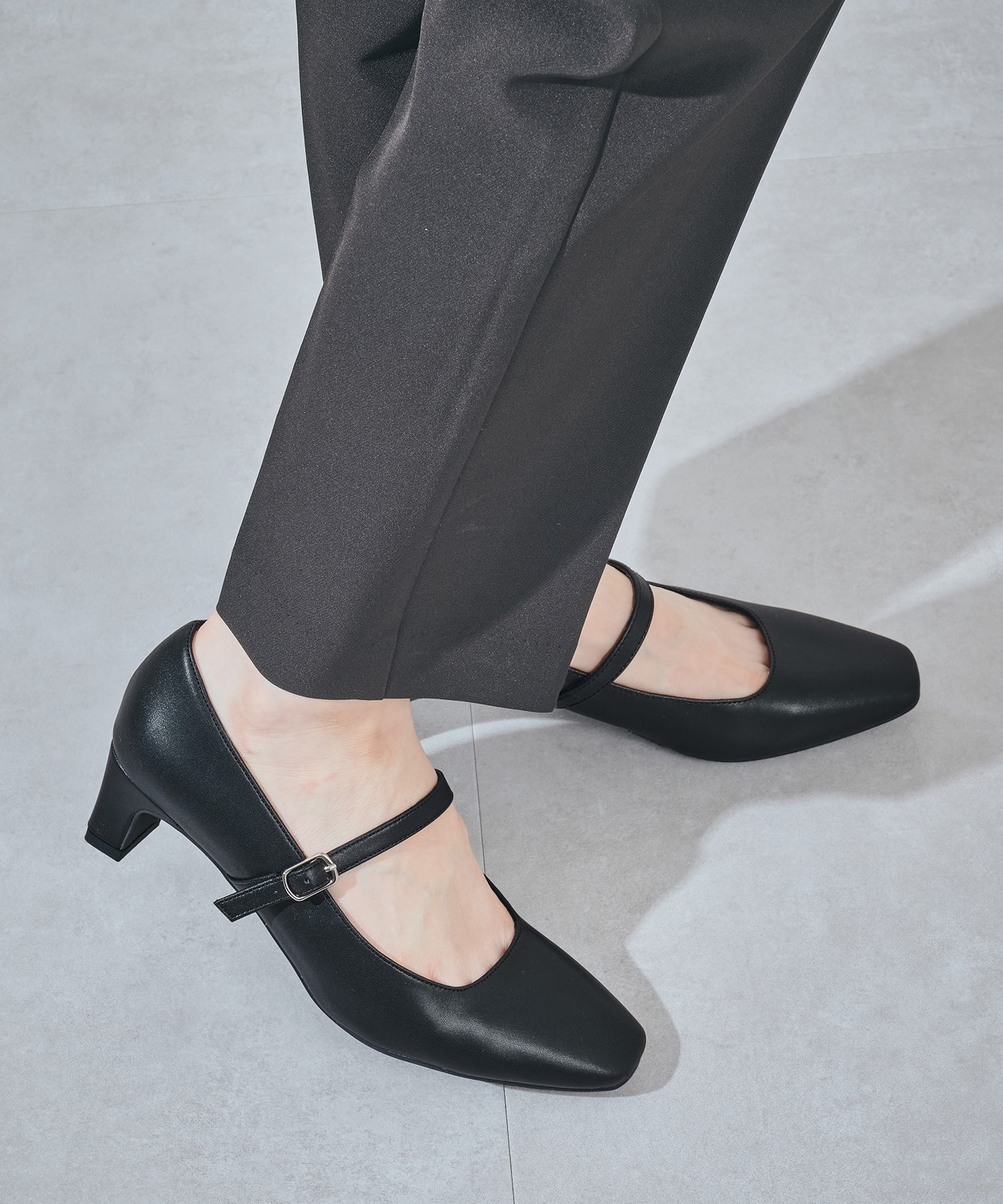 すっきりとした細身のスクエアトゥに太めのプレートヒールがこなれ感を演出するストラップパンプス。甲にフィットする華奢なストラップには隠しゴムが付いているので着脱のしやすさも考えられた作り。肉厚なクッションを入れたインソールで足裏への負担も軽減してくれる。通勤用やきちんとした場面にも合わせられるパンプスは、1足持っていると便利なアイテム。