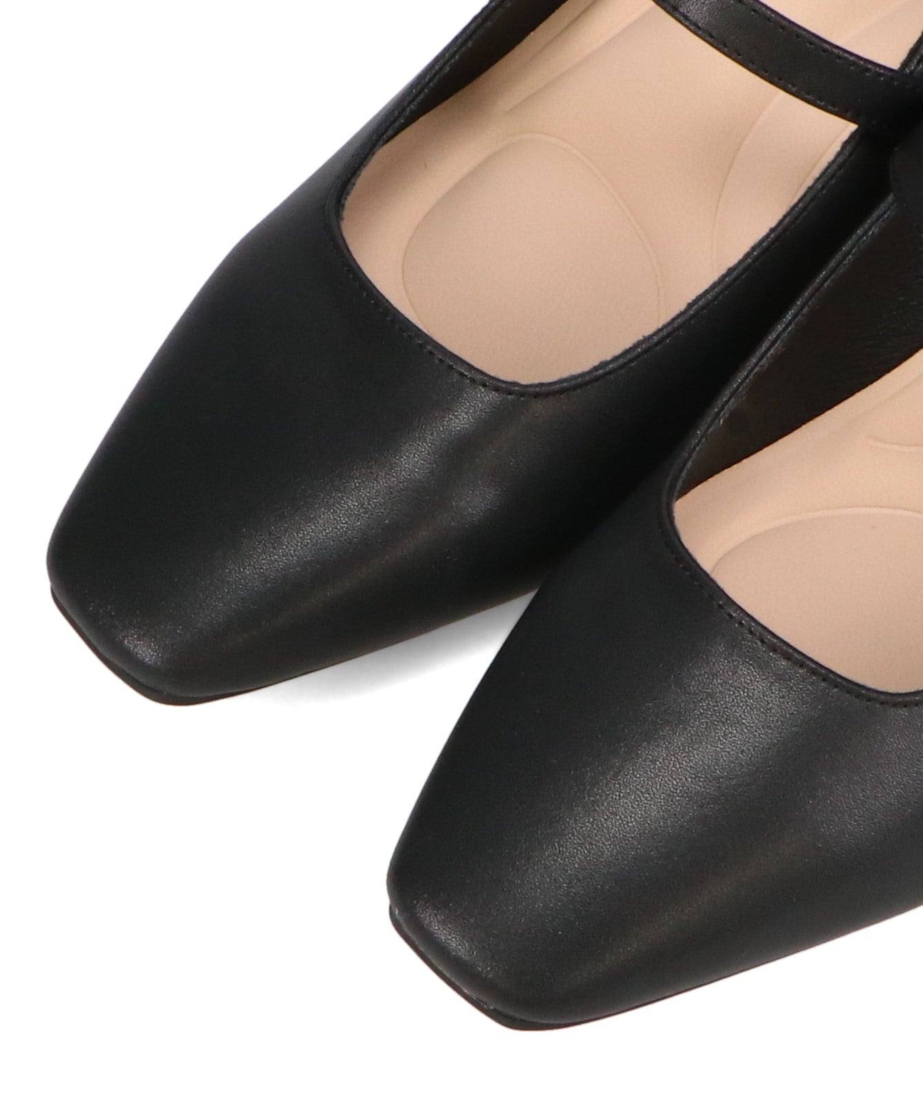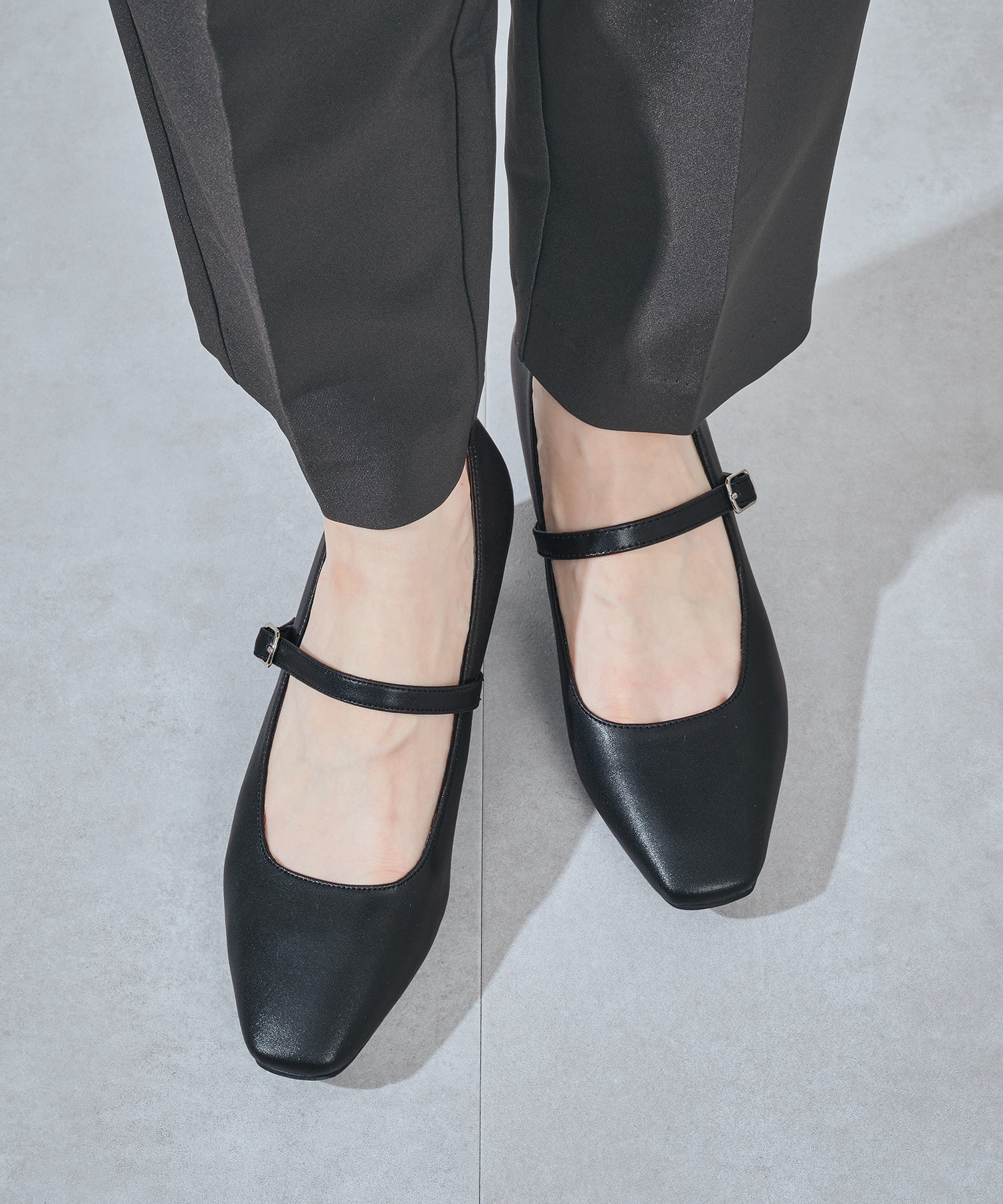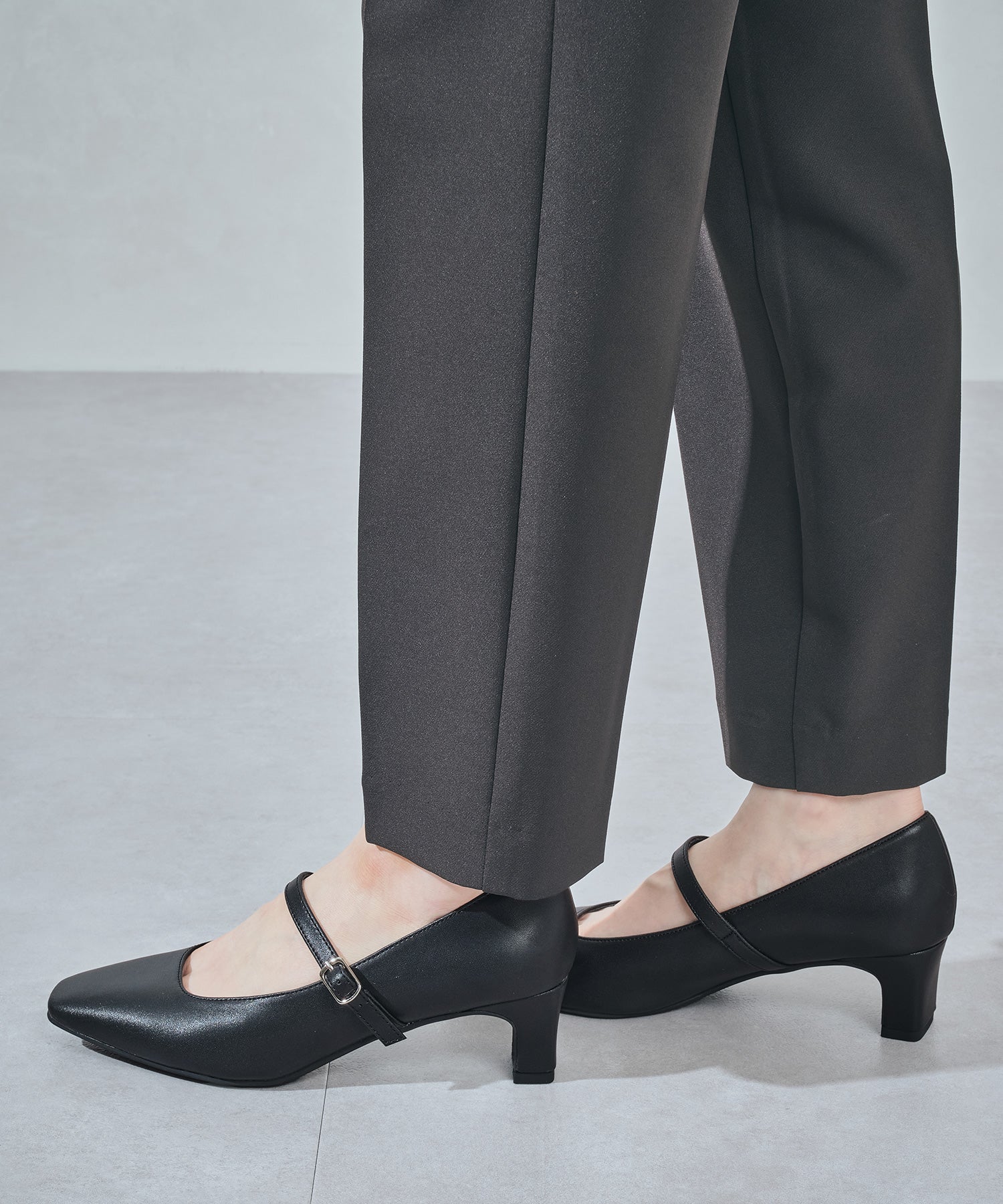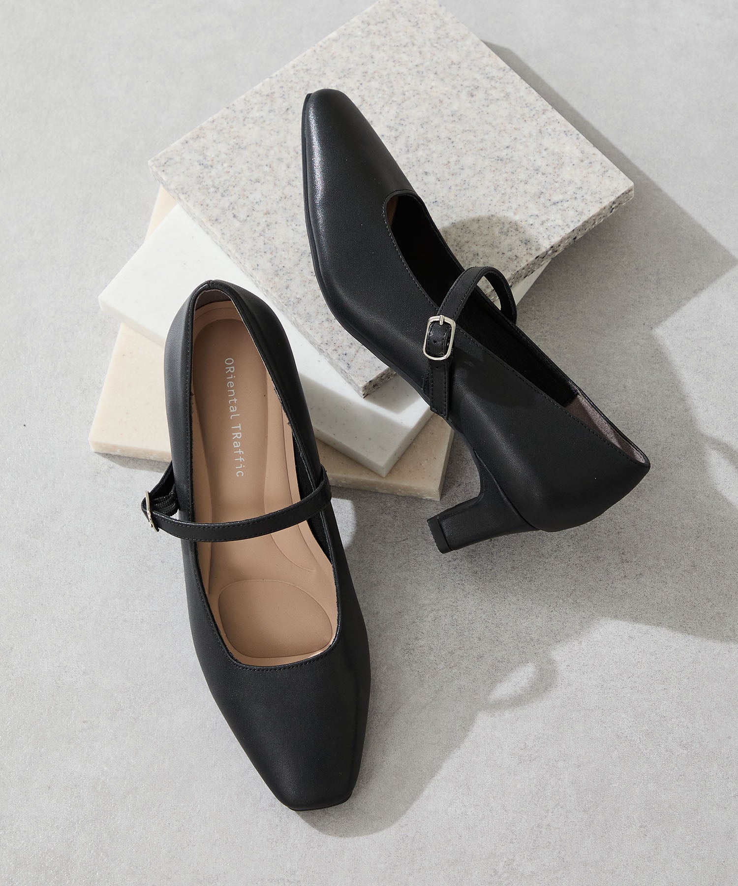 すっきりとした細身のスクエアトゥに太めのプレートヒールがこなれ感を演出するストラップパンプス。甲にフィットする華奢なストラップには隠しゴムが付いているので着脱のしやすさも考えられた作り。肉厚なクッションを入れたインソールで足裏への負担も軽減してくれる。通勤用やきちんとした場面にも合わせられるパンプスは、1足持っていると便利なアイテム。