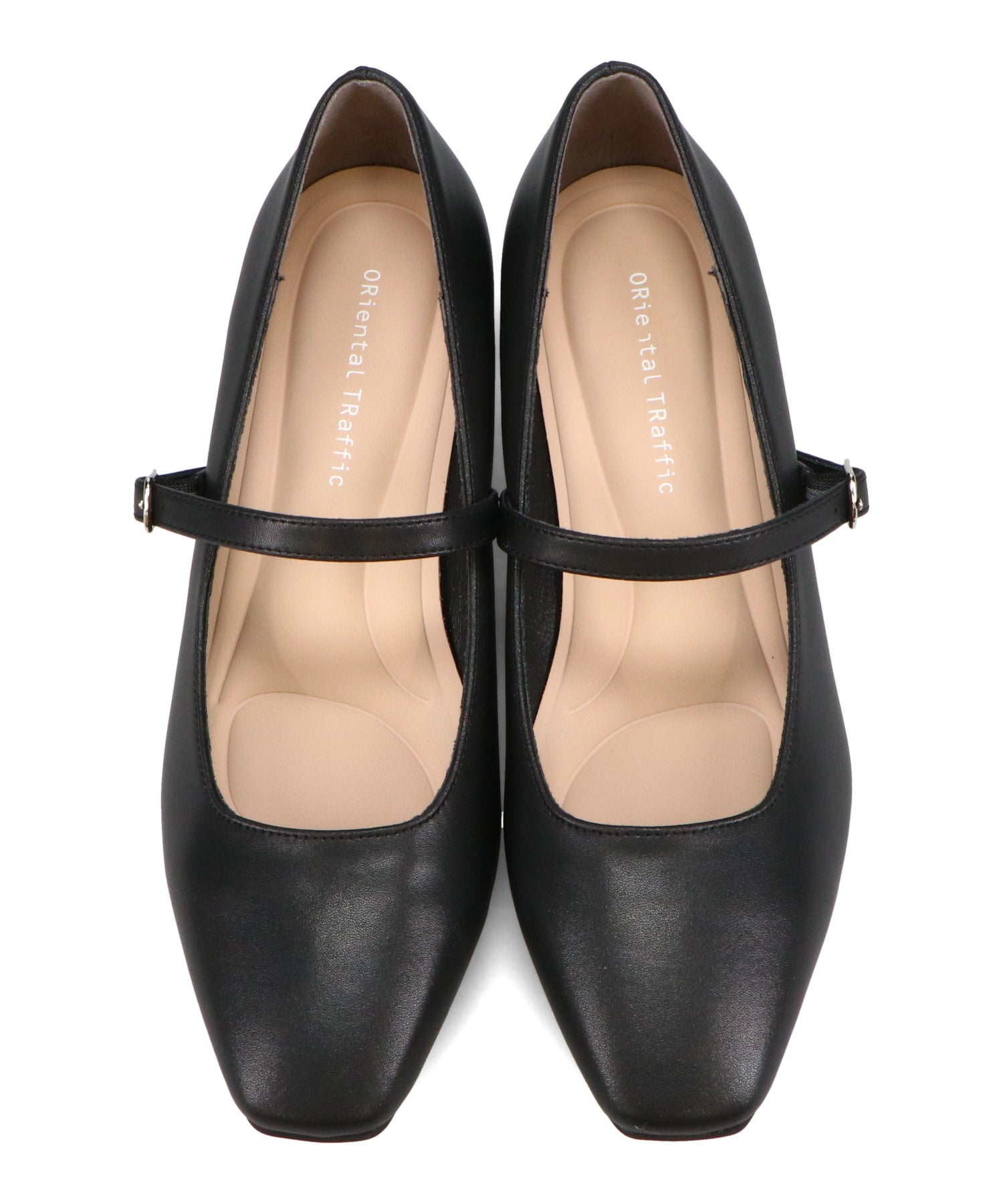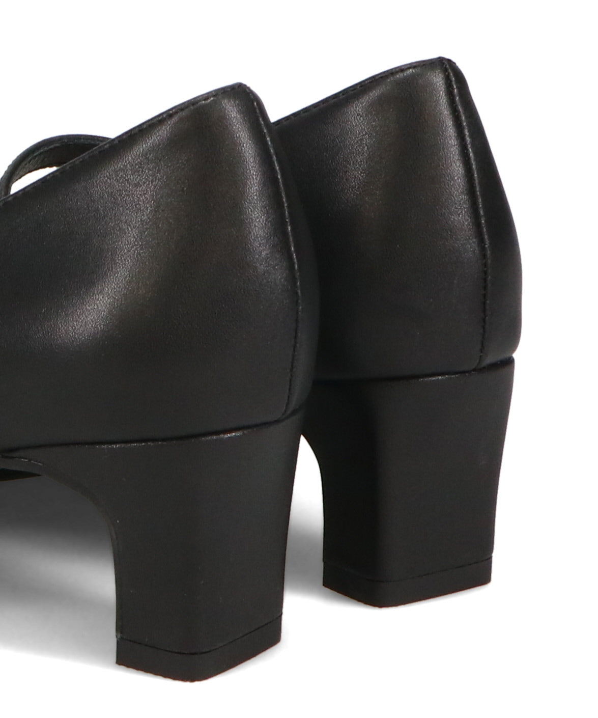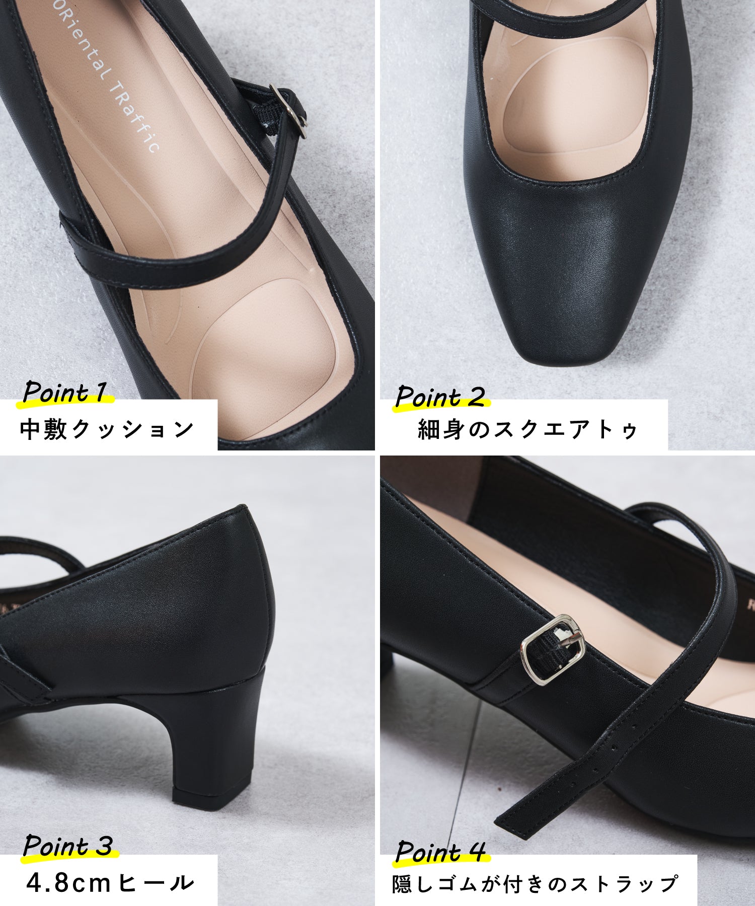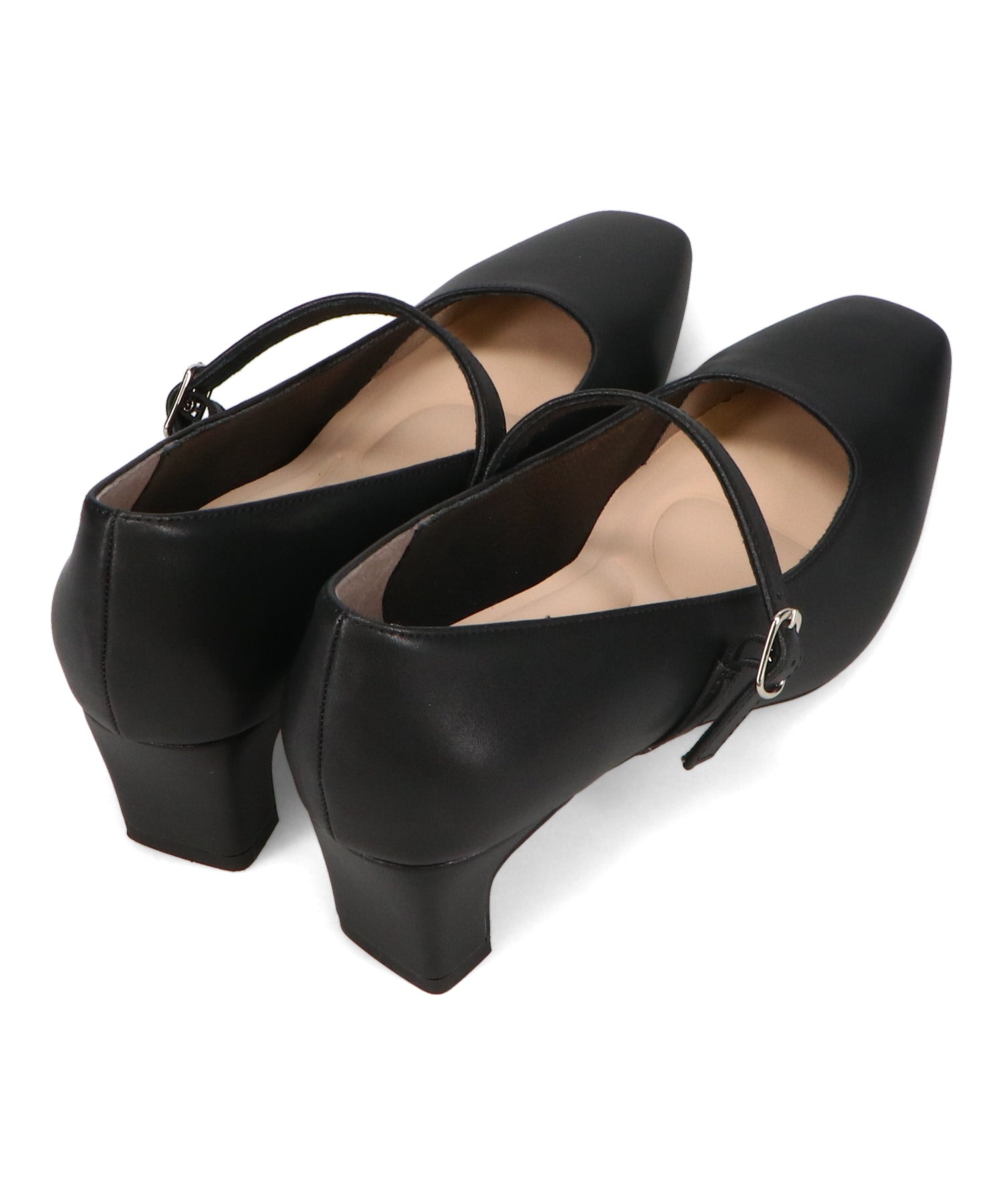 すっきりとした細身のスクエアトゥに太めのプレートヒールがこなれ感を演出するストラップパンプス。甲にフィットする華奢なストラップには隠しゴムが付いているので着脱のしやすさも考えられた作り。肉厚なクッションを入れたインソールで足裏への負担も軽減してくれる。通勤用やきちんとした場面にも合わせられるパンプスは、1足持っていると便利なアイテム。