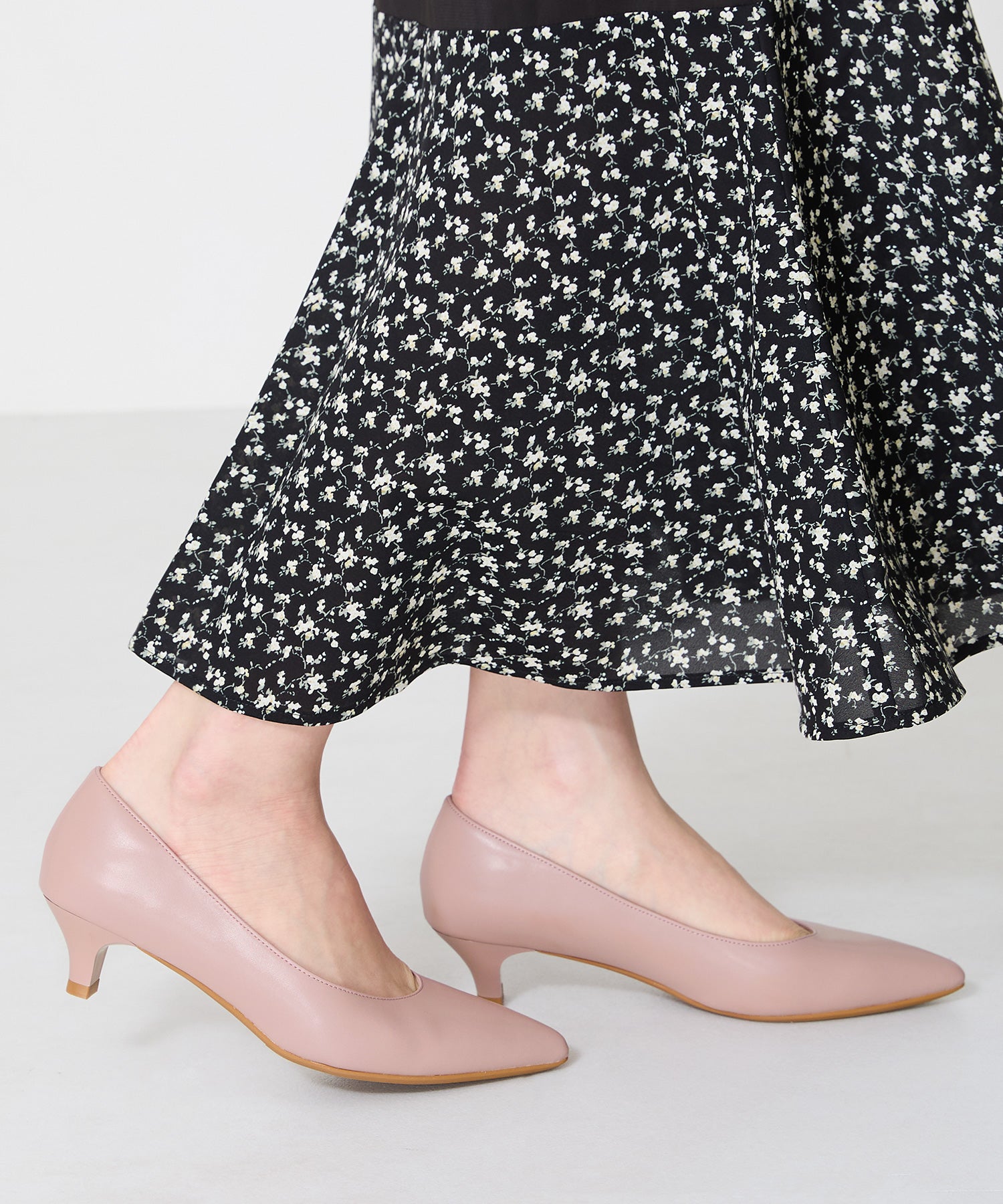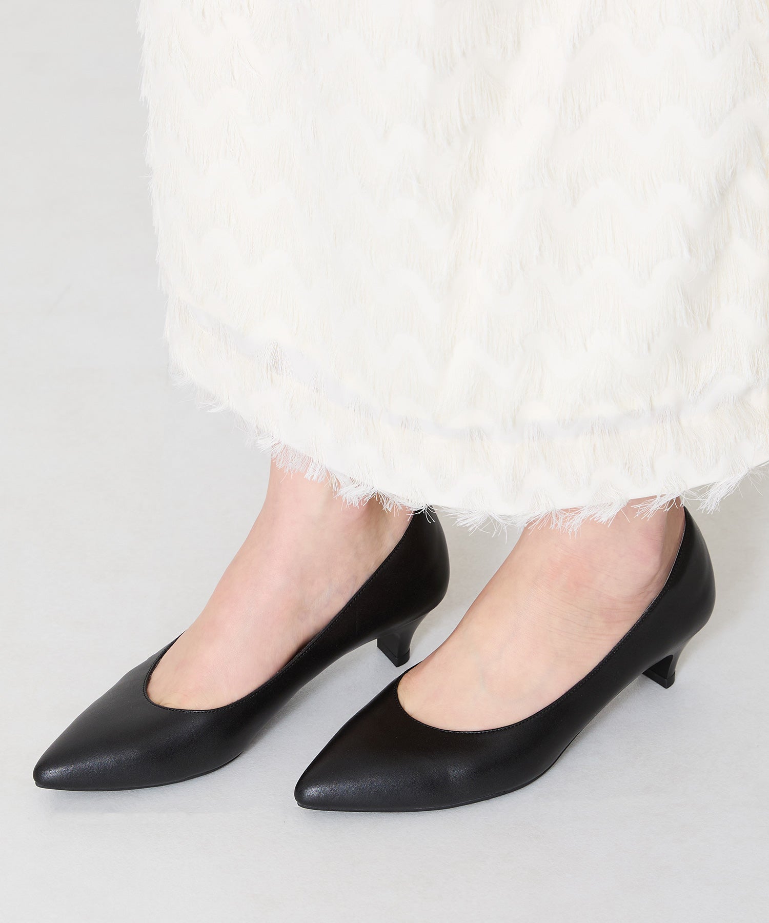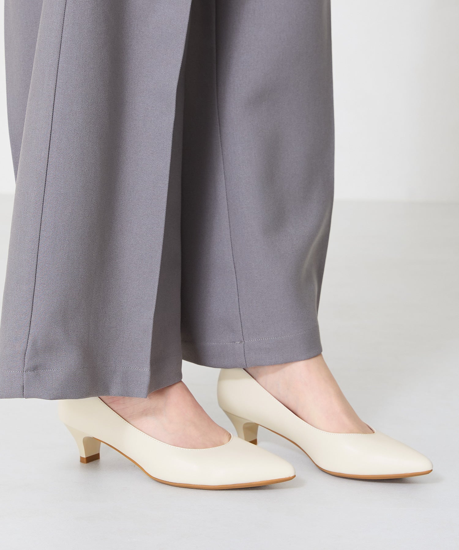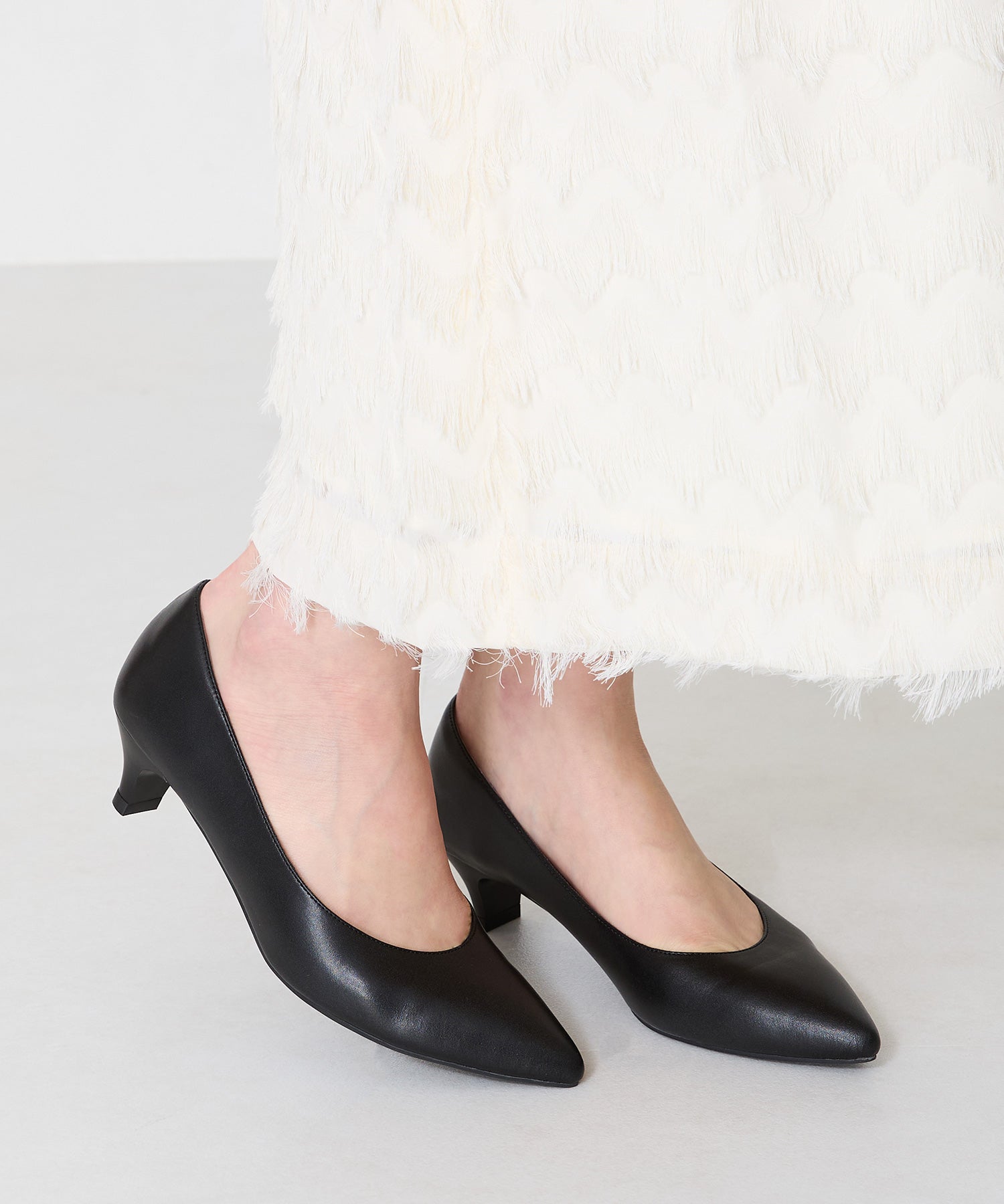 ベーシックデザインのパンプスは上品な艶感のあるスムース合皮でデイリーから通勤用まで幅広く活躍してくれるアイテム。スッキリとしたポインテッドトゥが女性らしく、くびれのあるヒールで華奢な印象にしつつも低めの4cmの高さで歩きやすい。つま先部分とインソールにクッションを入れ、踵のクッションでホールド感が高いのもポイント。