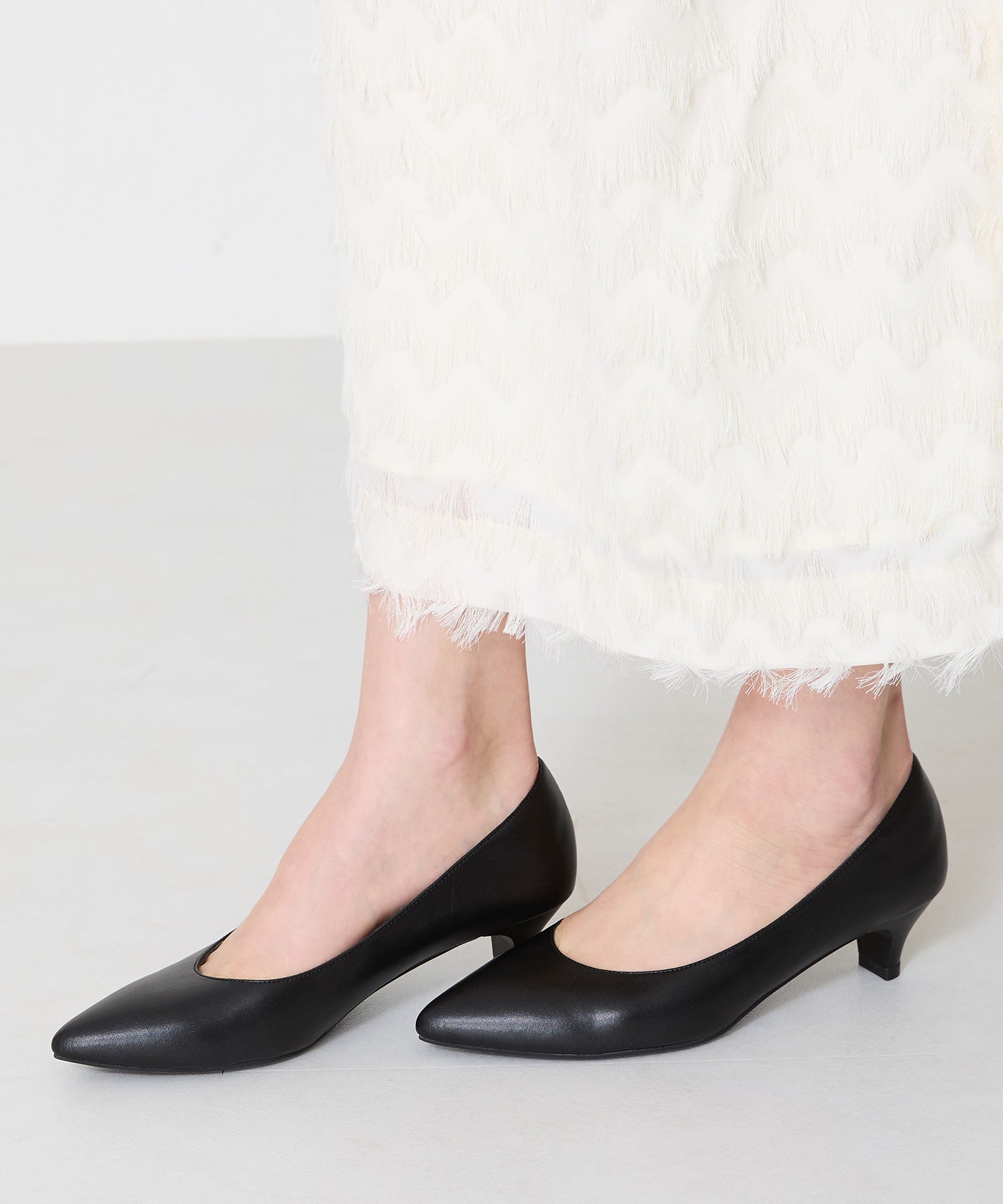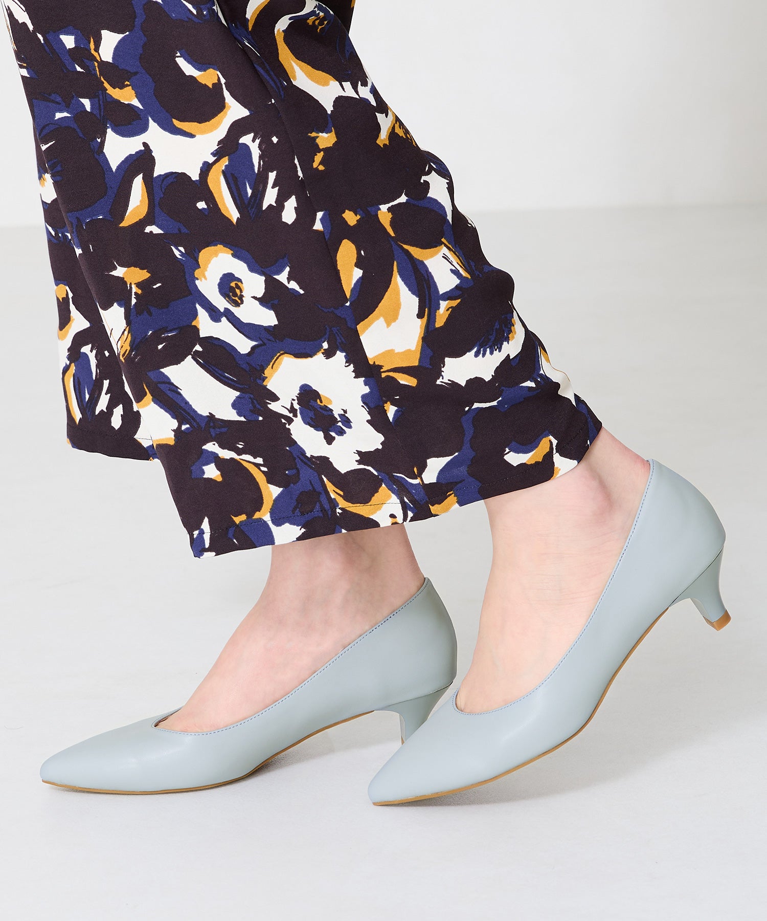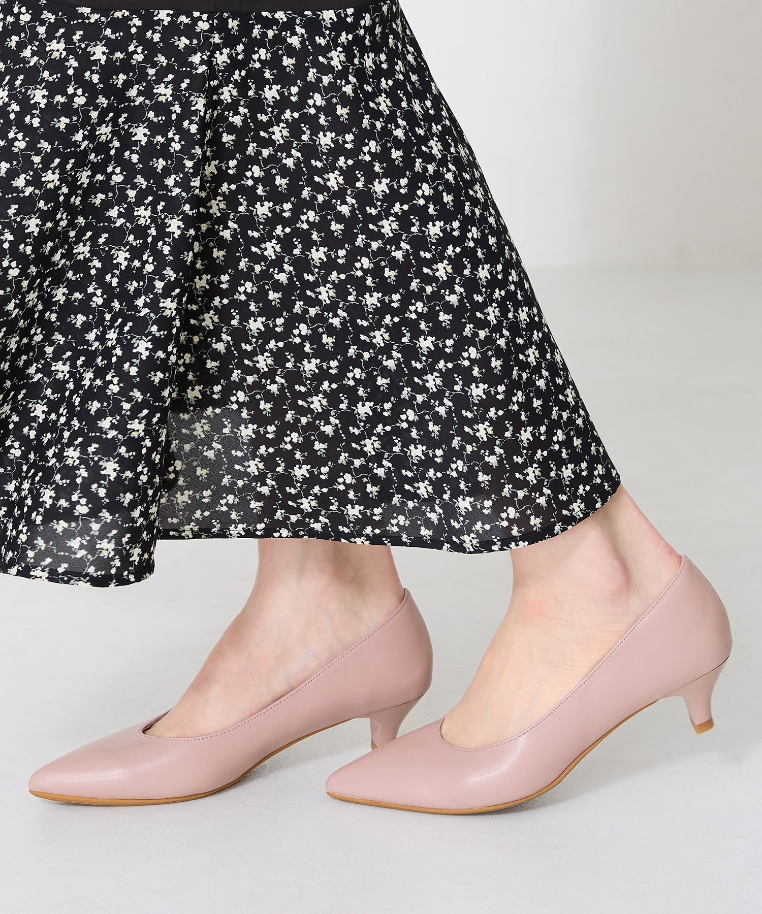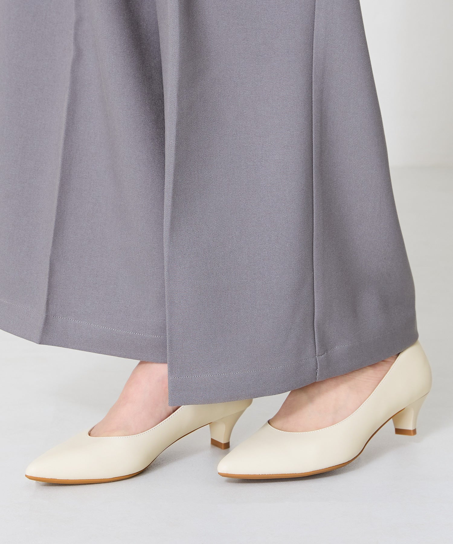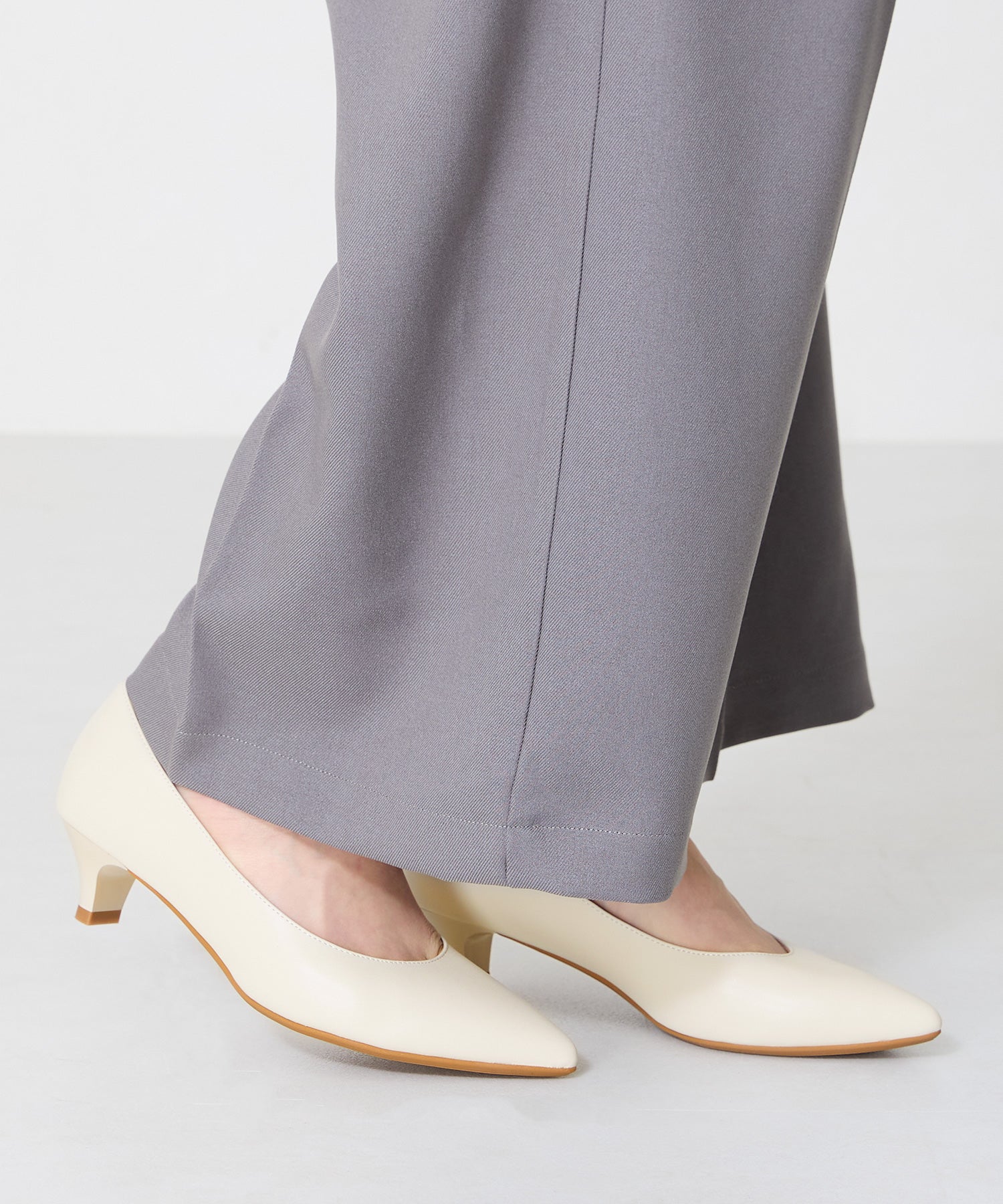 ベーシックデザインのパンプスは上品な艶感のあるスムース合皮でデイリーから通勤用まで幅広く活躍してくれるアイテム。スッキリとしたポインテッドトゥが女性らしく、くびれのあるヒールで華奢な印象にしつつも低めの4cmの高さで歩きやすい。つま先部分とインソールにクッションを入れ、踵のクッションでホールド感が高いのもポイント。