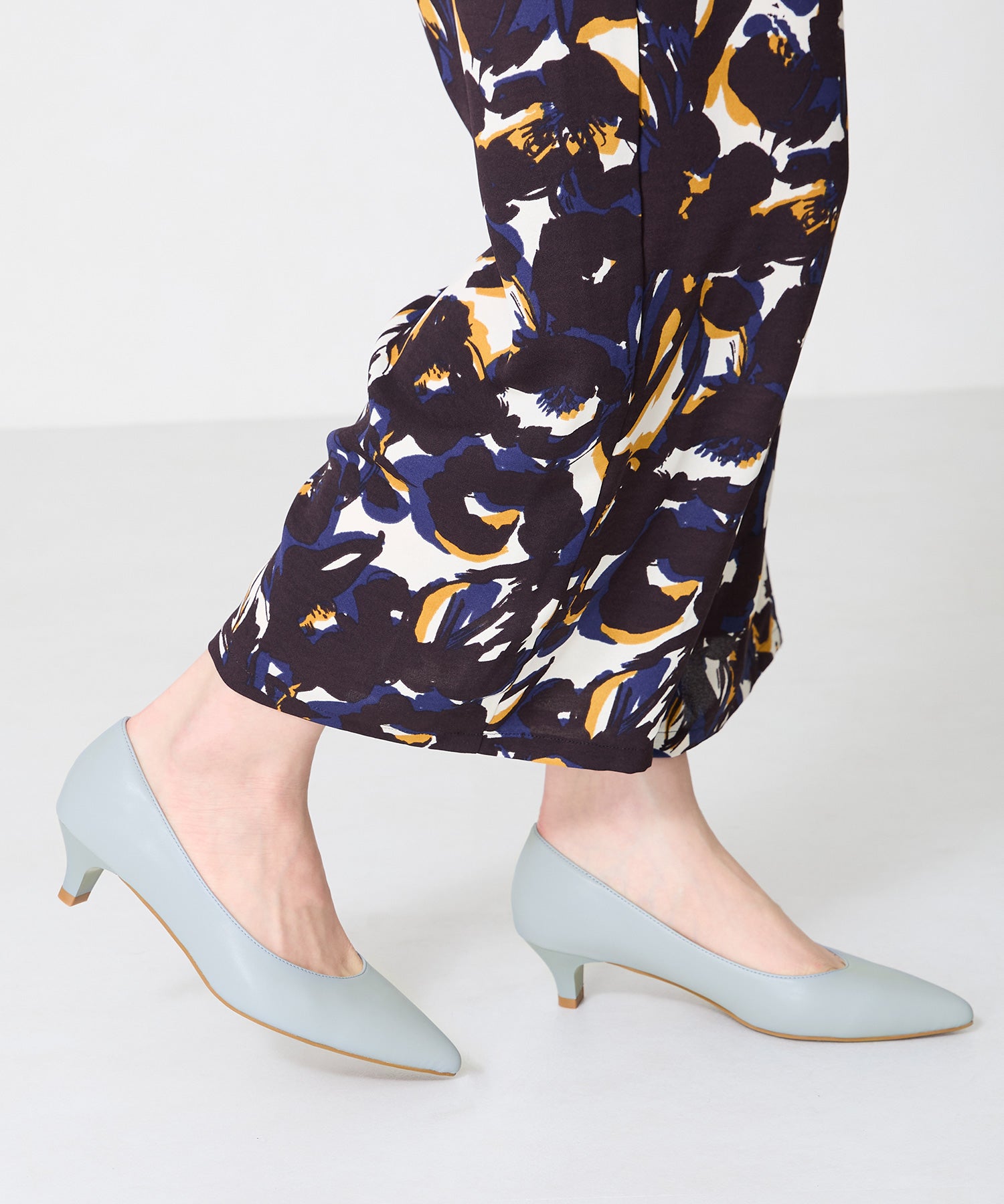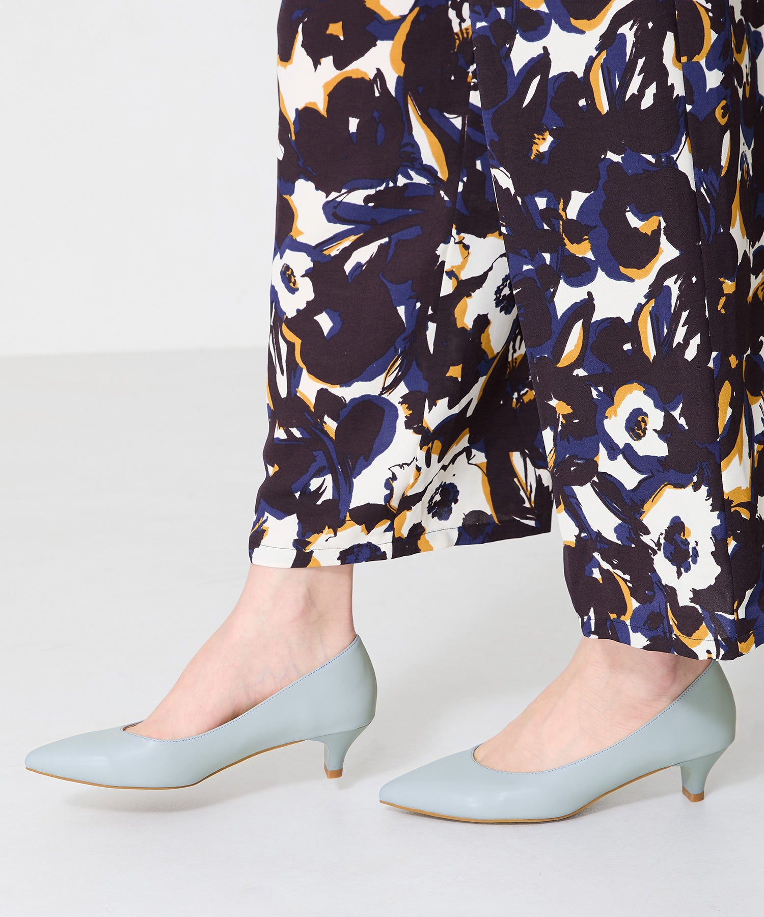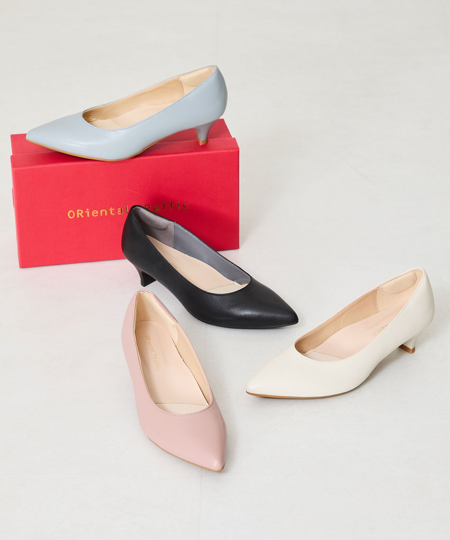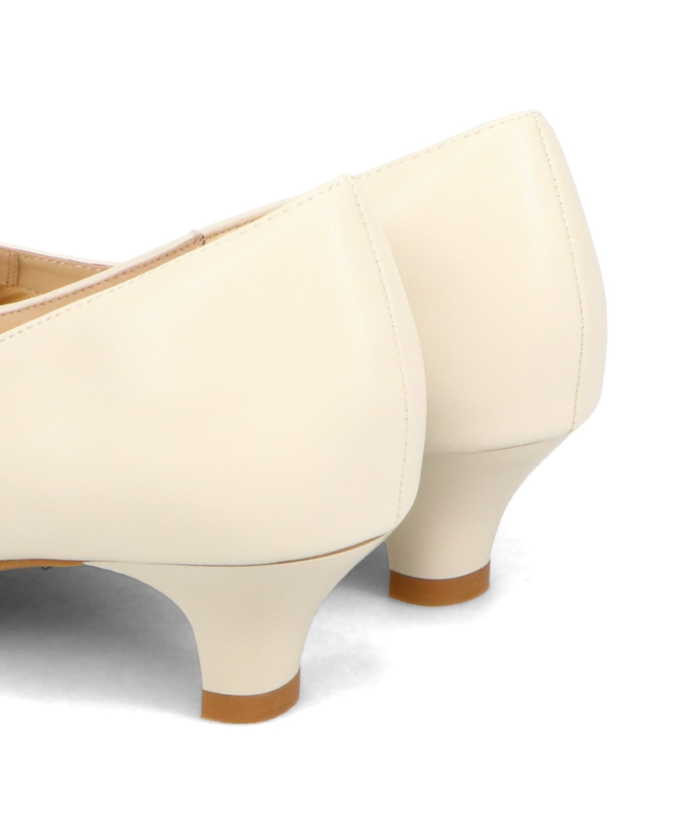 ベーシックデザインのパンプスは上品な艶感のあるスムース合皮でデイリーから通勤用まで幅広く活躍してくれるアイテム。スッキリとしたポインテッドトゥが女性らしく、くびれのあるヒールで華奢な印象にしつつも低めの4cmの高さで歩きやすい。つま先部分とインソールにクッションを入れ、踵のクッションでホールド感が高いのもポイント。