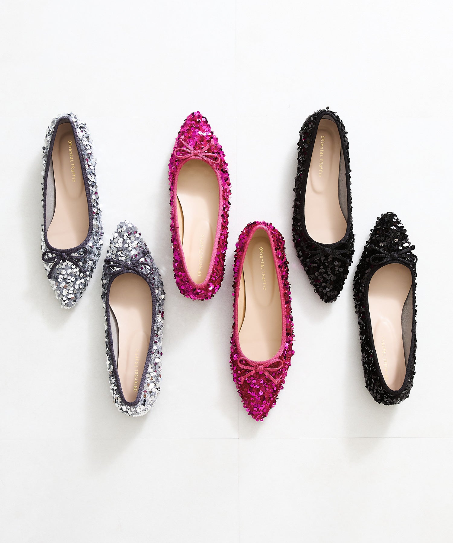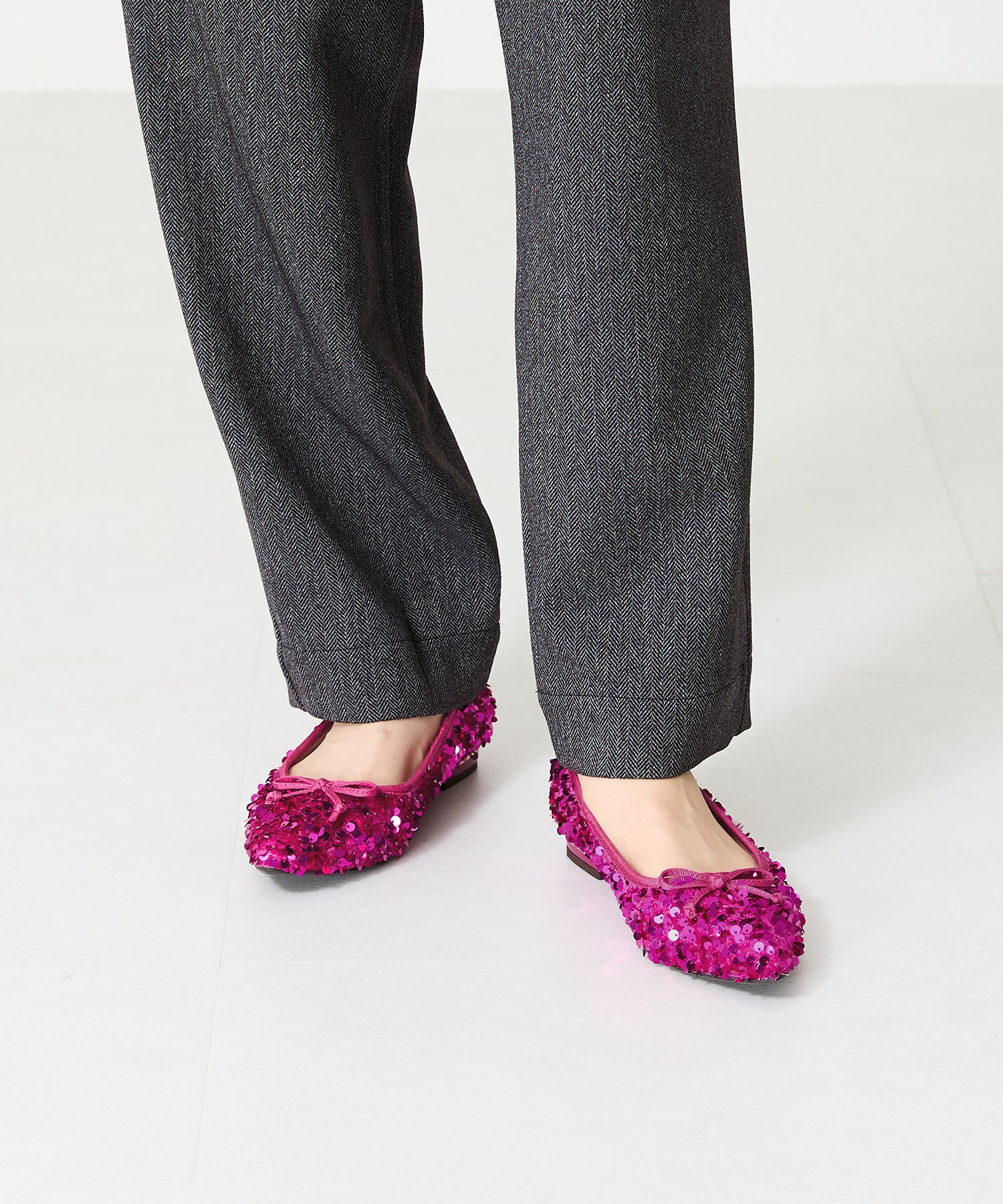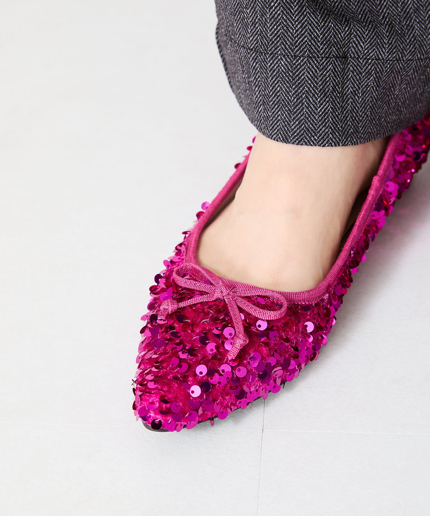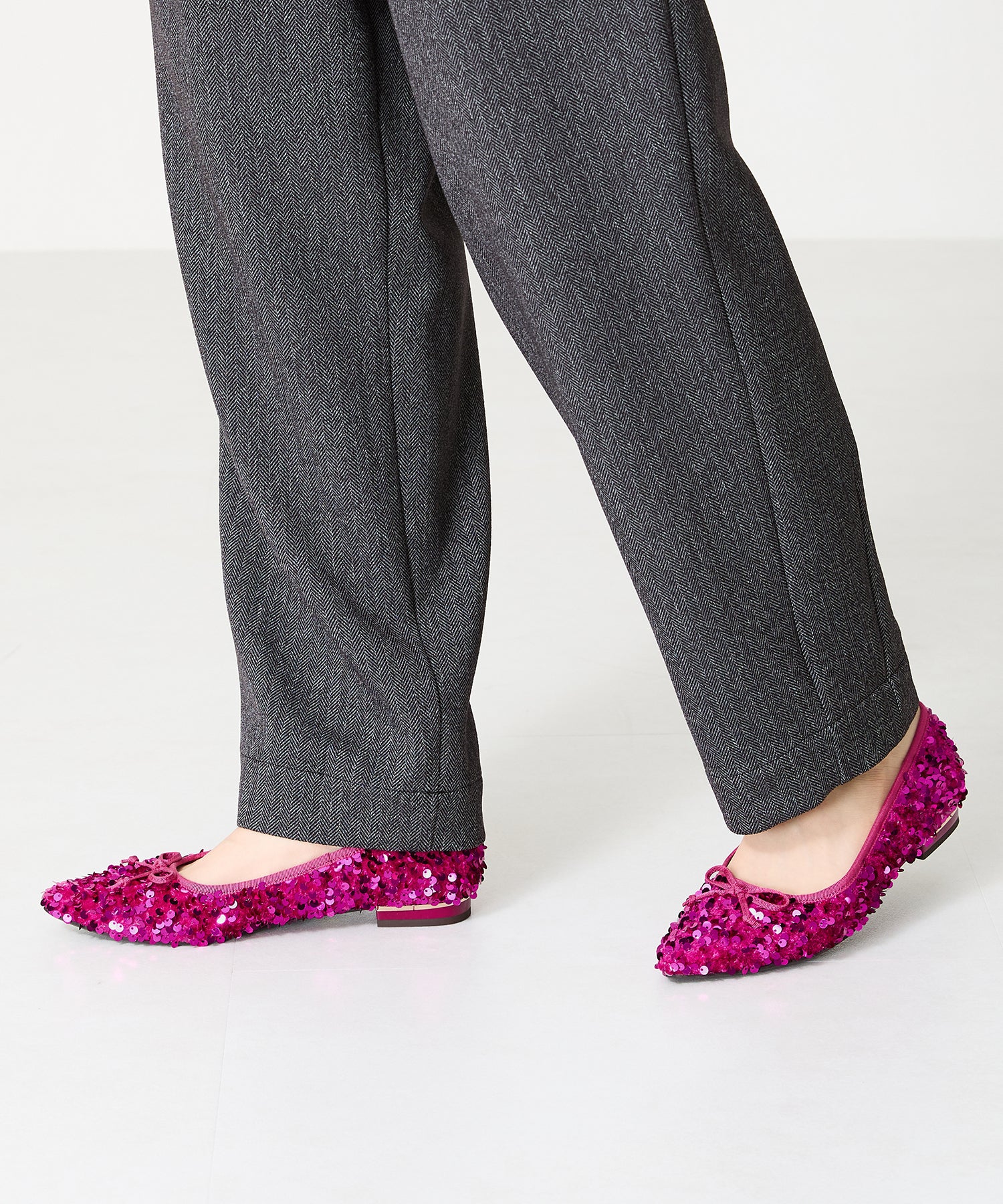 シーズンムード高まる重厚感のある生地に大粒のスパンコールをあしらったバレエシューズはトレンドのキーアイテム。ポインテッドトゥの大人っぽさと、さりげないリボンの甘さのバランスが絶妙で、デイリーに使えるフラットヒールなのも嬉しいポイント。派手すぎないブラックは普段のスタリングに取り入れやすく、主役級のシルバーとピンクは足元に華やかさを添えてくれるおすすめカラー。