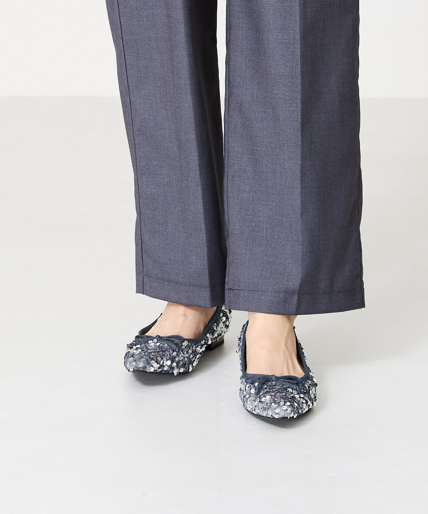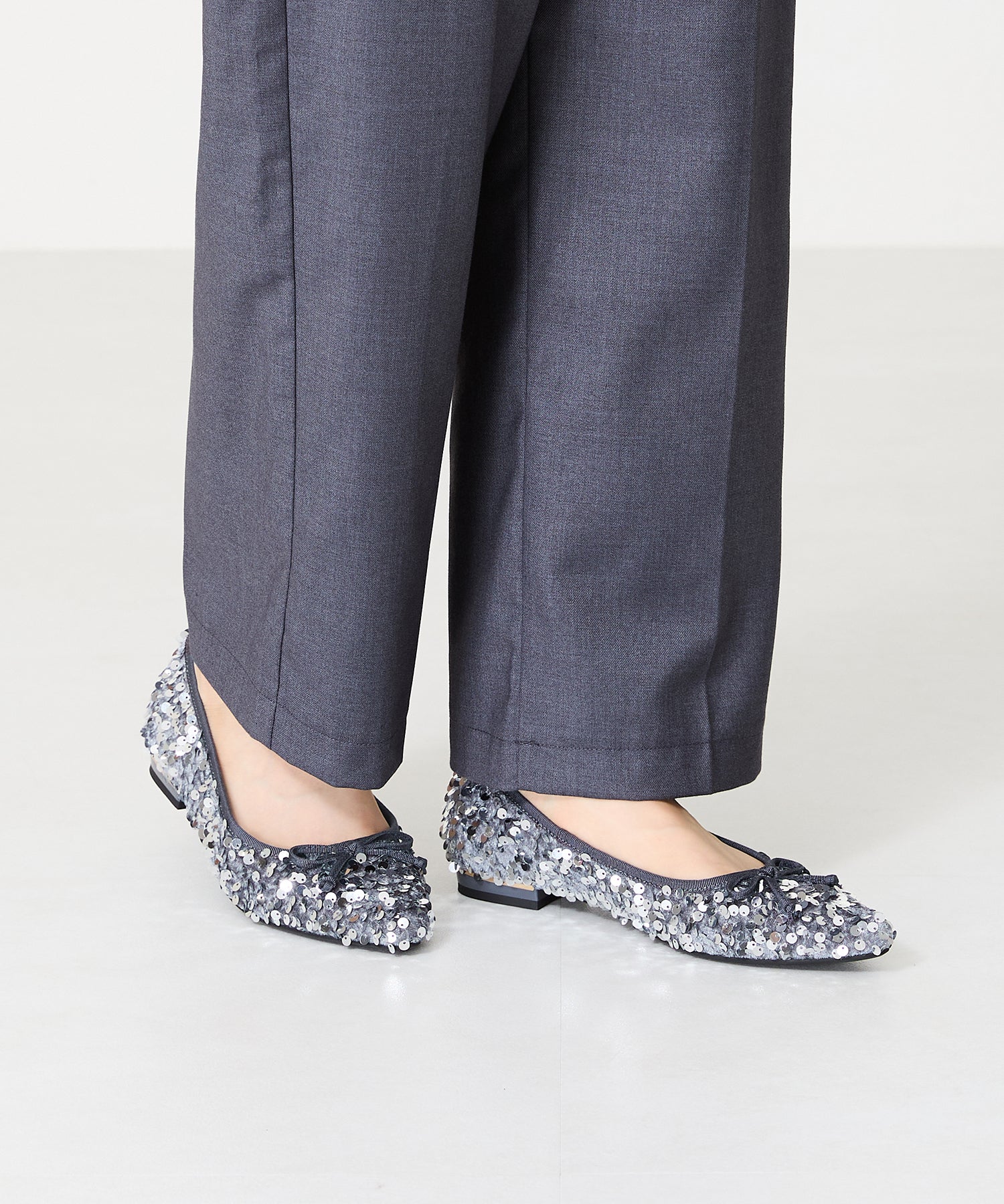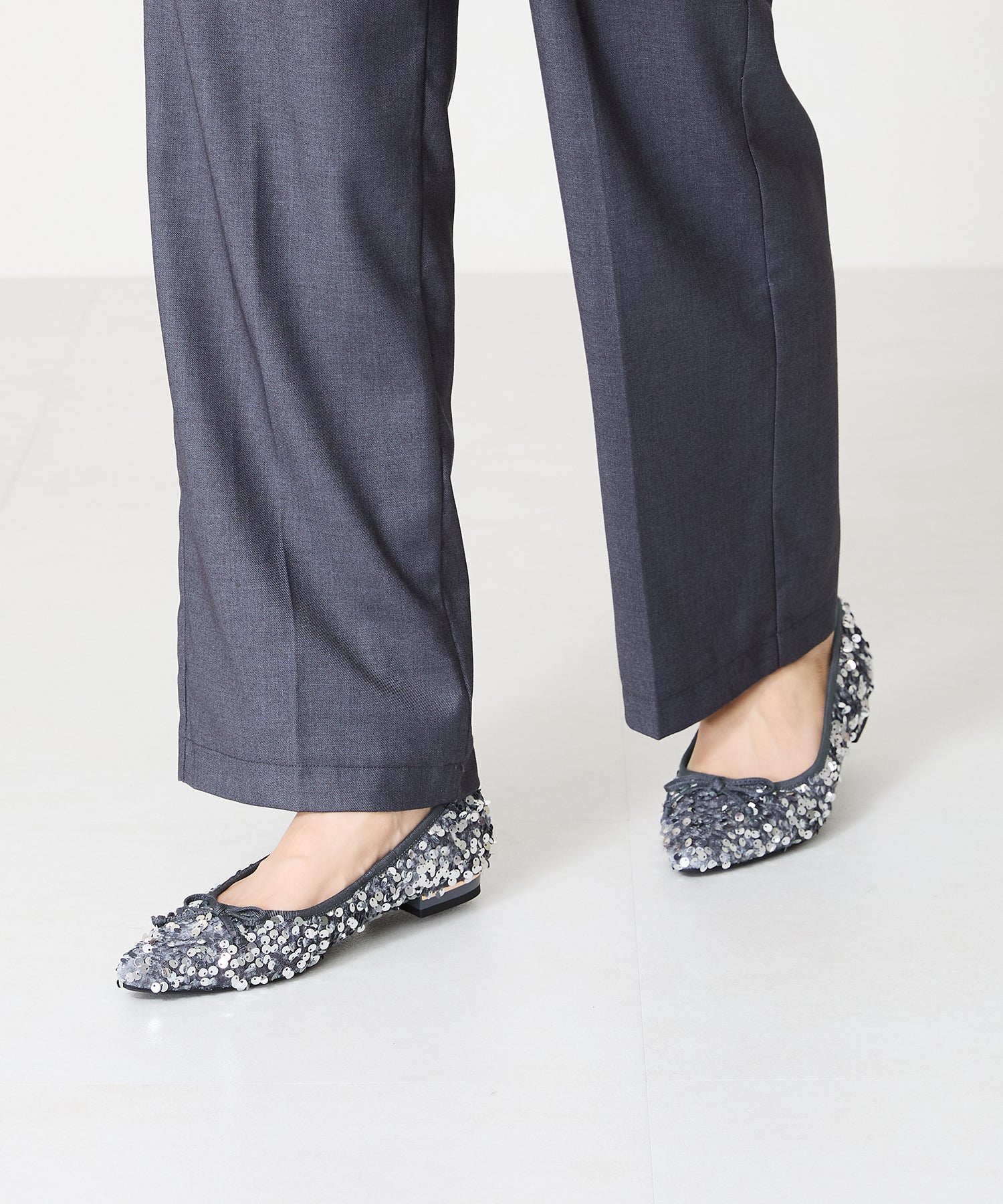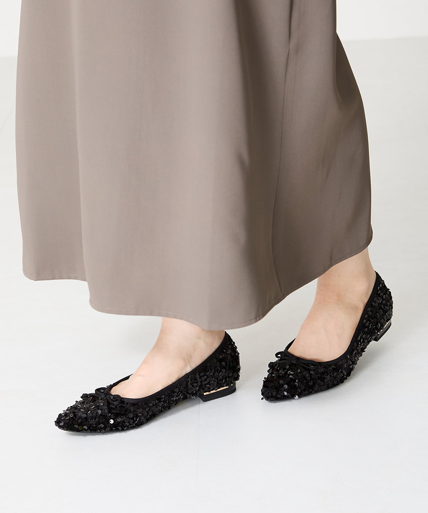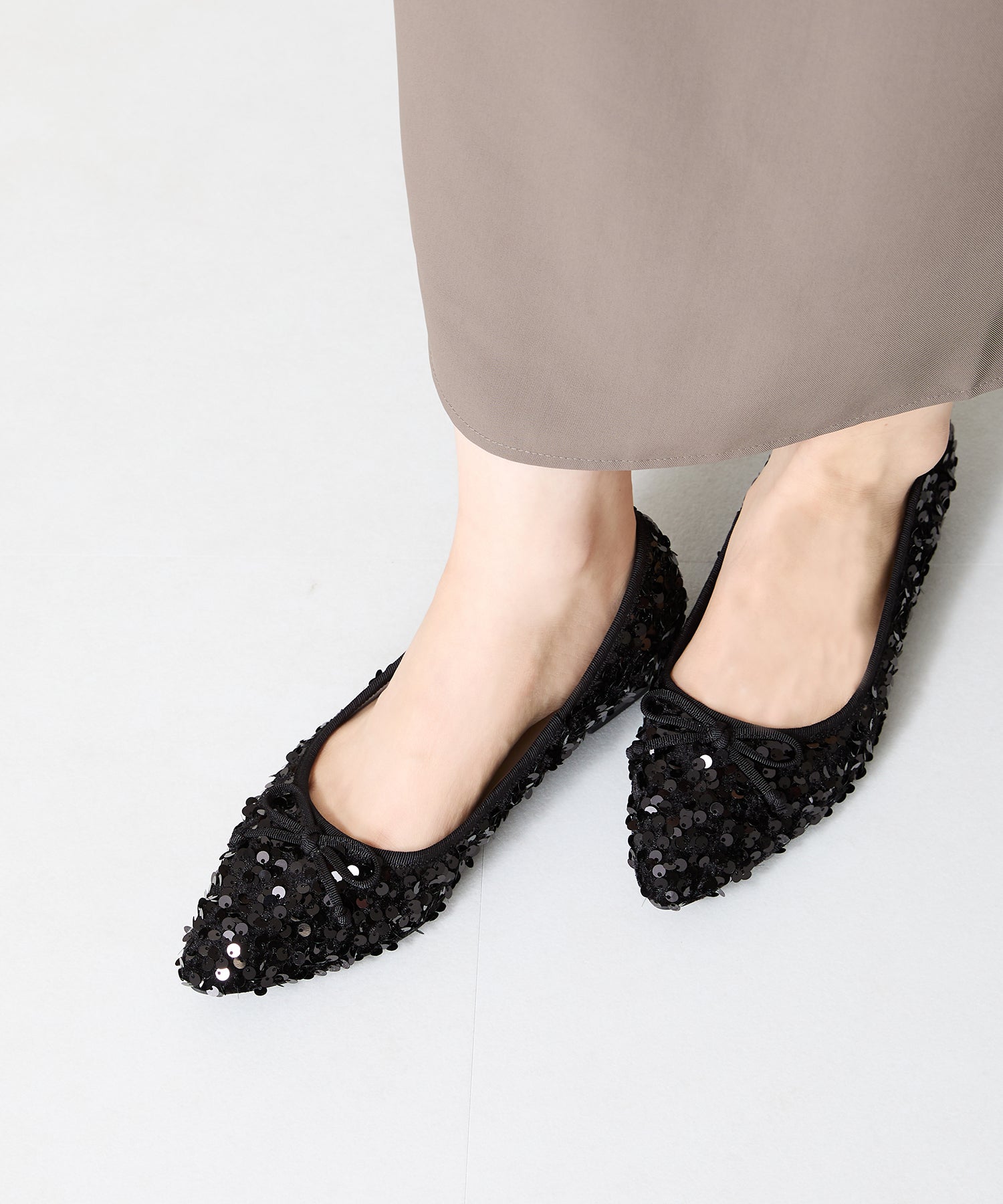 シーズンムード高まる重厚感のある生地に大粒のスパンコールをあしらったバレエシューズはトレンドのキーアイテム。ポインテッドトゥの大人っぽさと、さりげないリボンの甘さのバランスが絶妙で、デイリーに使えるフラットヒールなのも嬉しいポイント。派手すぎないブラックは普段のスタリングに取り入れやすく、主役級のシルバーとピンクは足元に華やかさを添えてくれるおすすめカラー。