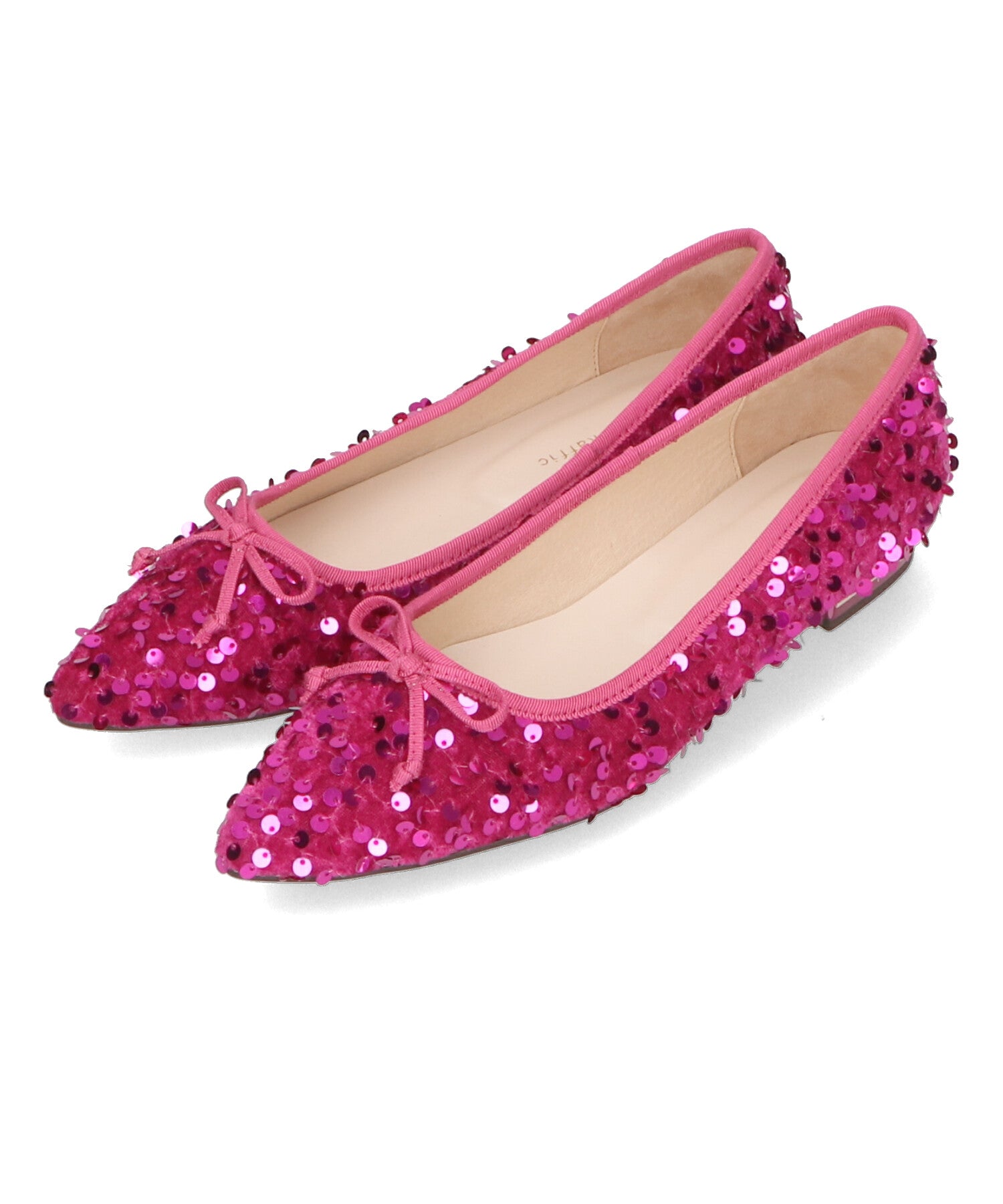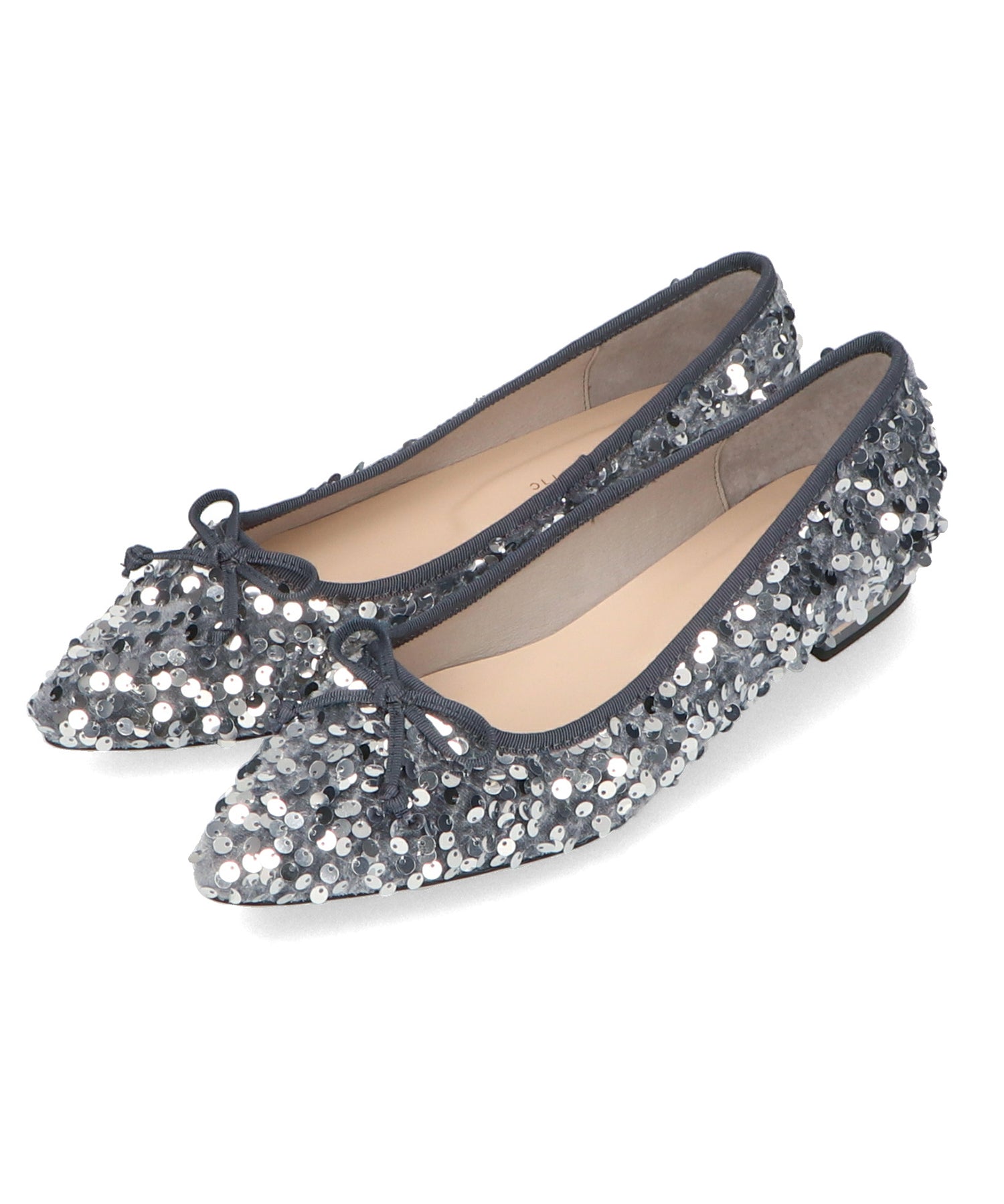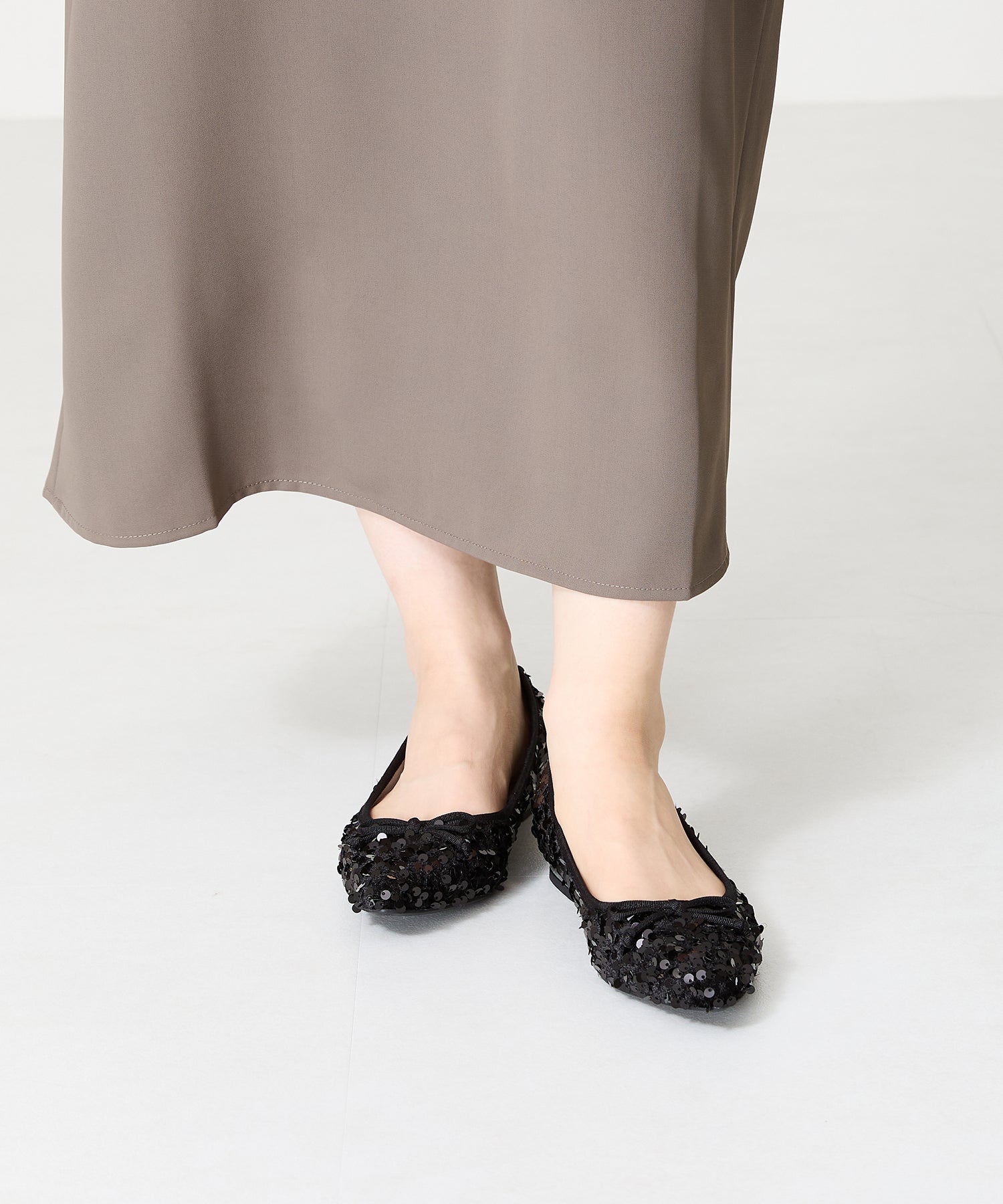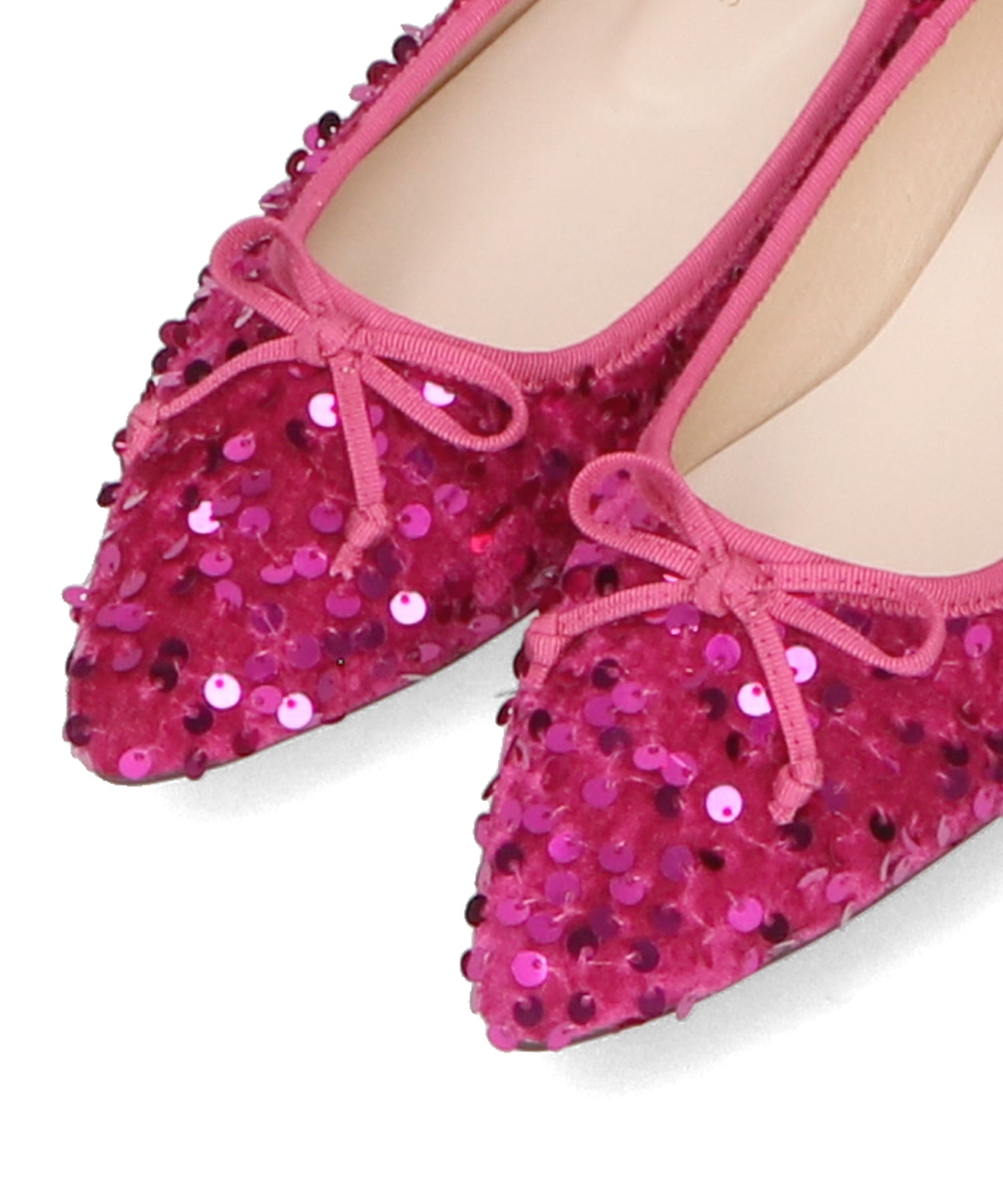 シーズンムード高まる重厚感のある生地に大粒のスパンコールをあしらったバレエシューズはトレンドのキーアイテム。ポインテッドトゥの大人っぽさと、さりげないリボンの甘さのバランスが絶妙で、デイリーに使えるフラットヒールなのも嬉しいポイント。派手すぎないブラックは普段のスタリングに取り入れやすく、主役級のシルバーとピンクは足元に華やかさを添えてくれるおすすめカラー。