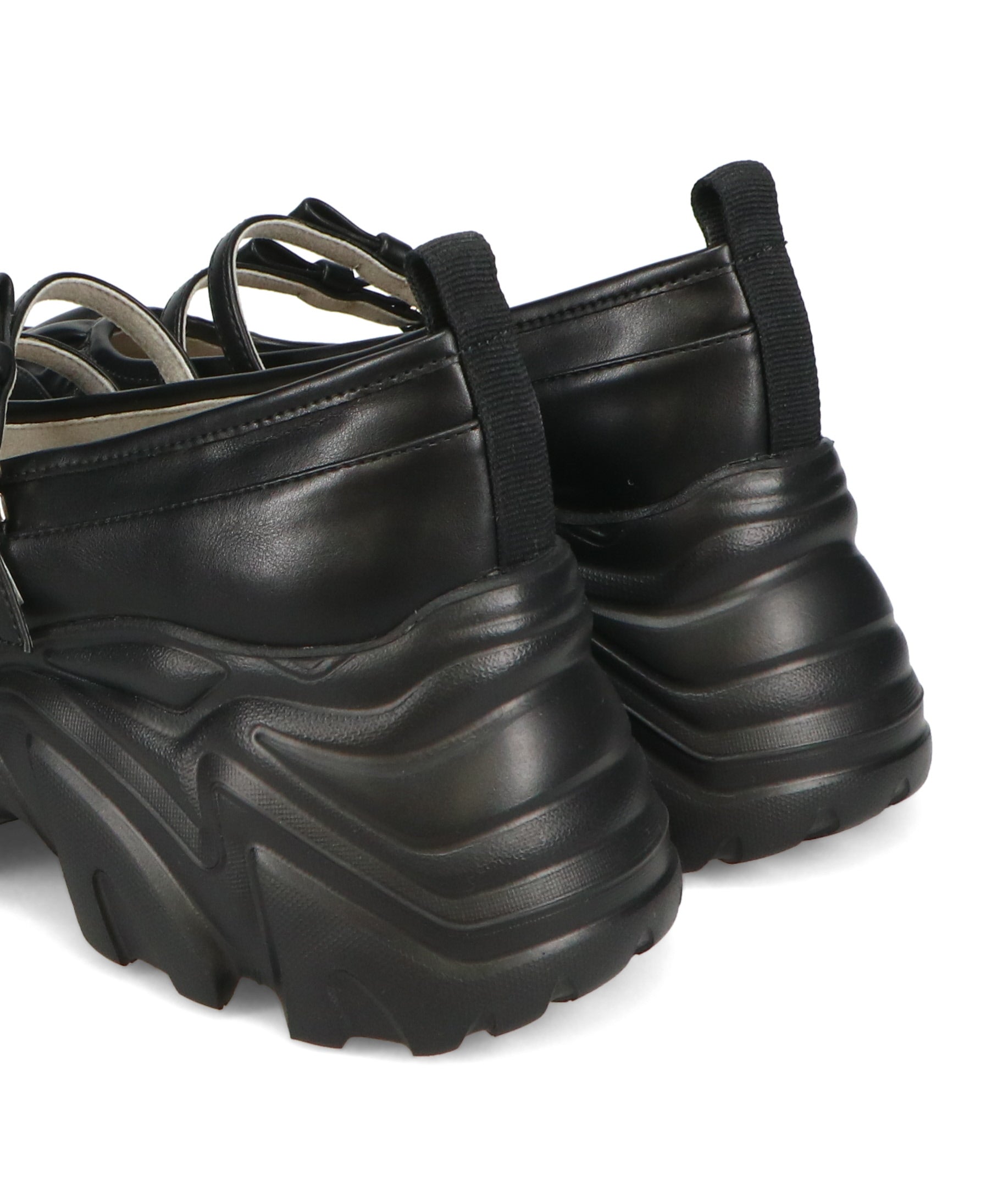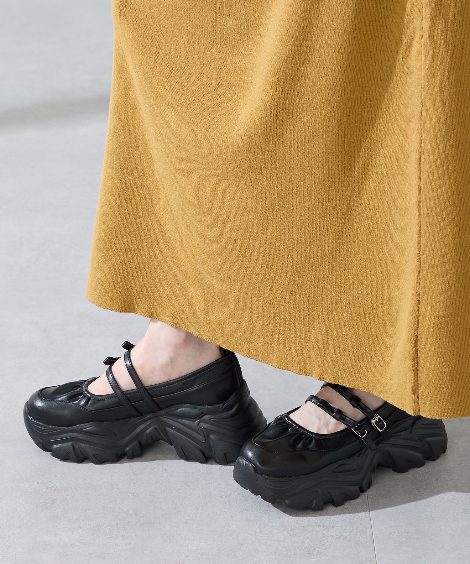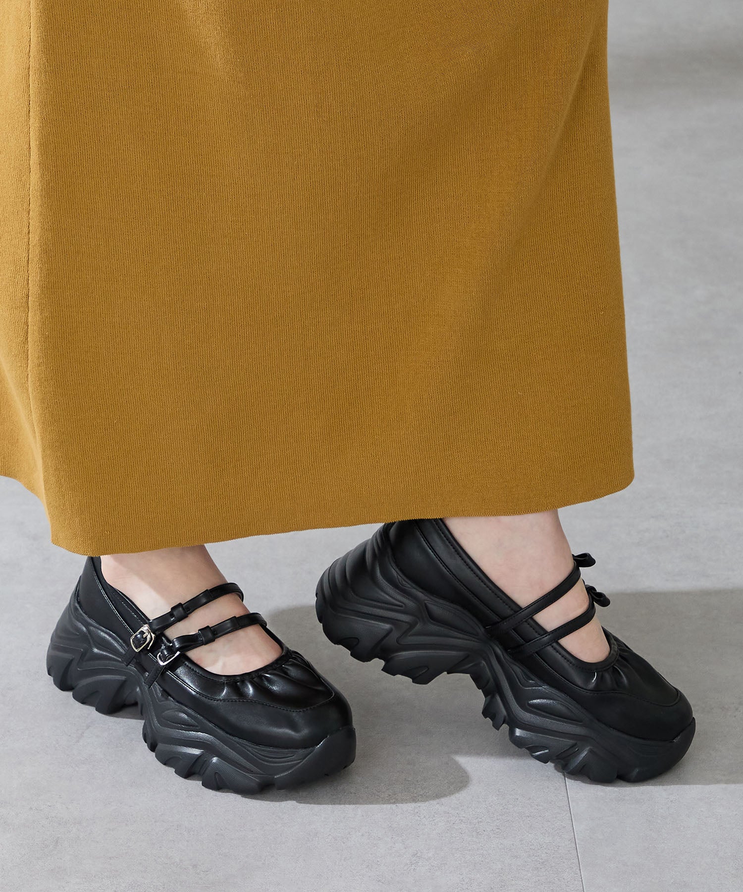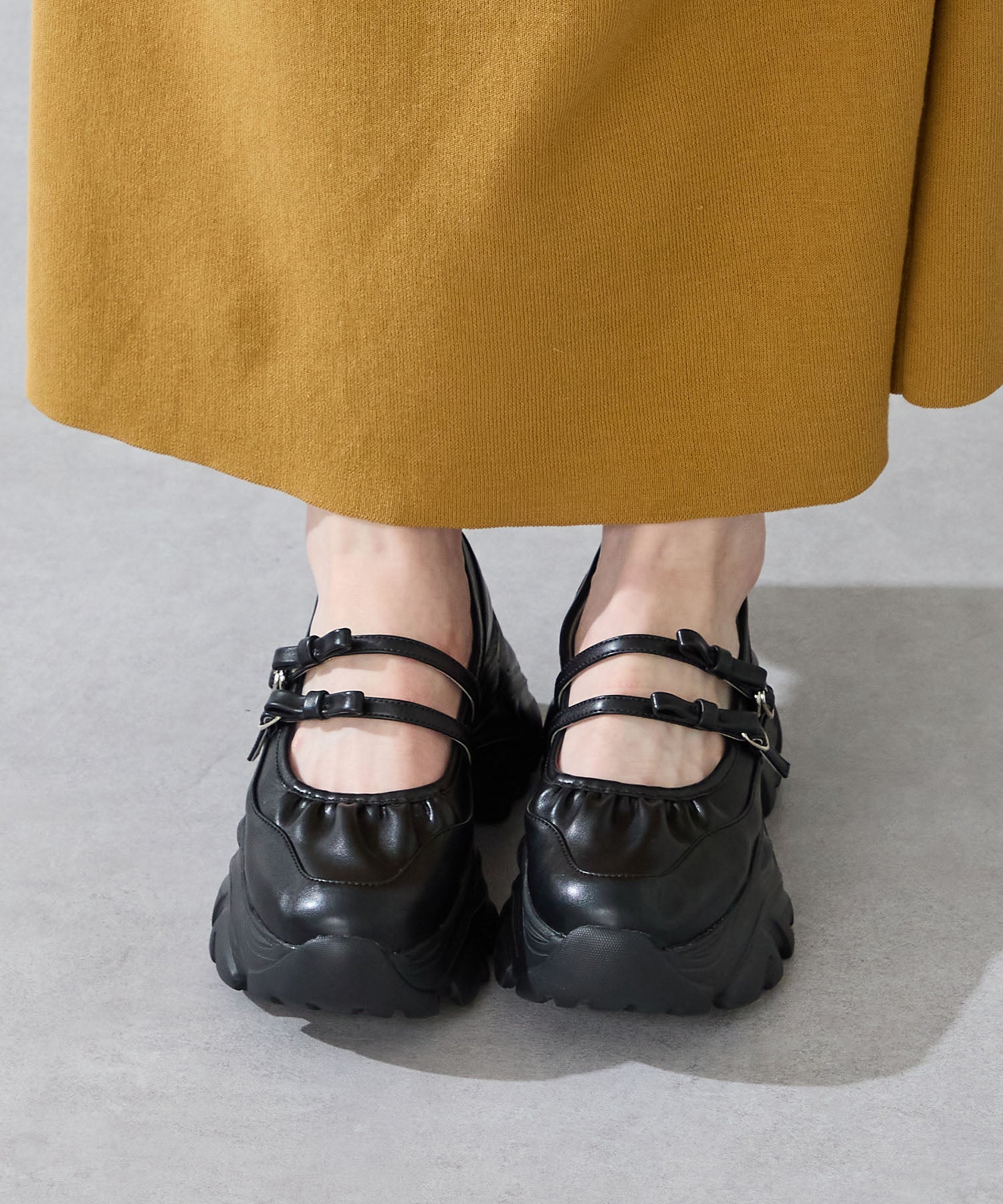ストラップにさりげなく施したリボンデザインのガーリーさと、スニーカーソールの歩きやすさを両立した厚底シューズ。存在感がありながら華奢なストラップで甲まわりをすっきり見せてくれて、履き口のギャザーデザインが程よいアクセント。高低差が少ない弾力のあるソールでたくさん歩く日でも疲れにくいスポーツMIXな主役級の1足は、ソールをブラックに統一することでまとまりのある印象に。