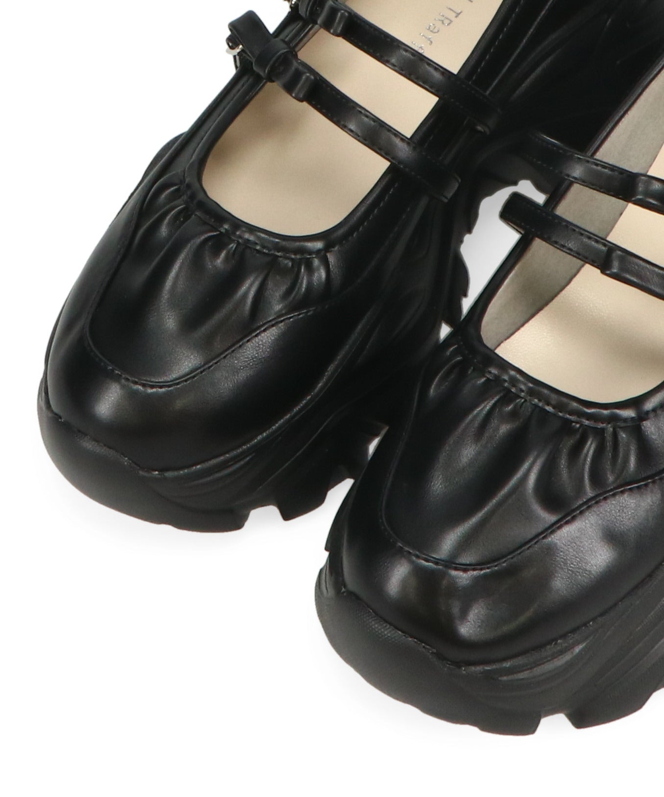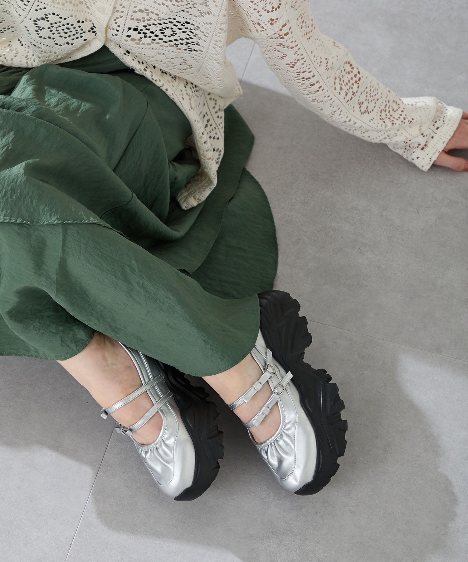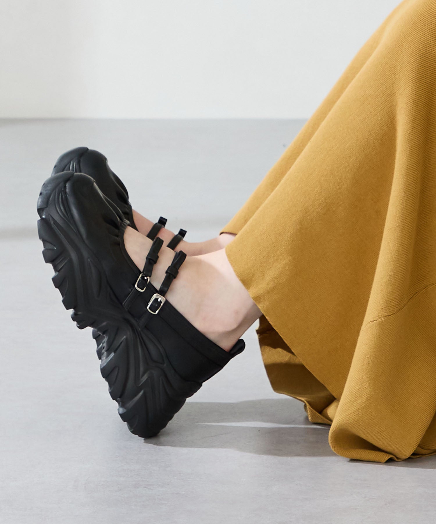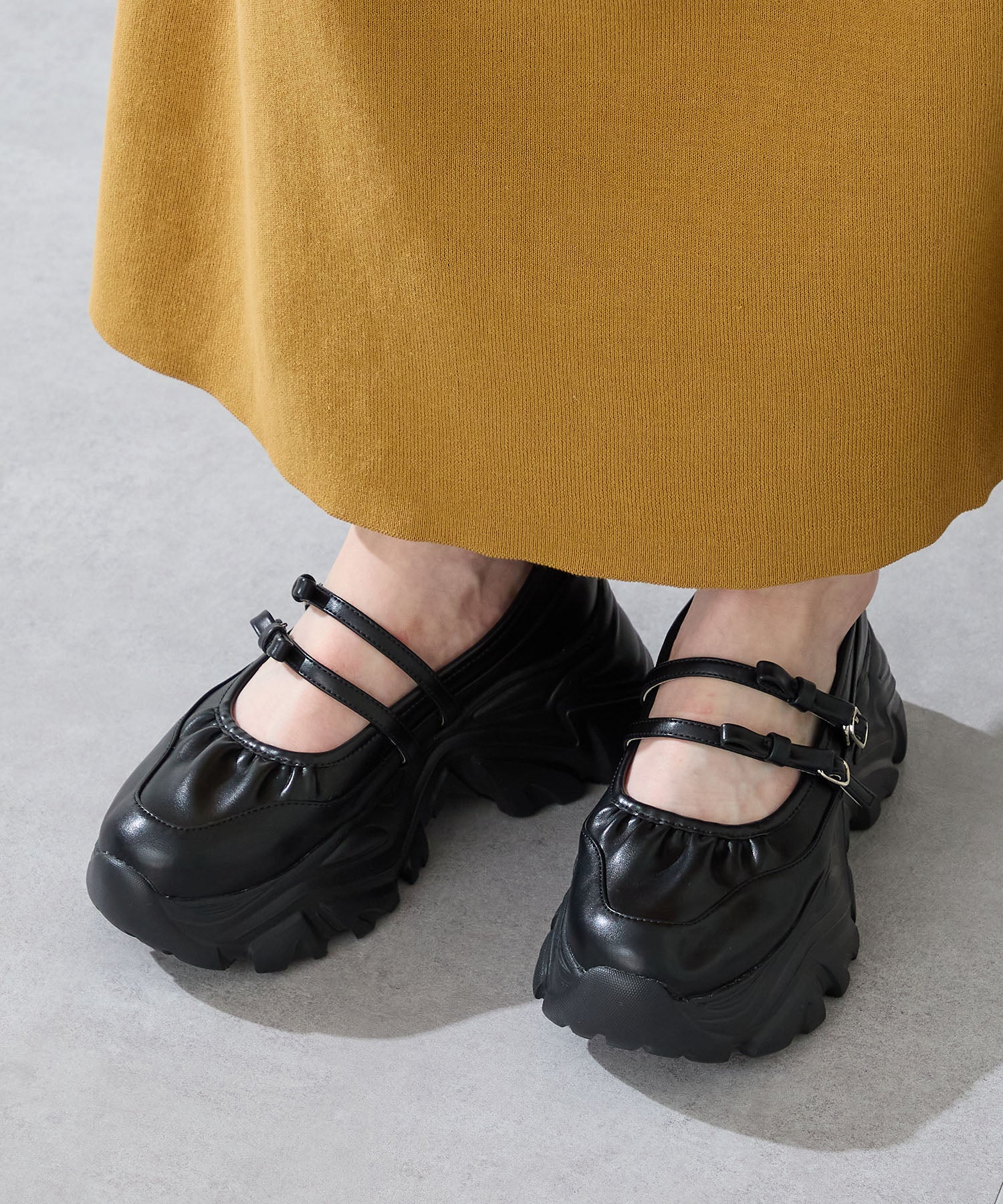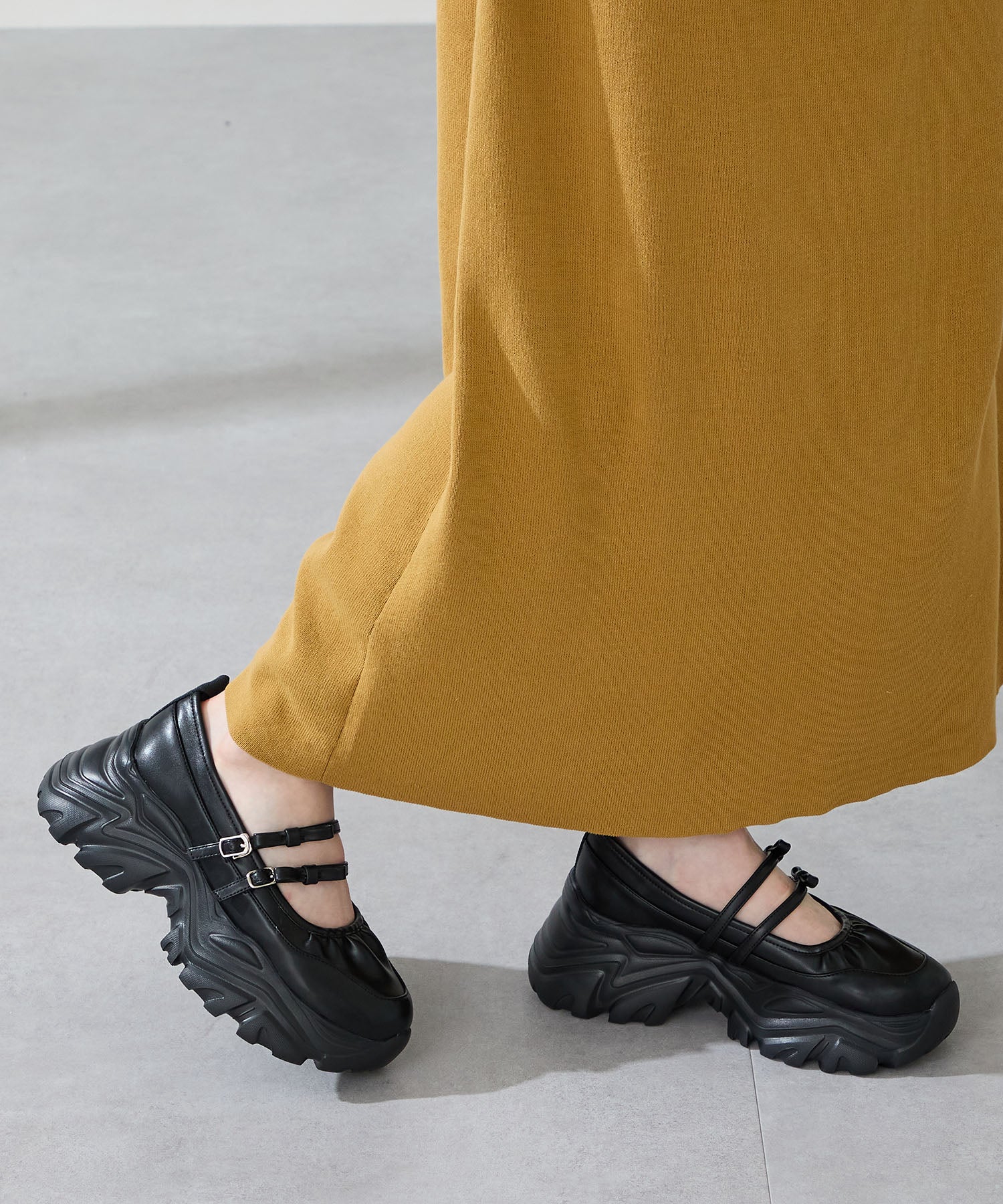 ストラップにさりげなく施したリボンデザインのガーリーさと、スニーカーソールの歩きやすさを両立した厚底シューズ。存在感がありながら華奢なストラップで甲まわりをすっきり見せてくれて、履き口のギャザーデザインが程よいアクセント。高低差が少ない弾力のあるソールでたくさん歩く日でも疲れにくいスポーツMIXな主役級の1足は、ソールをブラックに統一することでまとまりのある印象に。