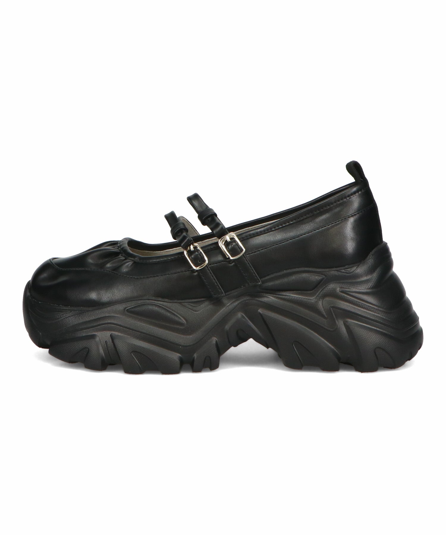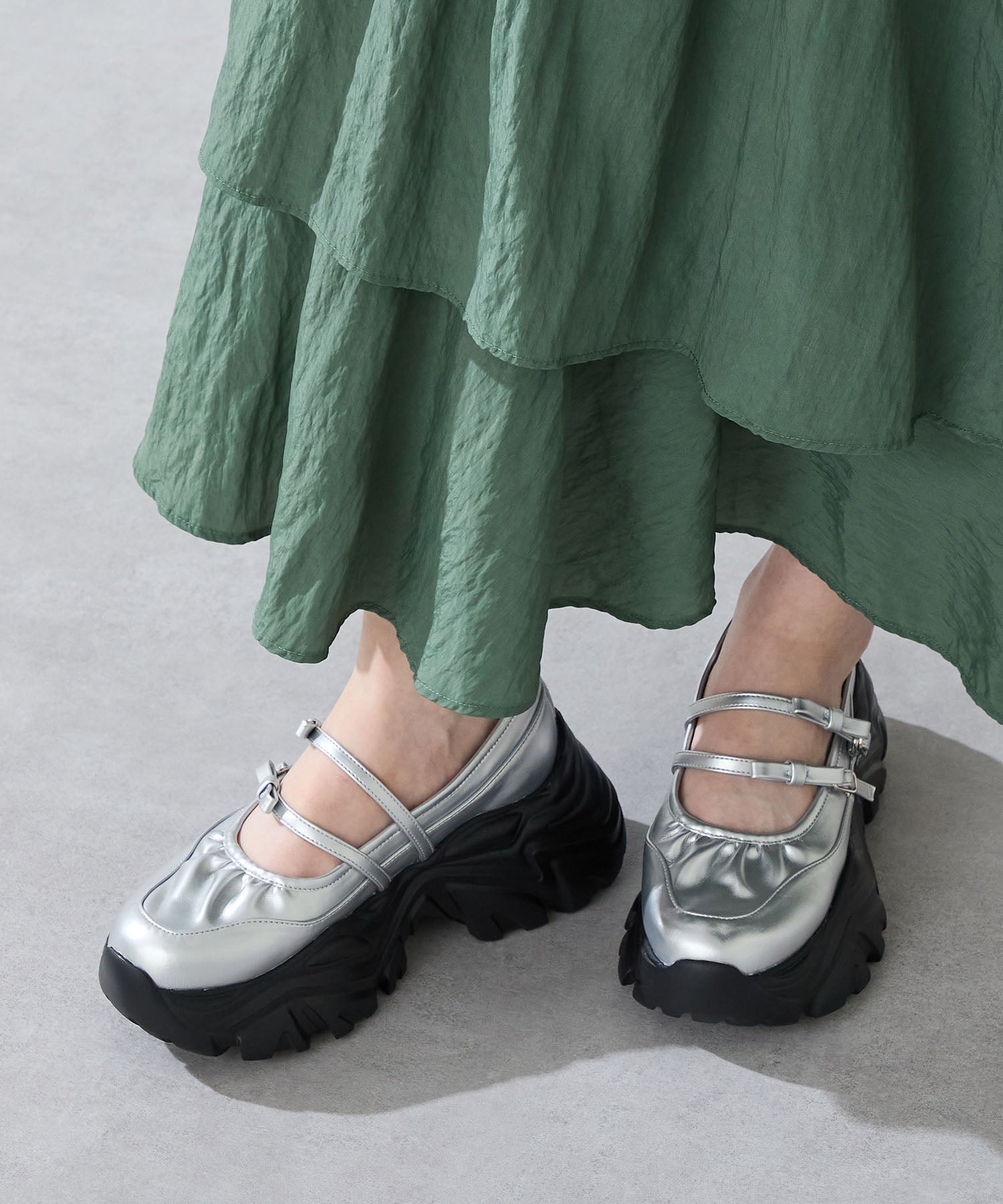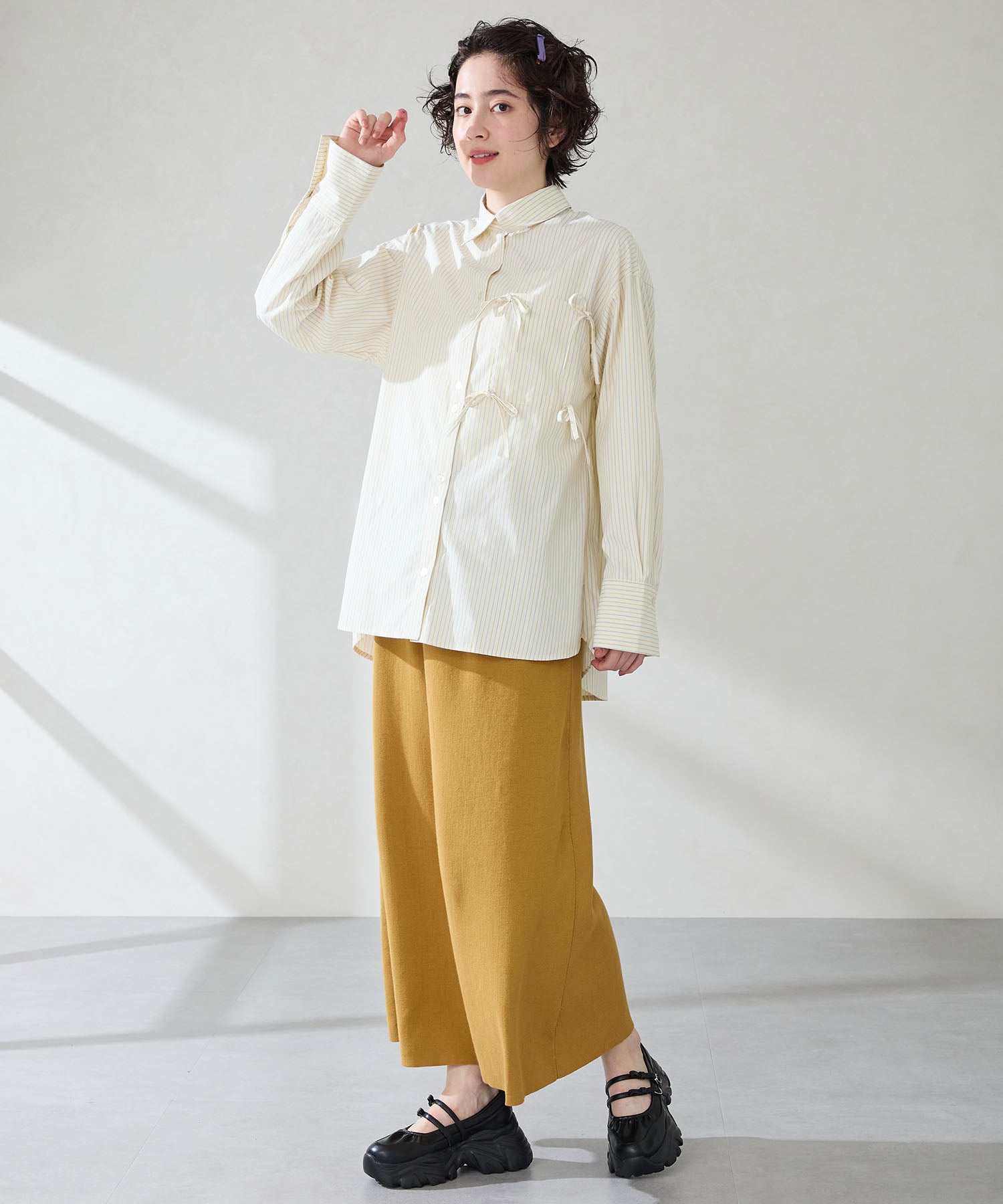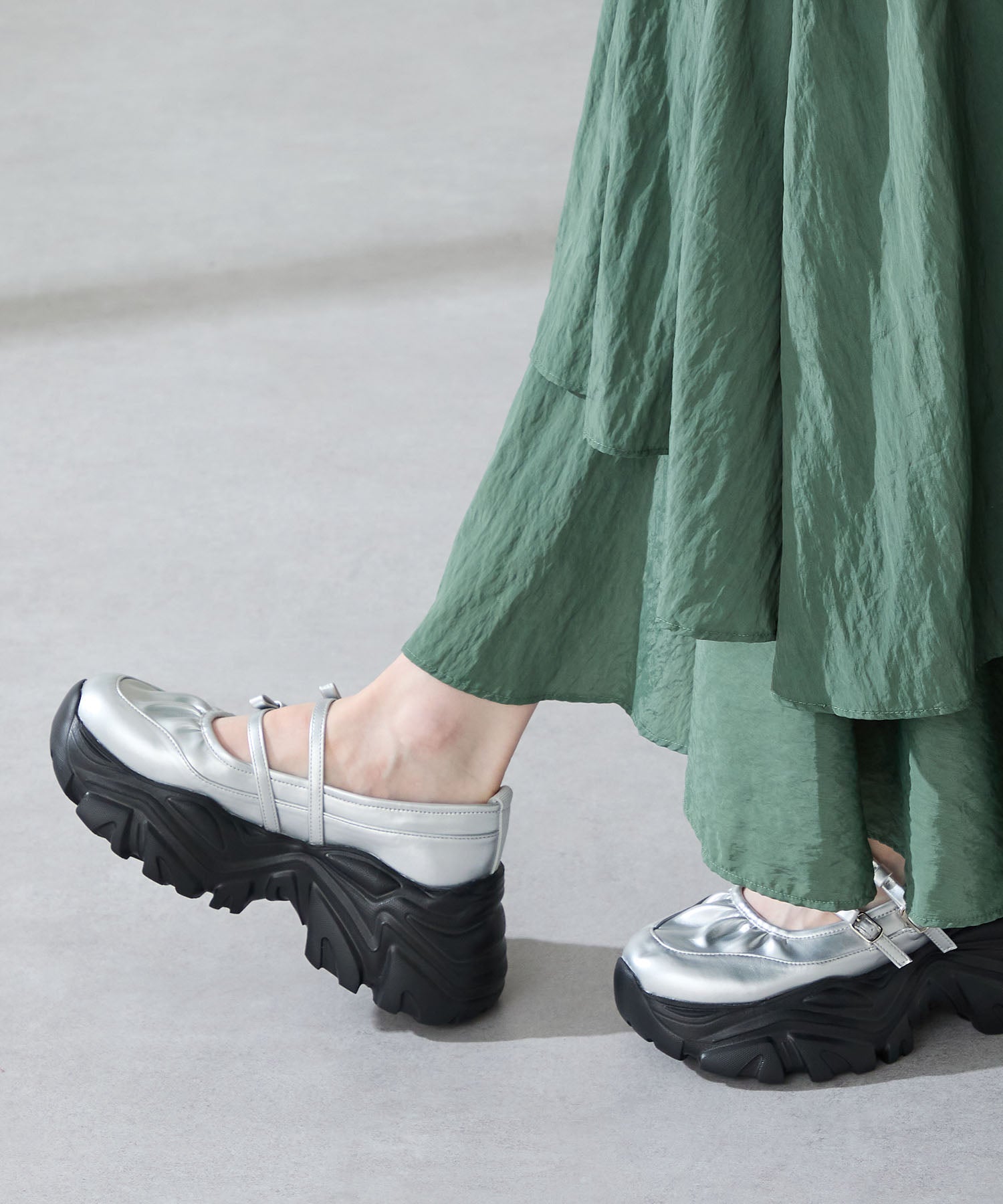 ストラップにさりげなく施したリボンデザインのガーリーさと、スニーカーソールの歩きやすさを両立した厚底シューズ。存在感がありながら華奢なストラップで甲まわりをすっきり見せてくれて、履き口のギャザーデザインが程よいアクセント。高低差が少ない弾力のあるソールでたくさん歩く日でも疲れにくいスポーツMIXな主役級の1足は、ソールをブラックに統一することでまとまりのある印象に。