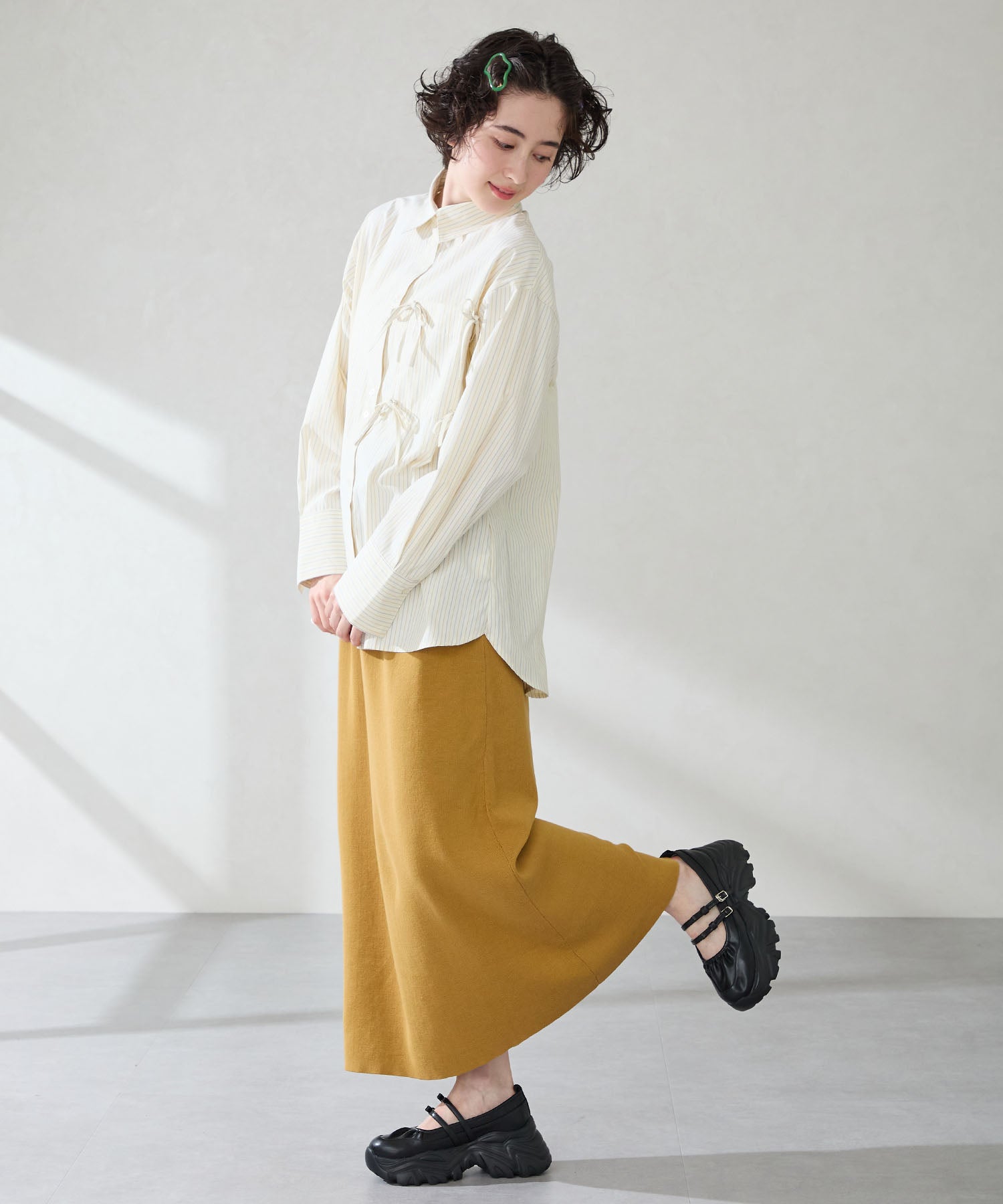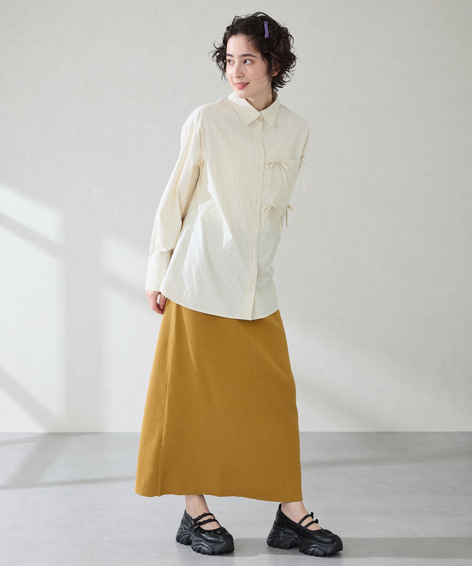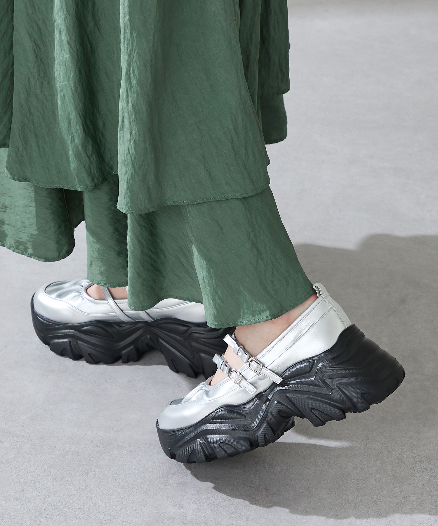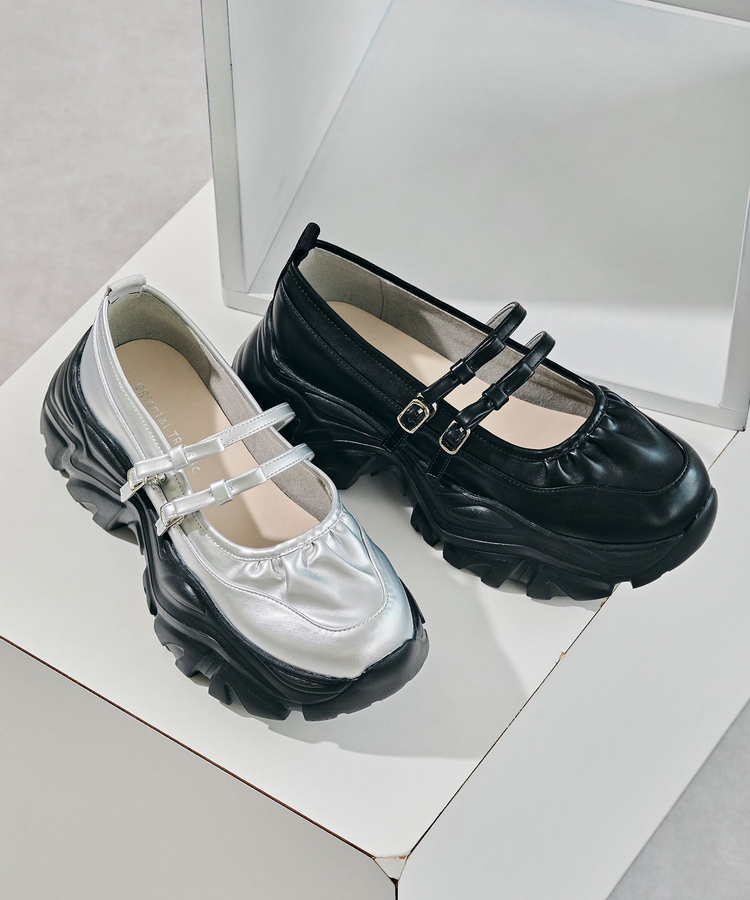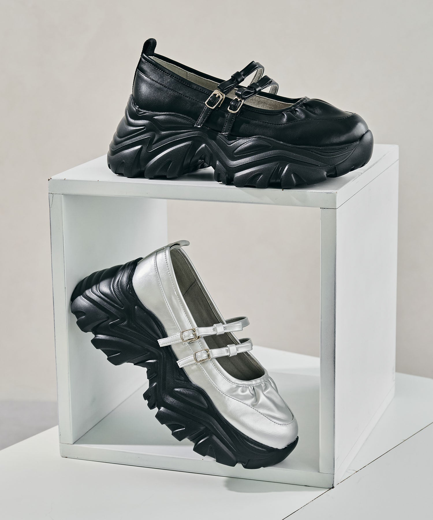 ストラップにさりげなく施したリボンデザインのガーリーさと、スニーカーソールの歩きやすさを両立した厚底シューズ。存在感がありながら華奢なストラップで甲まわりをすっきり見せてくれて、履き口のギャザーデザインが程よいアクセント。高低差が少ない弾力のあるソールでたくさん歩く日でも疲れにくいスポーツMIXな主役級の1足は、ソールをブラックに統一することでまとまりのある印象に。