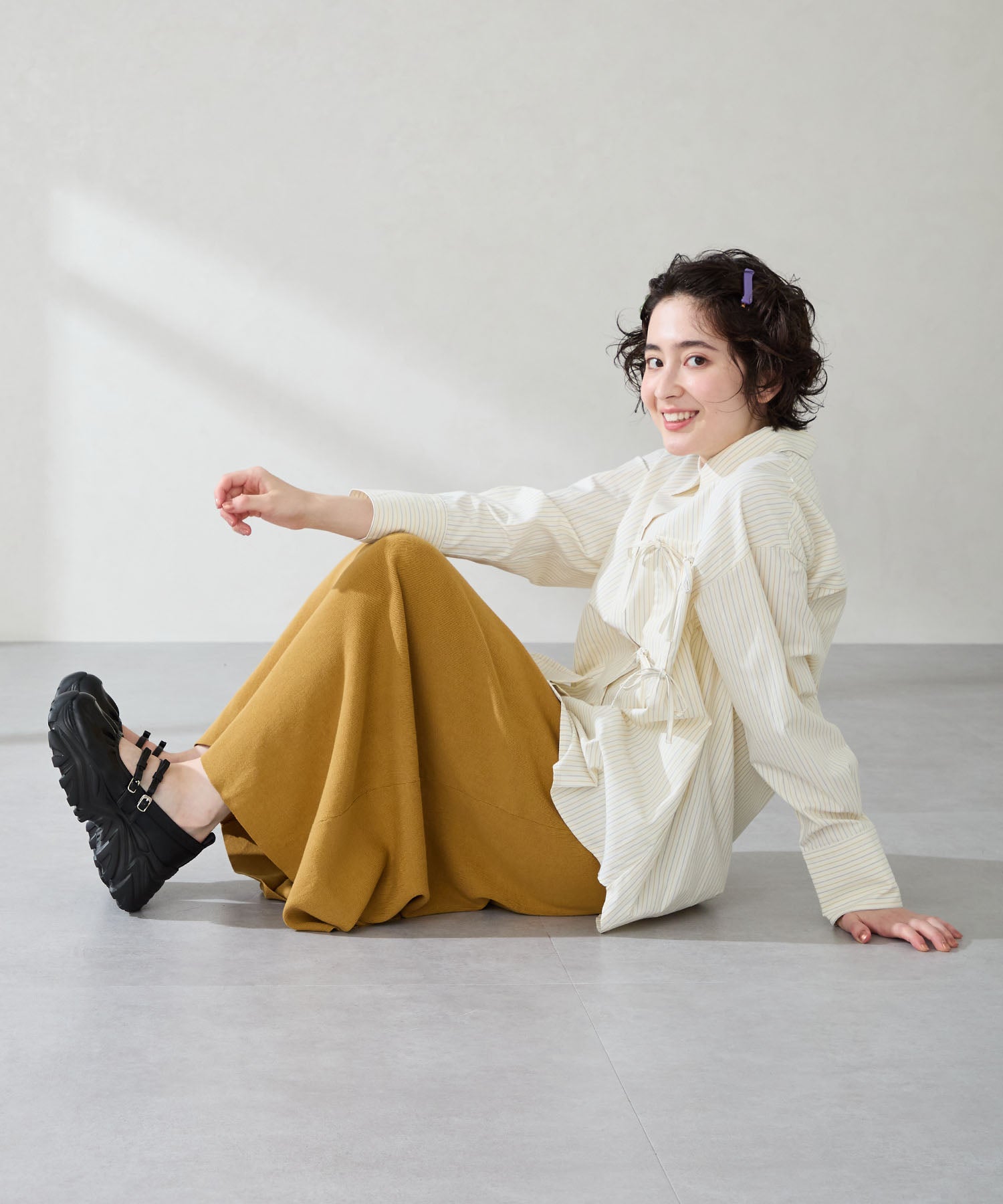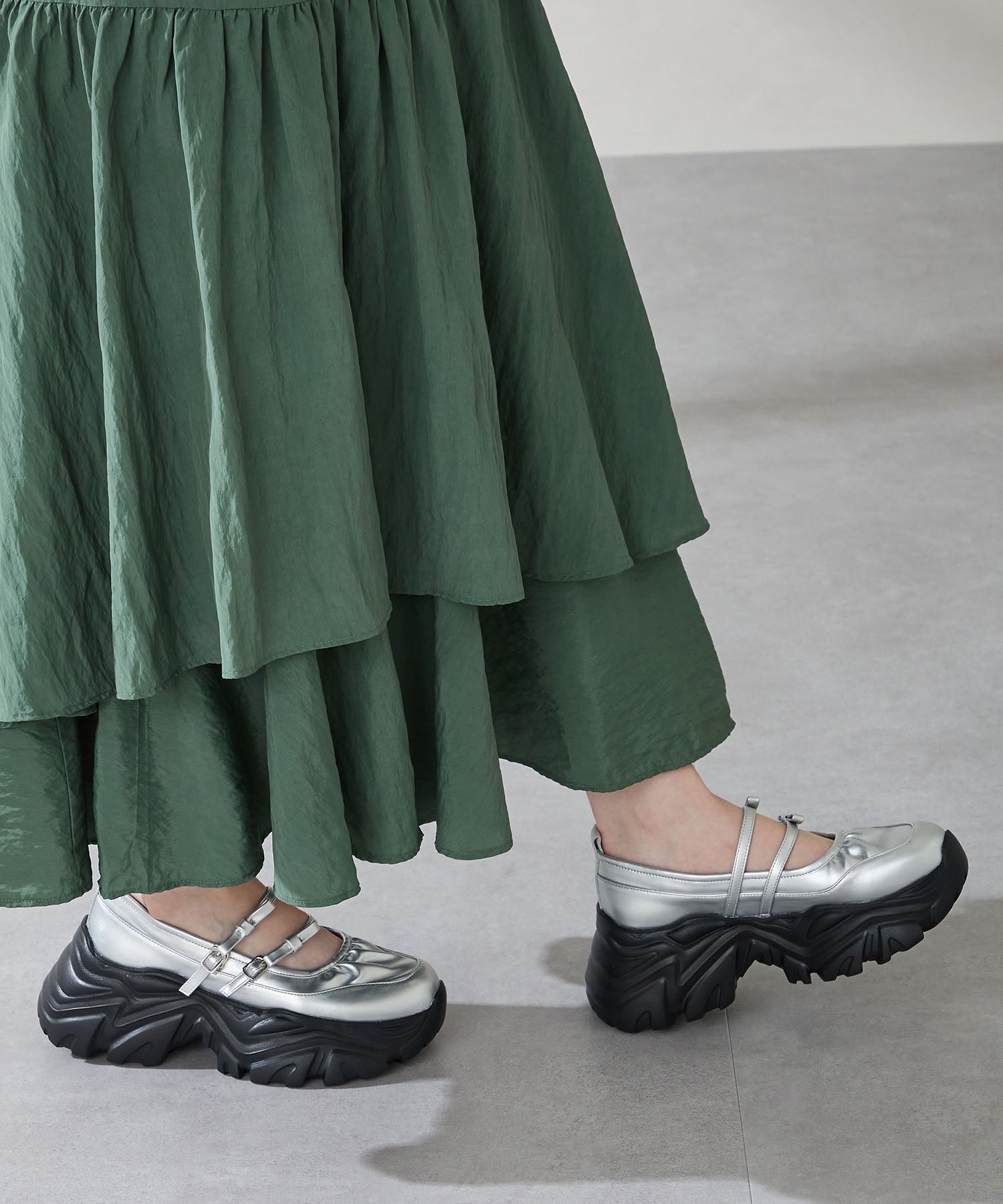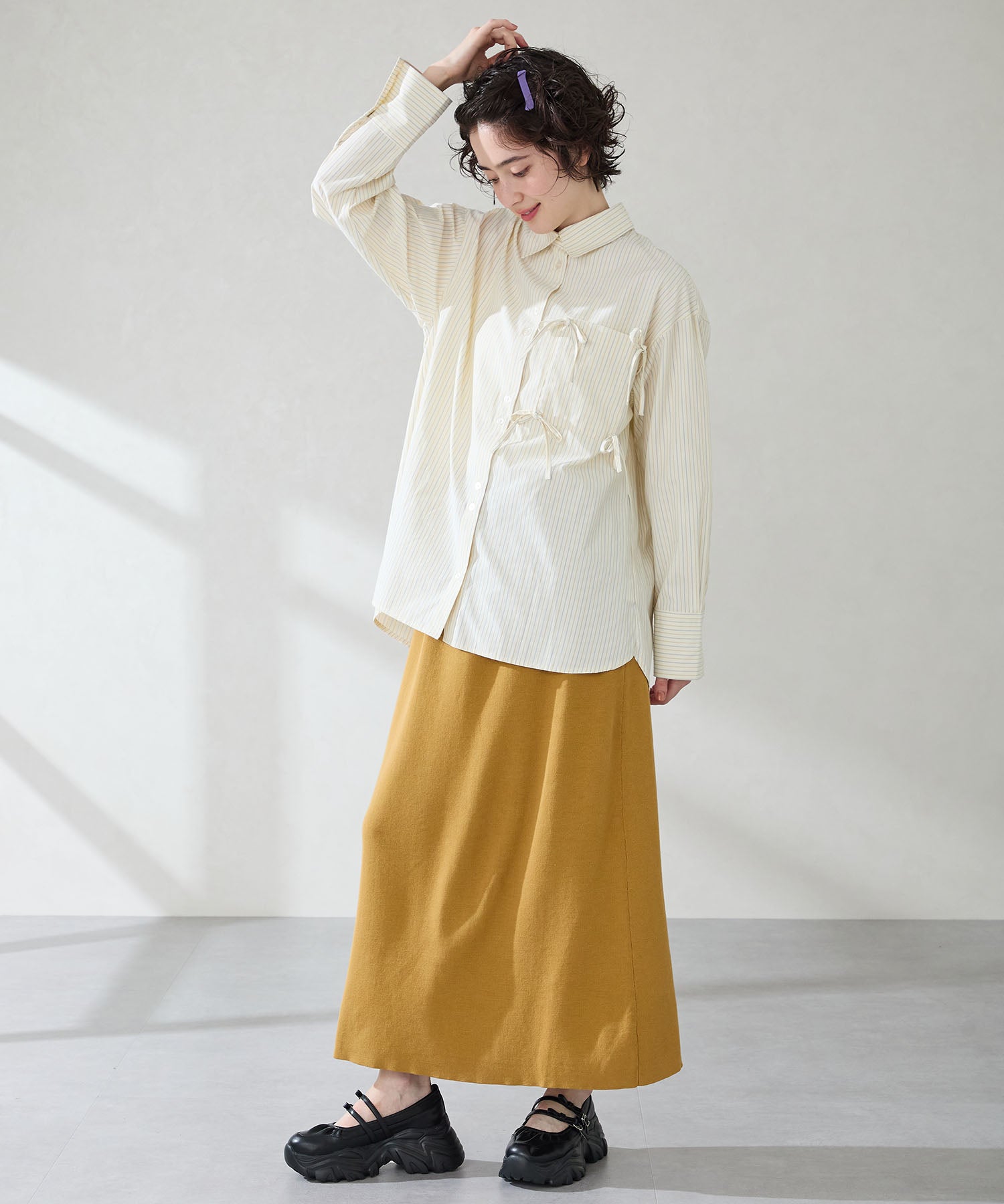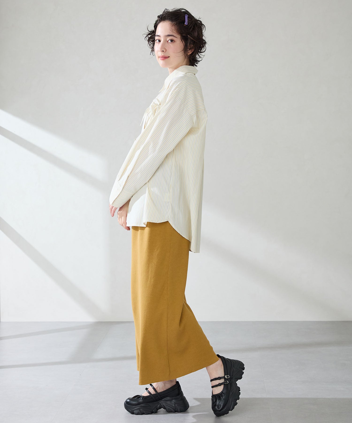 ストラップにさりげなく施したリボンデザインのガーリーさと、スニーカーソールの歩きやすさを両立した厚底シューズ。存在感がありながら華奢なストラップで甲まわりをすっきり見せてくれて、履き口のギャザーデザインが程よいアクセント。高低差が少ない弾力のあるソールでたくさん歩く日でも疲れにくいスポーツMIXな主役級の1足は、ソールをブラックに統一することでまとまりのある印象に。