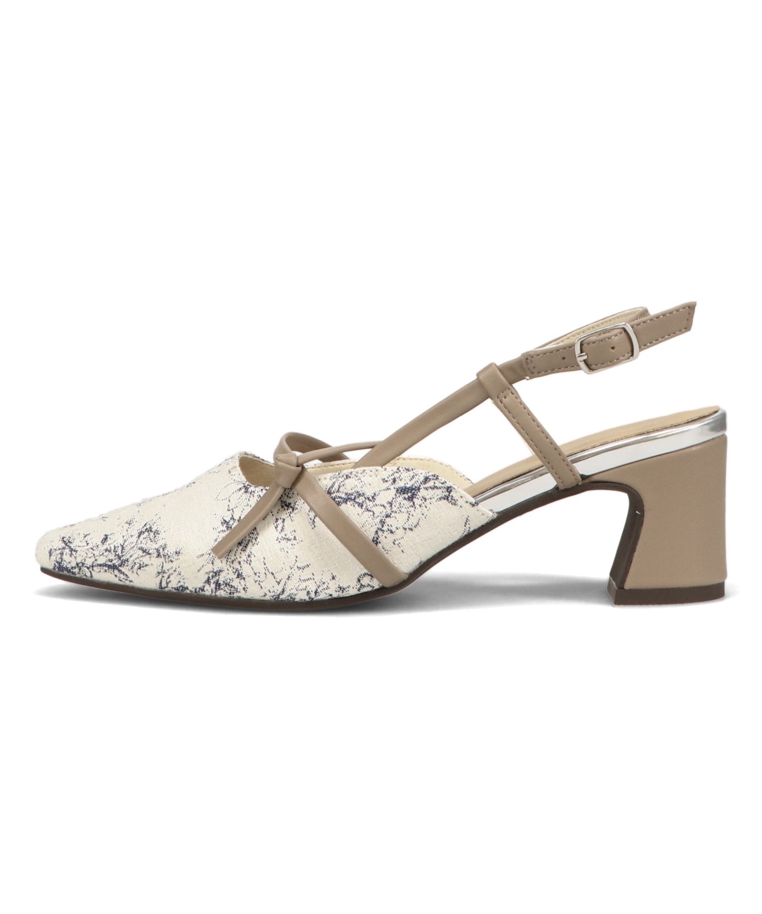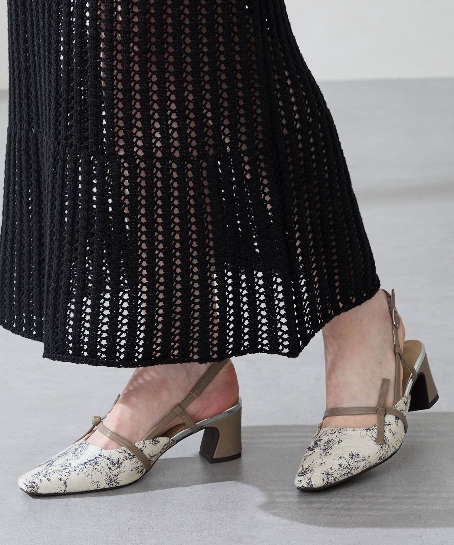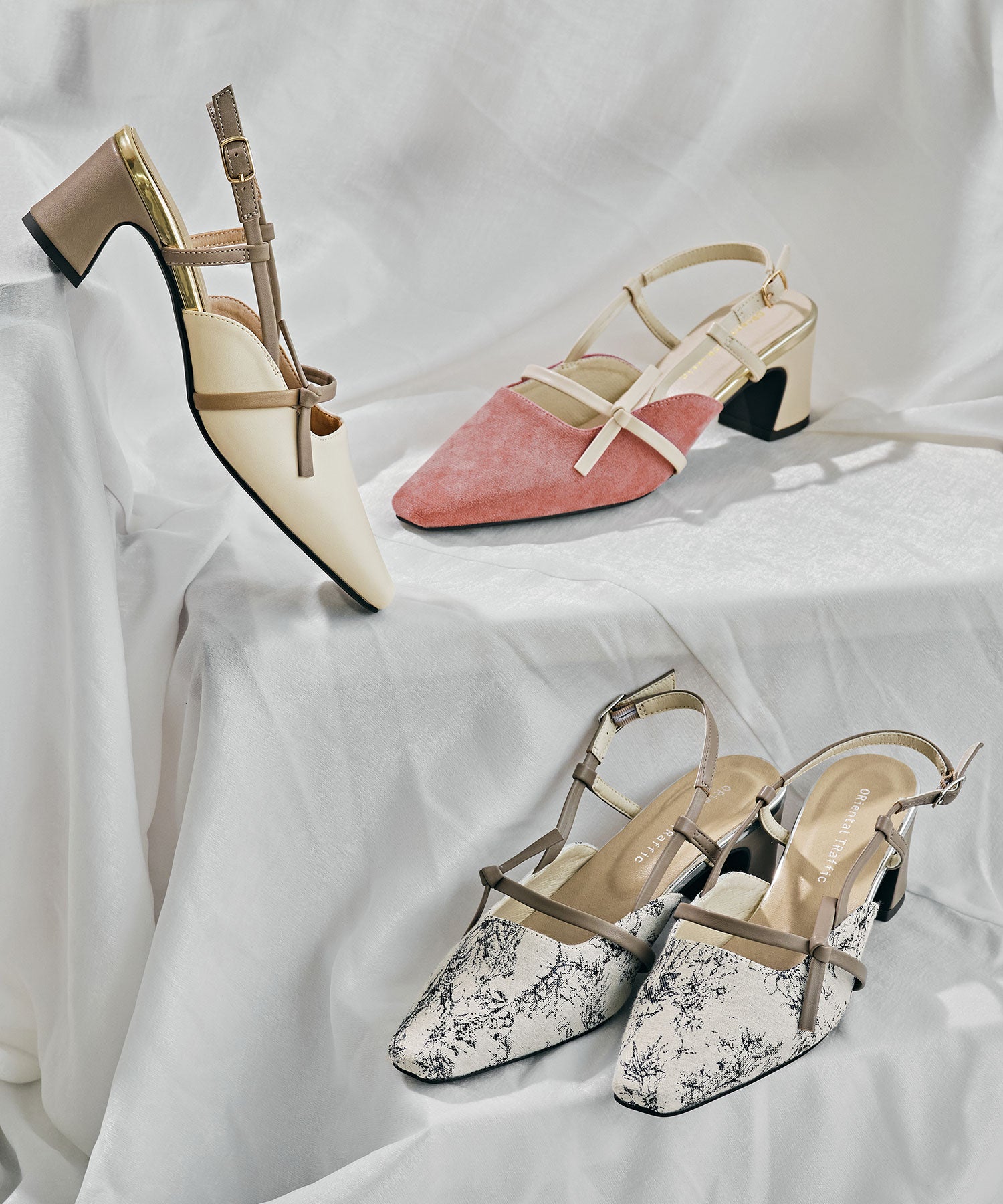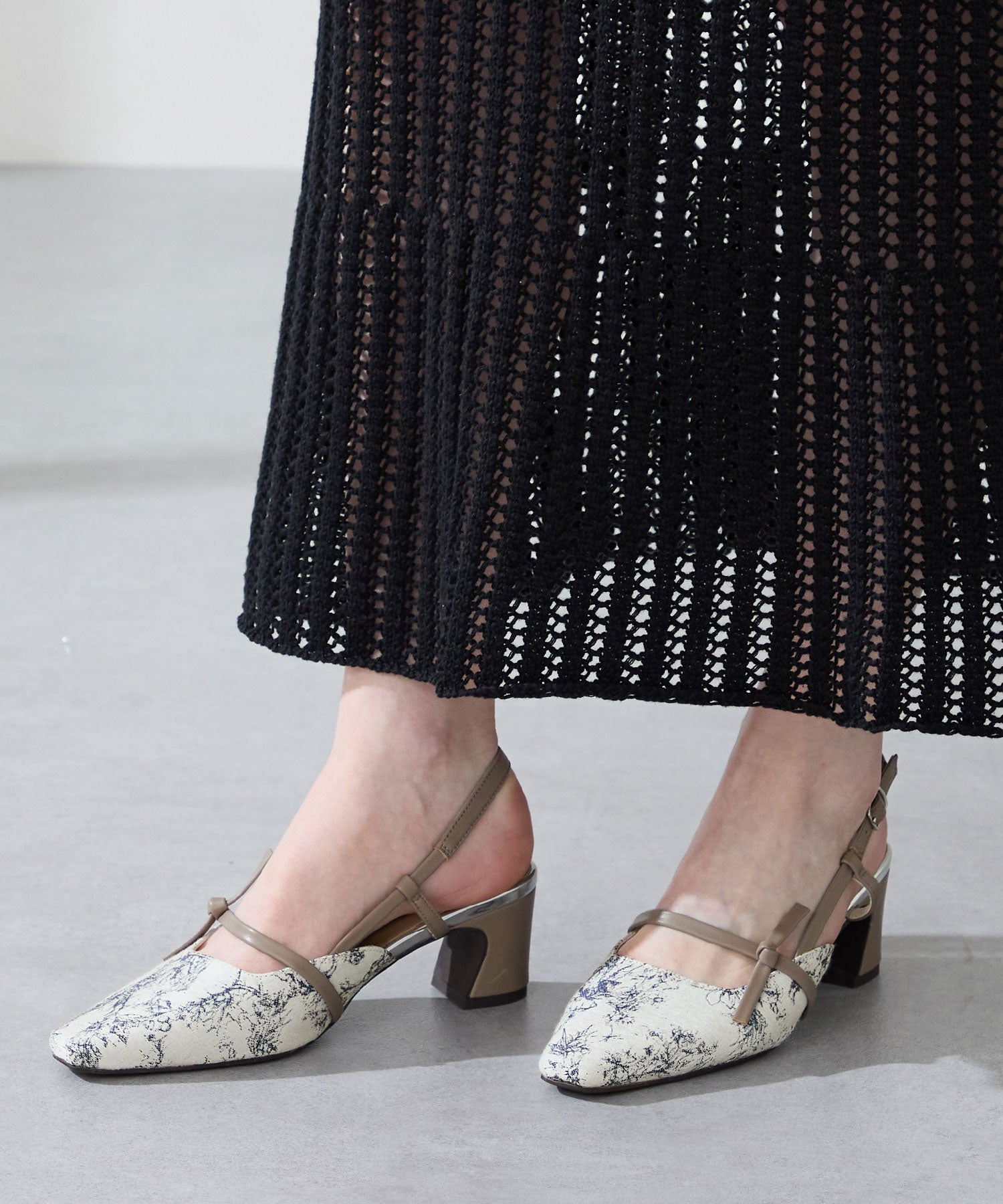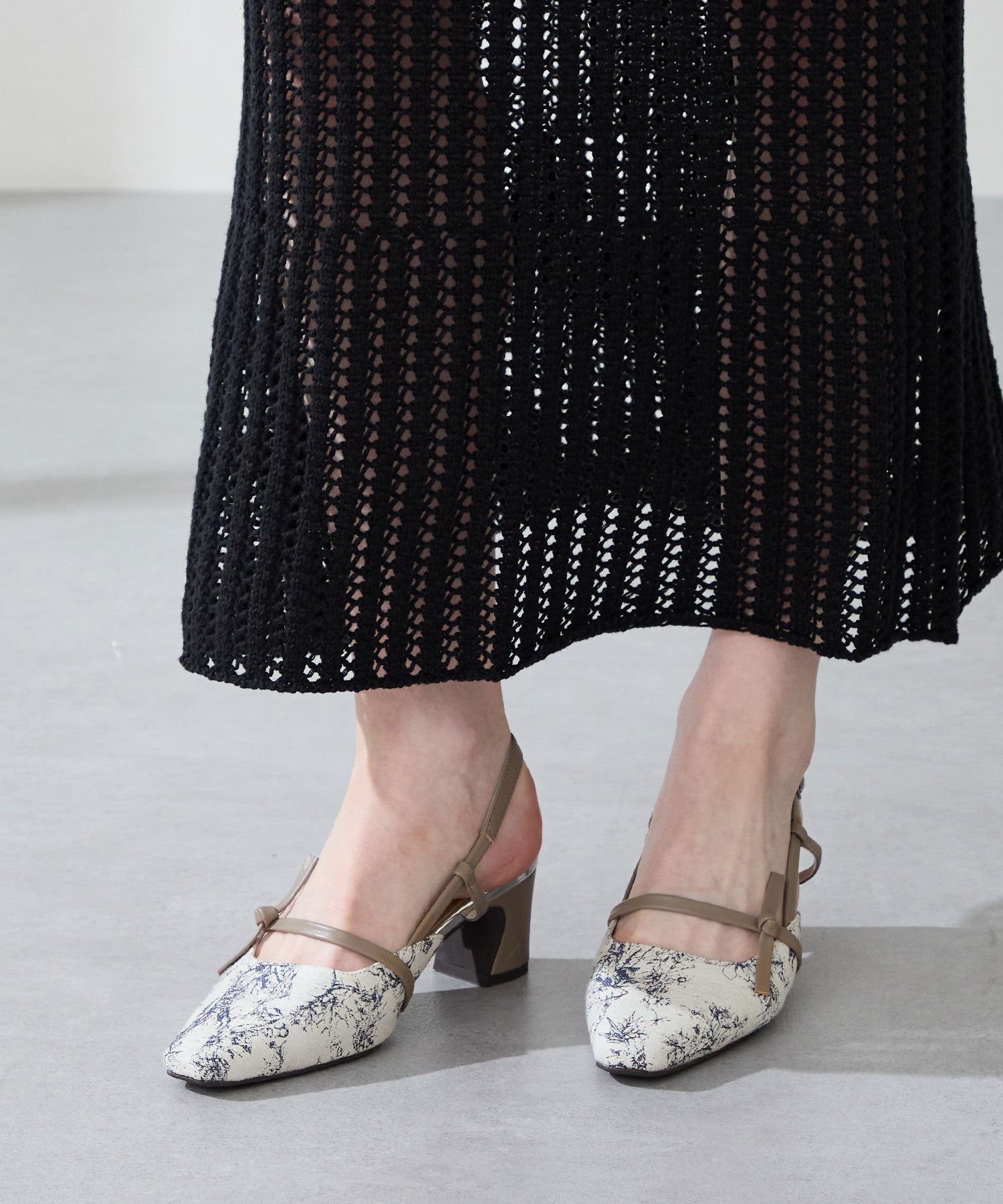 さりげなくサイドにあしらったリボンが女性心くすぐるパンプスは、素足でさらっと履けるので早めの時期から使えるアイテム。踵ストラップには隠しゴムが付いているのでラクに脱ぎ履きができるのが嬉しい。ブルーのトワルドジュイ柄は上品に仕上がるおすすめカラー。カラーによって柄や素材が異なったバリエーションで、様々なスタイルが楽しめる1足。