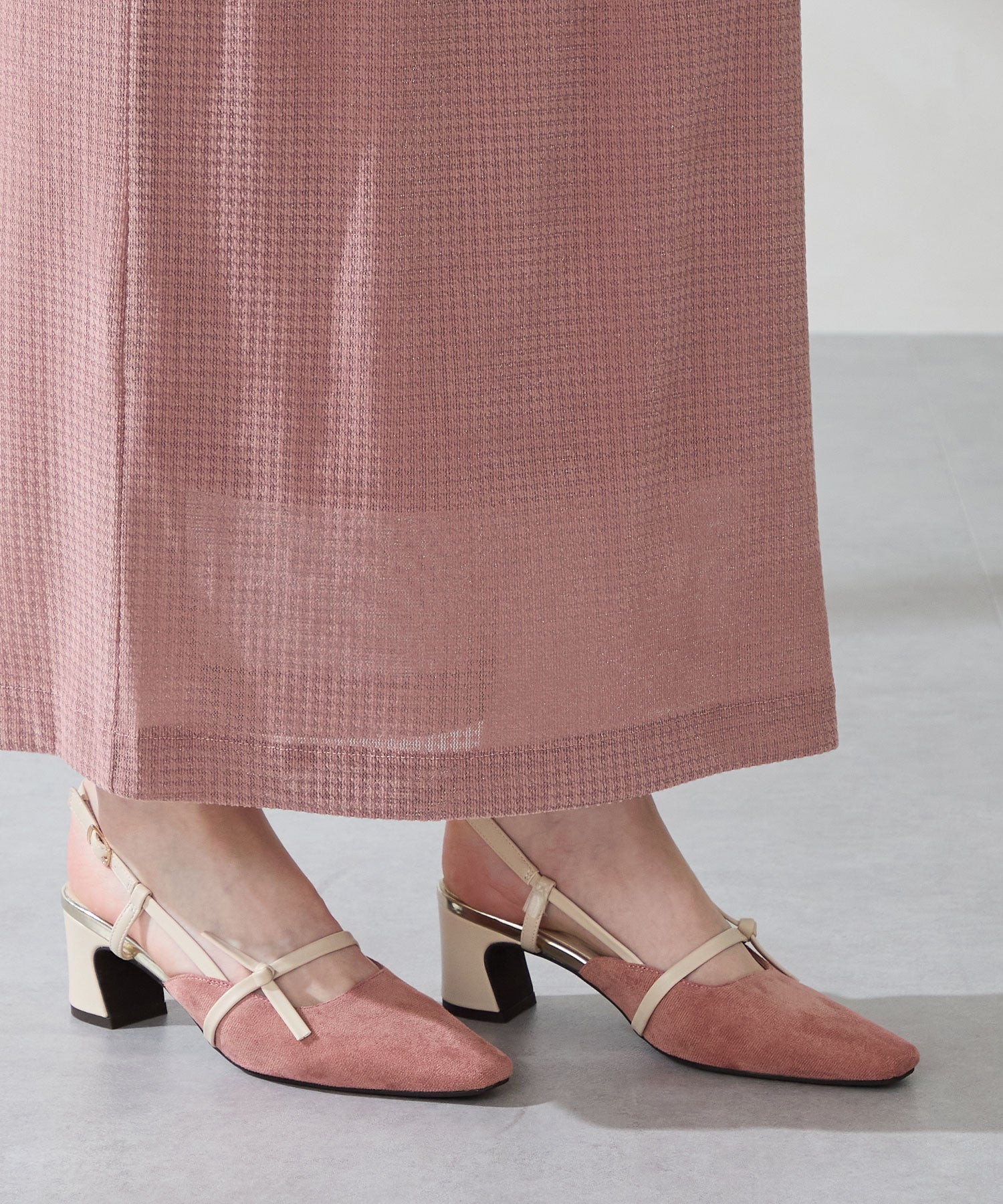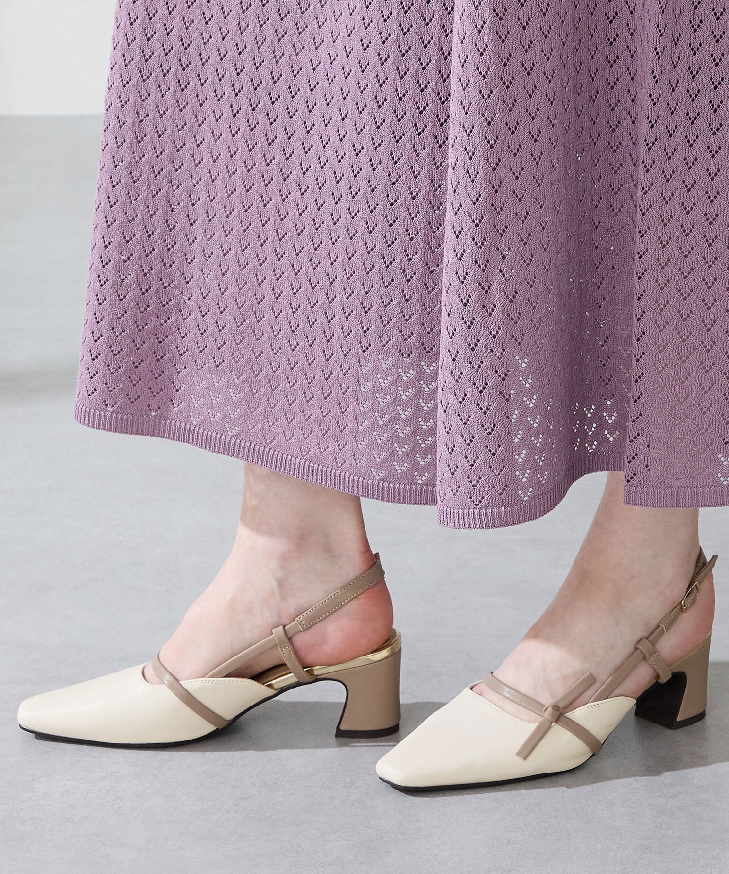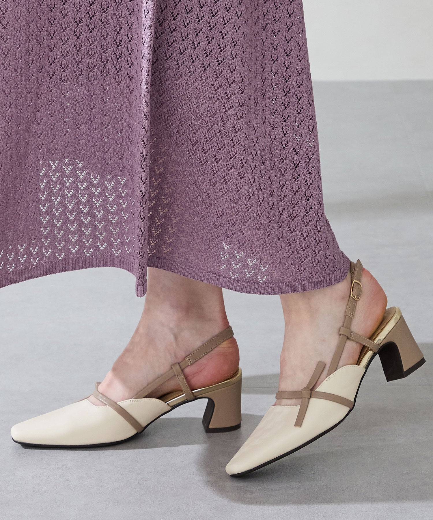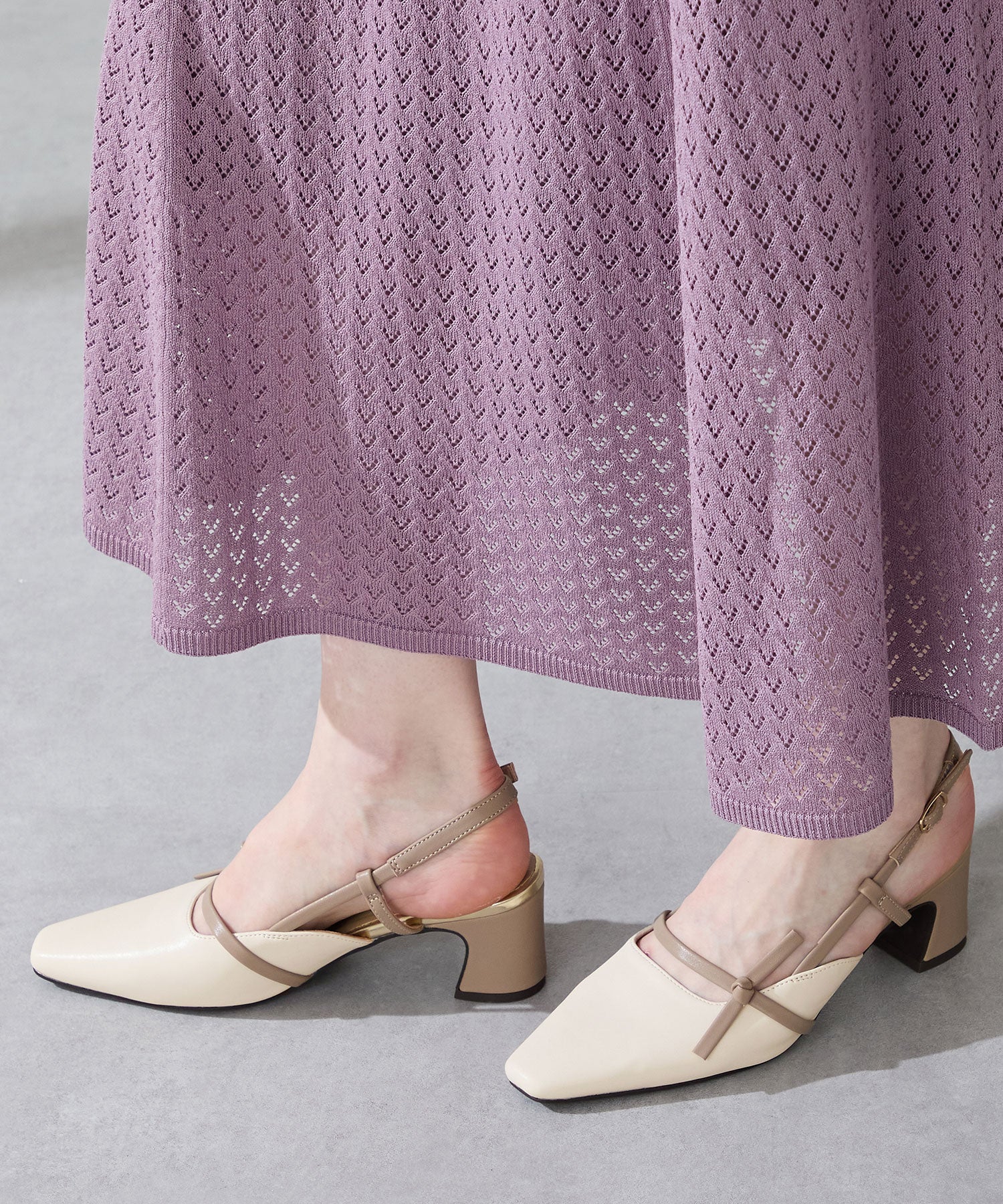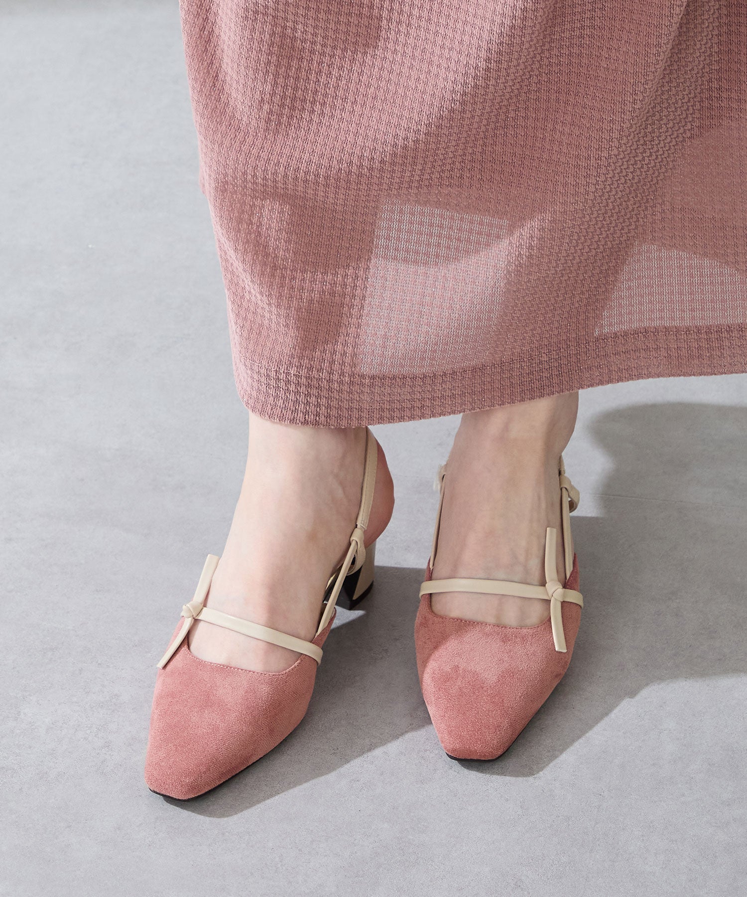 さりげなくサイドにあしらったリボンが女性心くすぐるパンプスは、素足でさらっと履けるので早めの時期から使えるアイテム。踵ストラップには隠しゴムが付いているのでラクに脱ぎ履きができるのが嬉しい。ブルーのトワルドジュイ柄は上品に仕上がるおすすめカラー。カラーによって柄や素材が異なったバリエーションで、様々なスタイルが楽しめる1足。