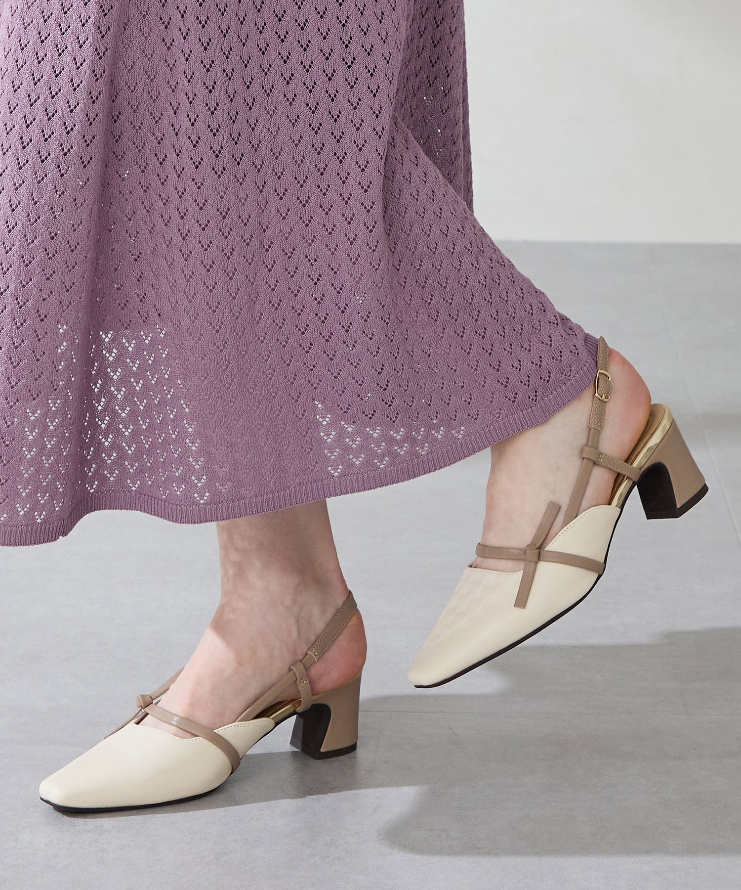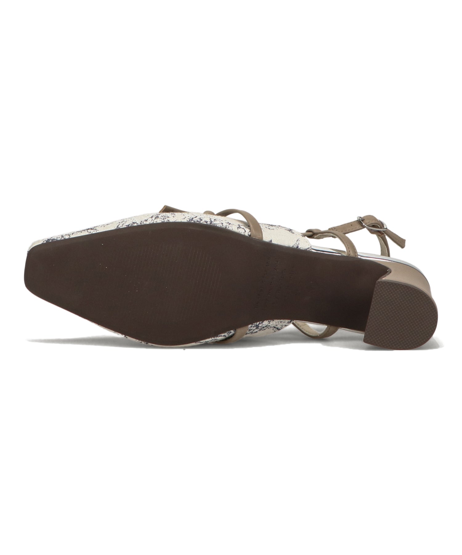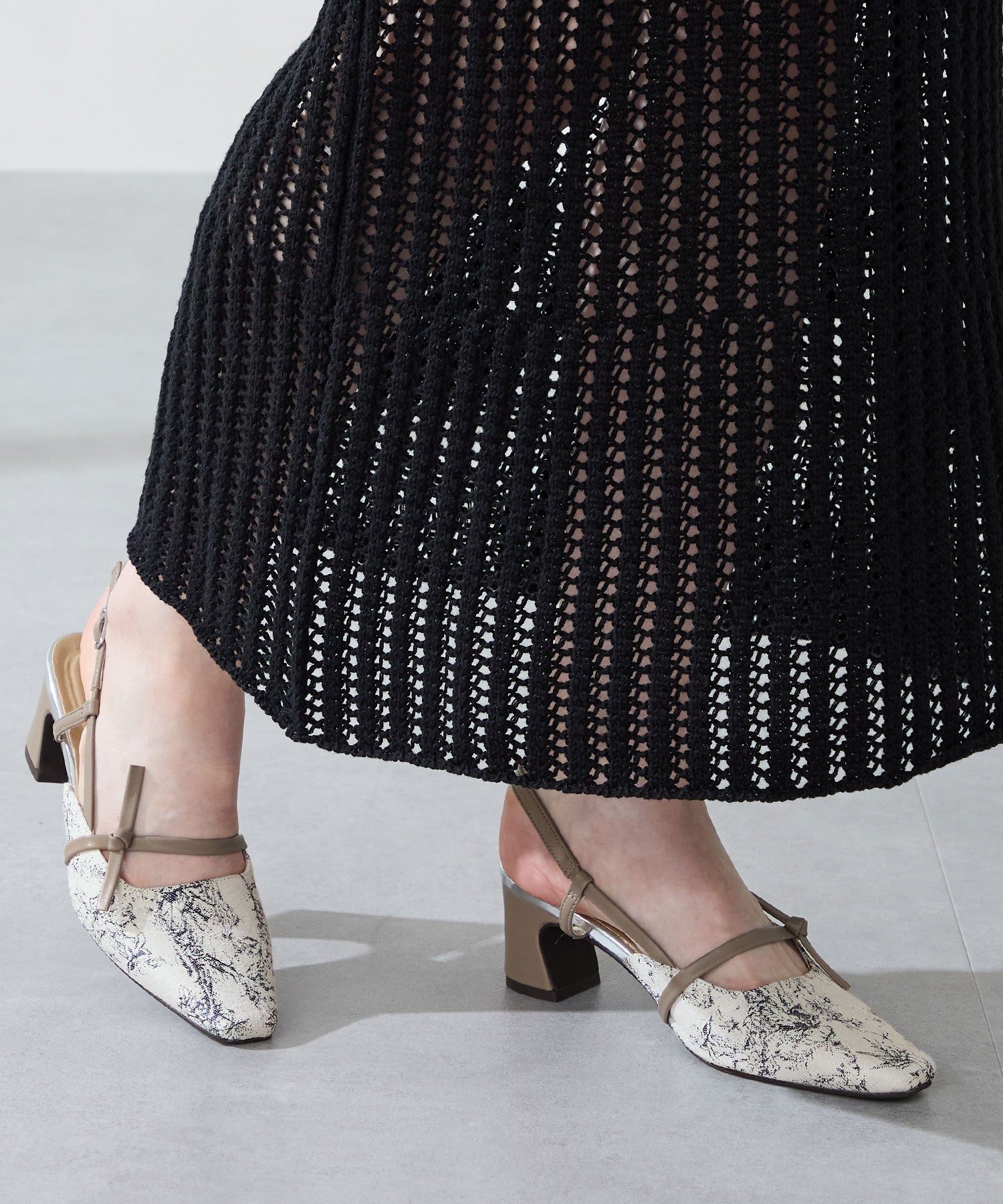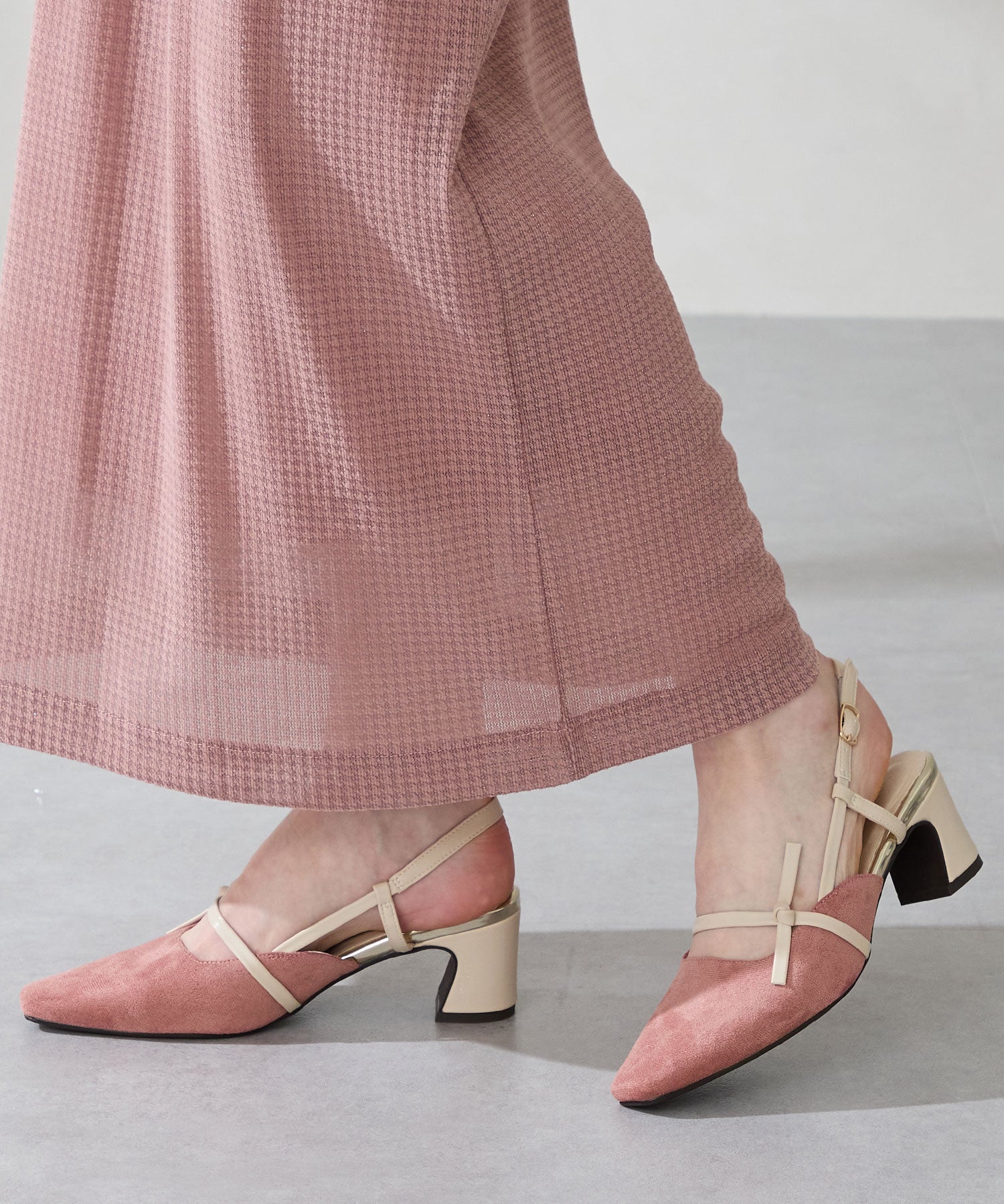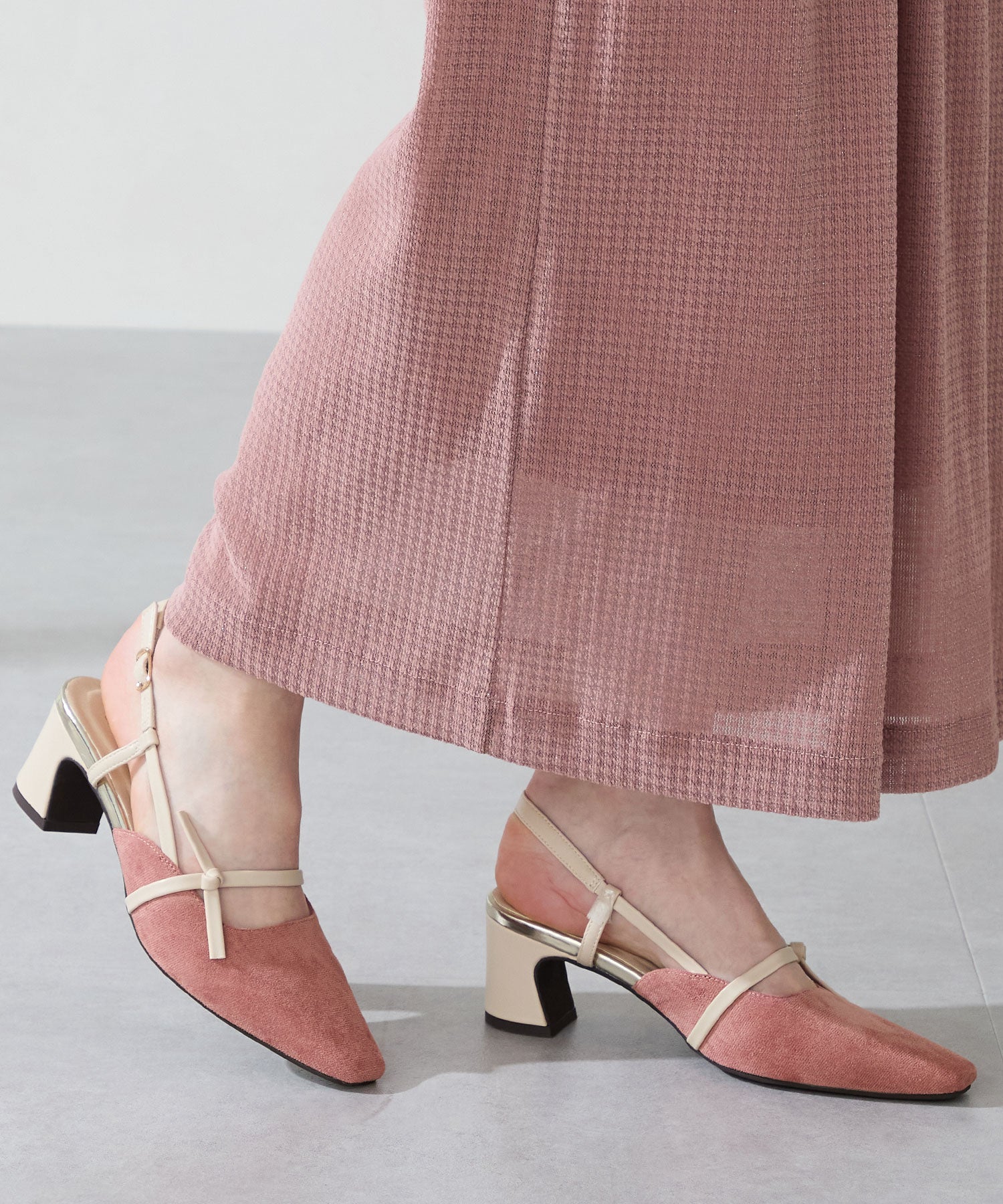 さりげなくサイドにあしらったリボンが女性心くすぐるパンプスは、素足でさらっと履けるので早めの時期から使えるアイテム。踵ストラップには隠しゴムが付いているのでラクに脱ぎ履きができるのが嬉しい。ブルーのトワルドジュイ柄は上品に仕上がるおすすめカラー。カラーによって柄や素材が異なったバリエーションで、様々なスタイルが楽しめる1足。