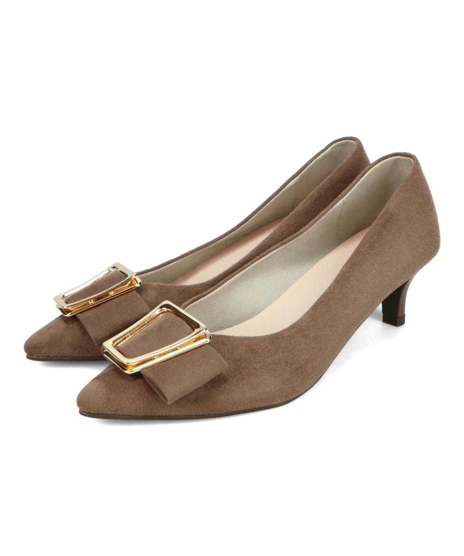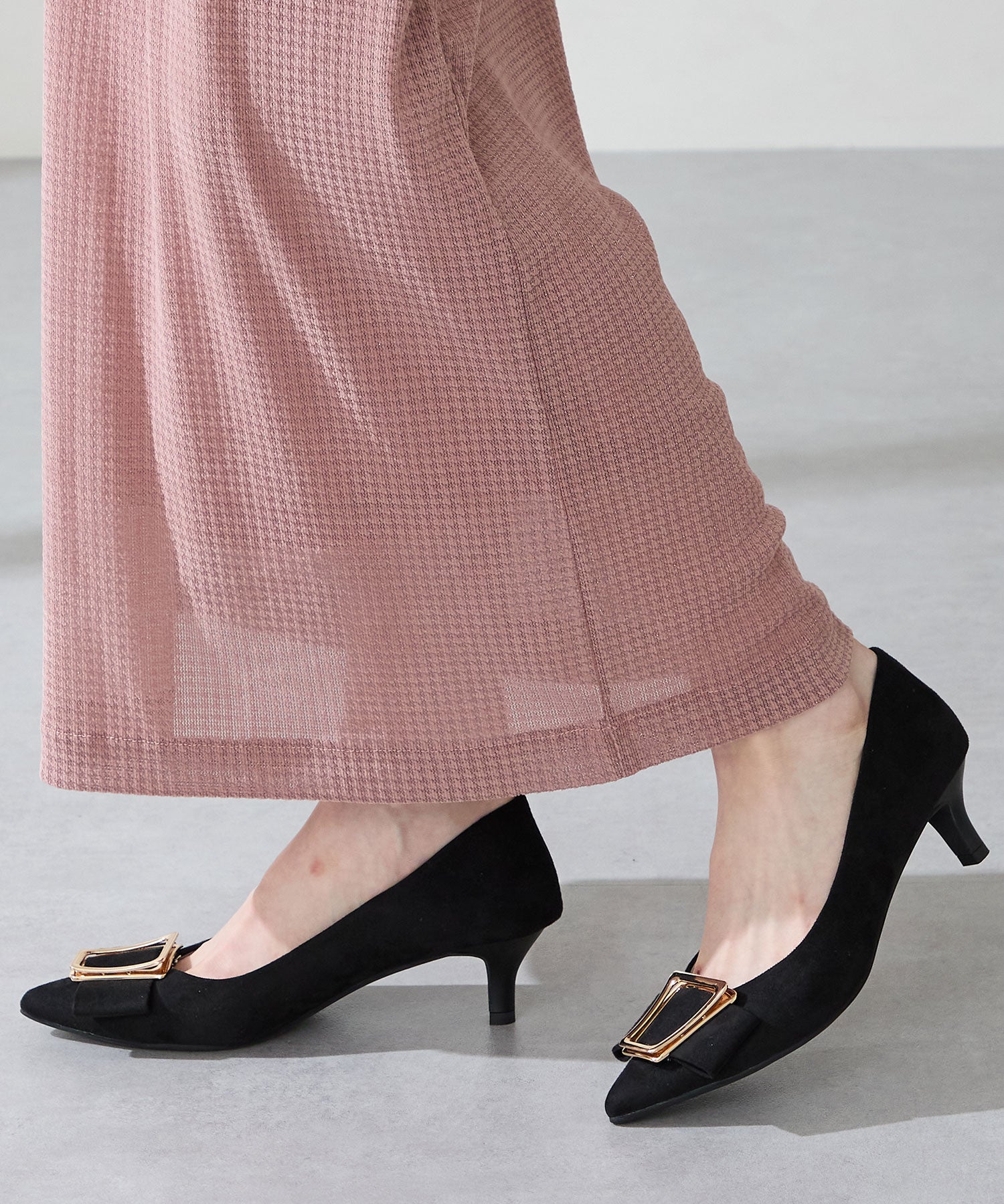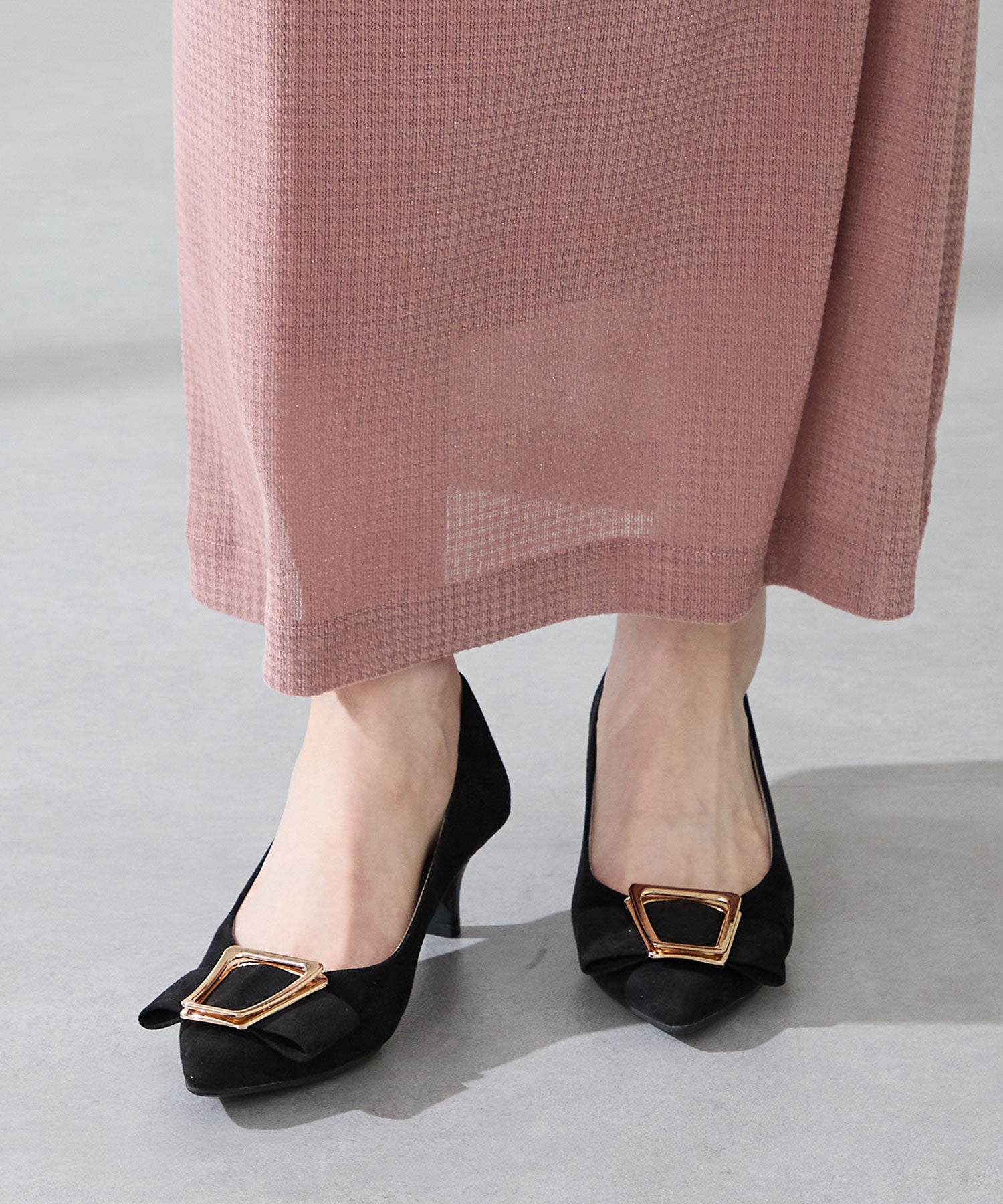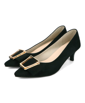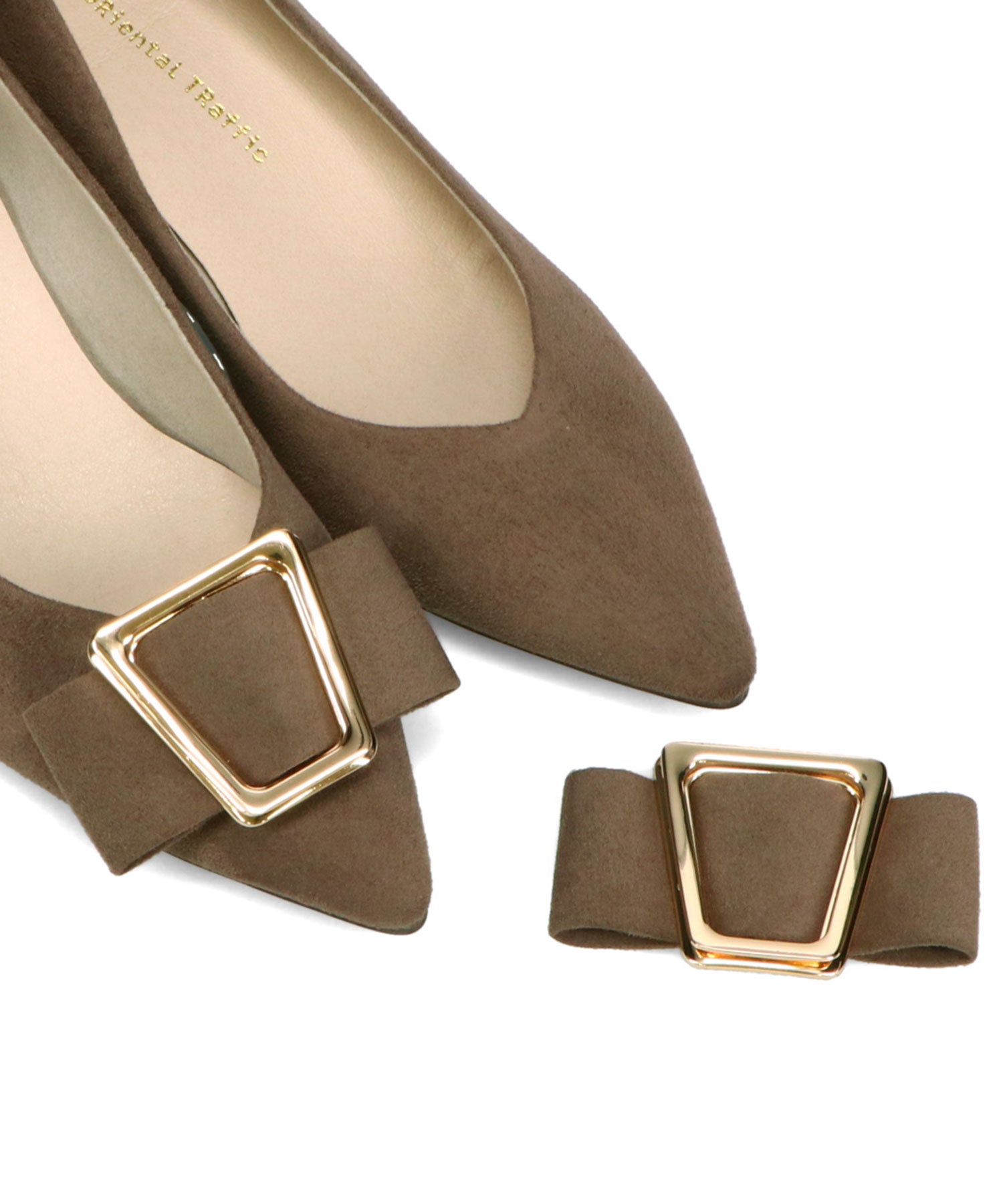 シャープなポインテッドトゥに華奢なヒールが女性らしさを引き立たせてくれるパンプス。クリップ式で付け外しが可能な大ぶりのモチーフは、リボン×ゴールドの組み合わせで上品な印象に。つま先や中敷にクッションを入れることでヒールでも歩きやすさを考えられた作り。足に馴染むスエード素材と、シーンによって使い分けできるデザインで幅広く使える1足。