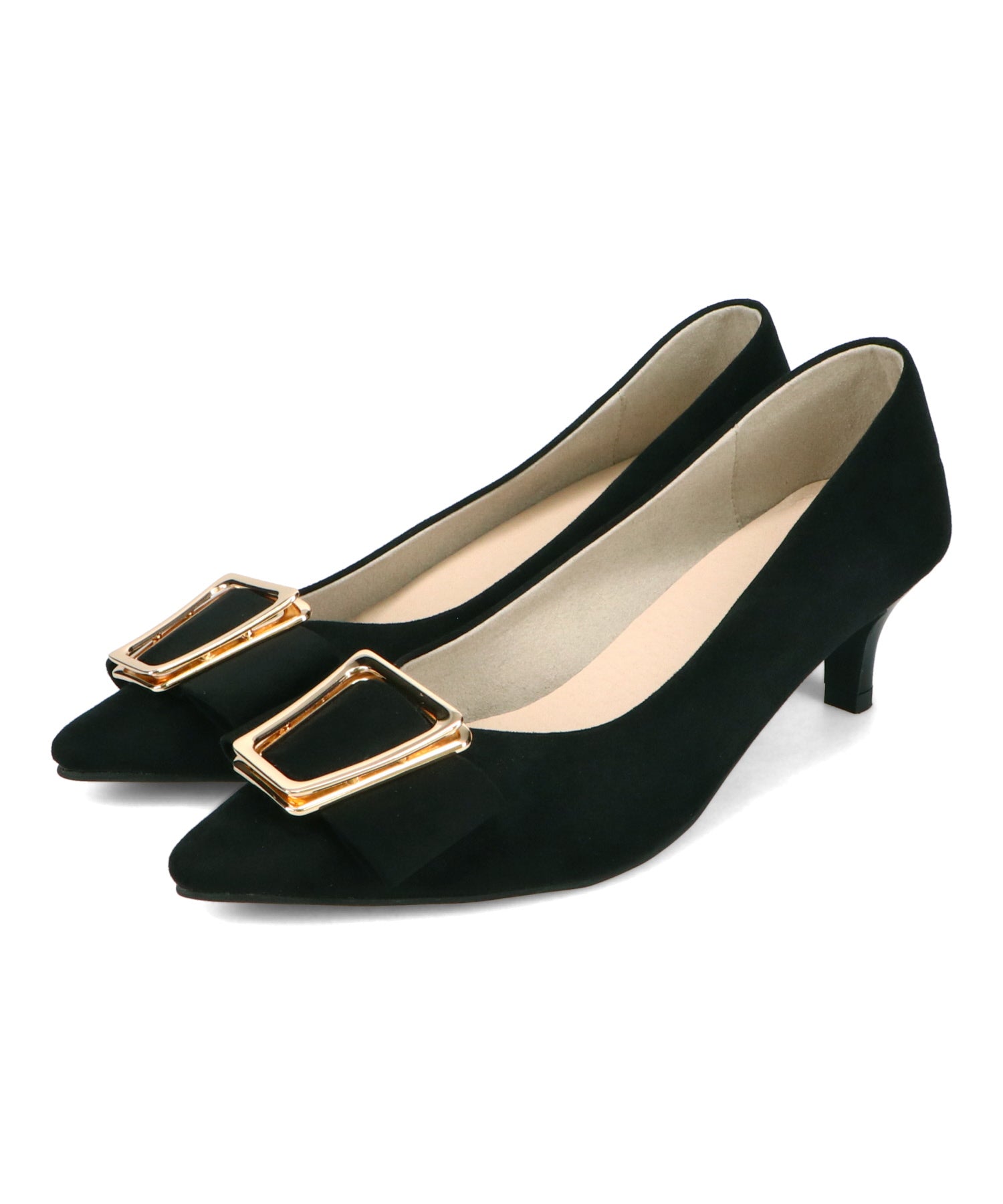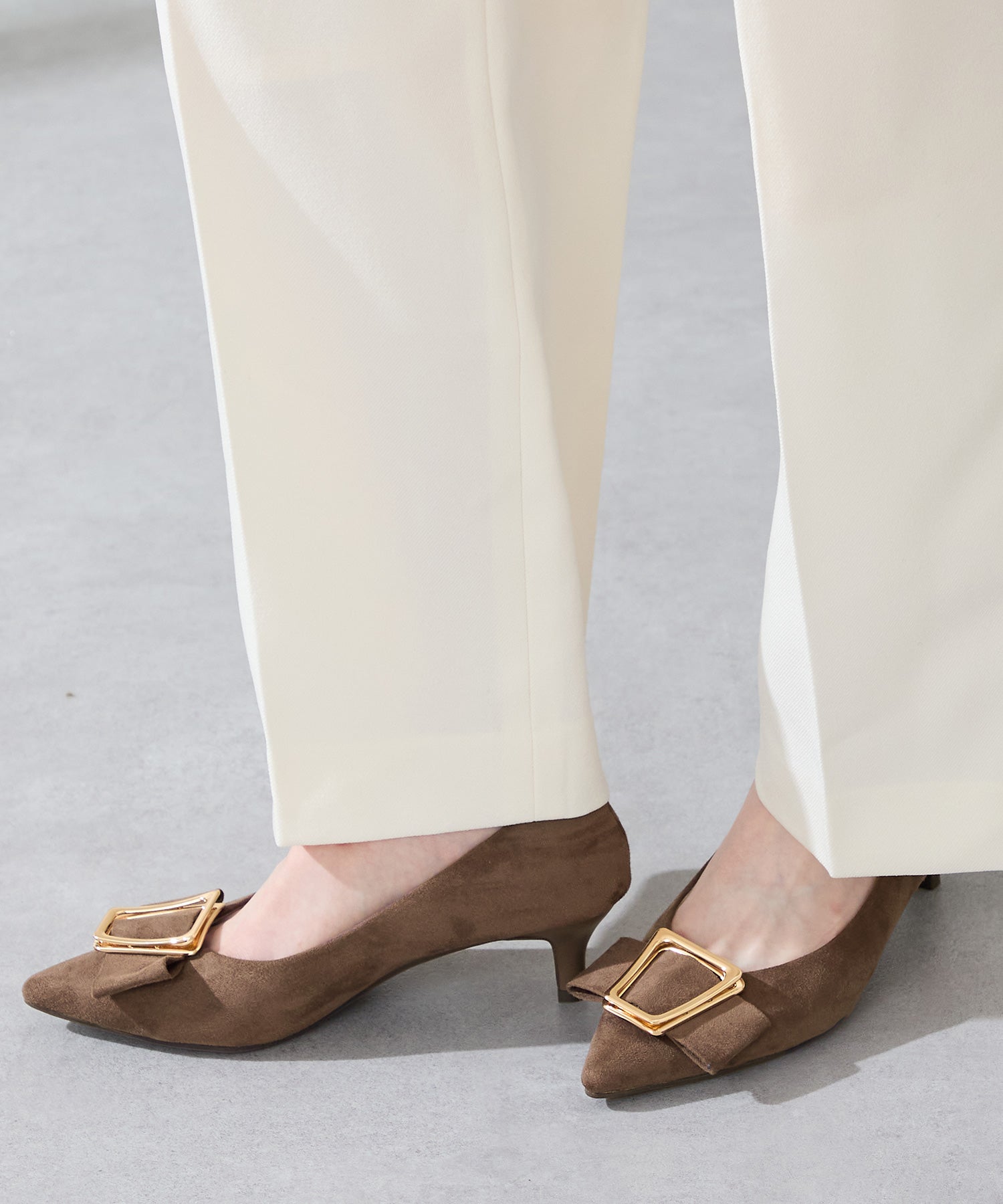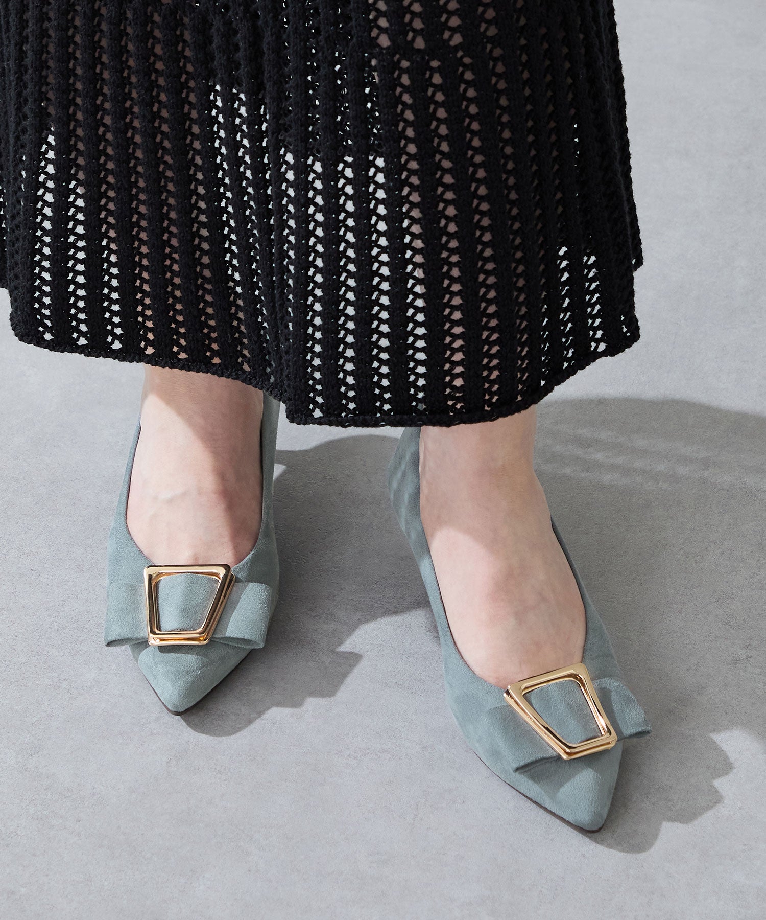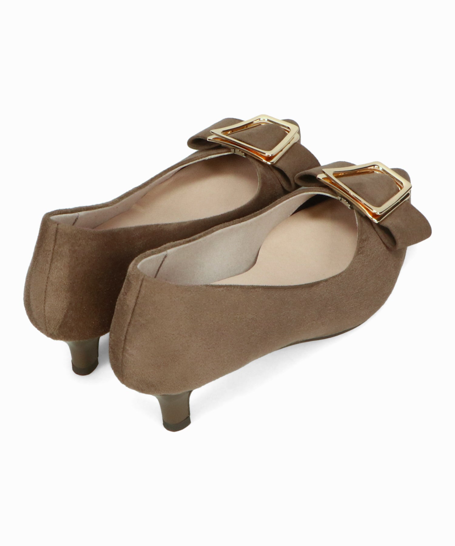シャープなポインテッドトゥに華奢なヒールが女性らしさを引き立たせてくれるパンプス。クリップ式で付け外しが可能な大ぶりのモチーフは、リボン×ゴールドの組み合わせで上品な印象に。つま先や中敷にクッションを入れることでヒールでも歩きやすさを考えられた作り。足に馴染むスエード素材と、シーンによって使い分けできるデザインで幅広く使える1足。