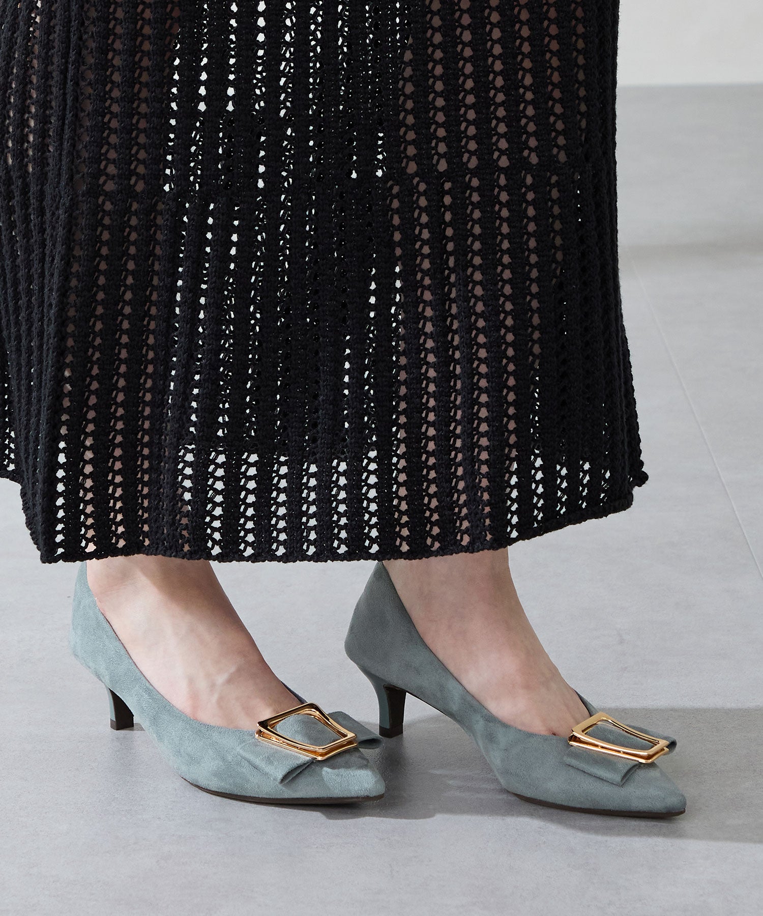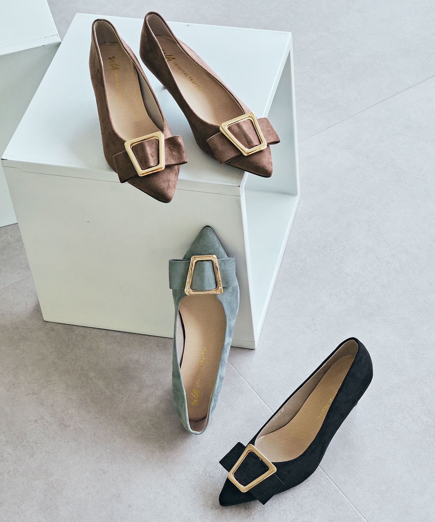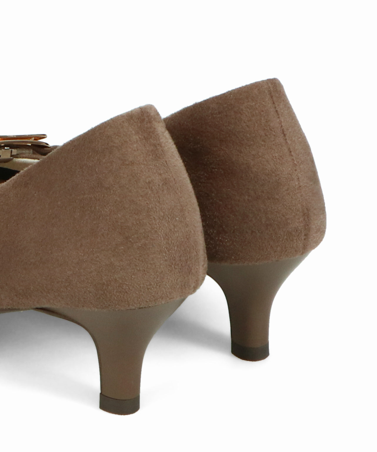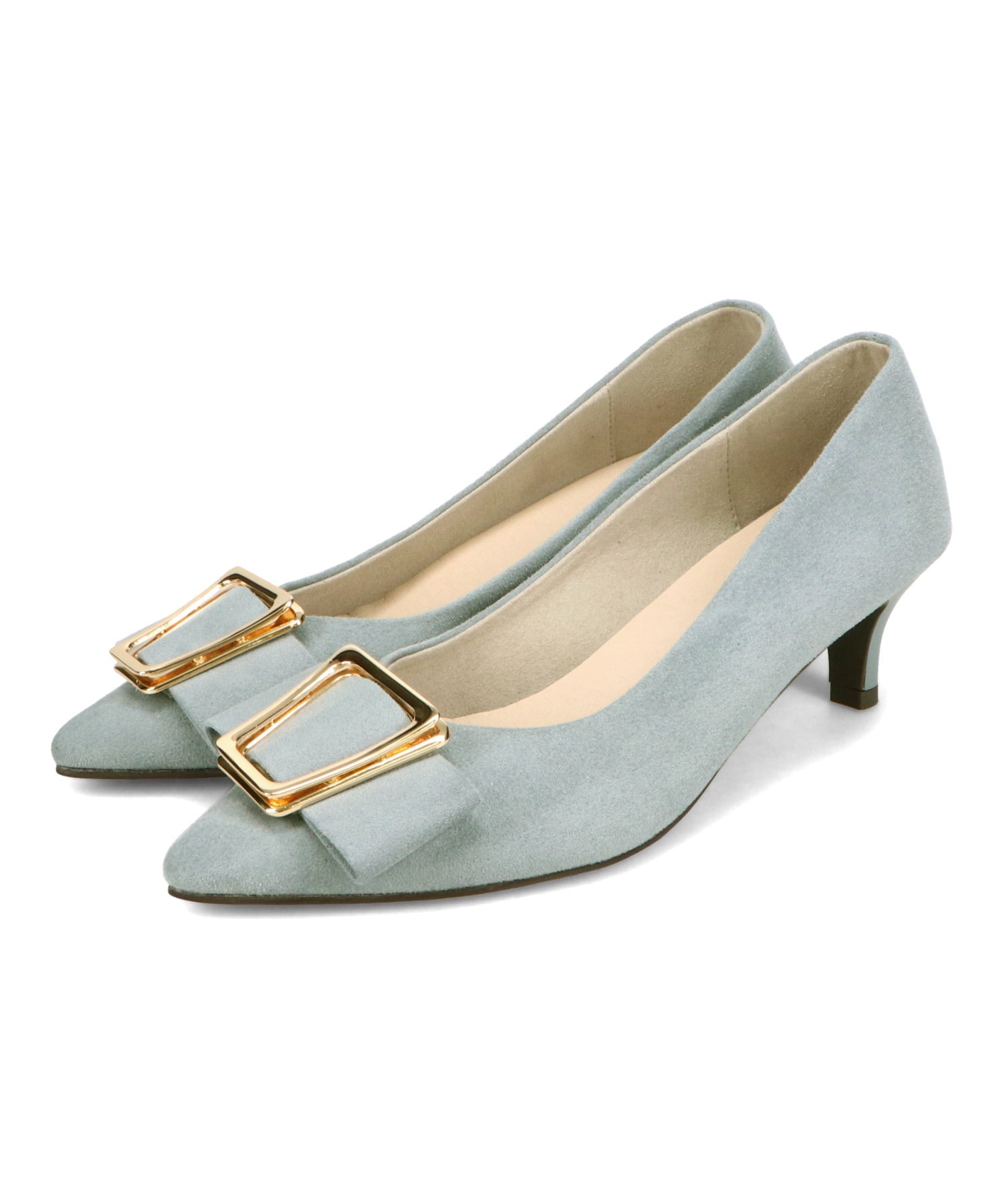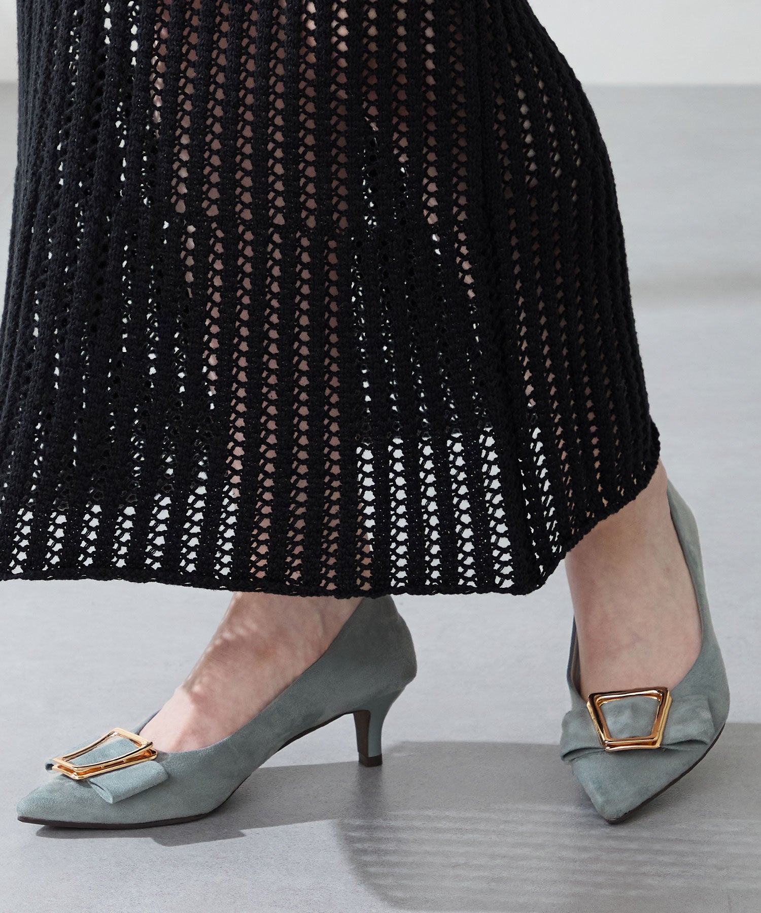 シャープなポインテッドトゥに華奢なヒールが女性らしさを引き立たせてくれるパンプス。クリップ式で付け外しが可能な大ぶりのモチーフは、リボン×ゴールドの組み合わせで上品な印象に。つま先や中敷にクッションを入れることでヒールでも歩きやすさを考えられた作り。足に馴染むスエード素材と、シーンによって使い分けできるデザインで幅広く使える1足。