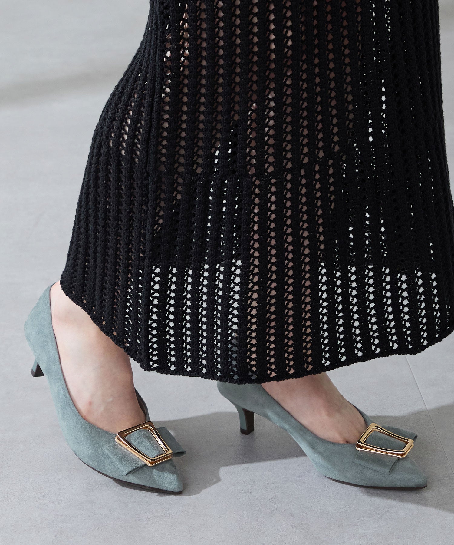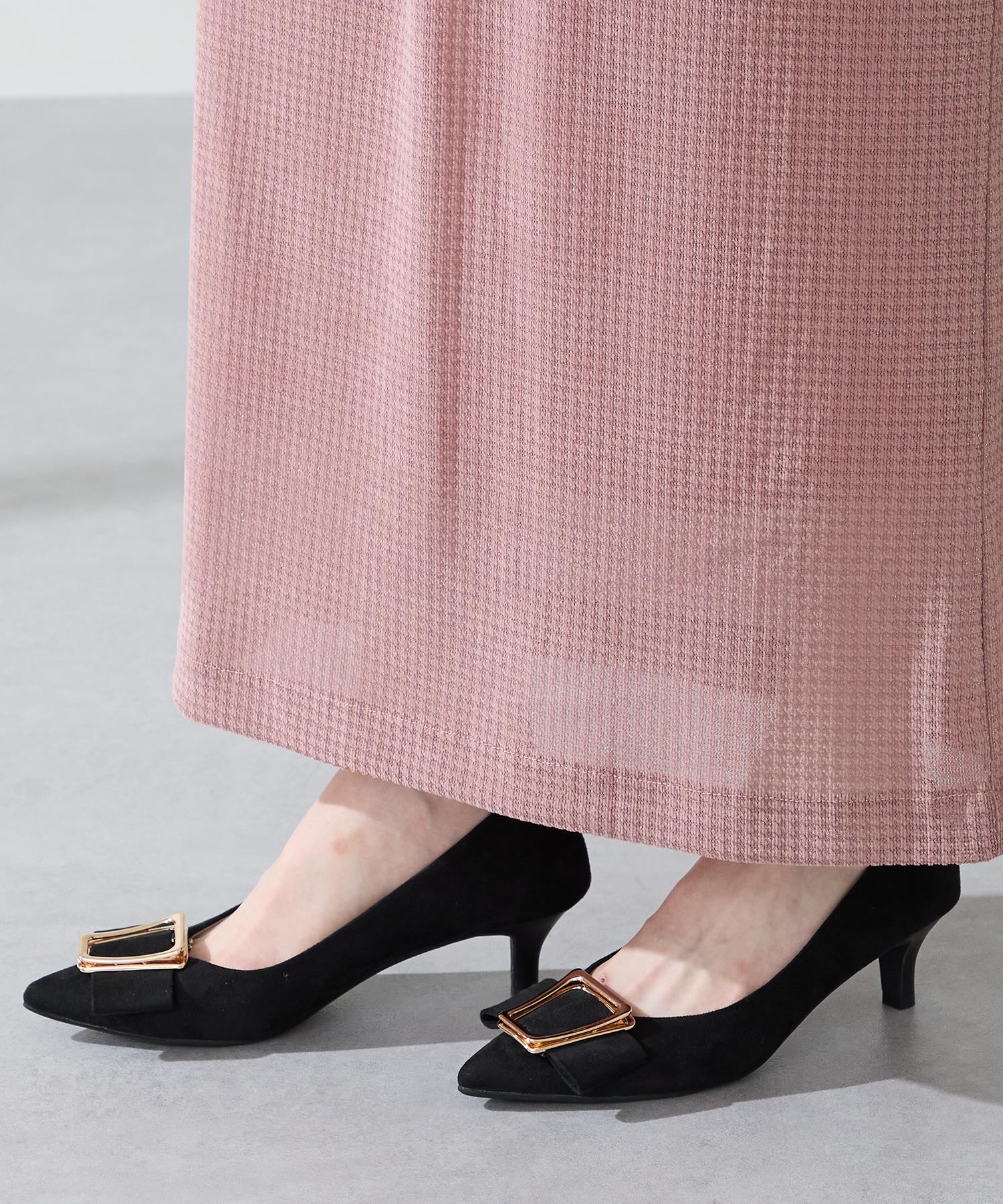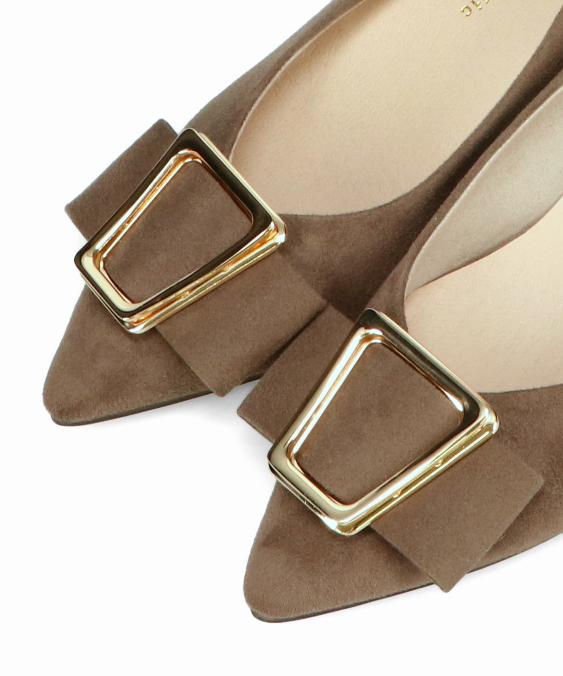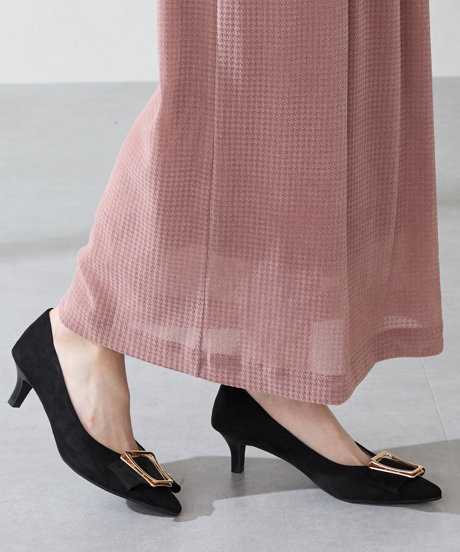 シャープなポインテッドトゥに華奢なヒールが女性らしさを引き立たせてくれるパンプス。クリップ式で付け外しが可能な大ぶりのモチーフは、リボン×ゴールドの組み合わせで上品な印象に。つま先や中敷にクッションを入れることでヒールでも歩きやすさを考えられた作り。足に馴染むスエード素材と、シーンによって使い分けできるデザインで幅広く使える1足。