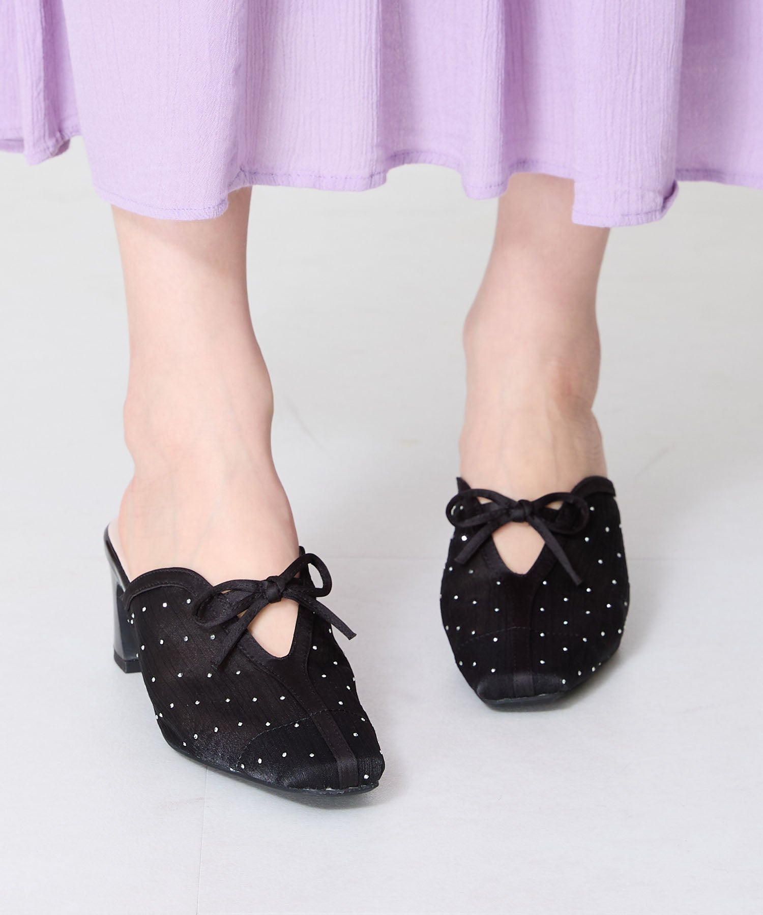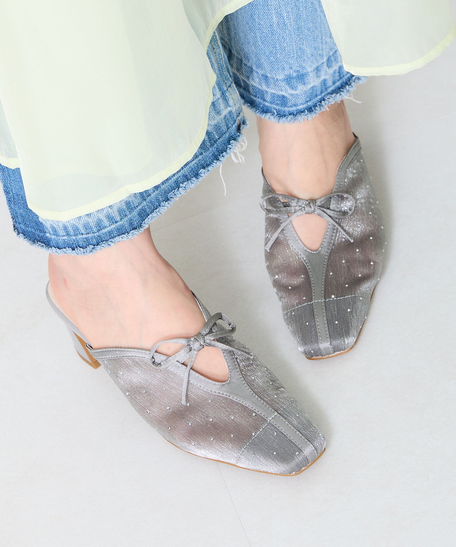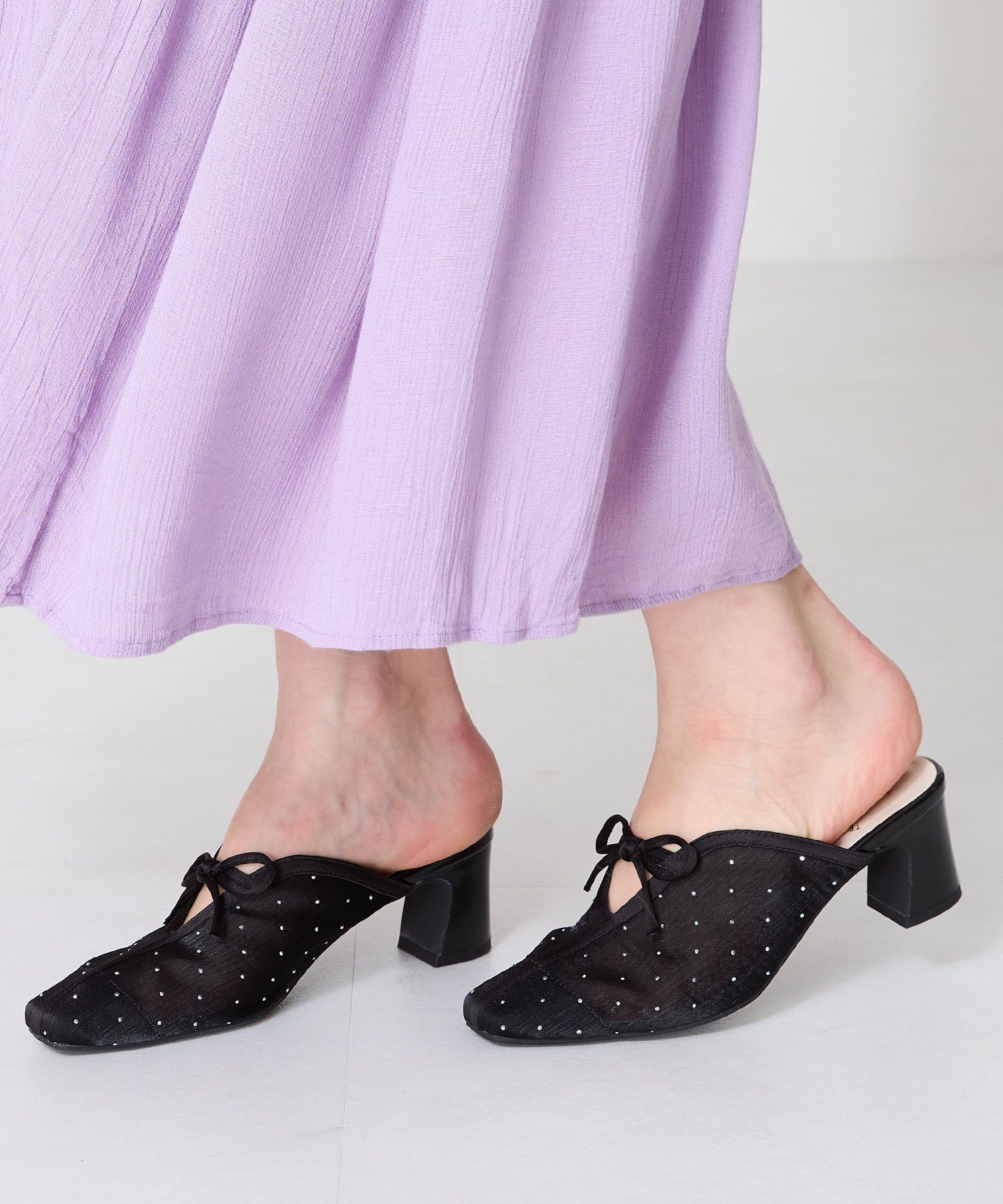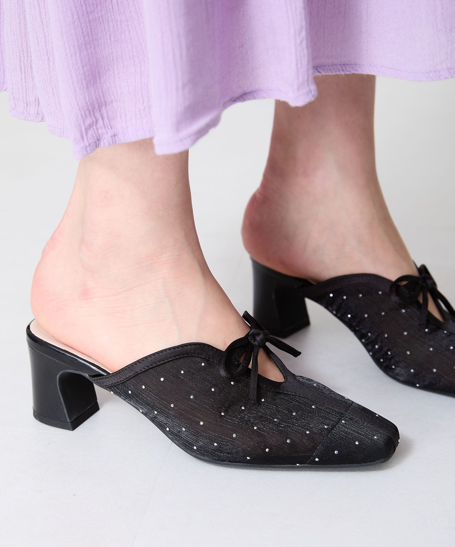 ラインストーンをあしらったチュール素材にリボンデザインを掛け合わせたキュートな要素満載のミュールパンプス。スリットの様な甲のカットデザインと透け感のあるチュールが程よい肌見せを叶えて春夏気分を盛り上げてくれる。足をしっかり包み込む深めのアッパーデザインにしつつ、太めのヒールでフィット感と安定感も叶える優秀アイテム。