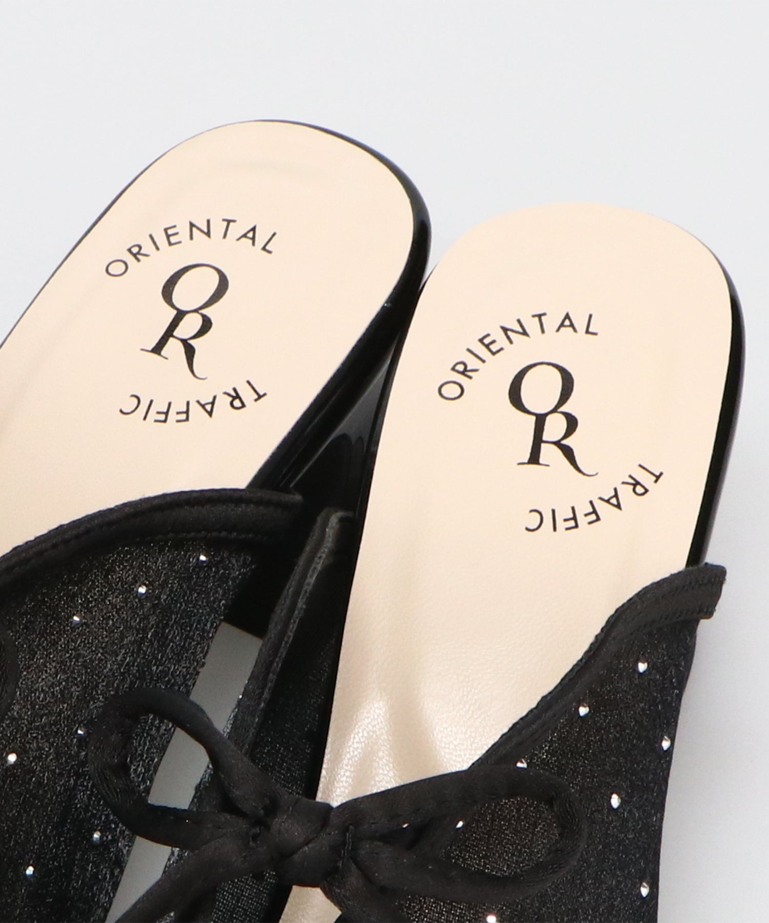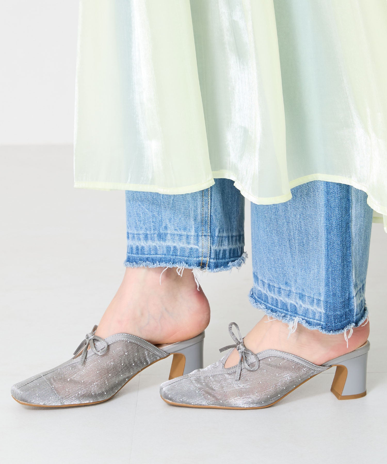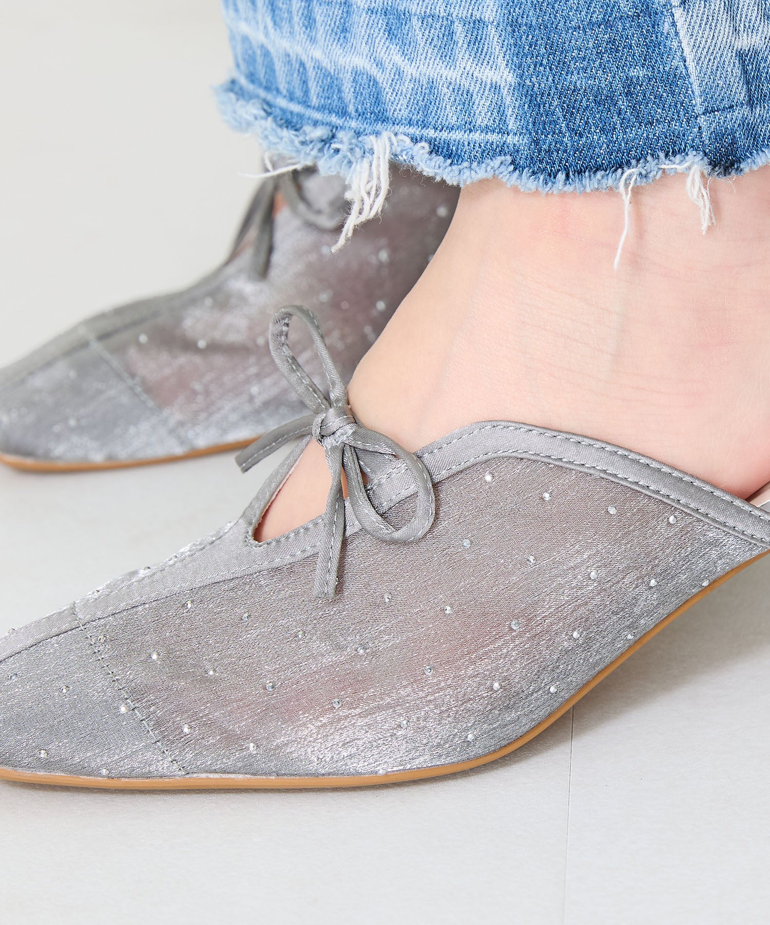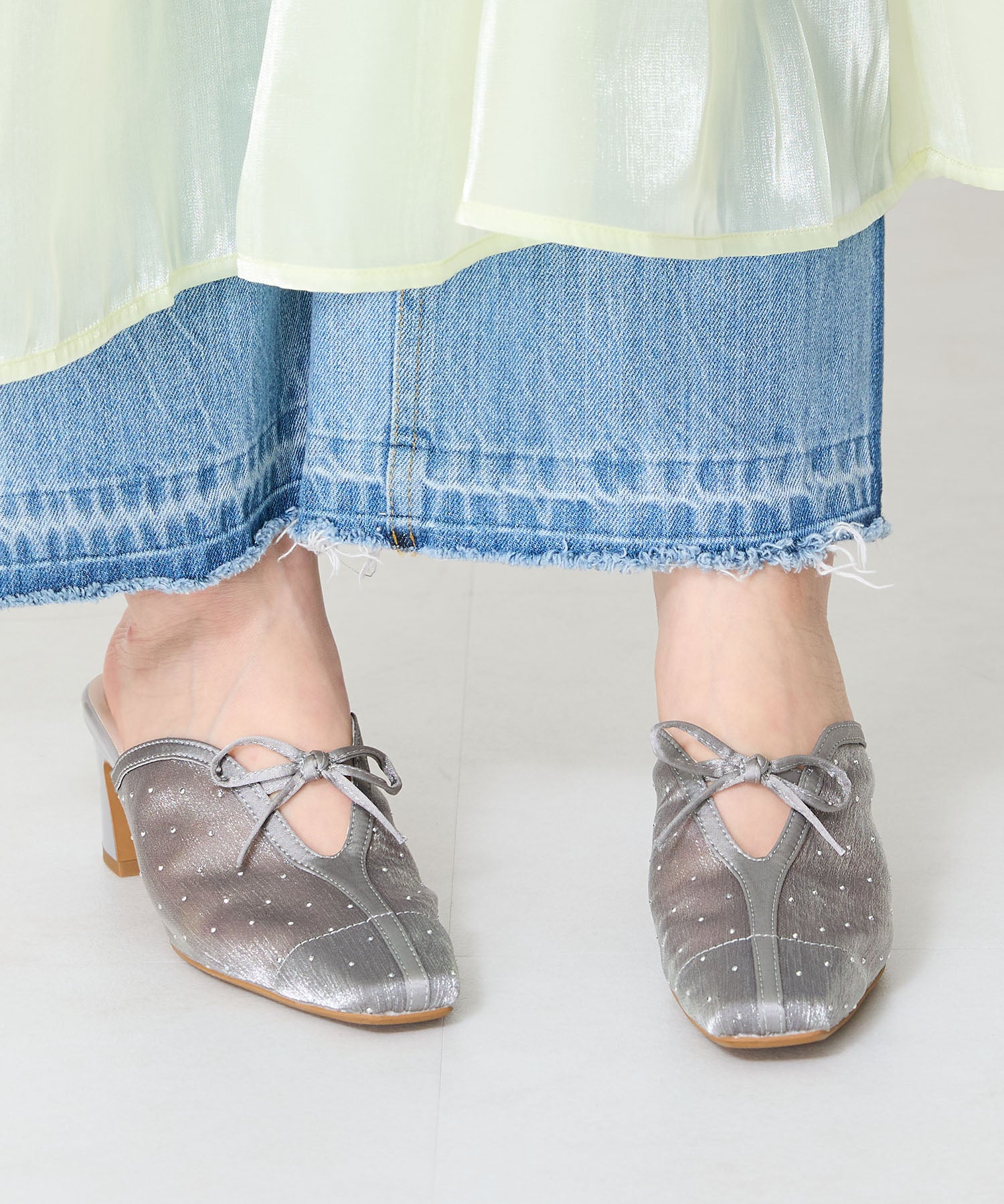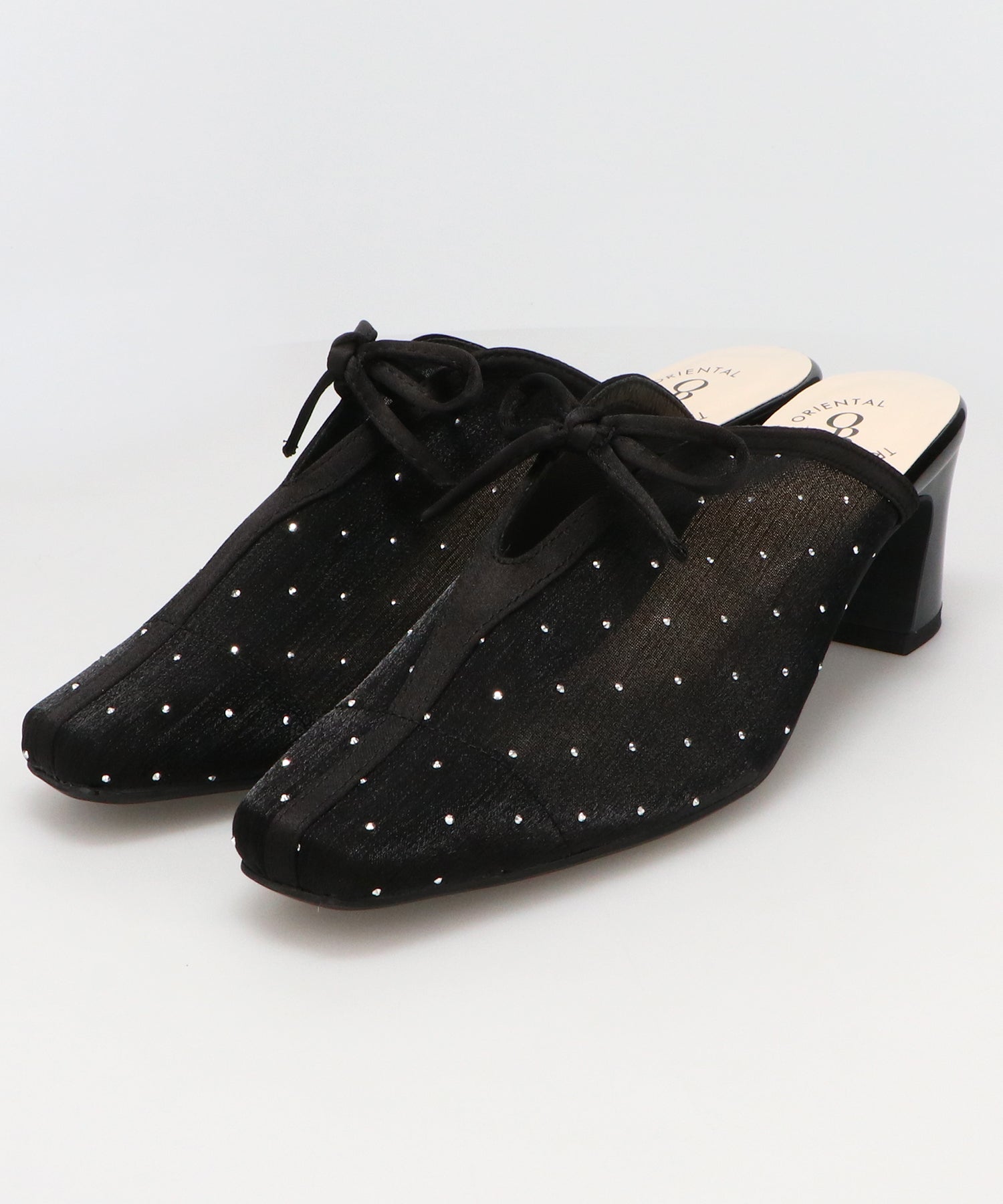 ラインストーンをあしらったチュール素材にリボンデザインを掛け合わせたキュートな要素満載のミュールパンプス。スリットの様な甲のカットデザインと透け感のあるチュールが程よい肌見せを叶えて春夏気分を盛り上げてくれる。足をしっかり包み込む深めのアッパーデザインにしつつ、太めのヒールでフィット感と安定感も叶える優秀アイテム。