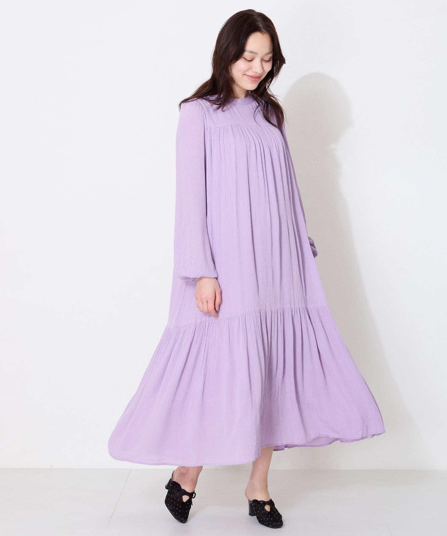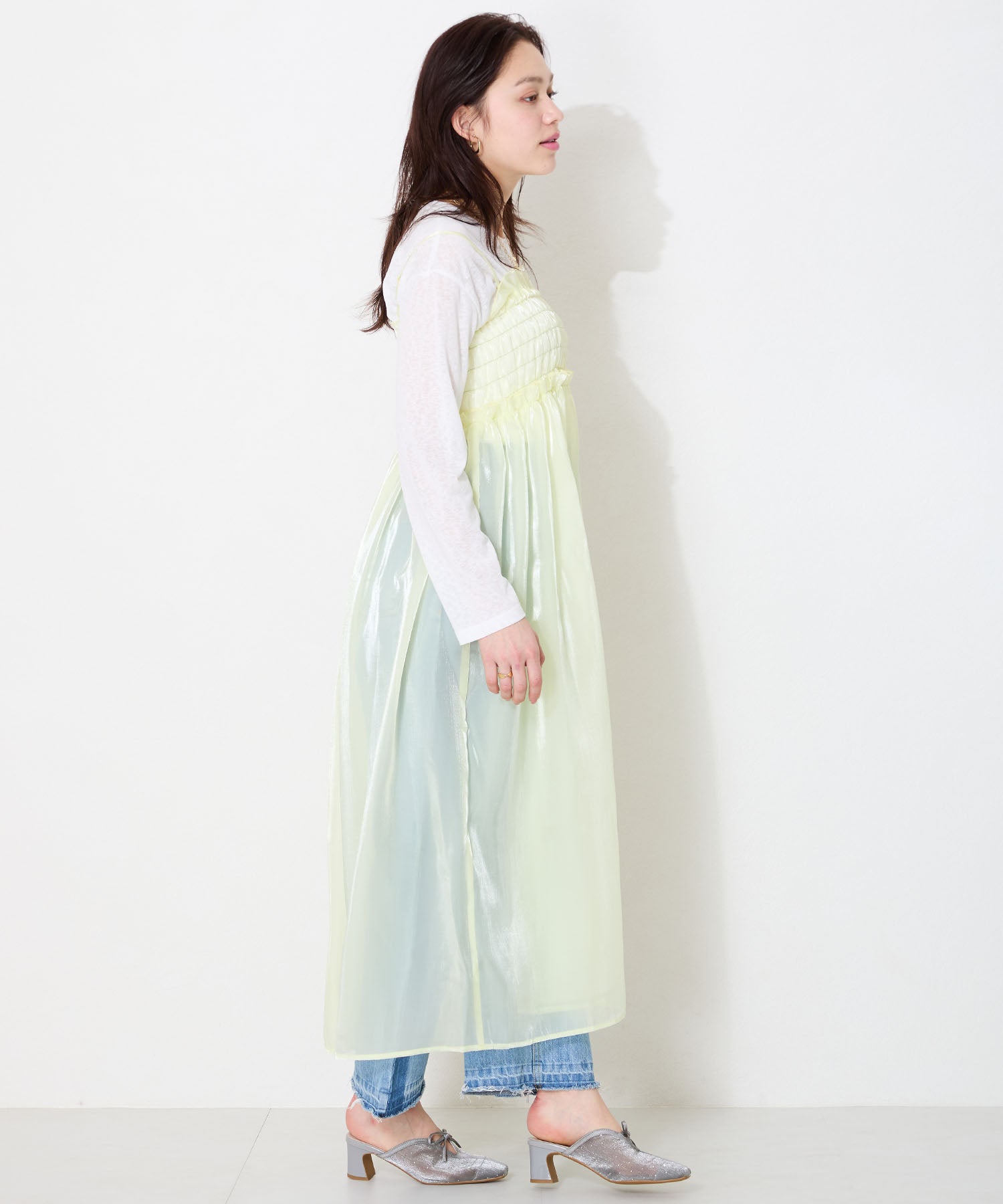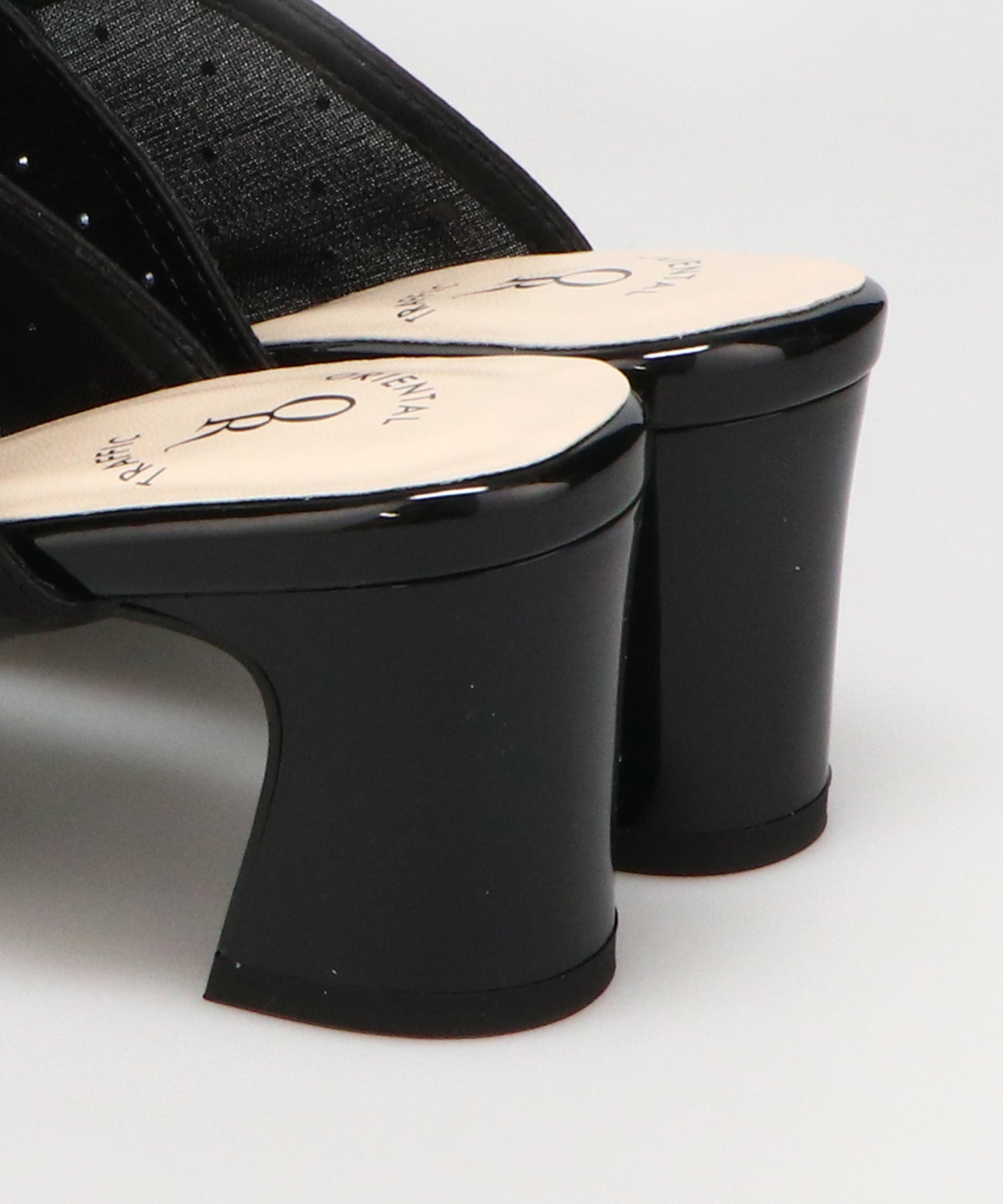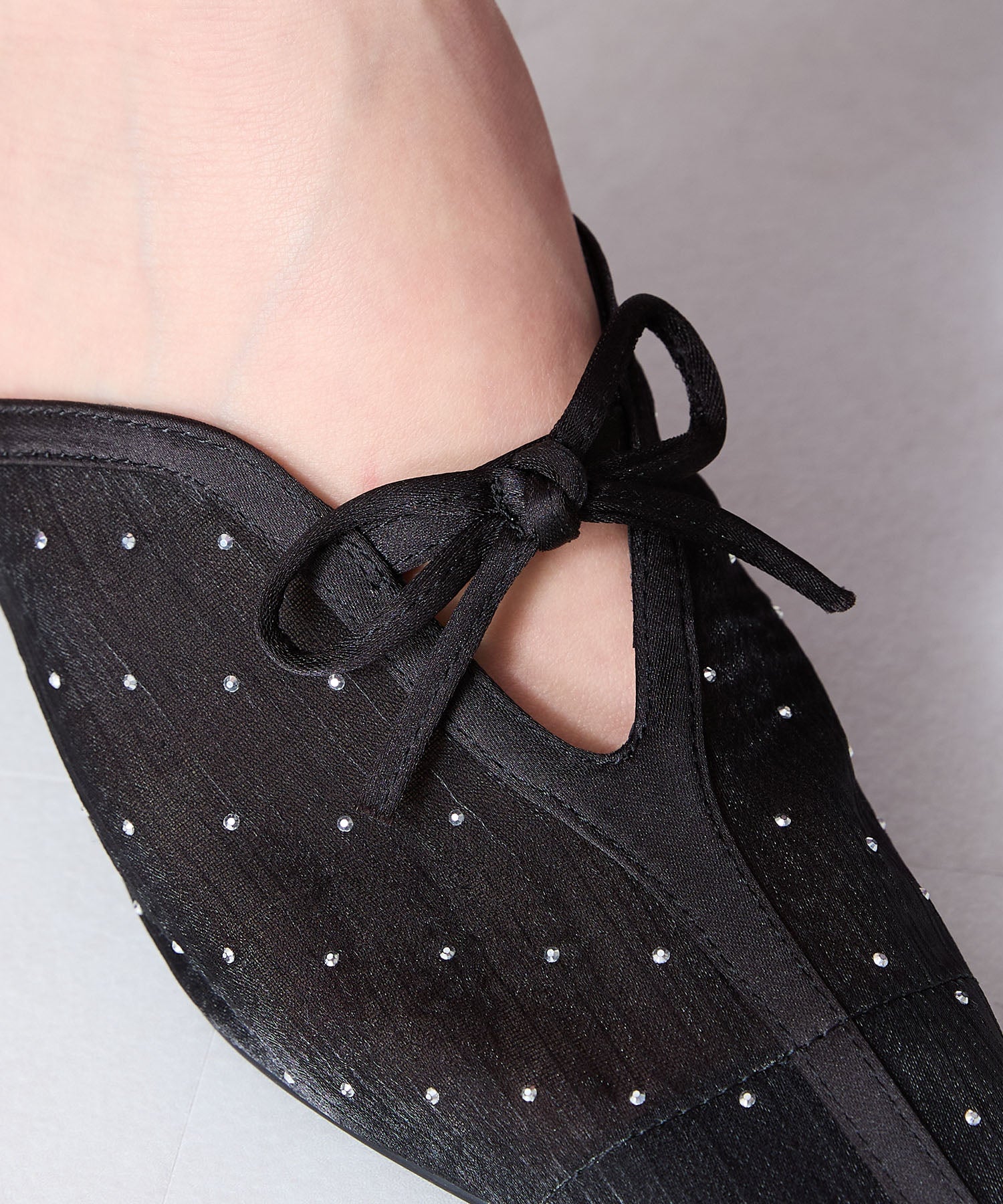 ラインストーンをあしらったチュール素材にリボンデザインを掛け合わせたキュートな要素満載のミュールパンプス。スリットの様な甲のカットデザインと透け感のあるチュールが程よい肌見せを叶えて春夏気分を盛り上げてくれる。足をしっかり包み込む深めのアッパーデザインにしつつ、太めのヒールでフィット感と安定感も叶える優秀アイテム。