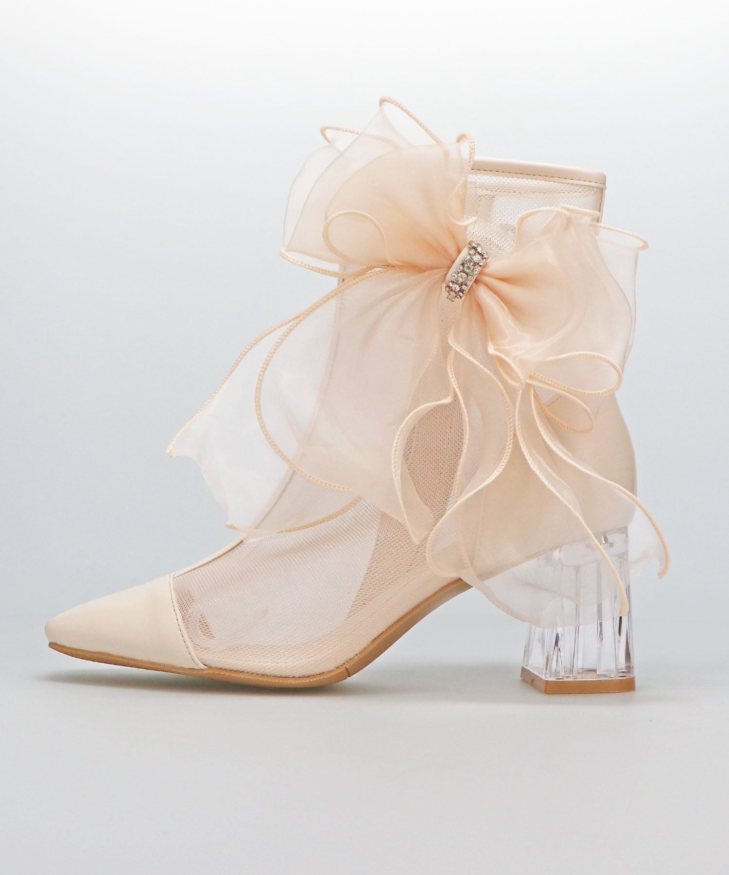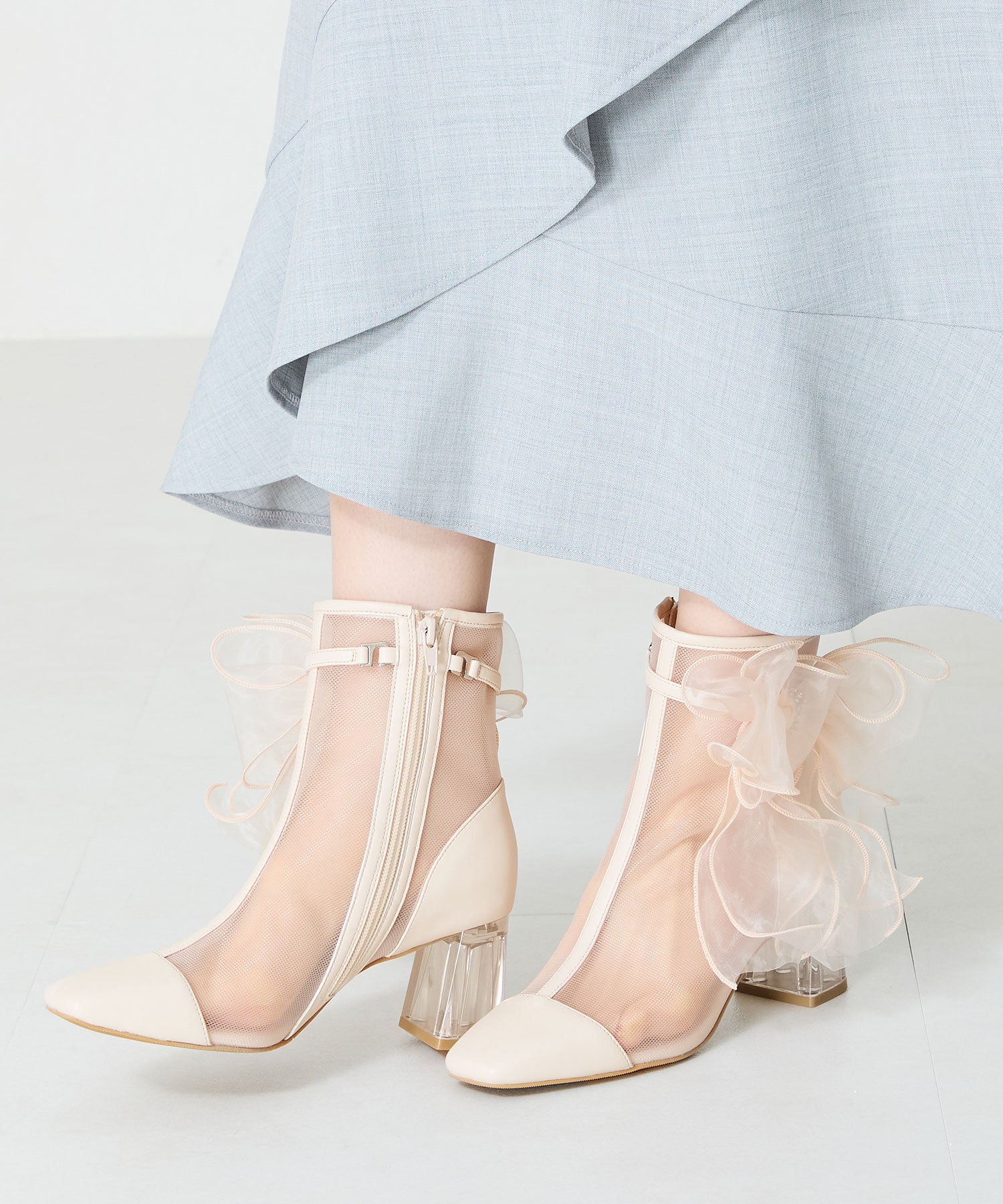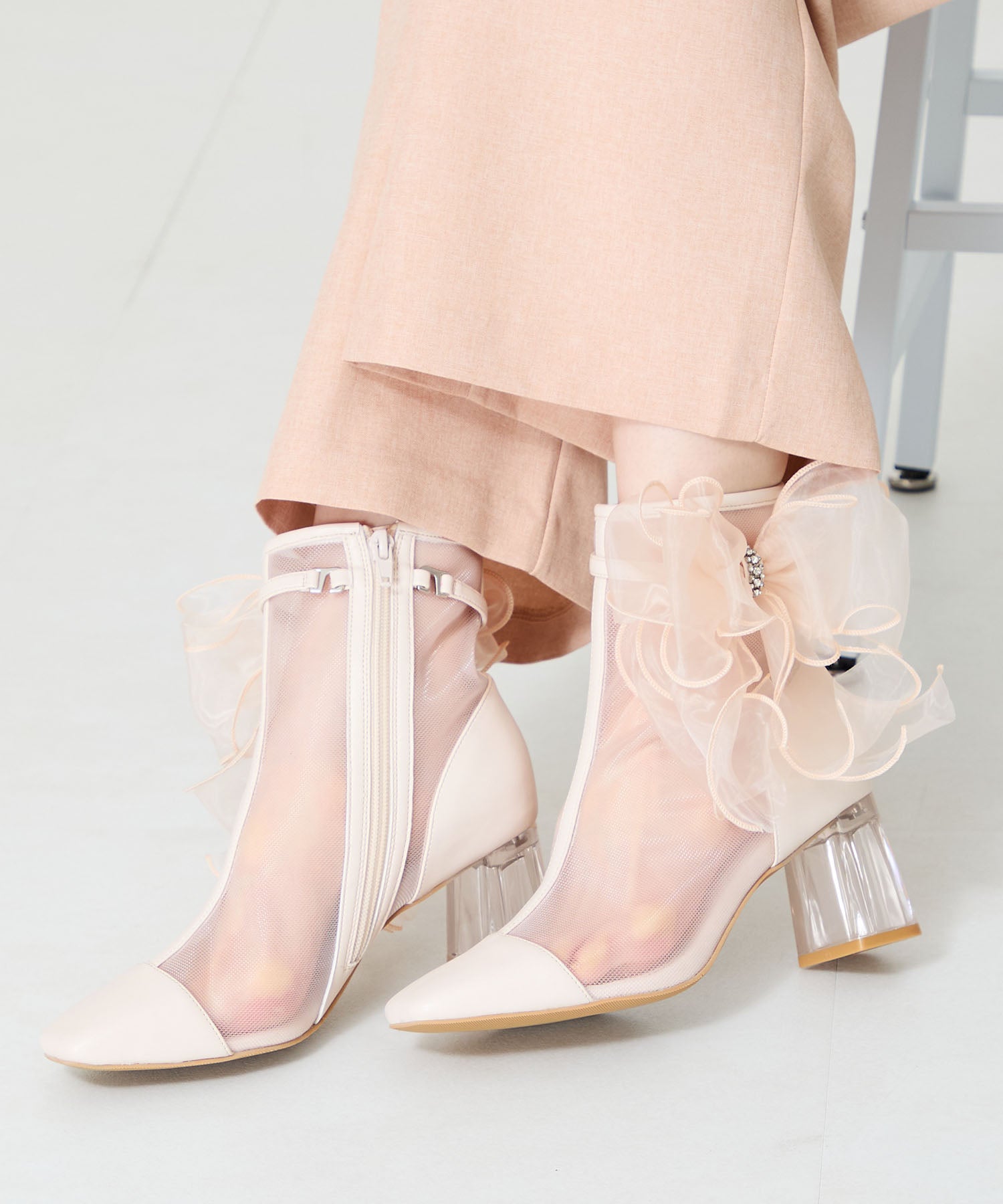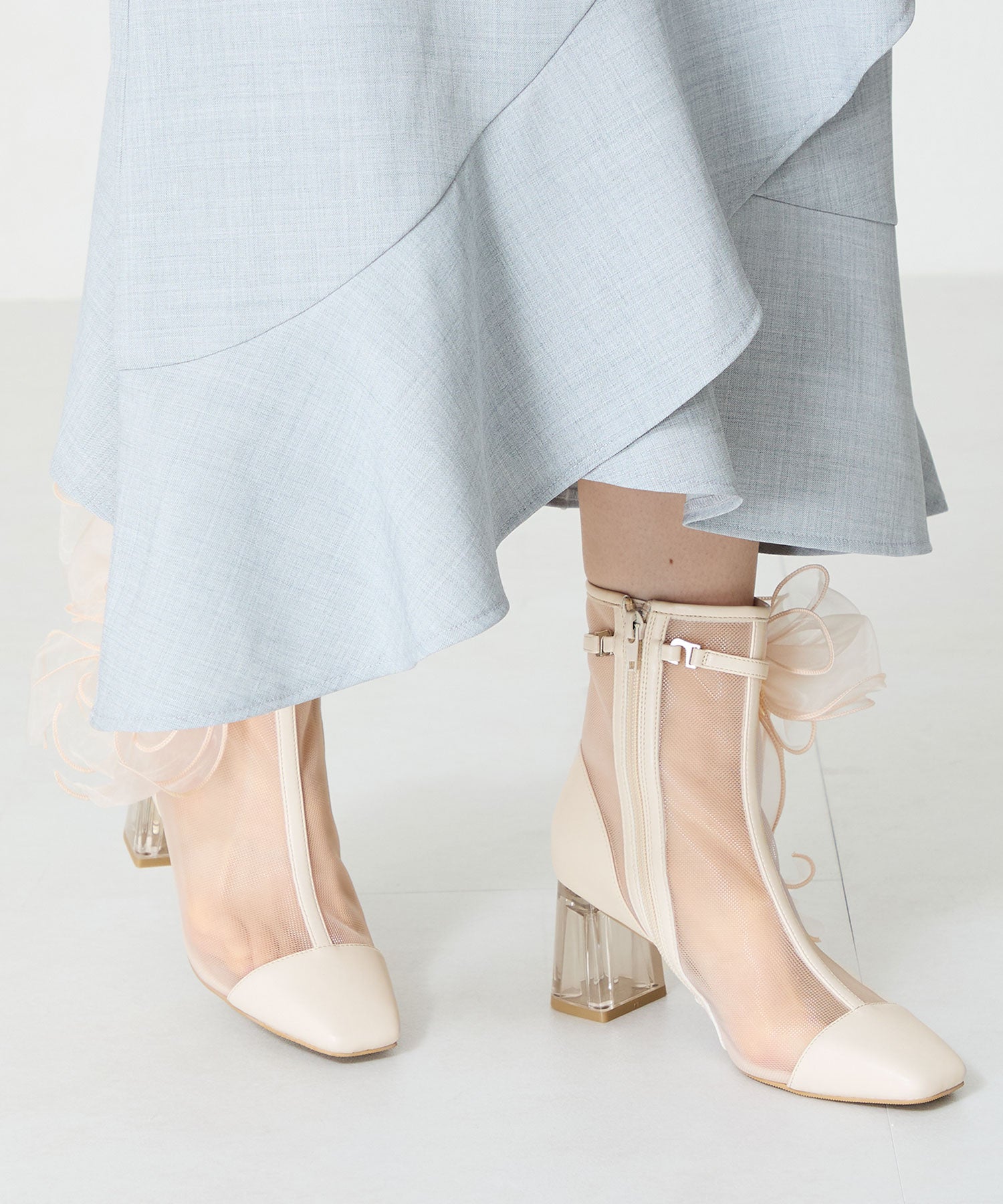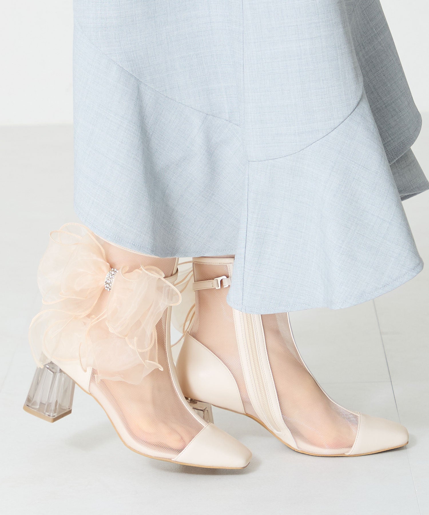 スタイリングの主役になるチュールのショートブーツは、華やかでふわっとしたニュアンスのあるリボンモチーフが旬な足元を演出。リボンベルトは取り外しが可能で、取るとシンプルなブーツとして幅広く活躍する優秀アイテム。ほんのりとベージュカラーを纏ったクリアヒールは大人なムードが漂う雰囲気で履くと気分が高まる特別な1足。