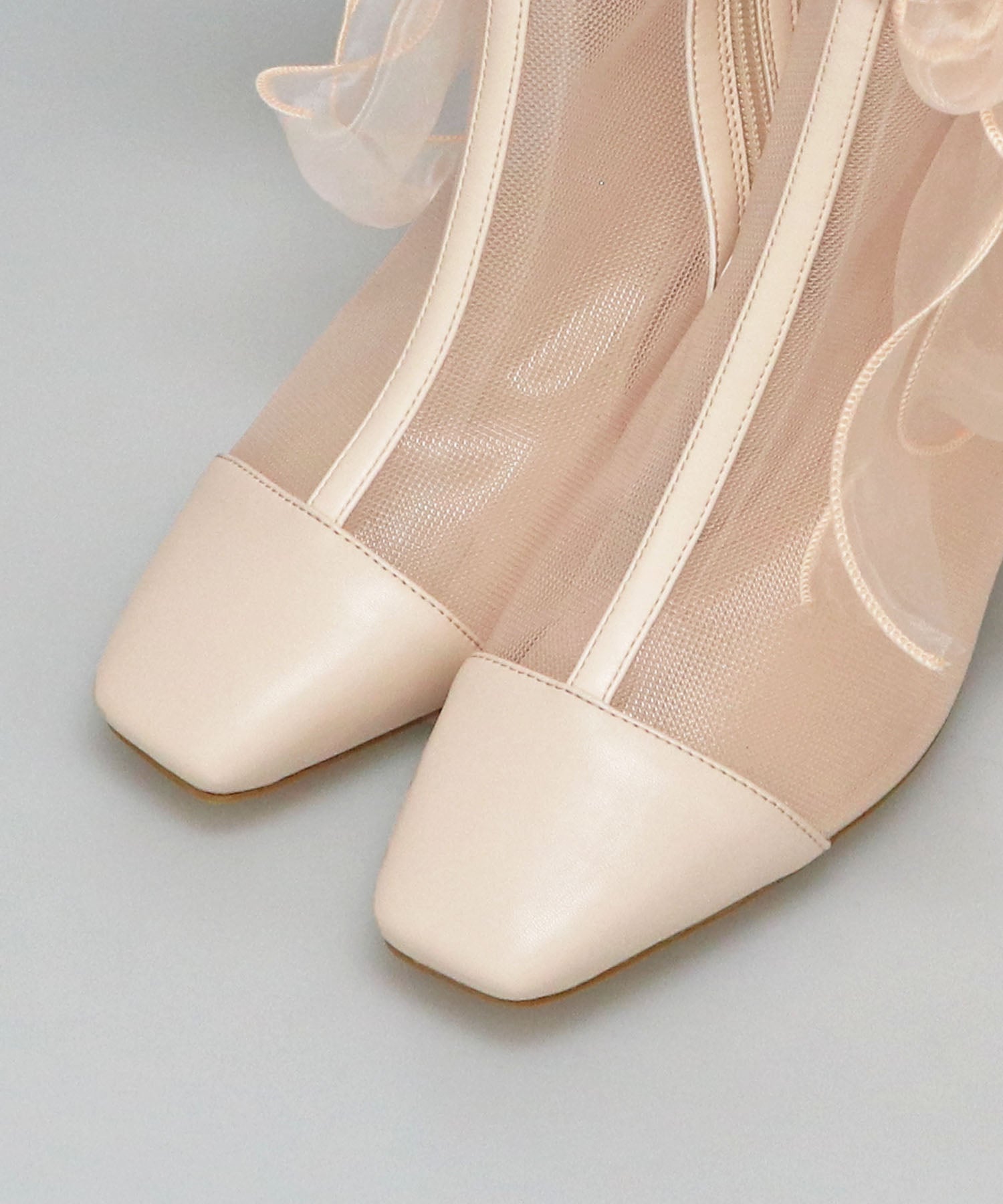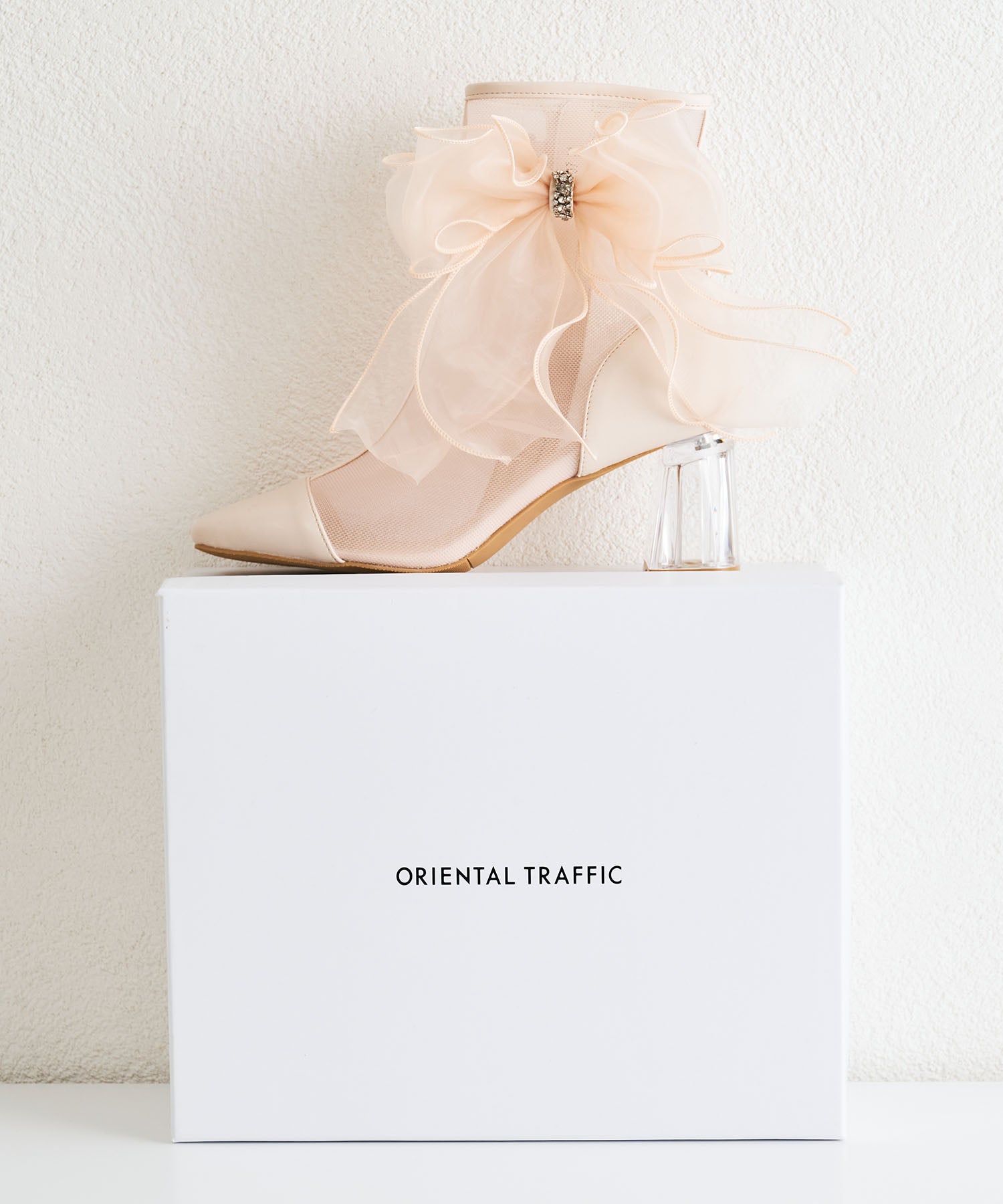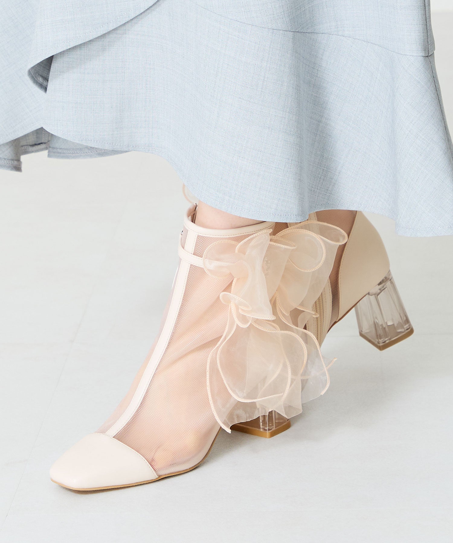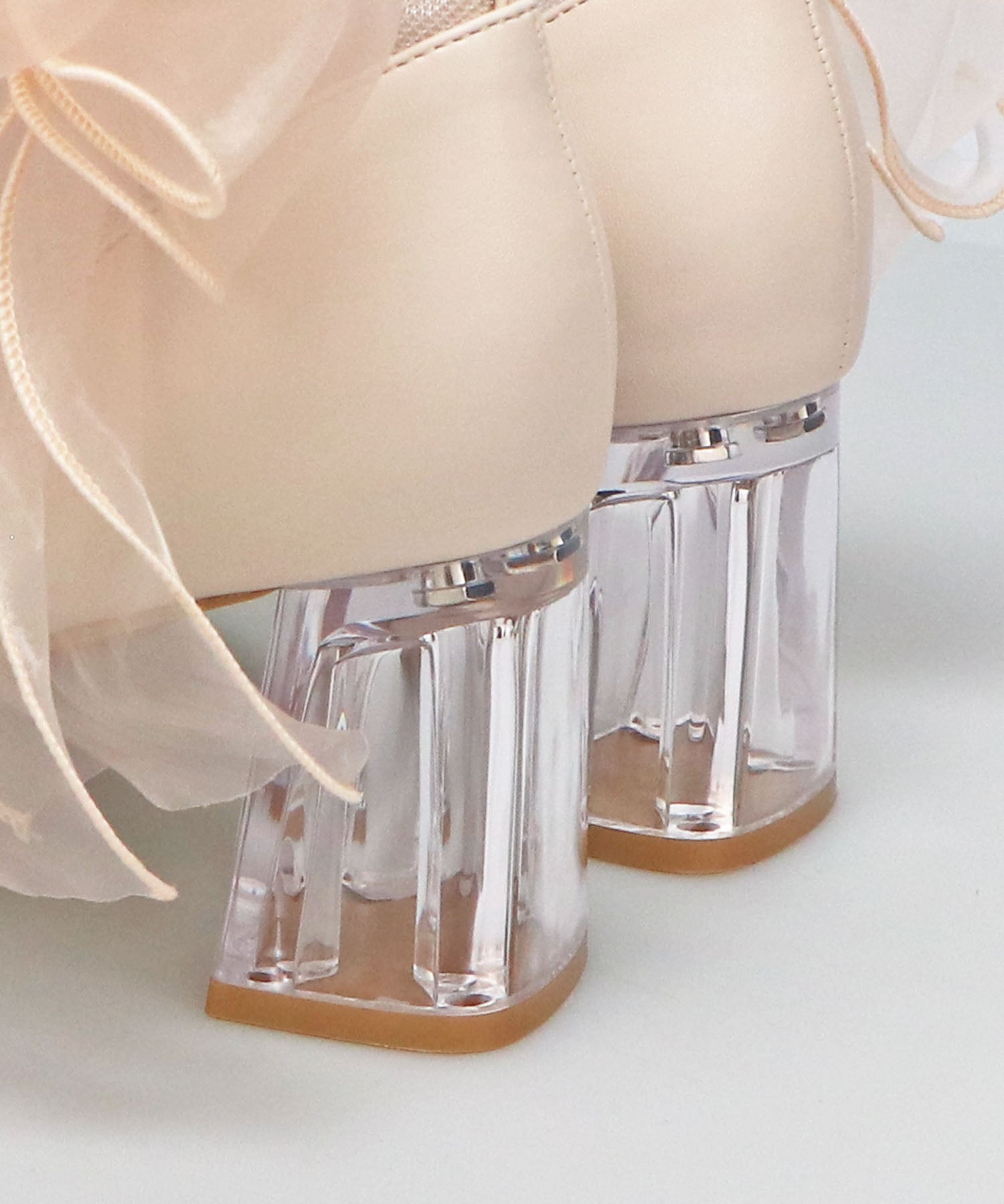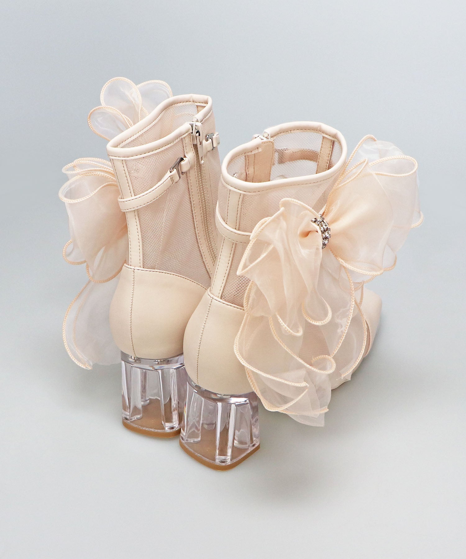 スタイリングの主役になるチュールのショートブーツは、華やかでふわっとしたニュアンスのあるリボンモチーフが旬な足元を演出。リボンベルトは取り外しが可能で、取るとシンプルなブーツとして幅広く活躍する優秀アイテム。ほんのりとベージュカラーを纏ったクリアヒールは大人なムードが漂う雰囲気で履くと気分が高まる特別な1足。