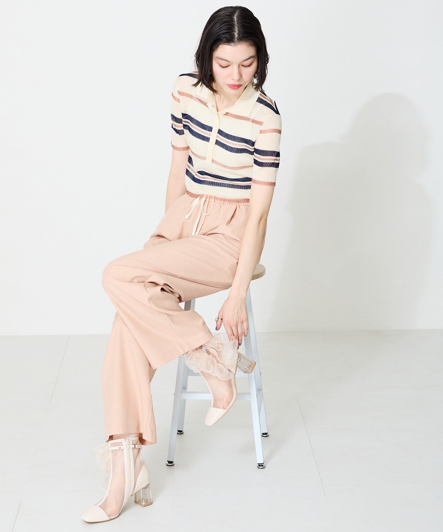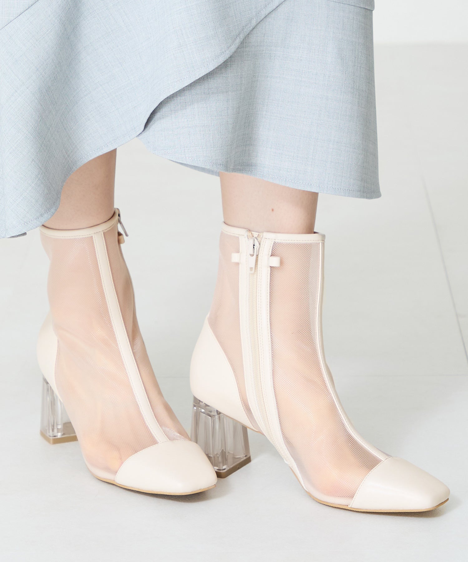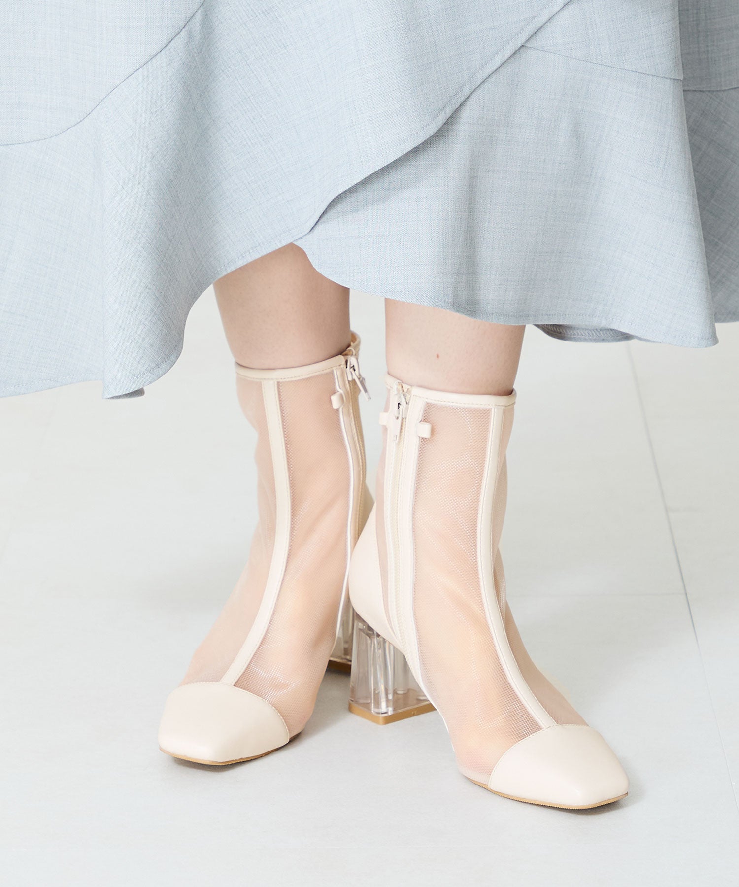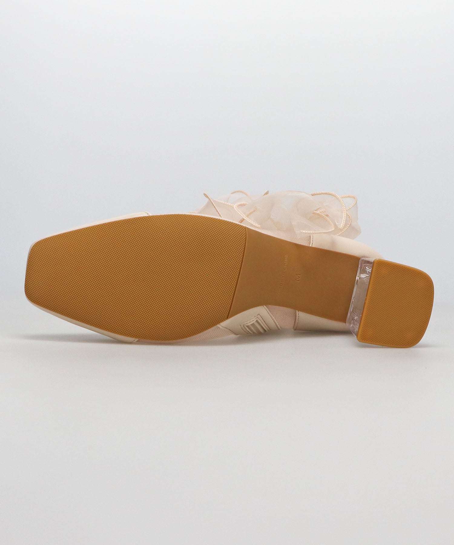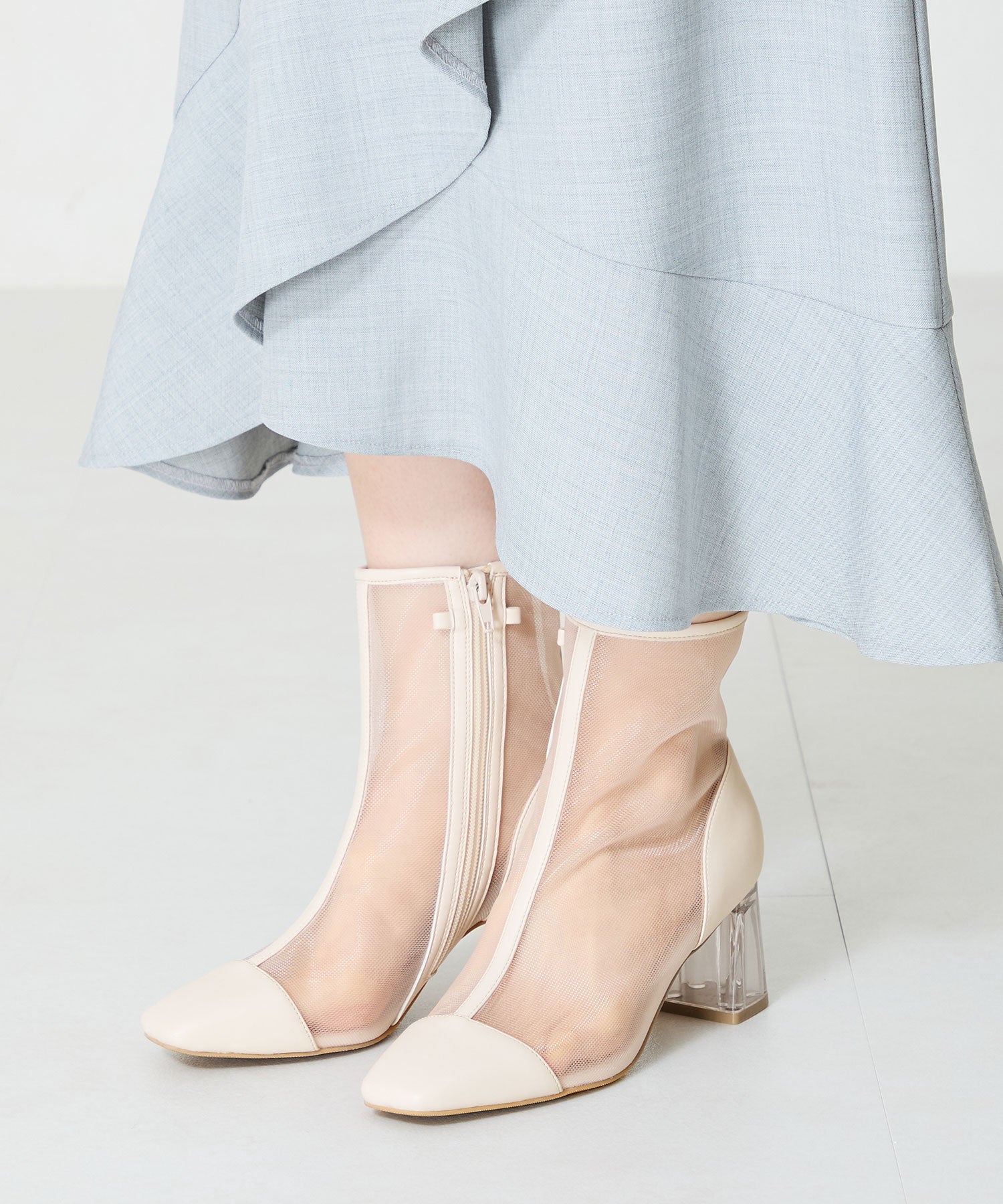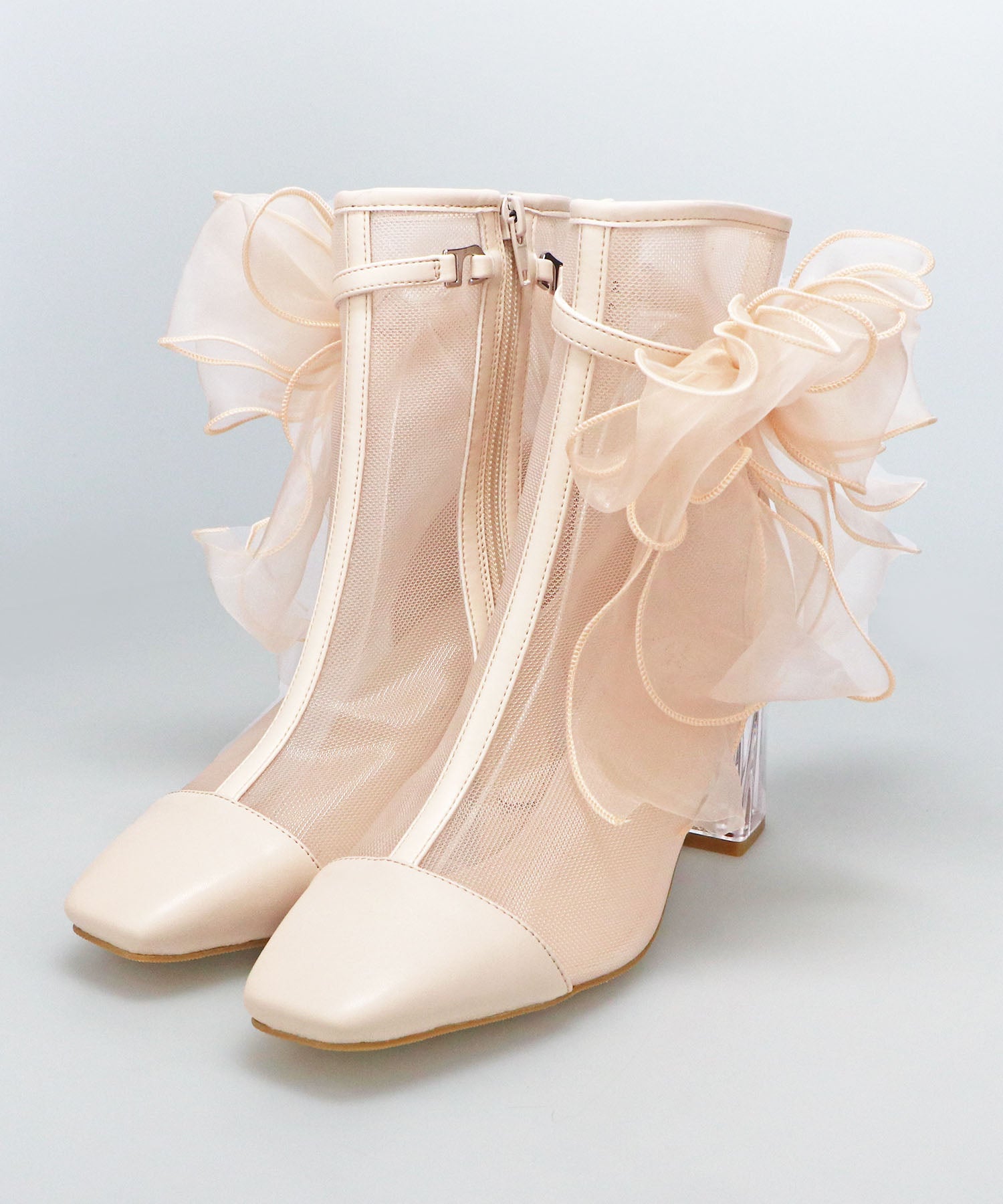 スタイリングの主役になるチュールのショートブーツは、華やかでふわっとしたニュアンスのあるリボンモチーフが旬な足元を演出。リボンベルトは取り外しが可能で、取るとシンプルなブーツとして幅広く活躍する優秀アイテム。ほんのりとベージュカラーを纏ったクリアヒールは大人なムードが漂う雰囲気で履くと気分が高まる特別な1足。