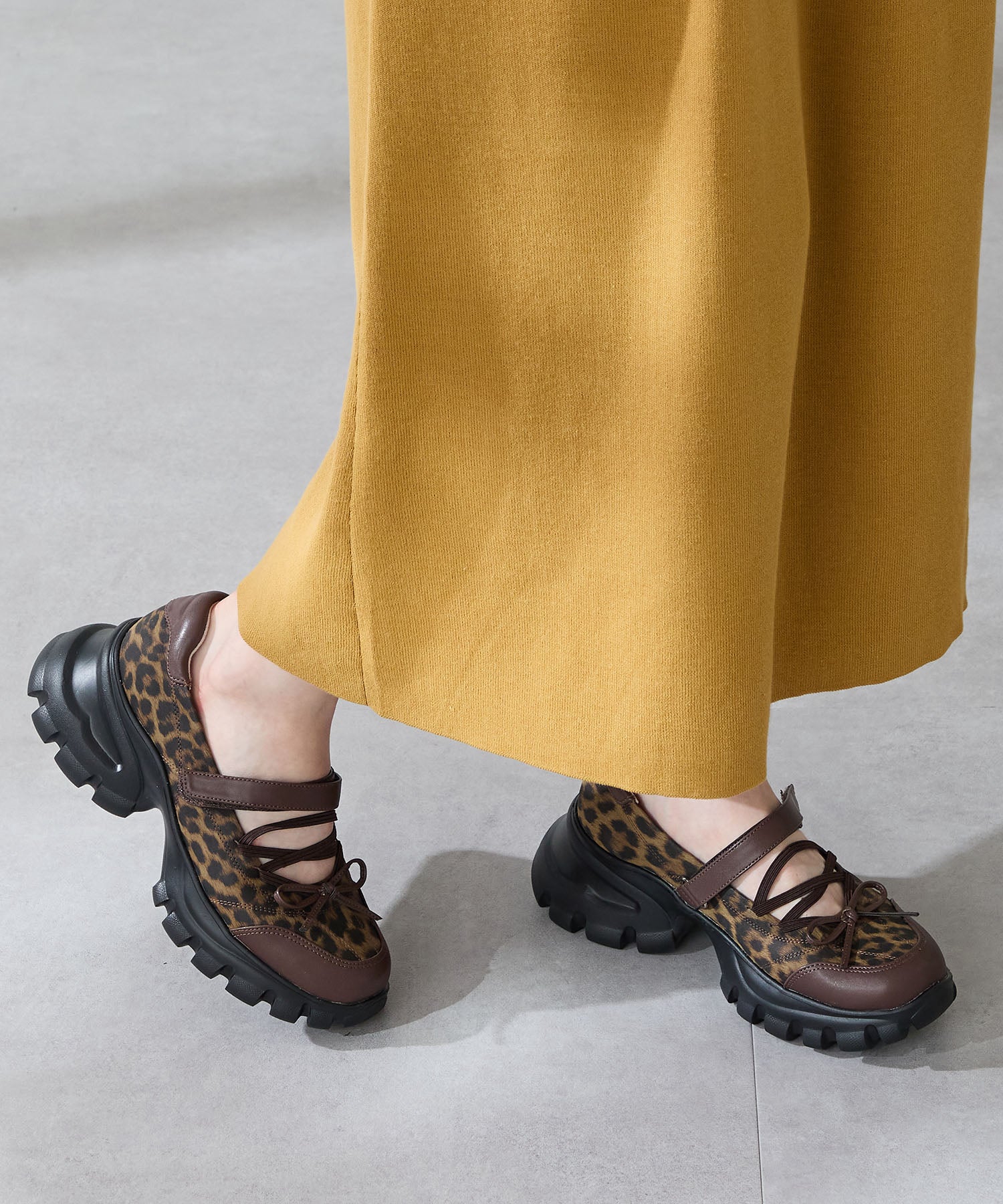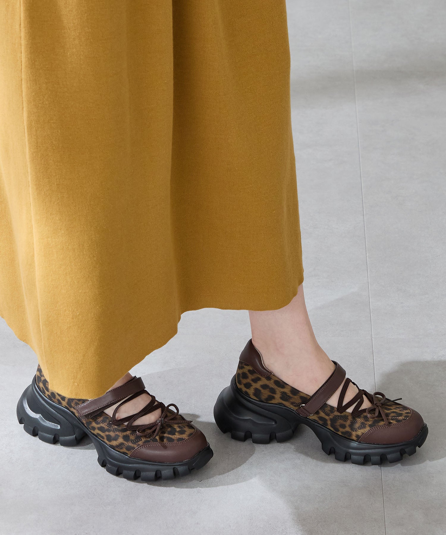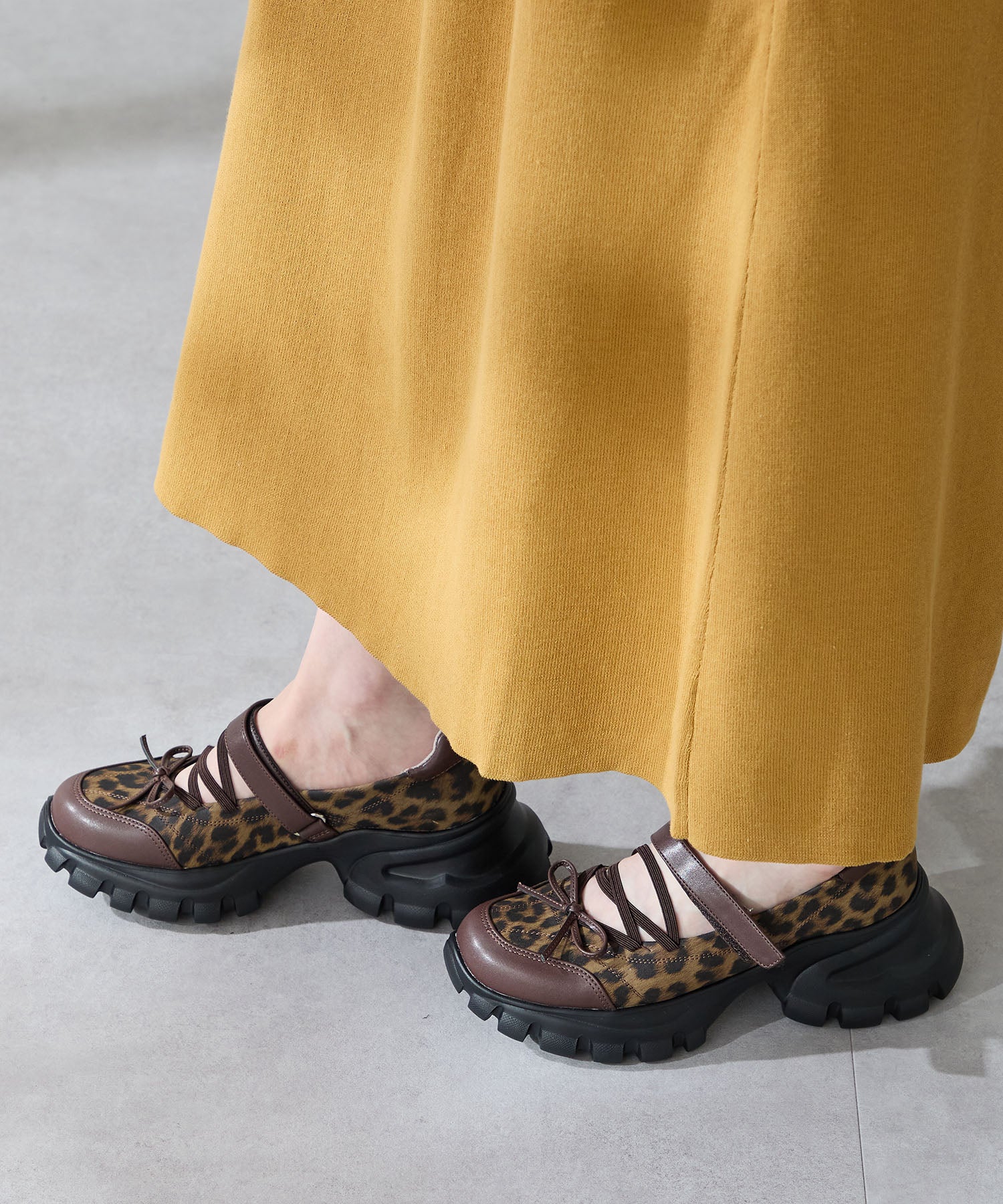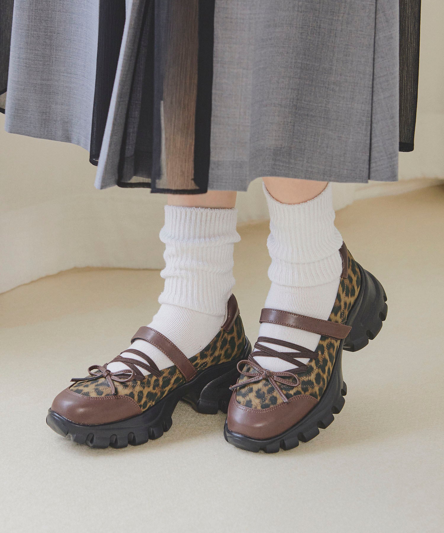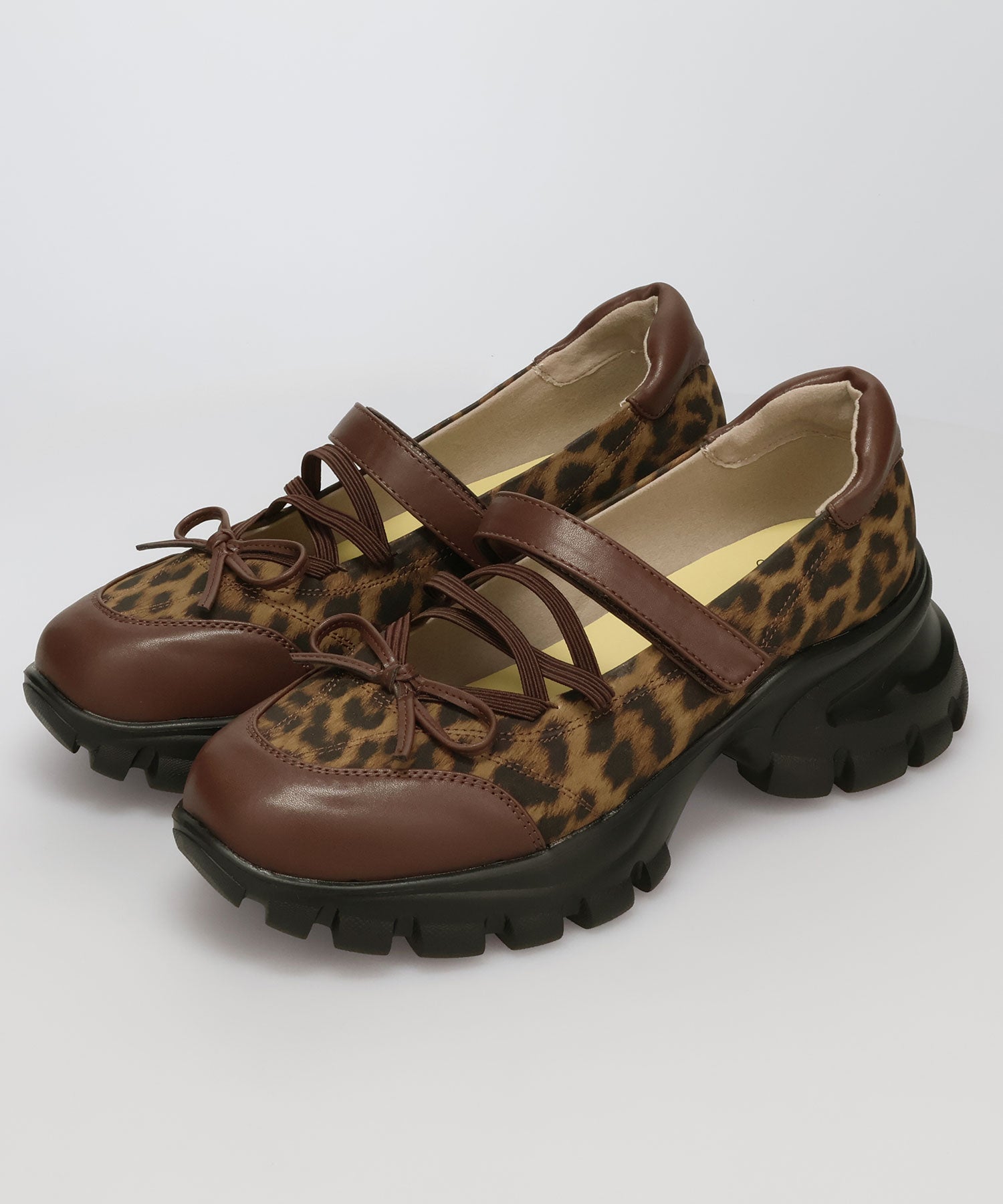 ボリューミーなスニーカーソールでスタイルアップと履きやすさを両立した遊び心あふれるシューズ。カジュアルなシルエットながらもフロントにはフェミニンなリボンをプラスし、ガーリーなスタイリングにもマッチ。ベルクロタイプの甲ベルトとゴムストラップが足をしっかりホールドし、踵部分のクッションが歩行時の衝撃を軽減してくれる。ブラウンは大胆にレオパード柄をあしらった目を惹く今季注目カラー。