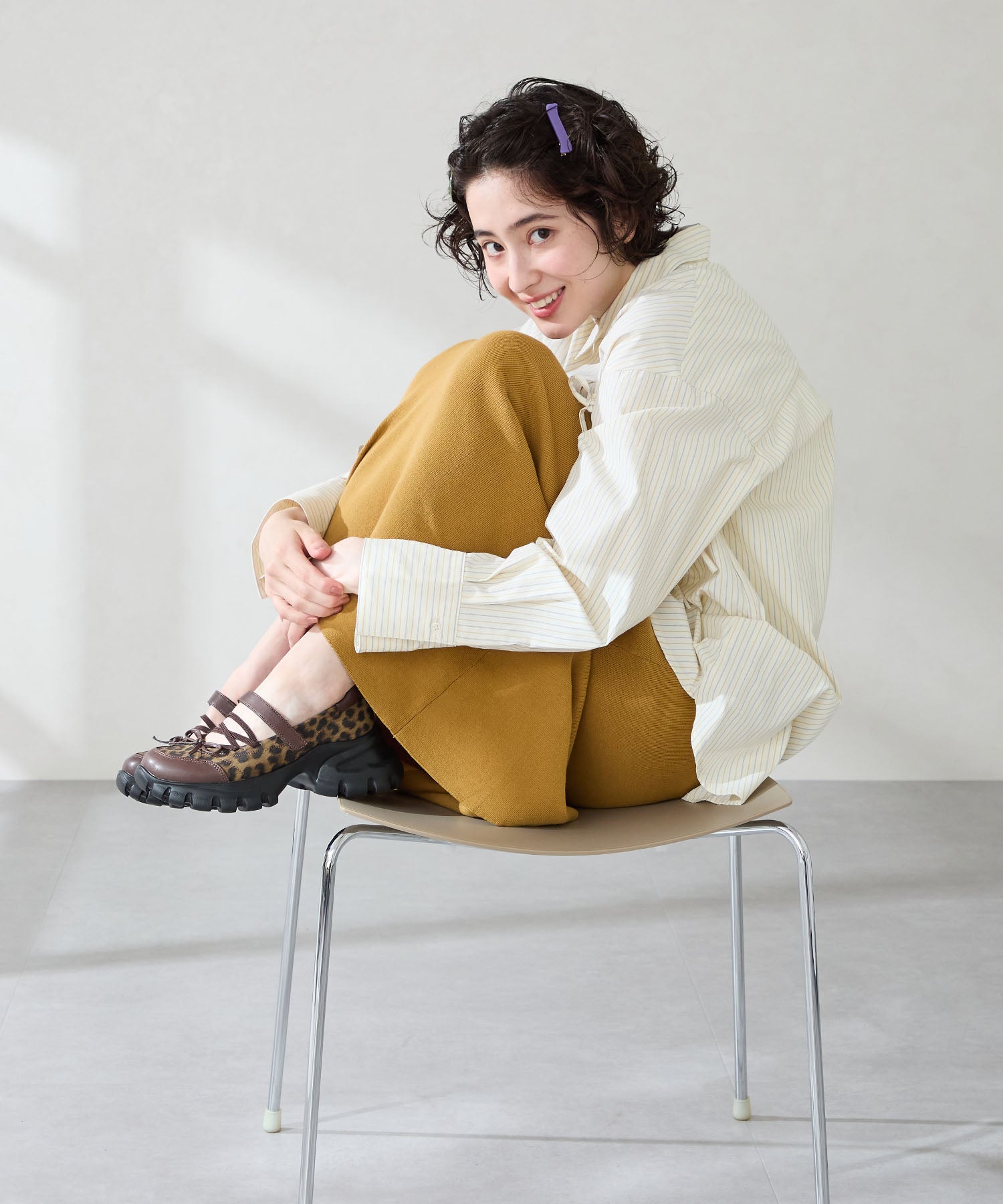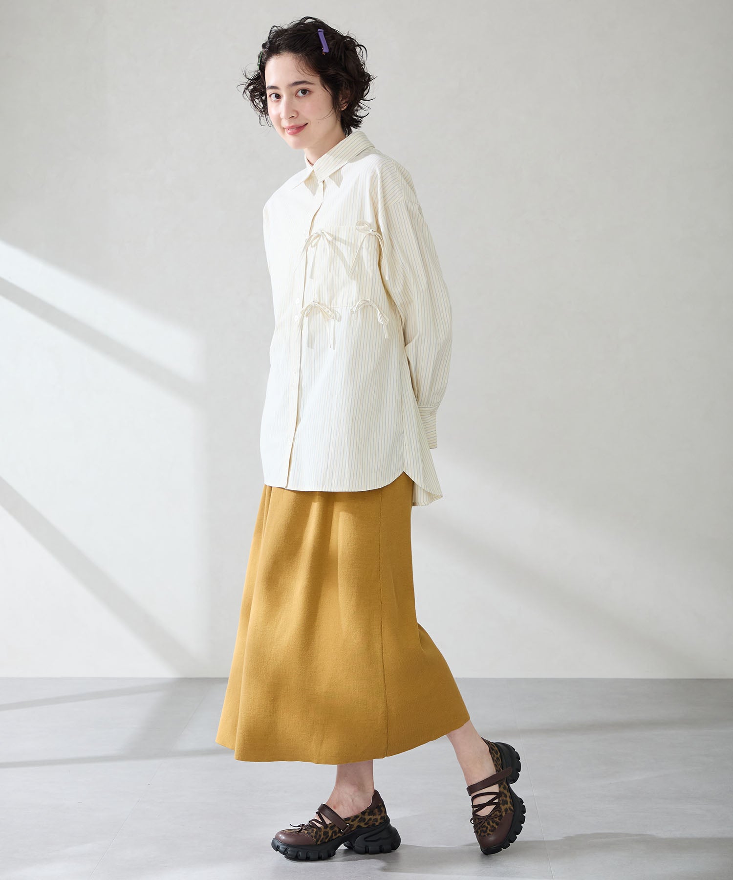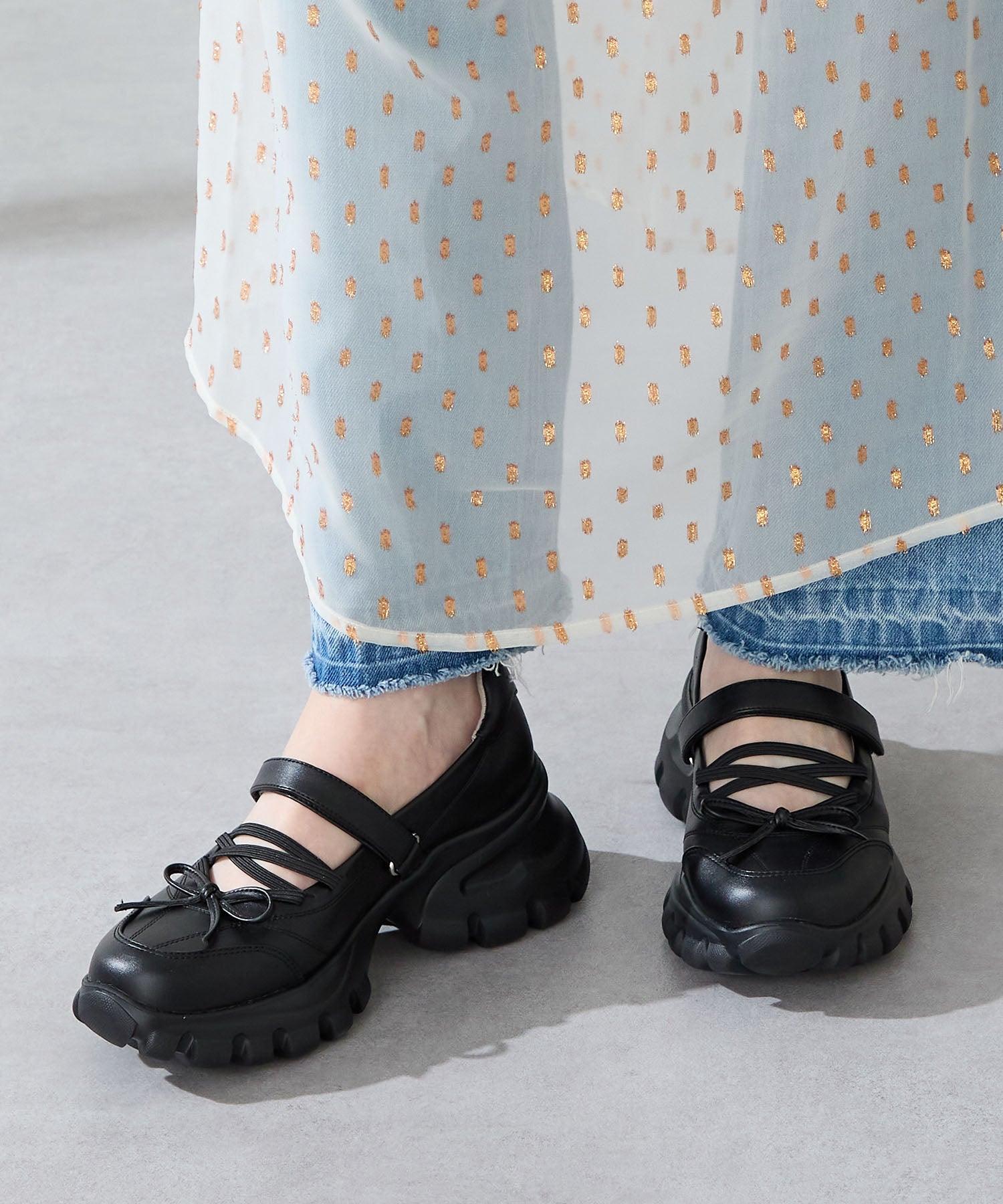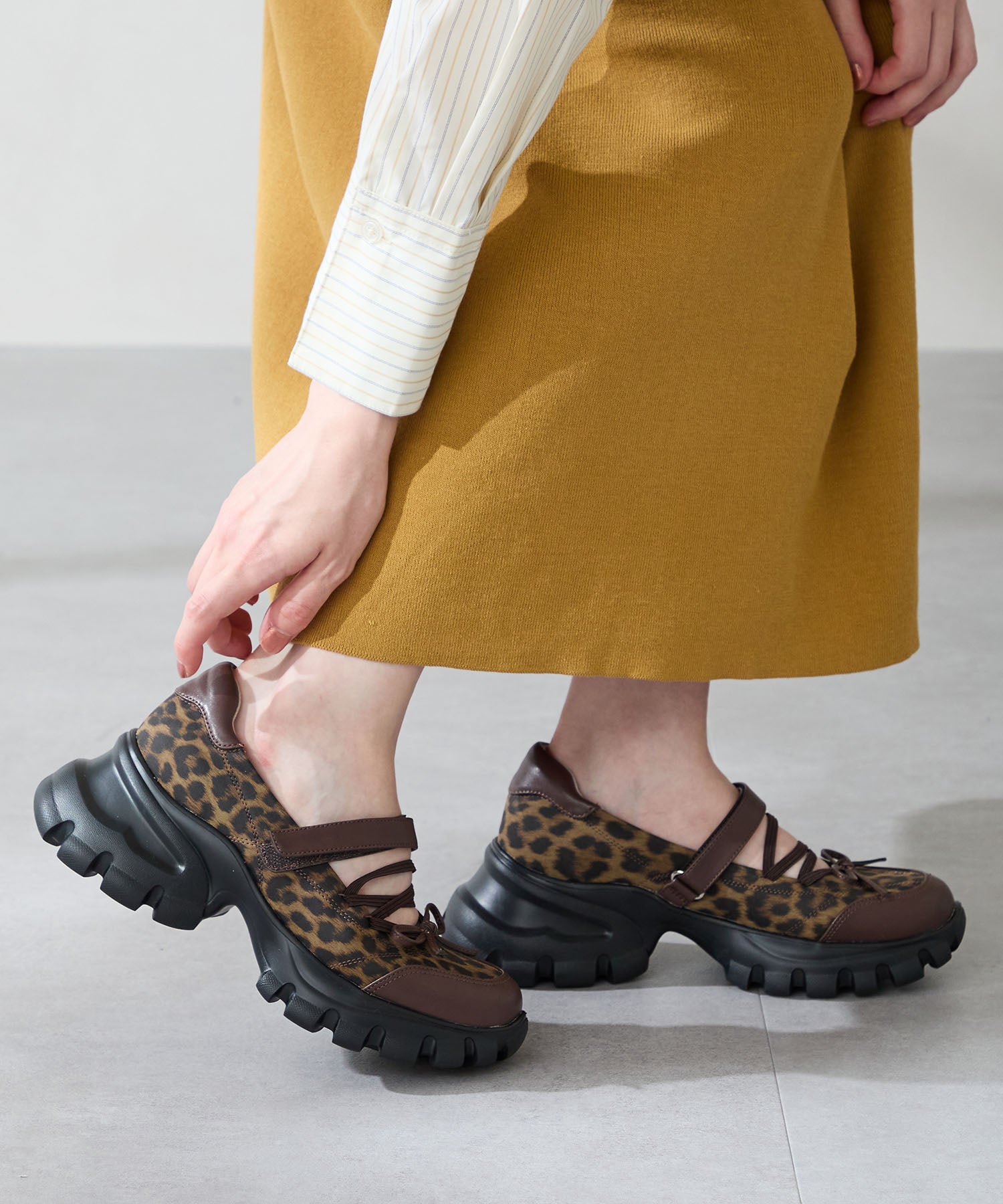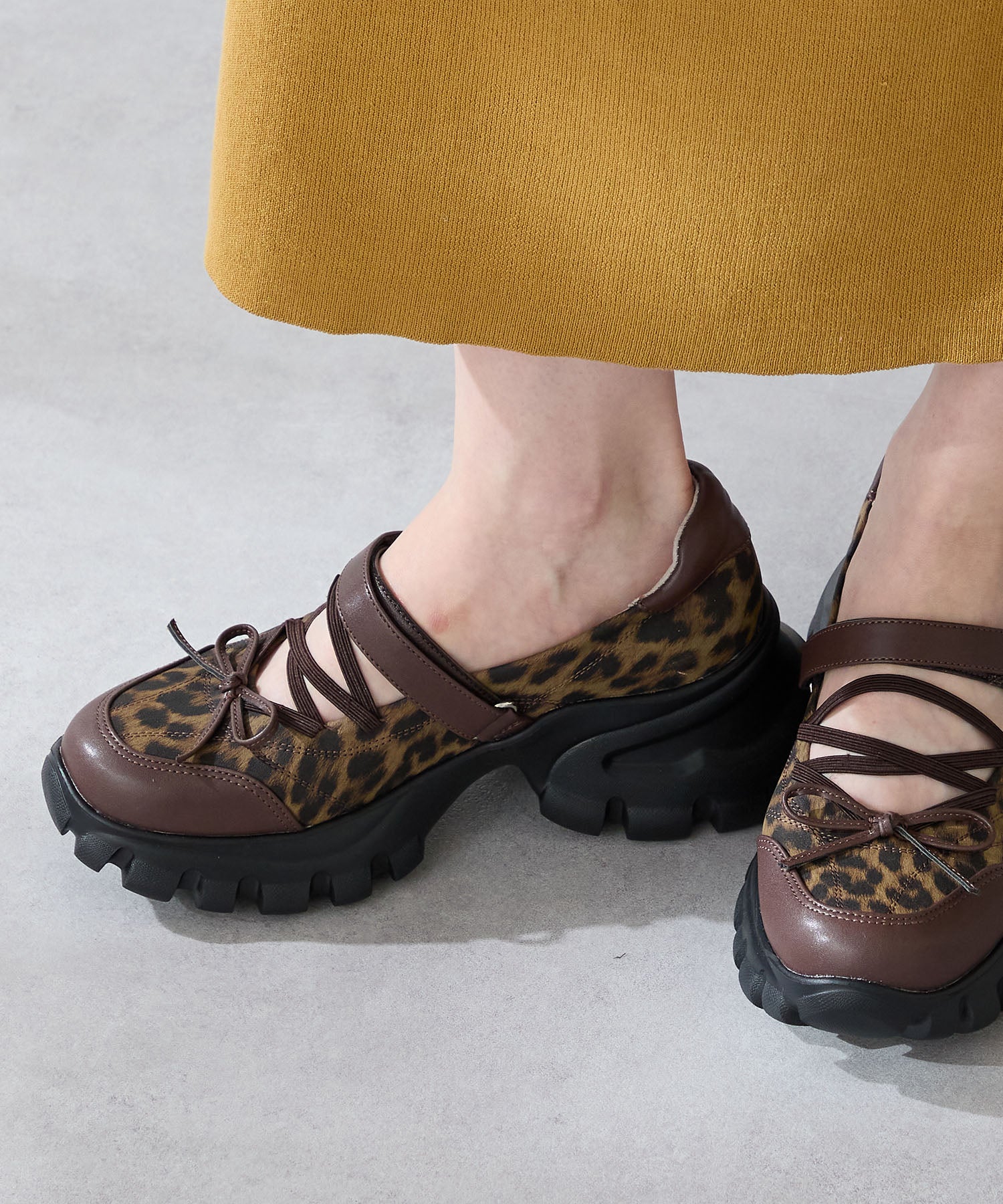 ボリューミーなスニーカーソールでスタイルアップと履きやすさを両立した遊び心あふれるシューズ。カジュアルなシルエットながらもフロントにはフェミニンなリボンをプラスし、ガーリーなスタイリングにもマッチ。ベルクロタイプの甲ベルトとゴムストラップが足をしっかりホールドし、踵部分のクッションが歩行時の衝撃を軽減してくれる。ブラウンは大胆にレオパード柄をあしらった目を惹く今季注目カラー。
