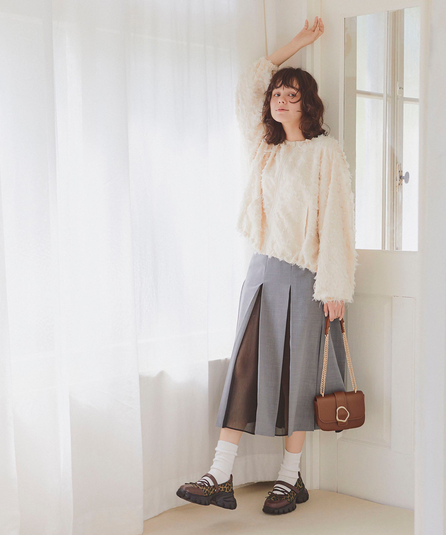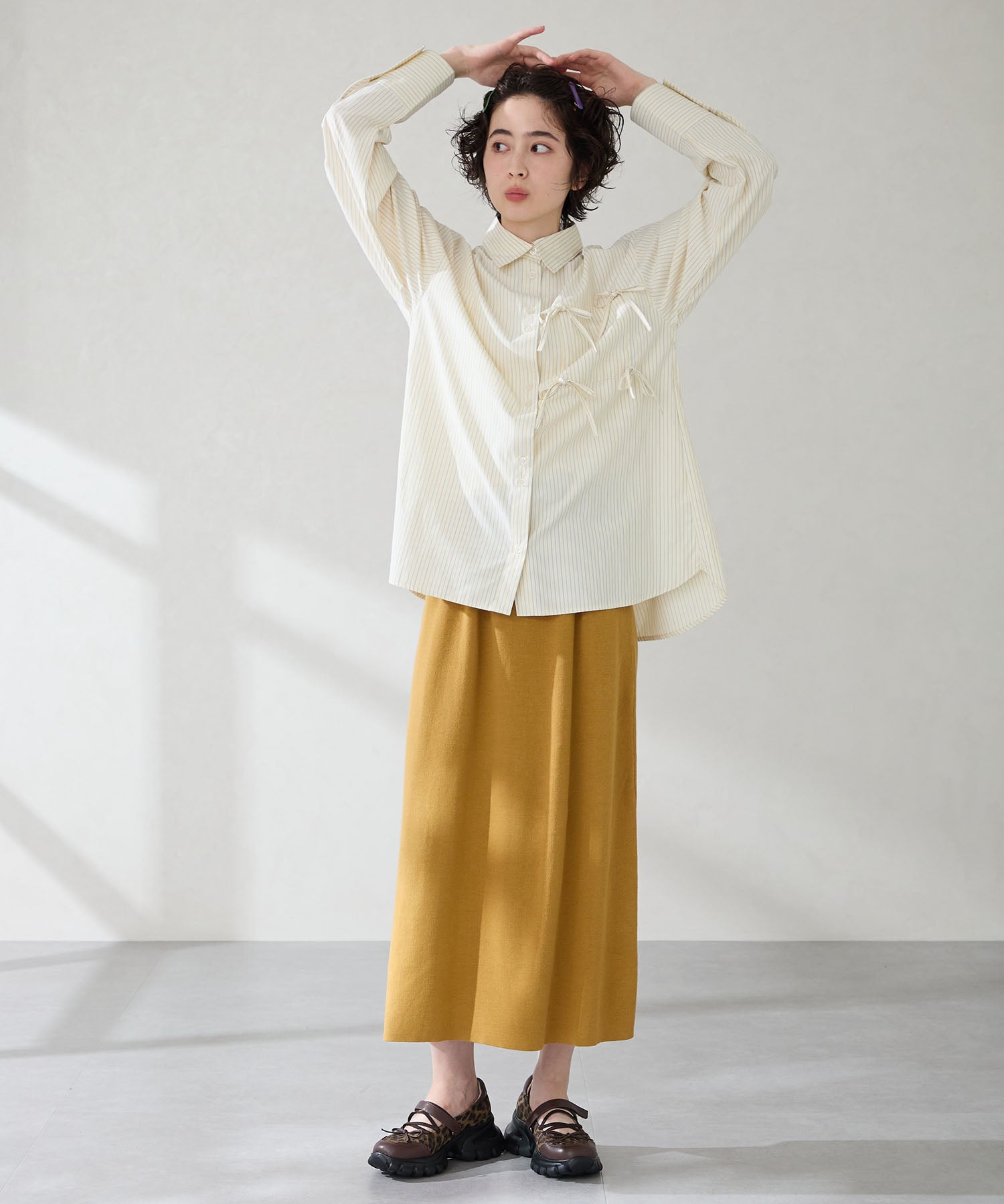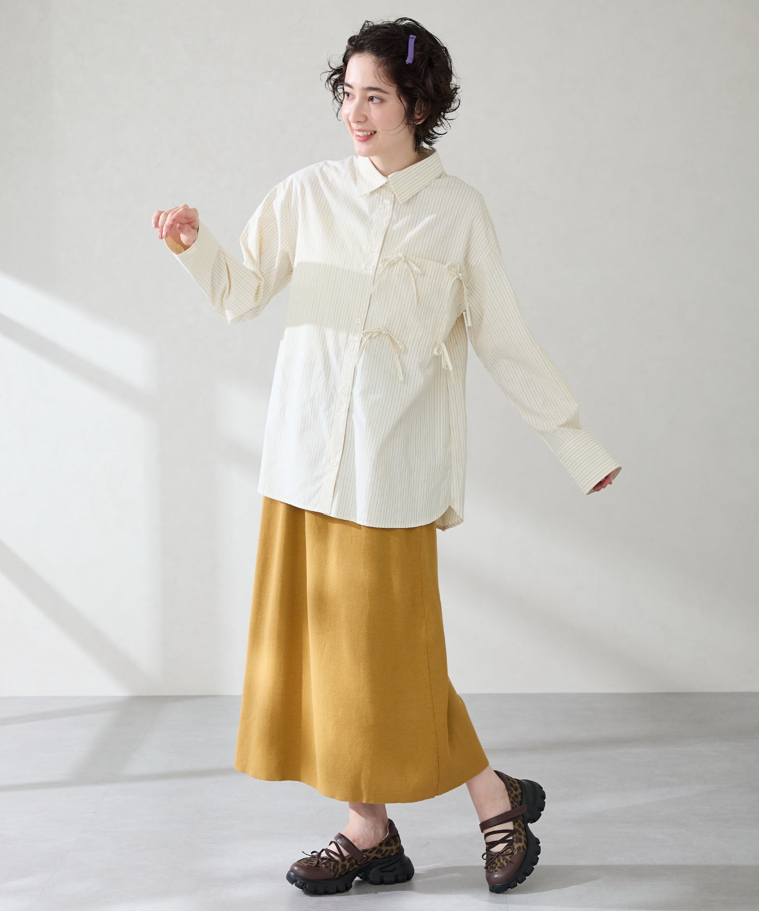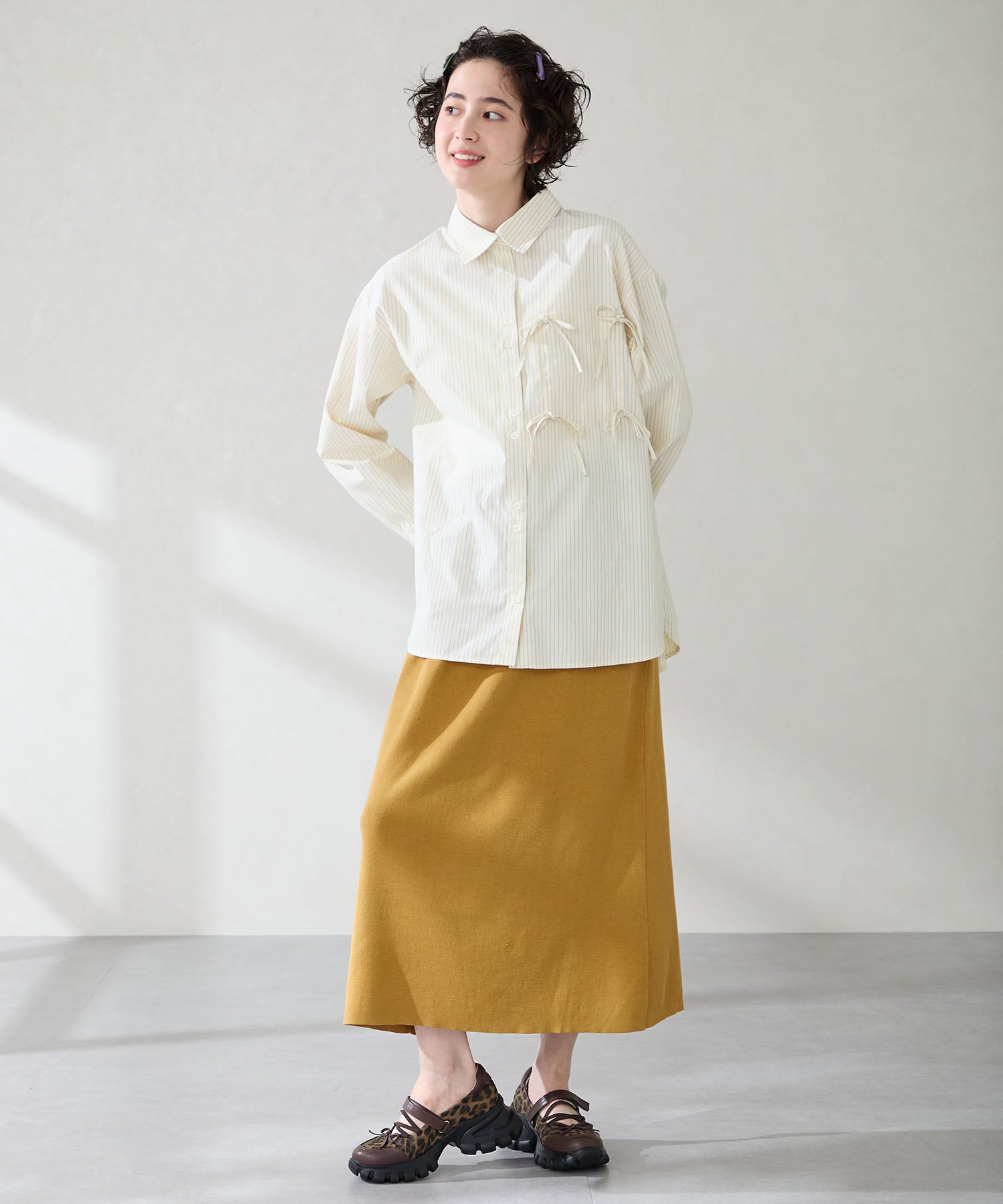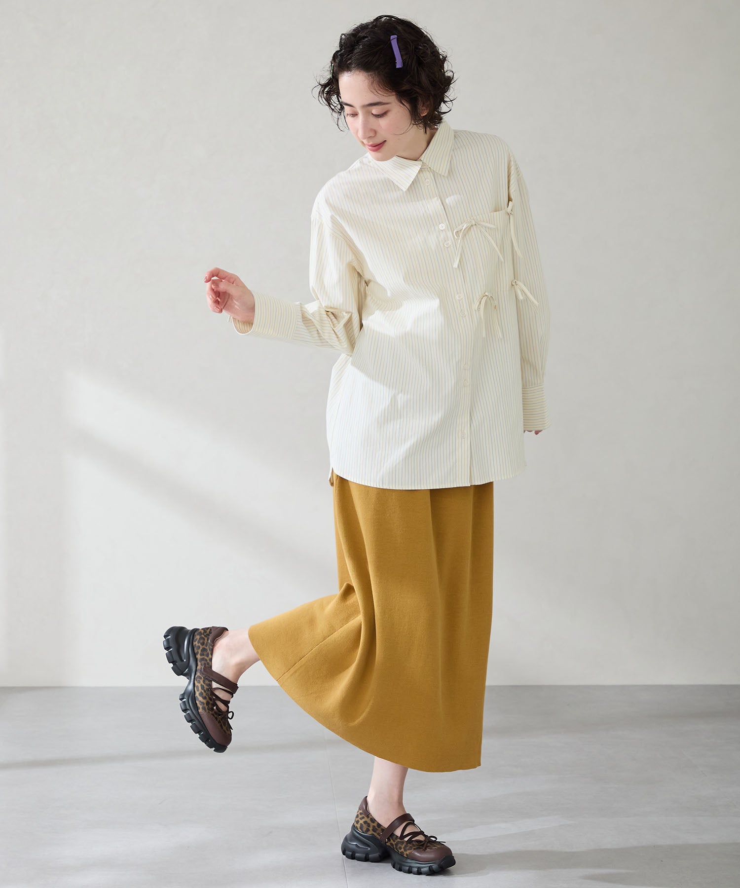 ボリューミーなスニーカーソールでスタイルアップと履きやすさを両立した遊び心あふれるシューズ。カジュアルなシルエットながらもフロントにはフェミニンなリボンをプラスし、ガーリーなスタイリングにもマッチ。ベルクロタイプの甲ベルトとゴムストラップが足をしっかりホールドし、踵部分のクッションが歩行時の衝撃を軽減してくれる。ブラウンは大胆にレオパード柄をあしらった目を惹く今季注目カラー。
