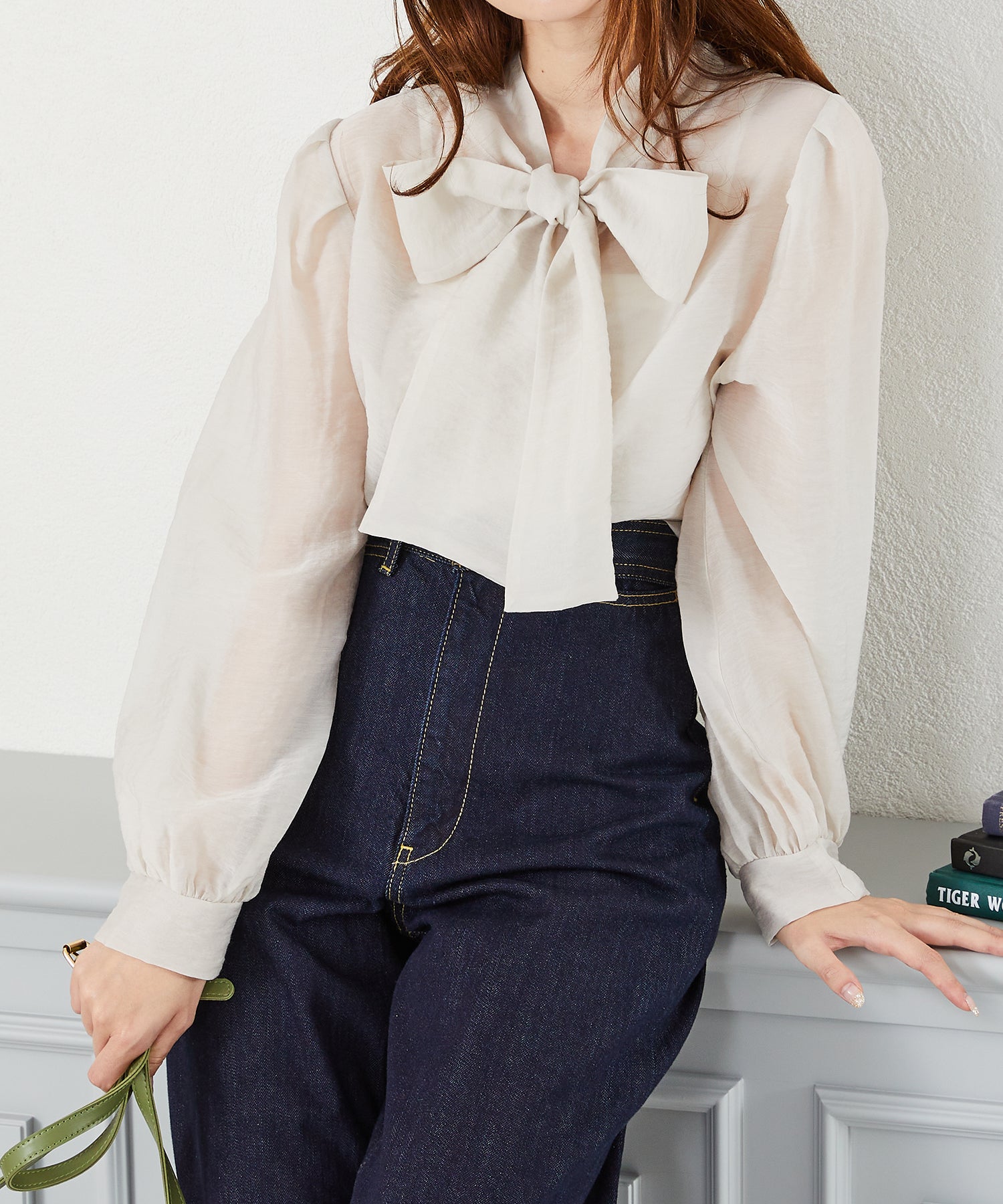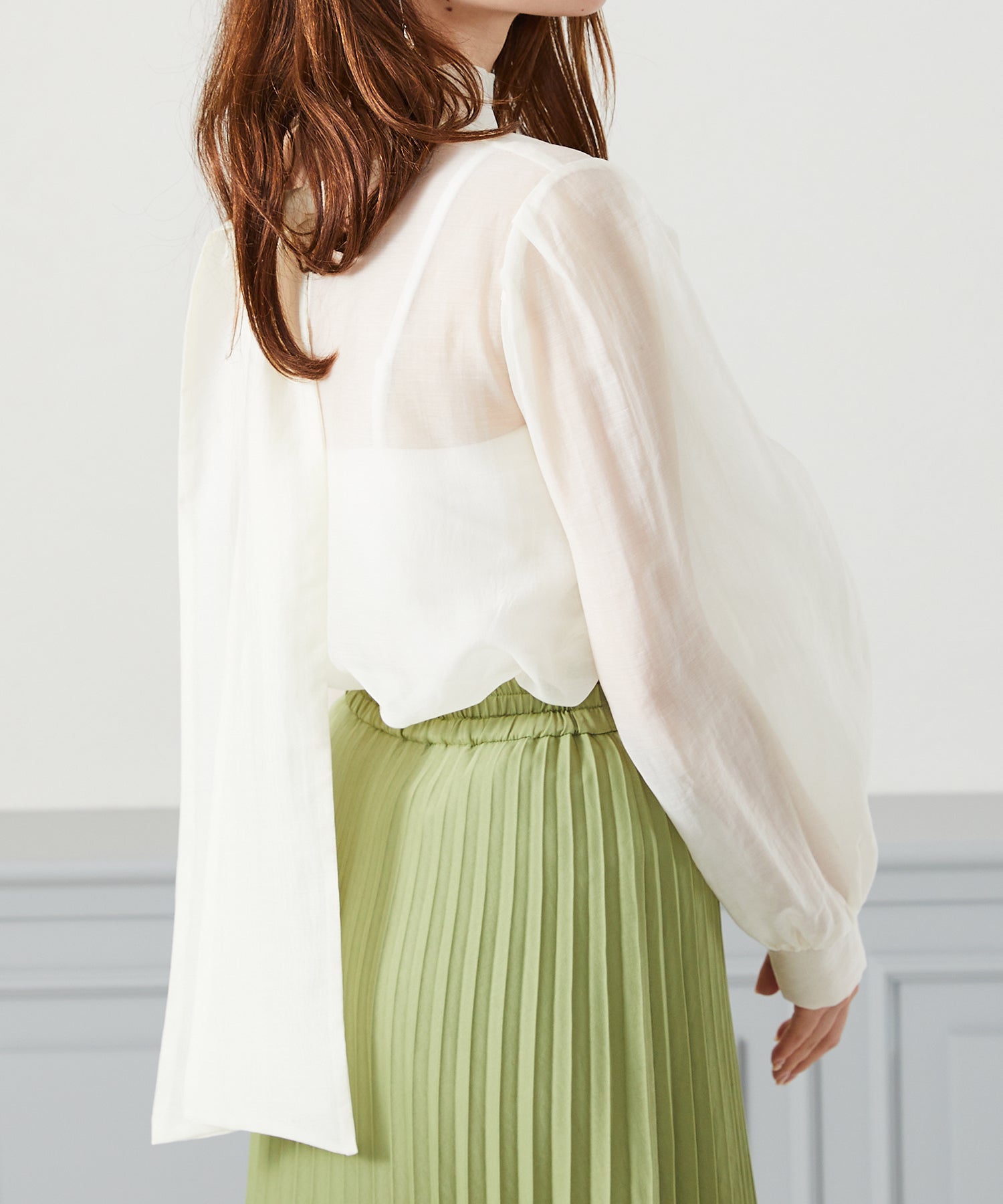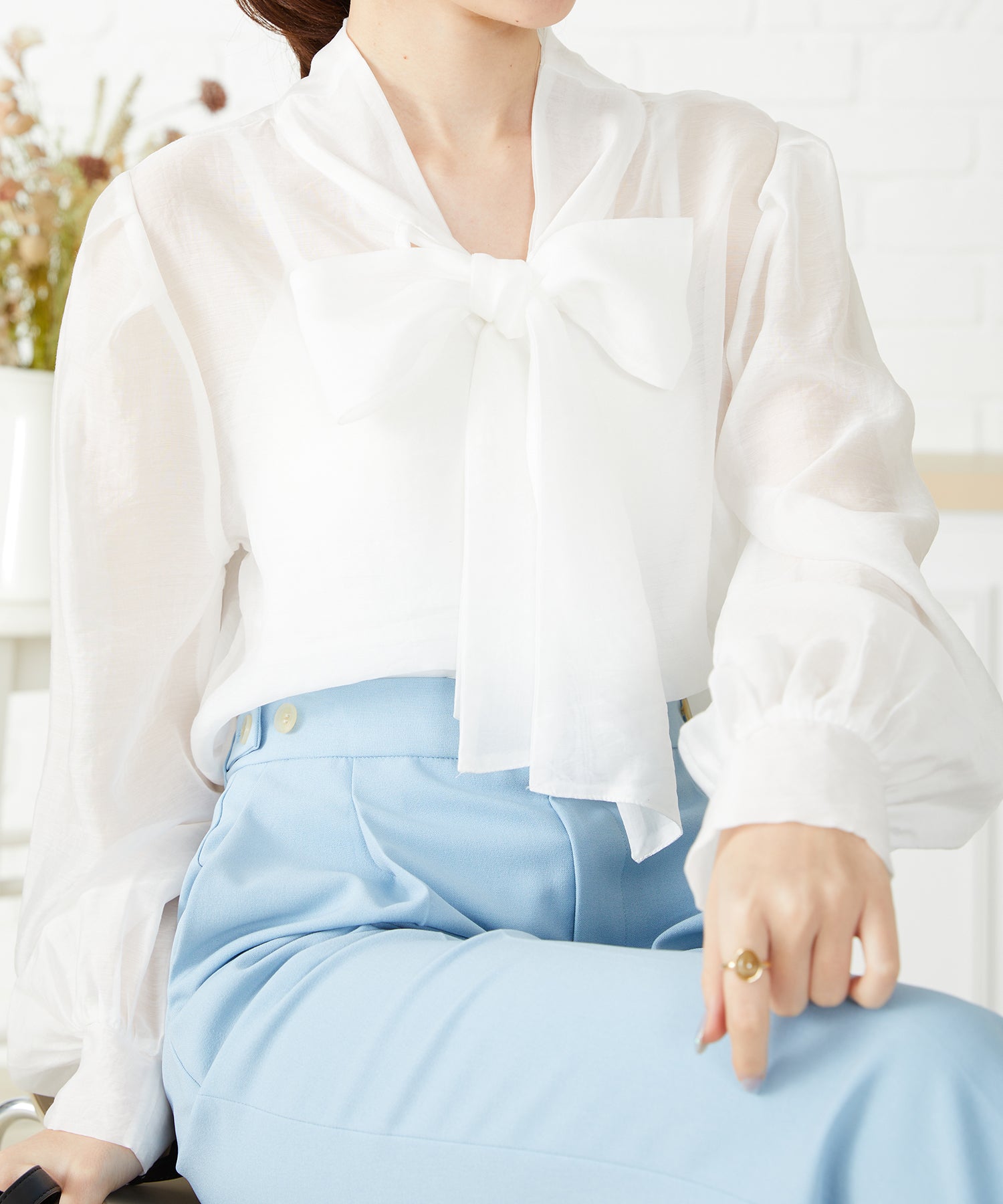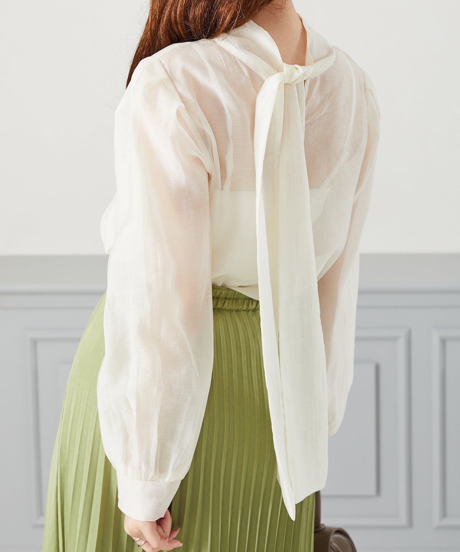 抜け感のあるシアー素材で程よい透け感が女性らしいブラウスは、着心地の良さも◎。一枚でも重ね着でも使える万能アイテム。前後2WAYで着用でき、前リボンでより女性らしく、後ろリボンで大人っぽくこなれた雰囲気に。フェミニンなスカートはもちろんデニムに合わせてもカジュアルダウンしすぎず上品に着こなせる。