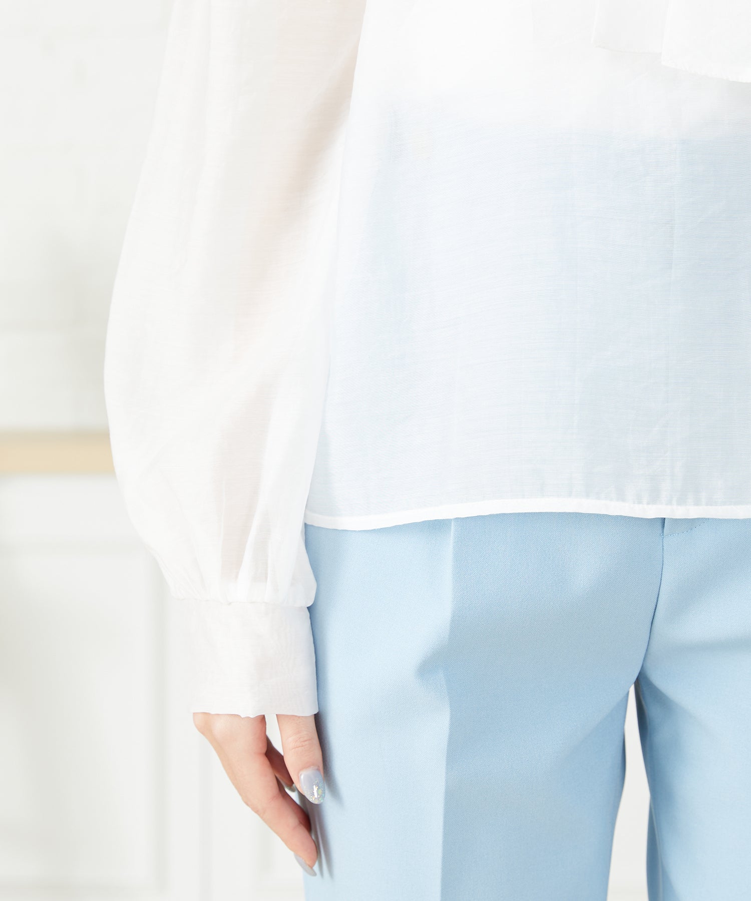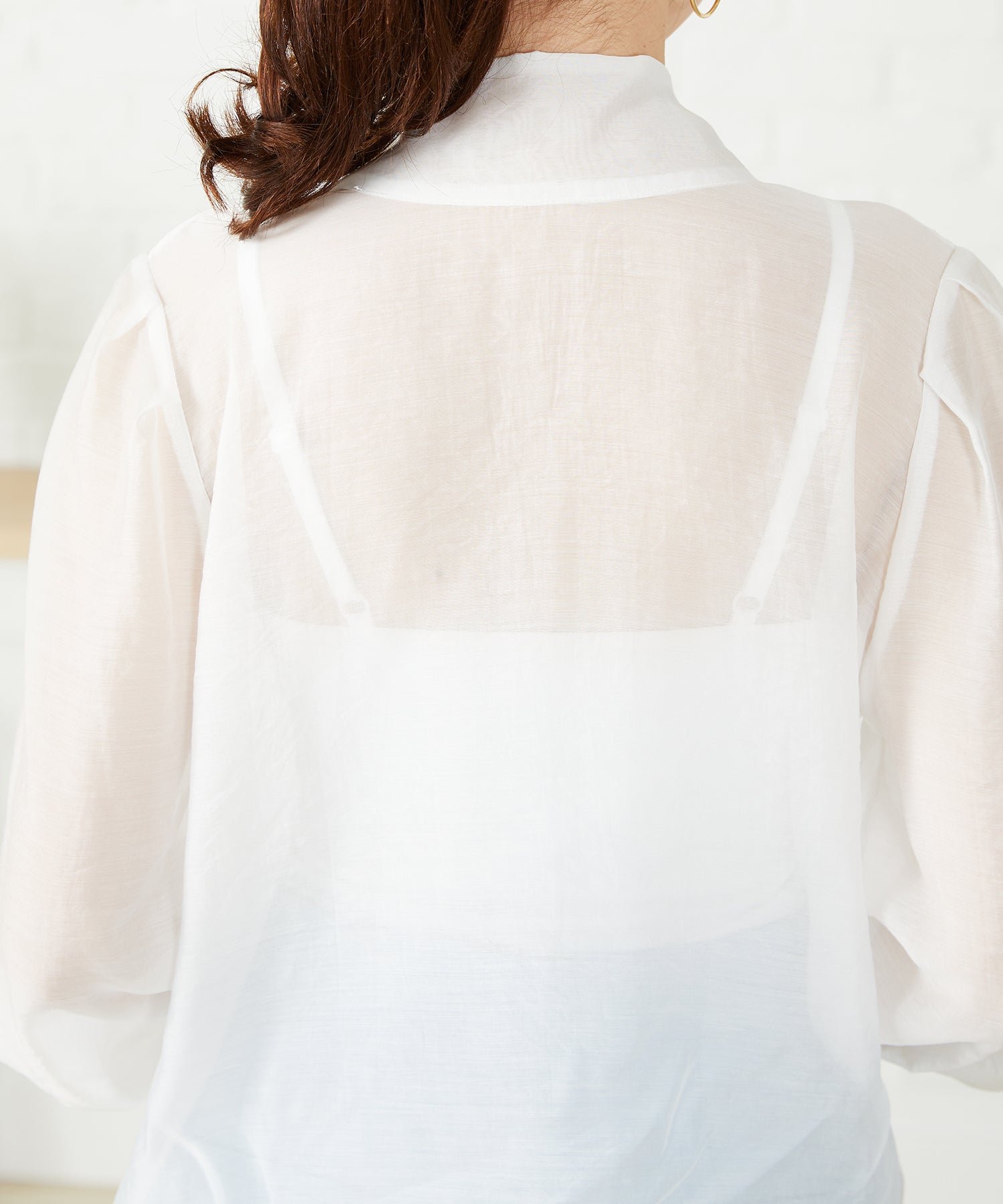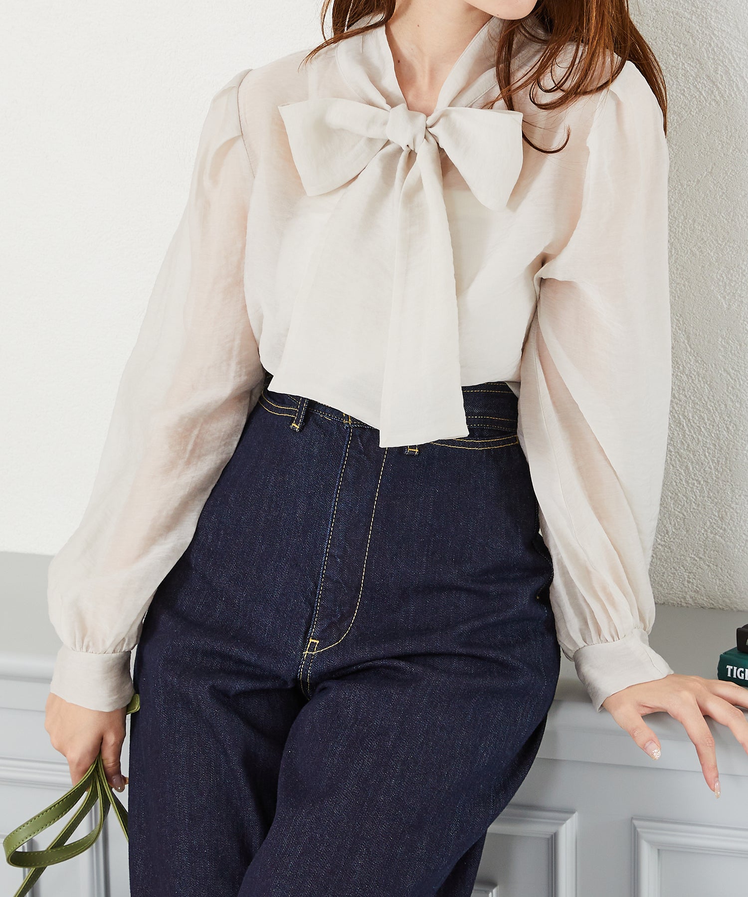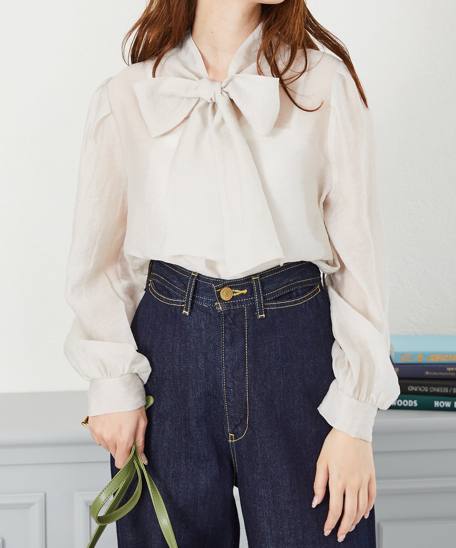 抜け感のあるシアー素材で程よい透け感が女性らしいブラウスは、着心地の良さも◎。一枚でも重ね着でも使える万能アイテム。前後2WAYで着用でき、前リボンでより女性らしく、後ろリボンで大人っぽくこなれた雰囲気に。フェミニンなスカートはもちろんデニムに合わせてもカジュアルダウンしすぎず上品に着こなせる。