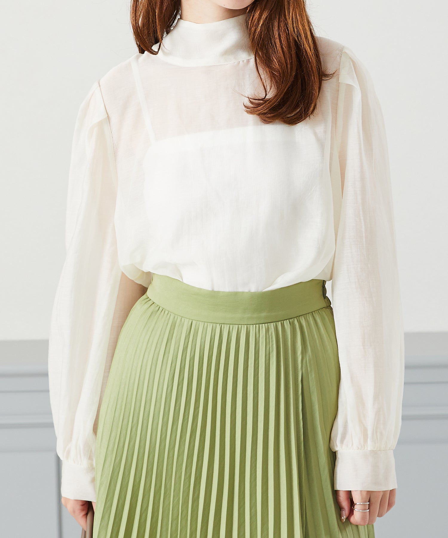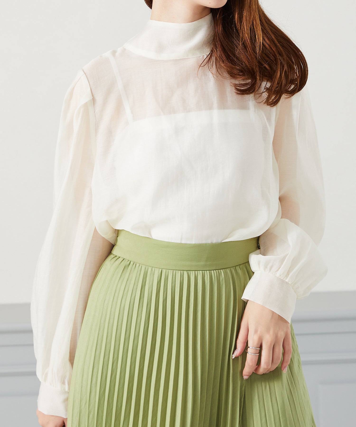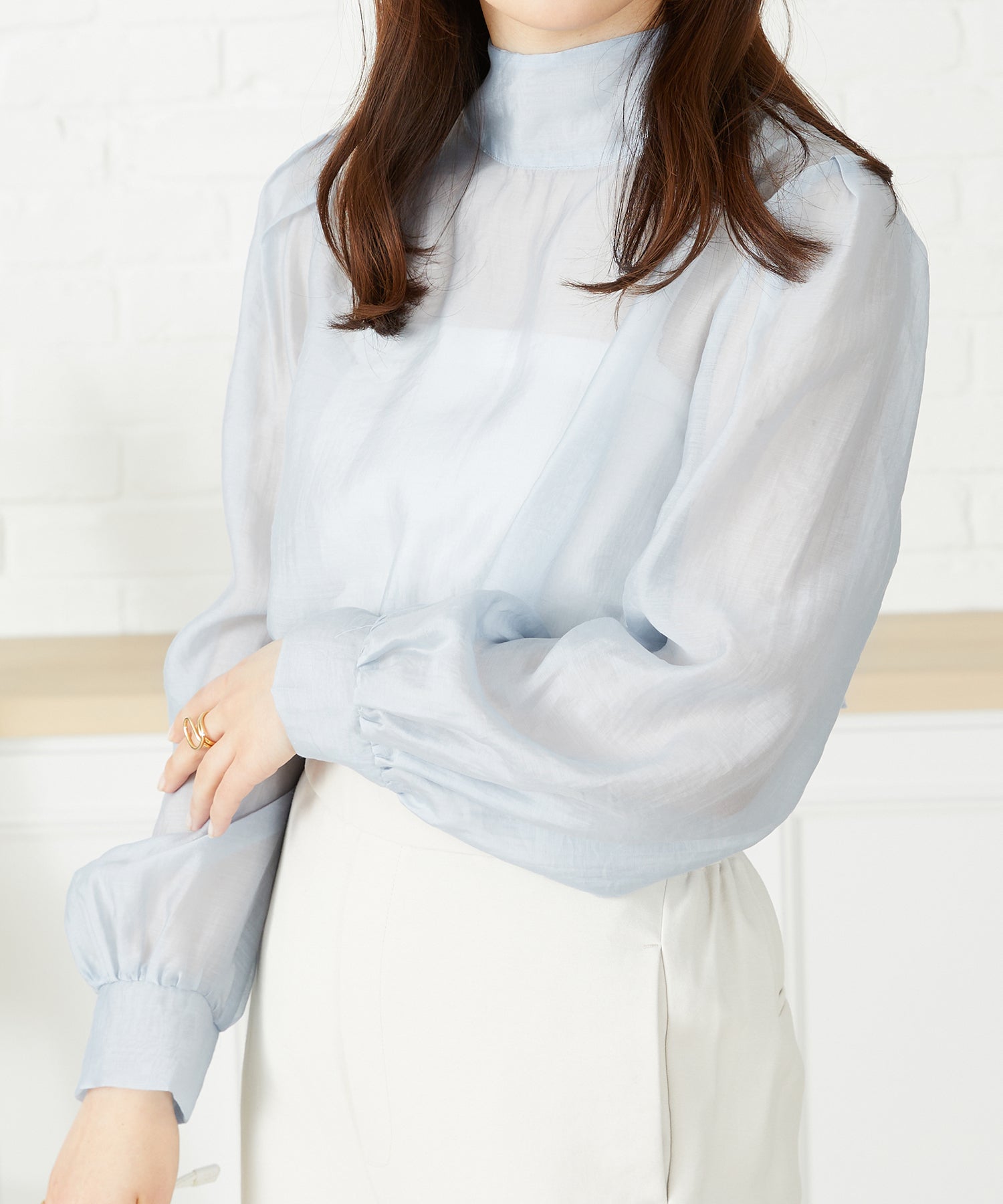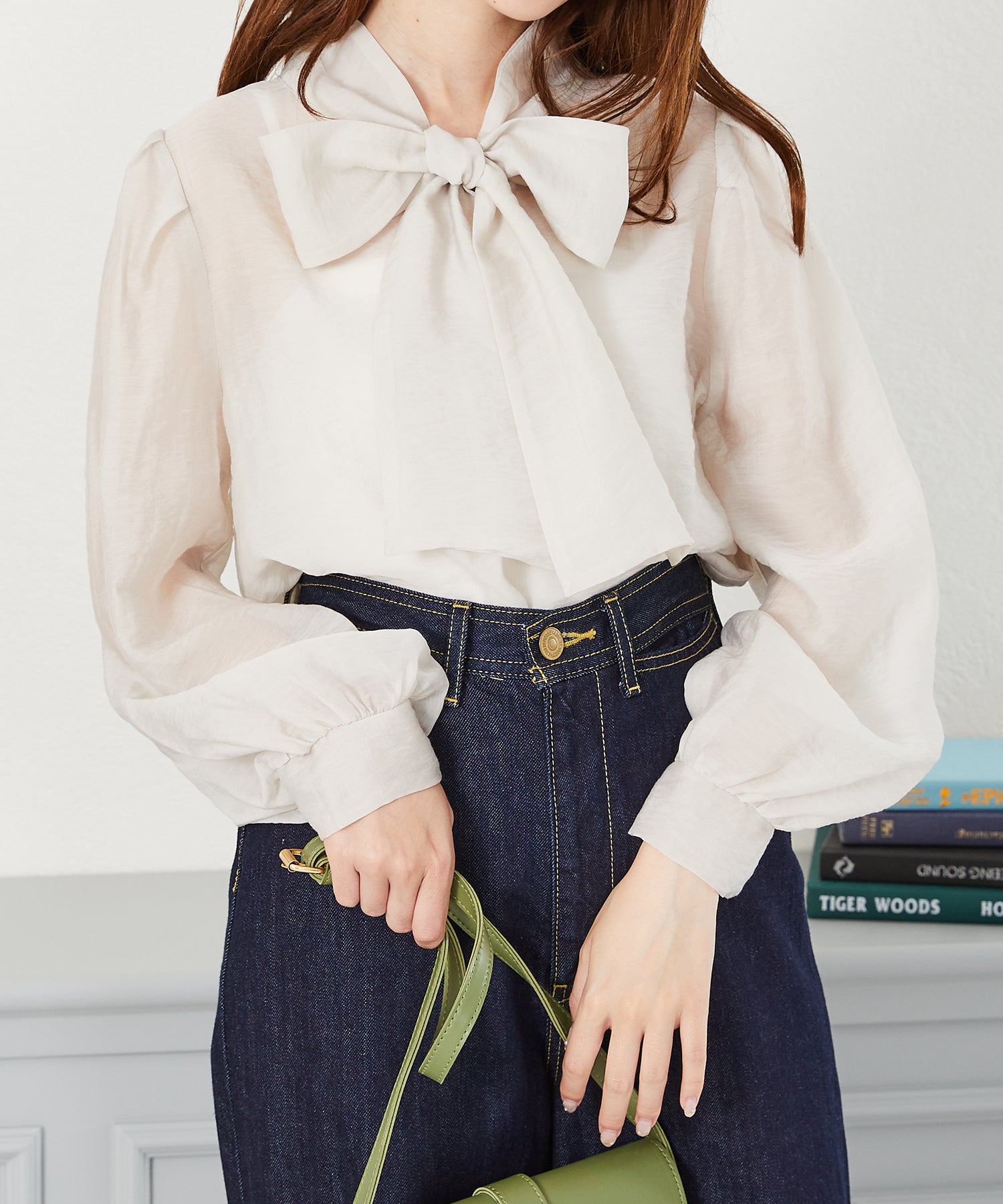抜け感のあるシアー素材で程よい透け感が女性らしいブラウスは、着心地の良さも◎。一枚でも重ね着でも使える万能アイテム。前後2WAYで着用でき、前リボンでより女性らしく、後ろリボンで大人っぽくこなれた雰囲気に。フェミニンなスカートはもちろんデニムに合わせてもカジュアルダウンしすぎず上品に着こなせる。