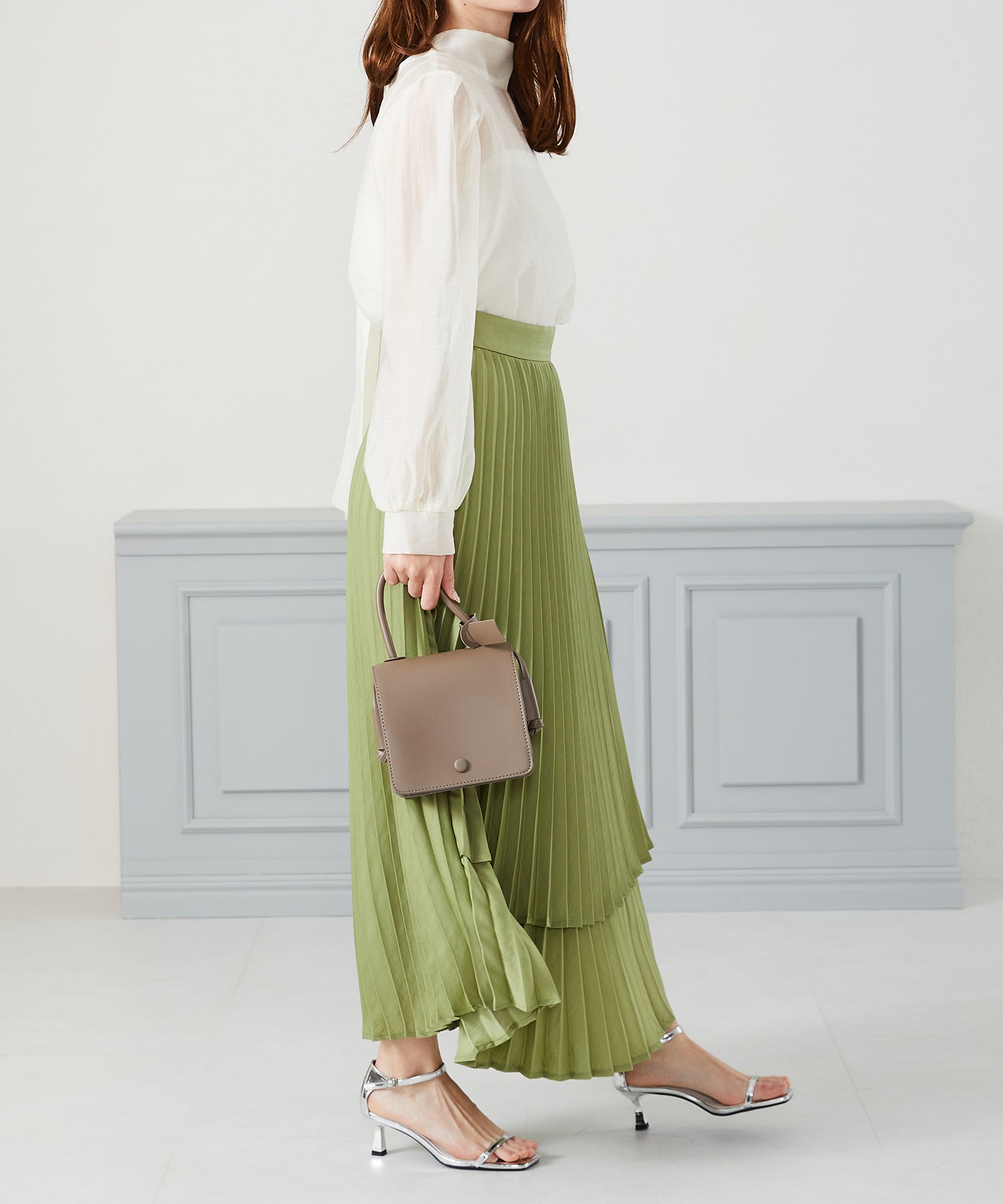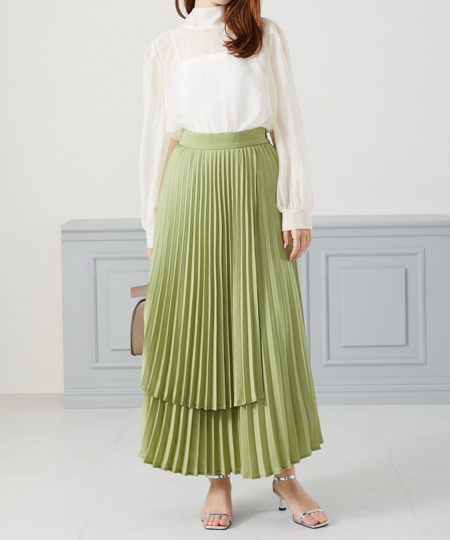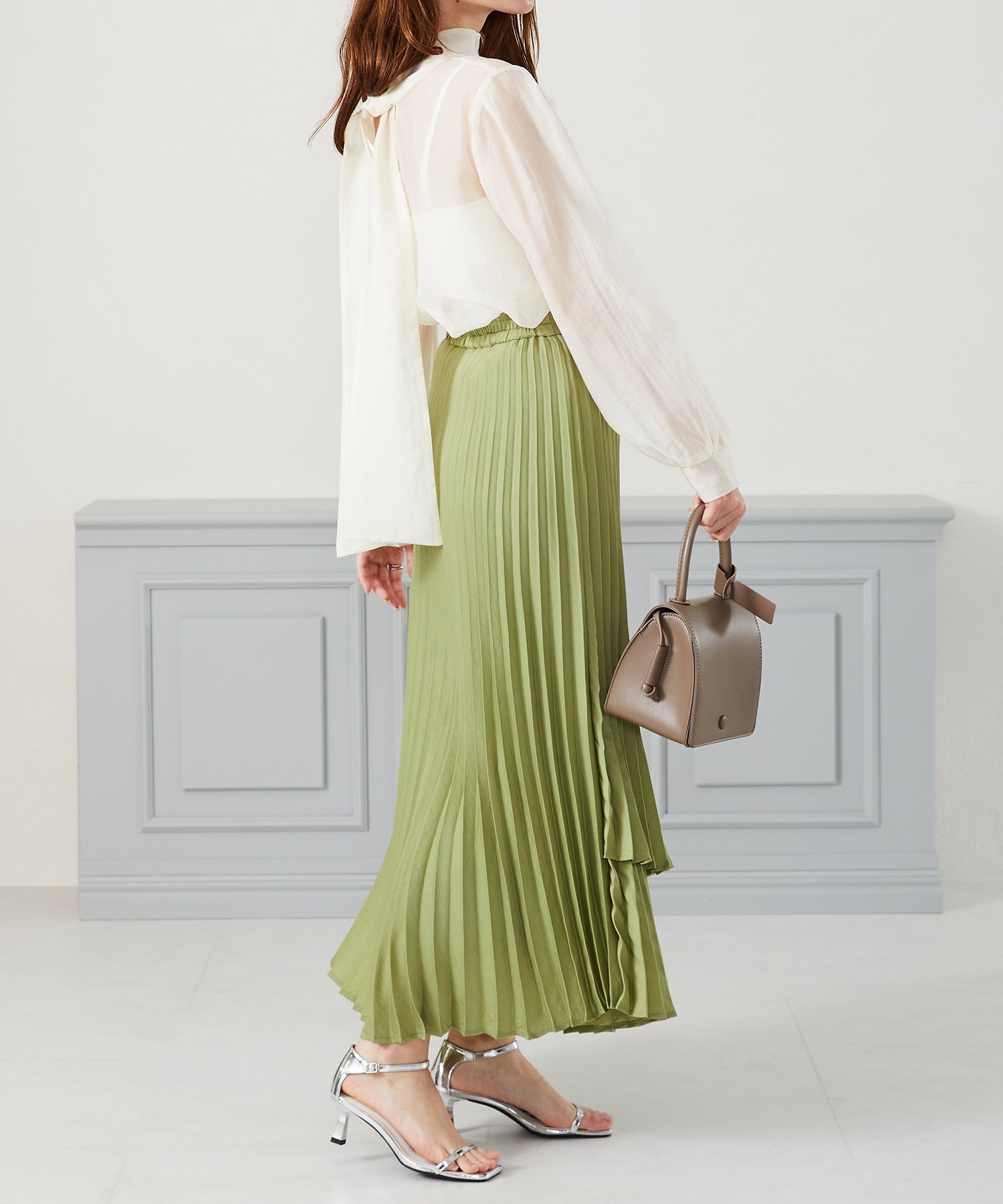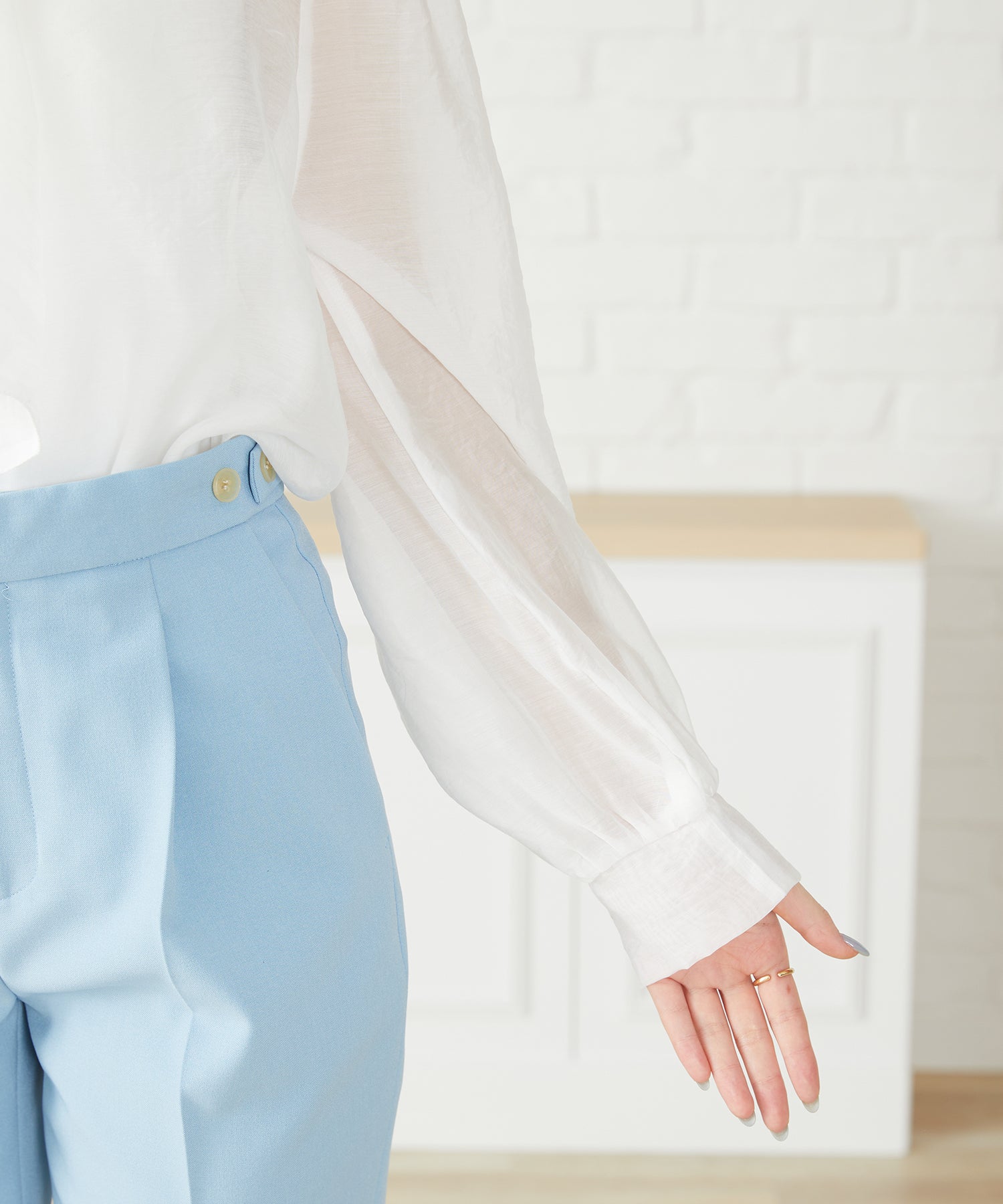 抜け感のあるシアー素材で程よい透け感が女性らしいブラウスは、着心地の良さも◎。一枚でも重ね着でも使える万能アイテム。前後2WAYで着用でき、前リボンでより女性らしく、後ろリボンで大人っぽくこなれた雰囲気に。フェミニンなスカートはもちろんデニムに合わせてもカジュアルダウンしすぎず上品に着こなせる。