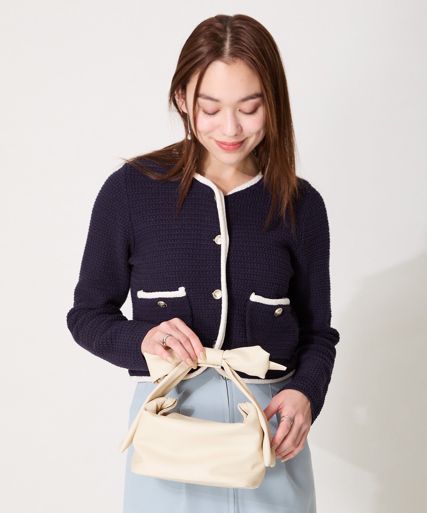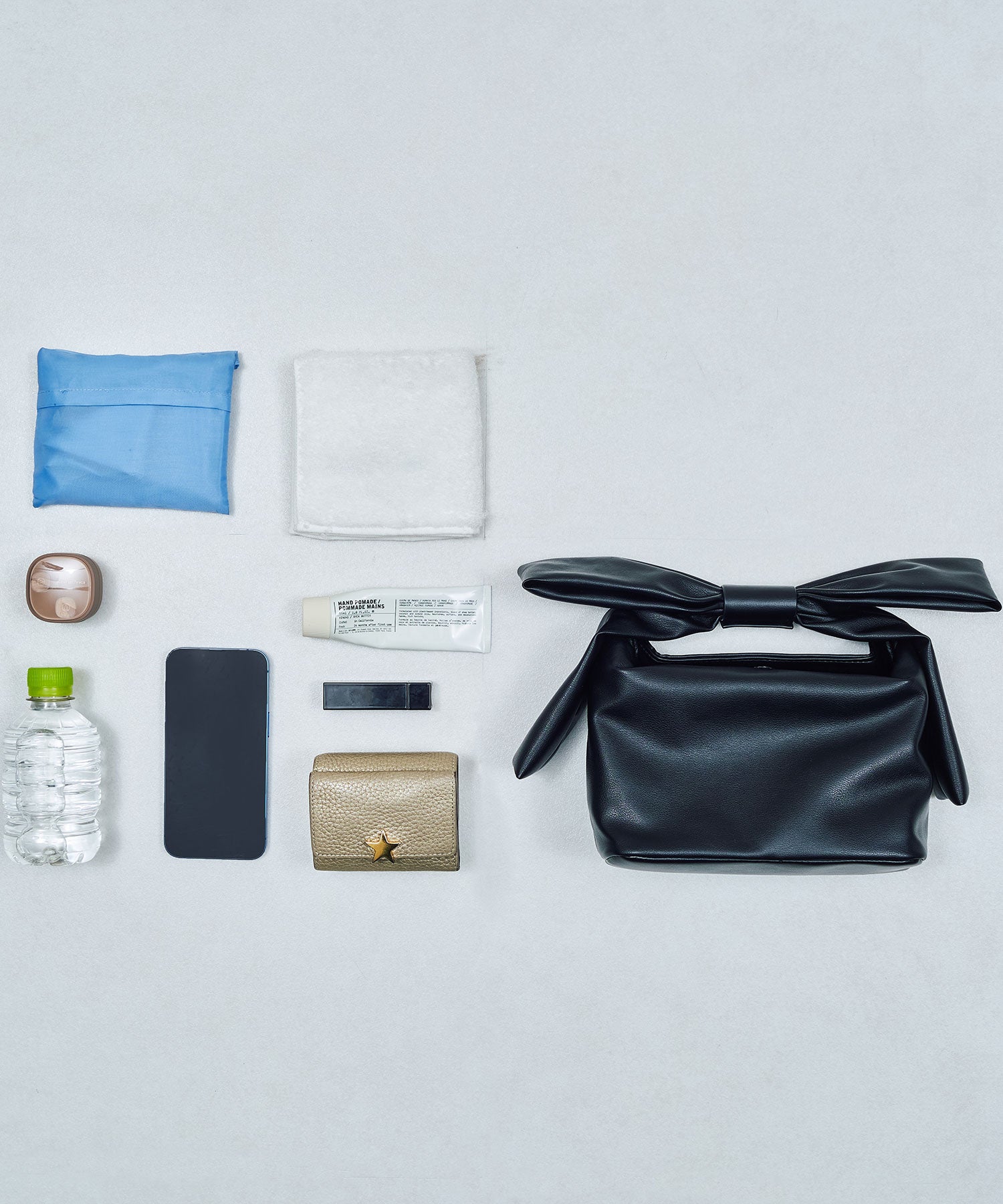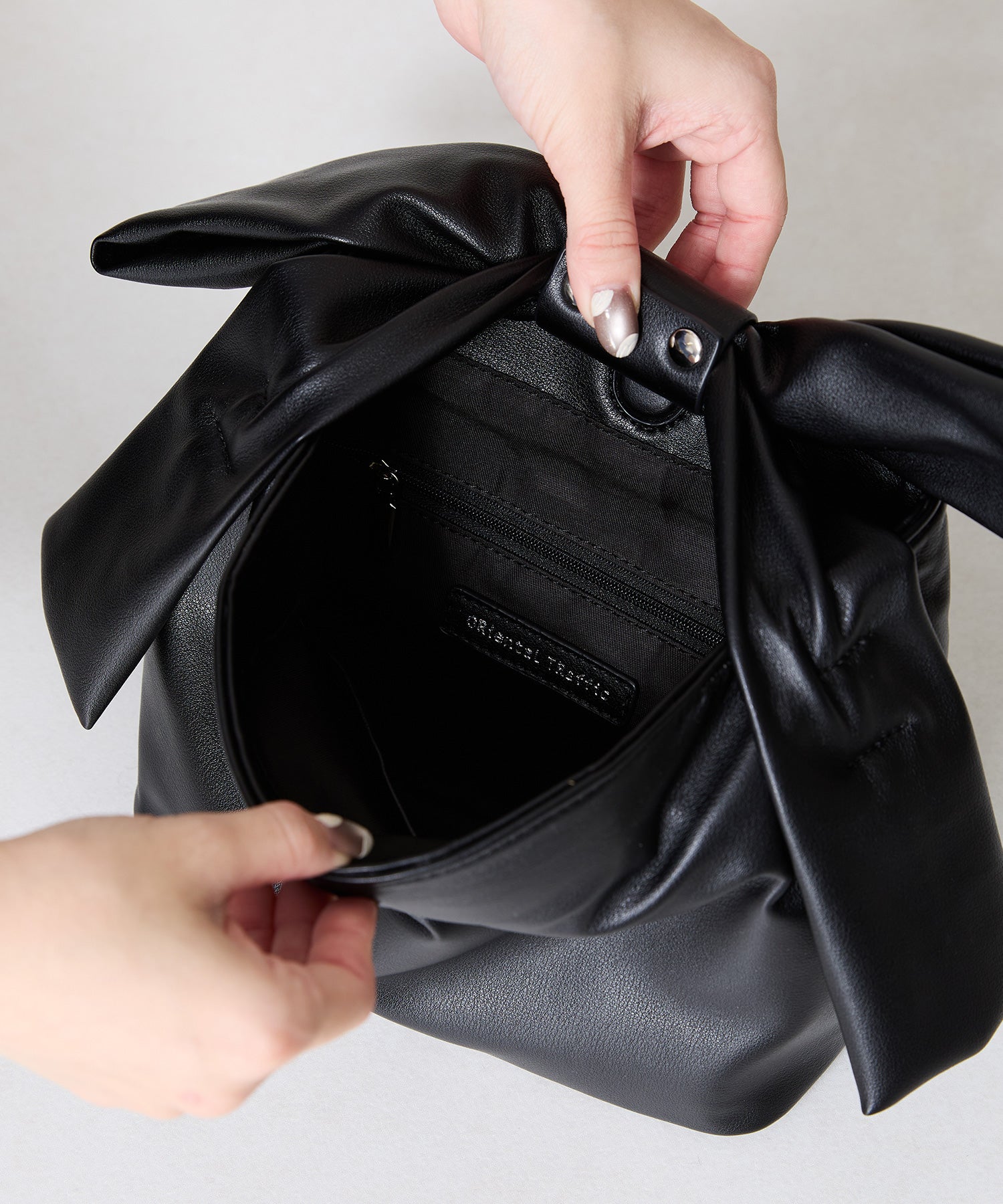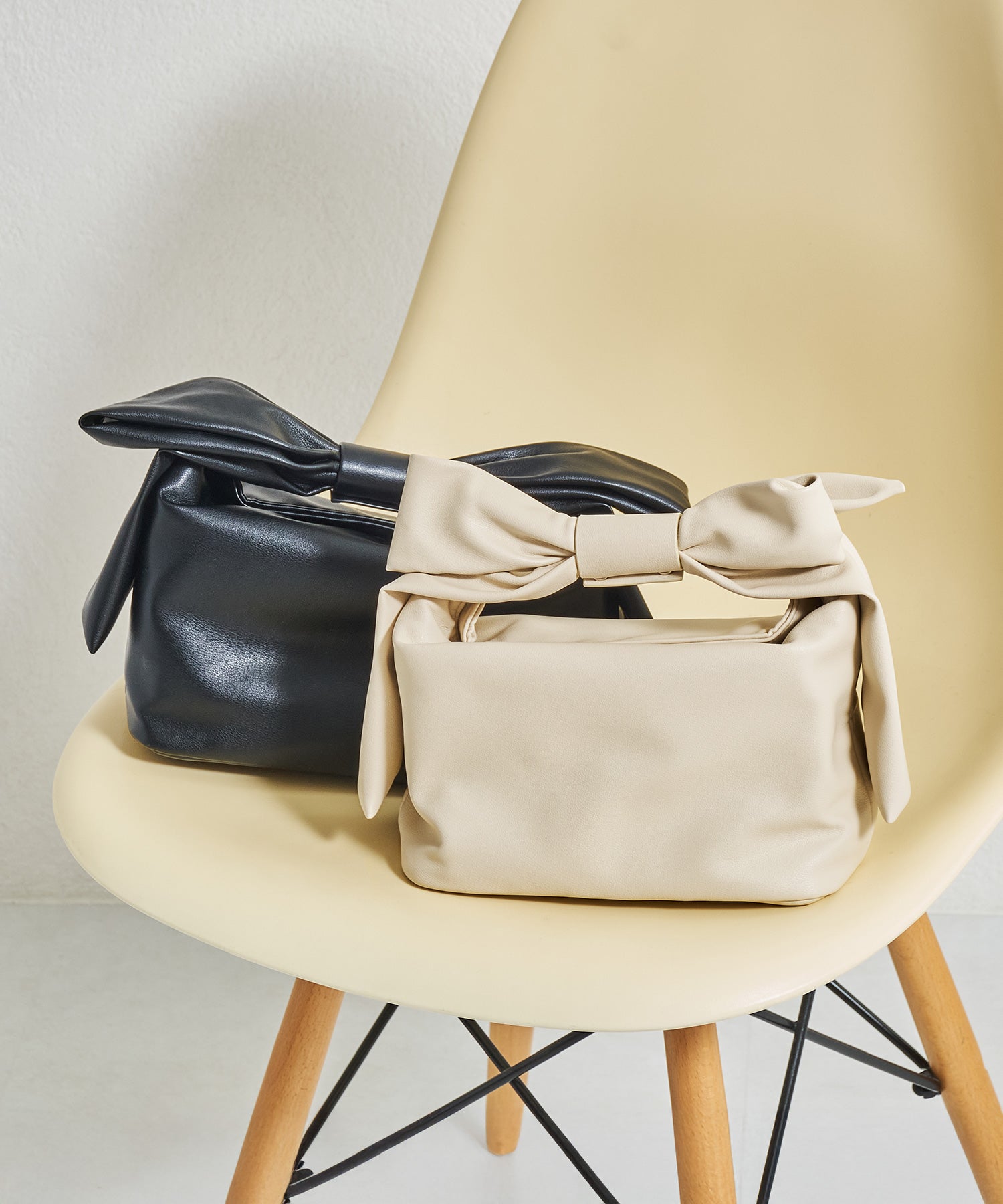 持ち手のリボンが存在感抜群のハンドバッグは、本体にマットな合皮素材を使用することで甘くなりすぎず大人っぽく持つことができ、カジュアルなコーデからレディなコーデまで幅広くマッチする。間口にはマグネットが付いており、中身が見えないので安心して持ち運びが出来る。横にすれば500mlのペットボトルも入る使い勝手の良いサイズが魅力的。