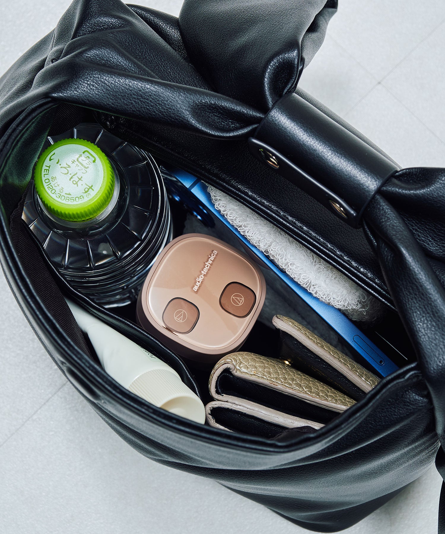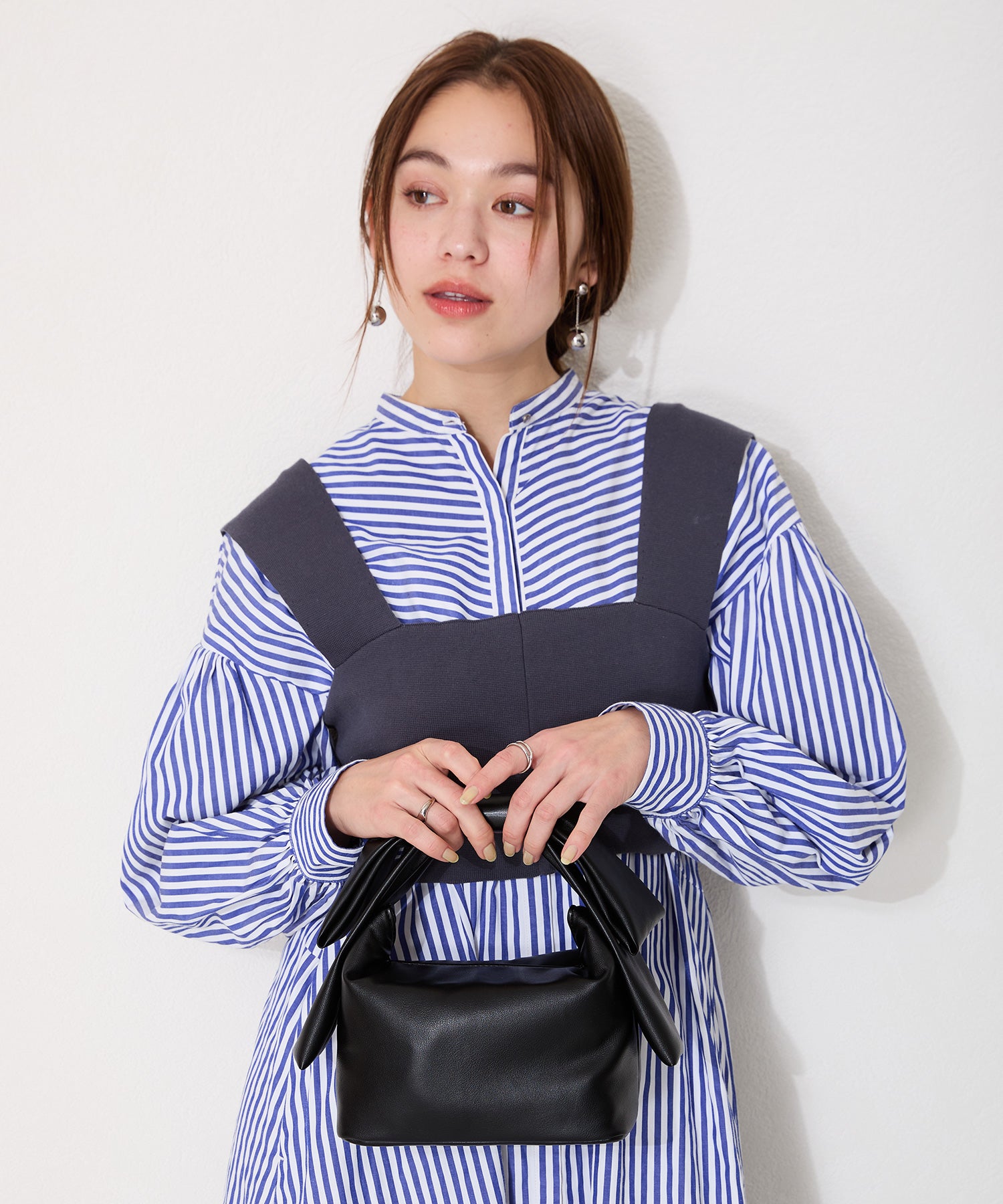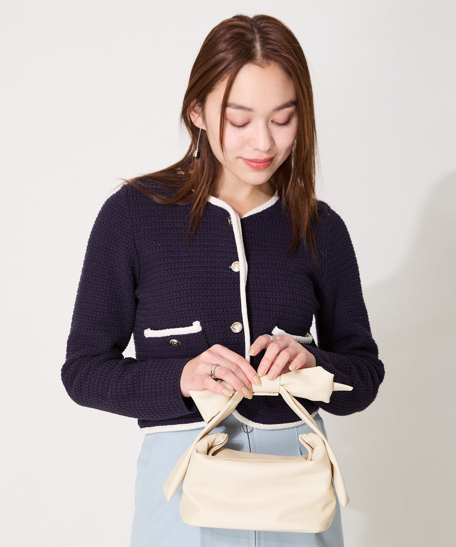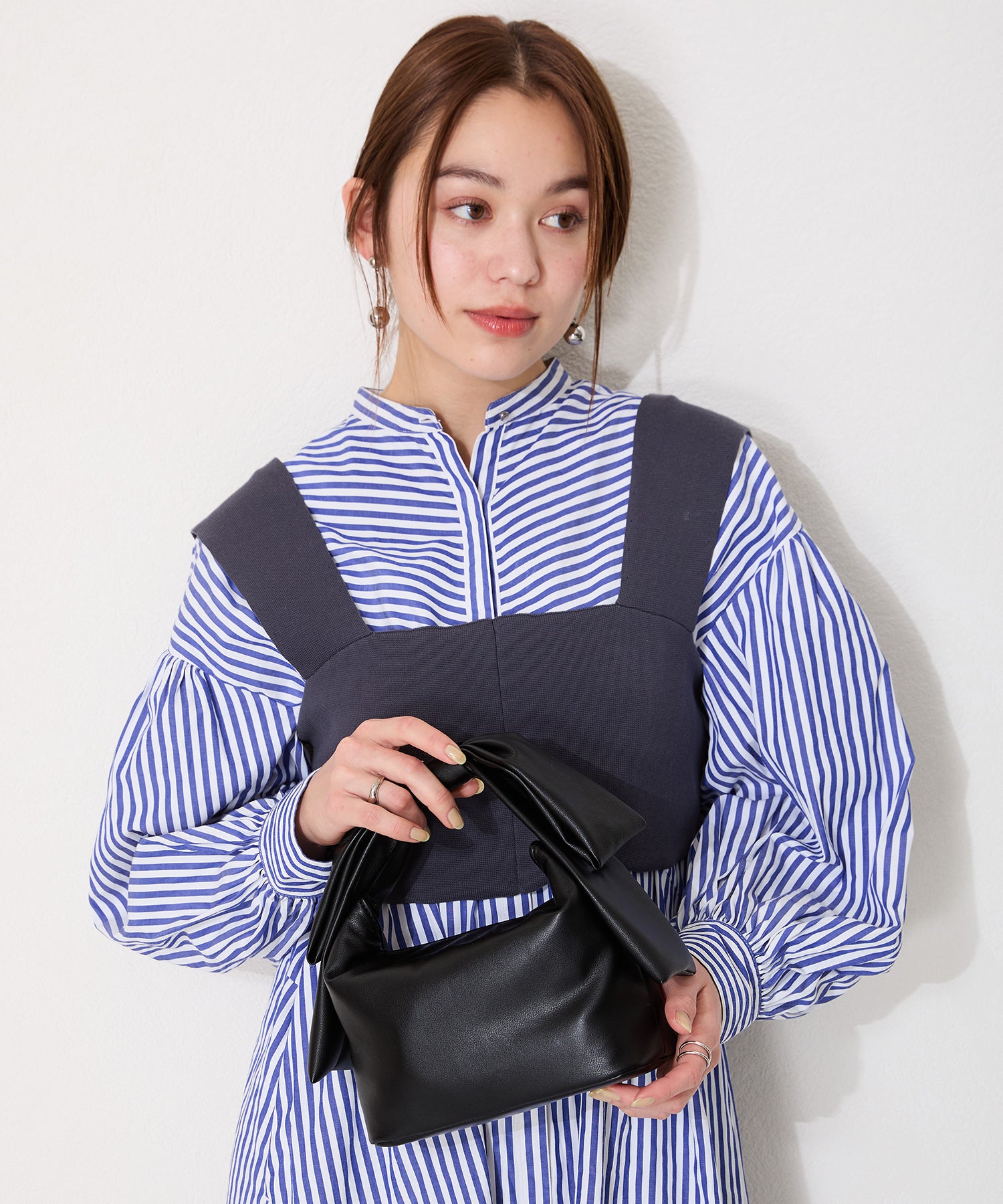 持ち手のリボンが存在感抜群のハンドバッグは、本体にマットな合皮素材を使用することで甘くなりすぎず大人っぽく持つことができ、カジュアルなコーデからレディなコーデまで幅広くマッチする。間口にはマグネットが付いており、中身が見えないので安心して持ち運びが出来る。横にすれば500mlのペットボトルも入る使い勝手の良いサイズが魅力的。