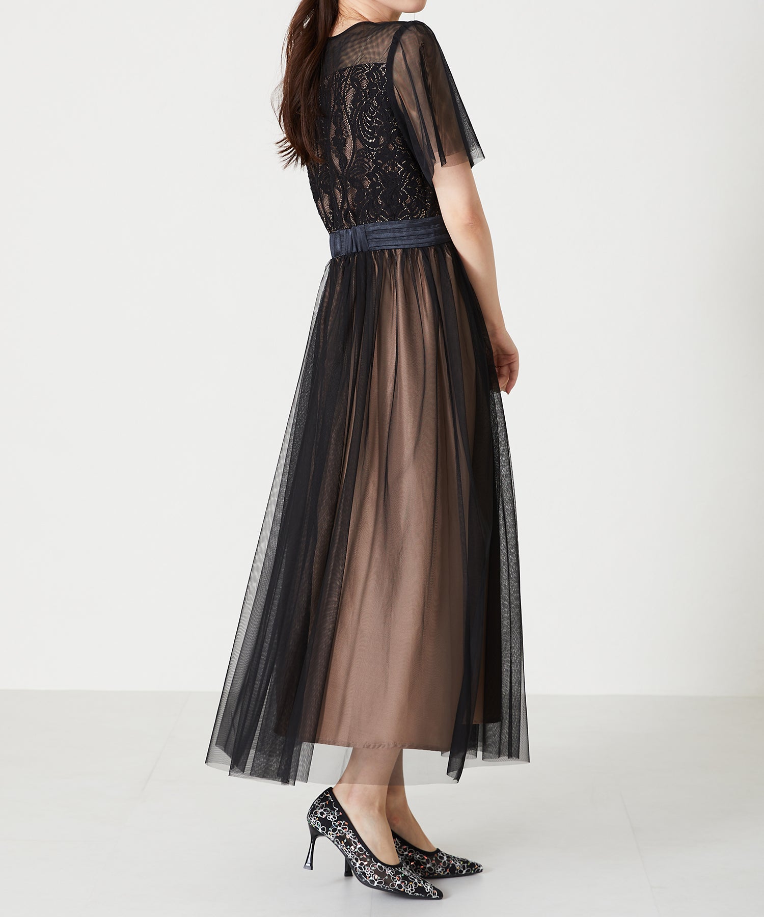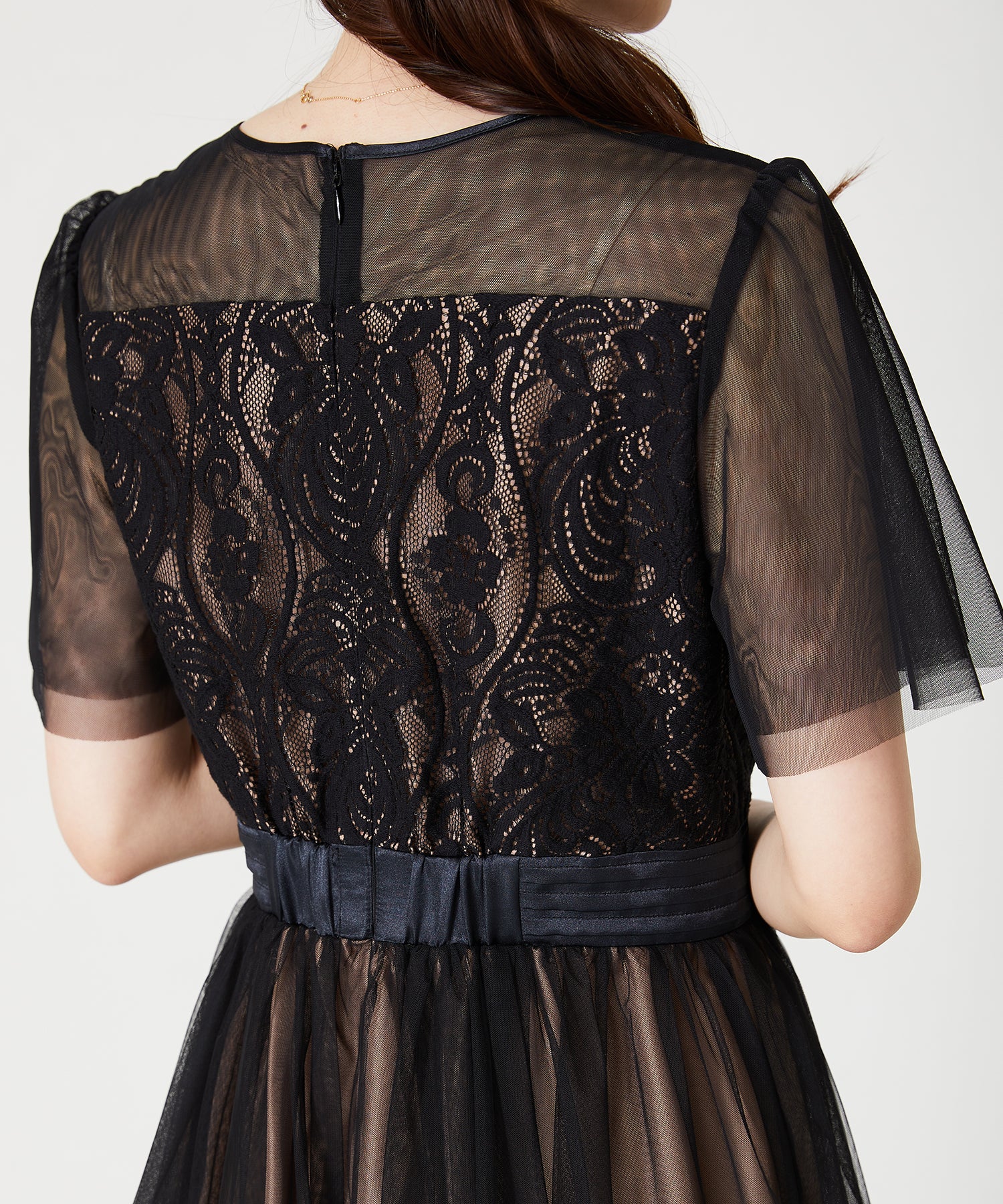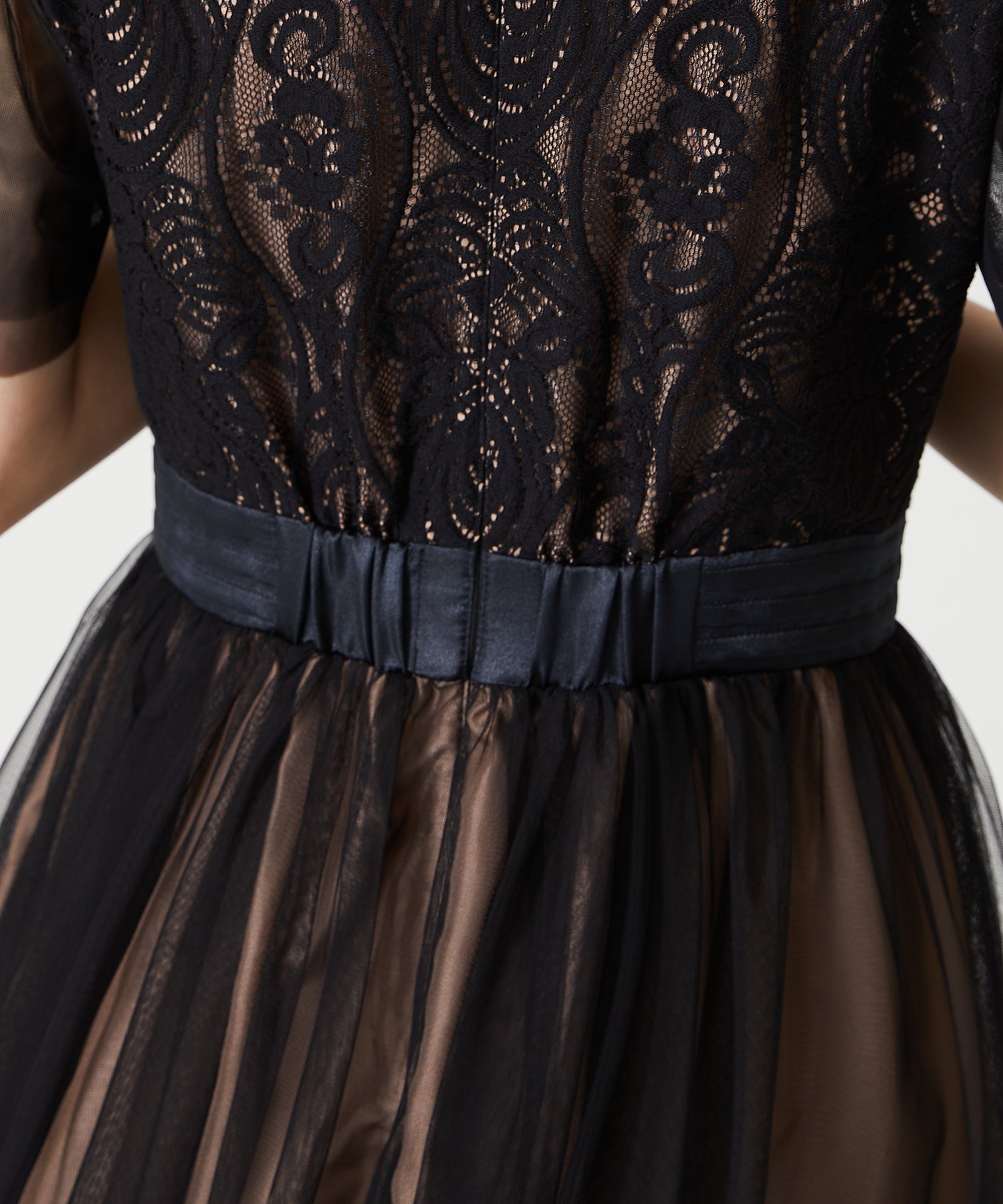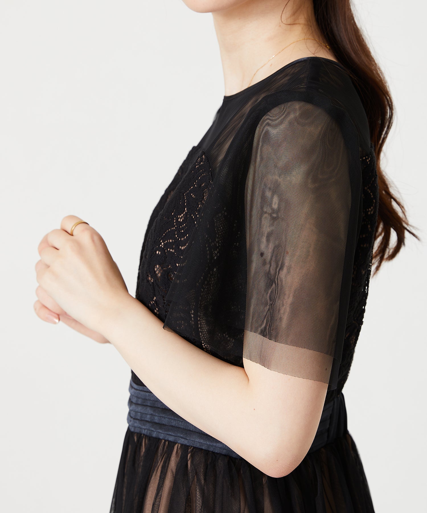 胸元の大柄レースが目を引くエレガントなワンピースは、ウエストのリボン位置を高くしたり、バイカラーにすることで腰回りが引き締まって見え、スタイルアップ効果抜群の1枚。軽やかな無地のチュール素材をベースにしているので動くと軽やかに揺れ、ふわっとしたボリューム感でフェミニンな印象にしてくれる。後ろ側にはファスナーを付けているので着脱もスムーズ。