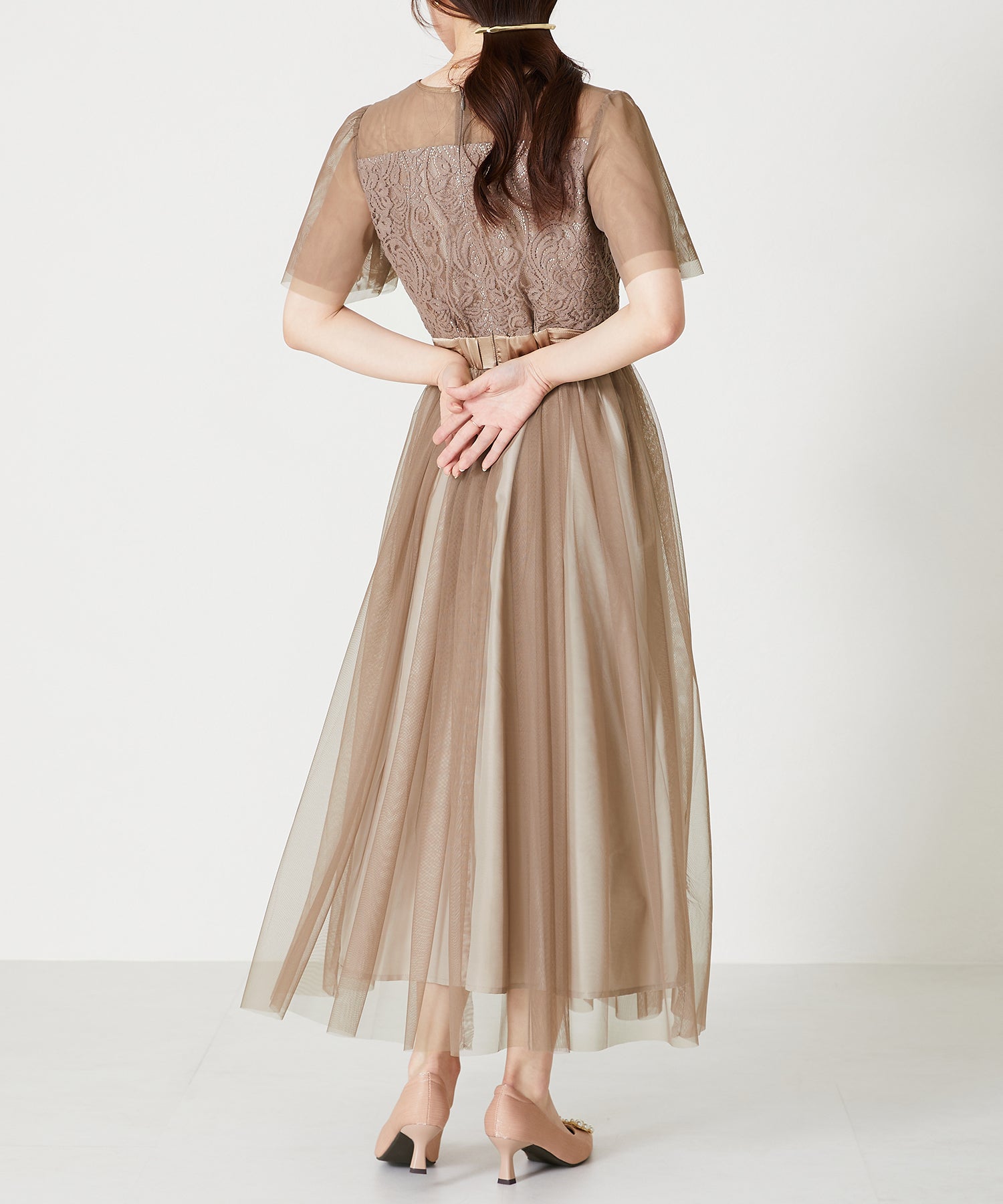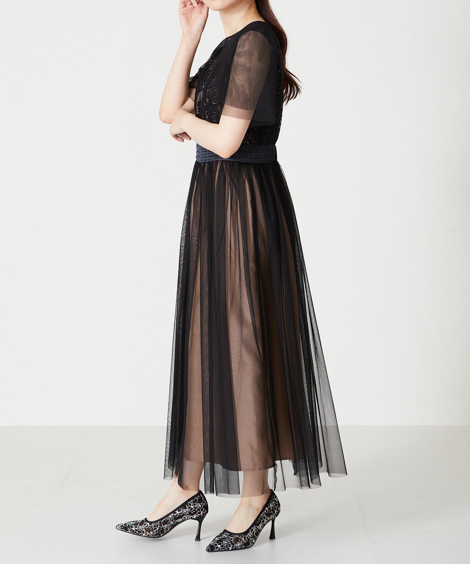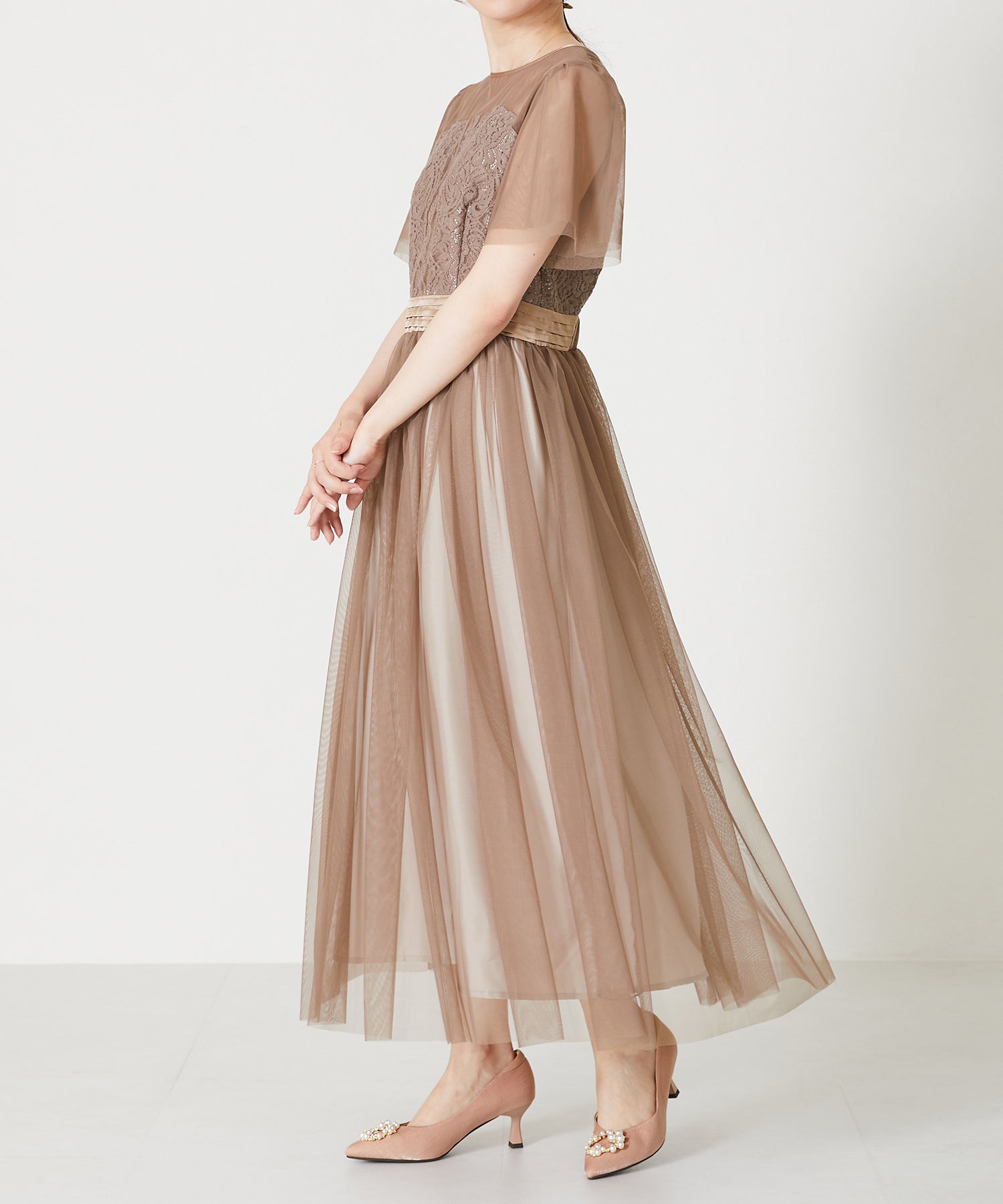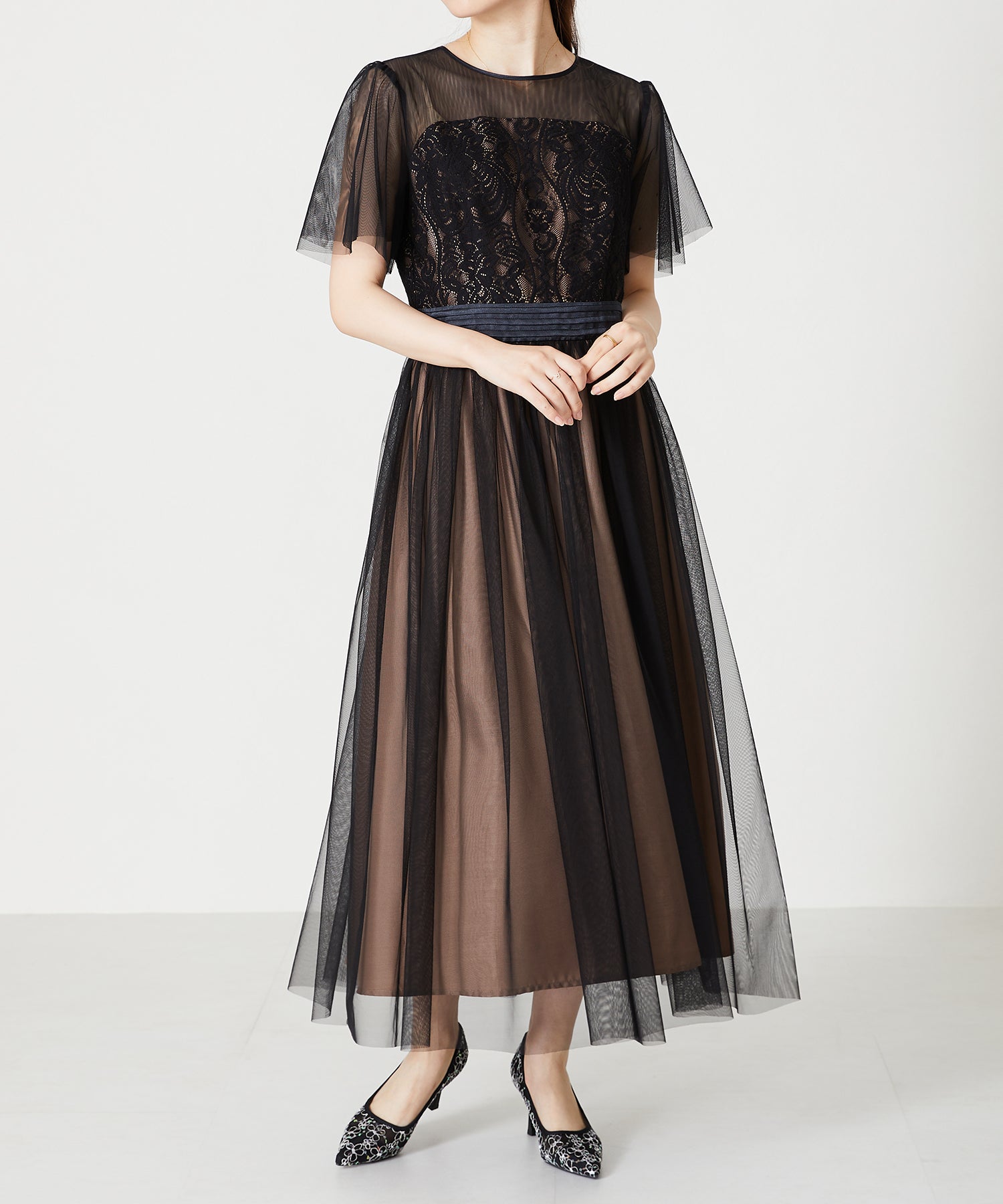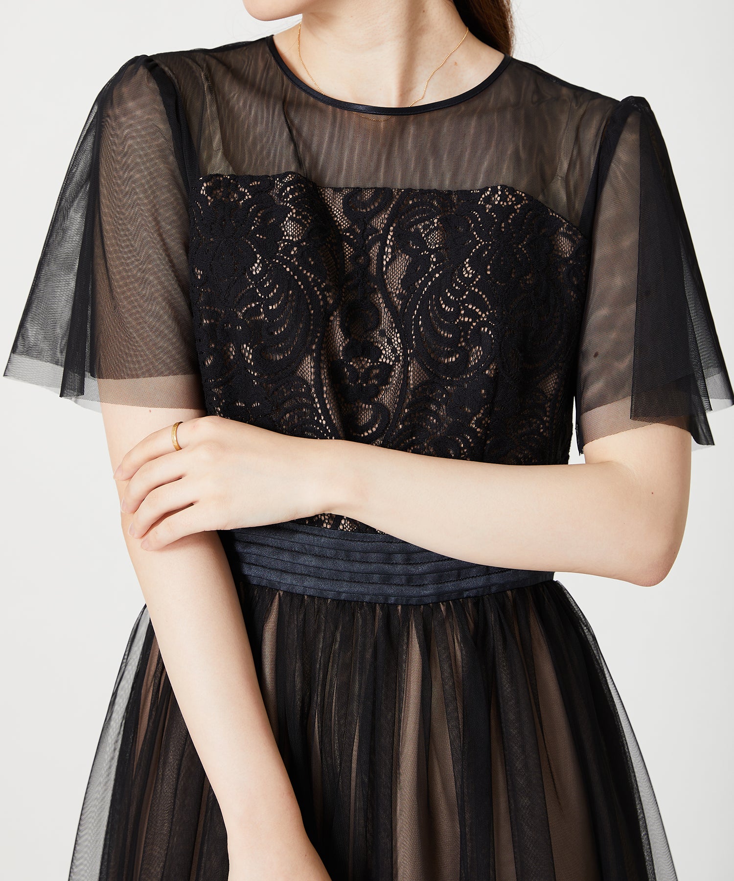 胸元の大柄レースが目を引くエレガントなワンピースは、ウエストのリボン位置を高くしたり、バイカラーにすることで腰回りが引き締まって見え、スタイルアップ効果抜群の1枚。軽やかな無地のチュール素材をベースにしているので動くと軽やかに揺れ、ふわっとしたボリューム感でフェミニンな印象にしてくれる。後ろ側にはファスナーを付けているので着脱もスムーズ。