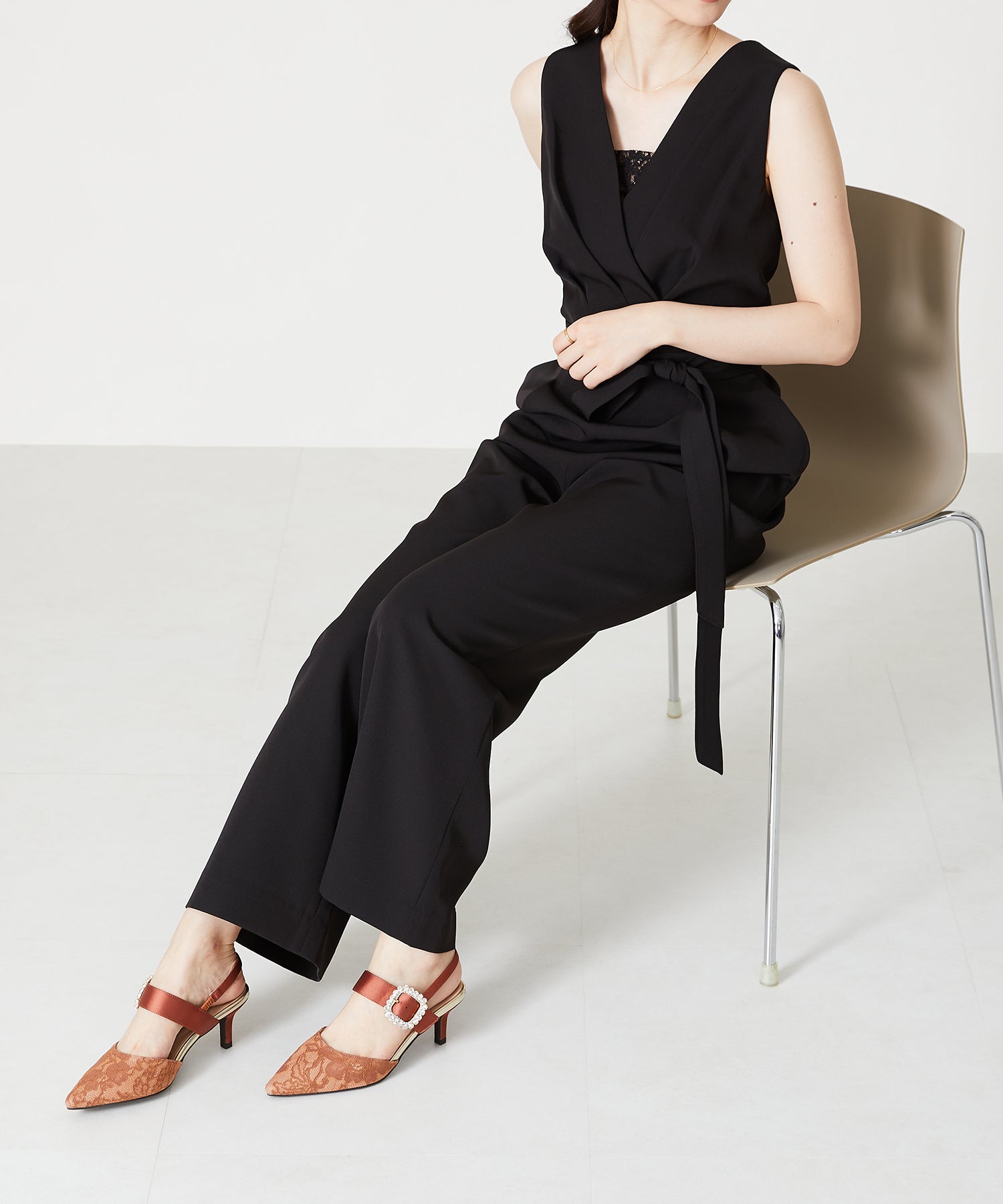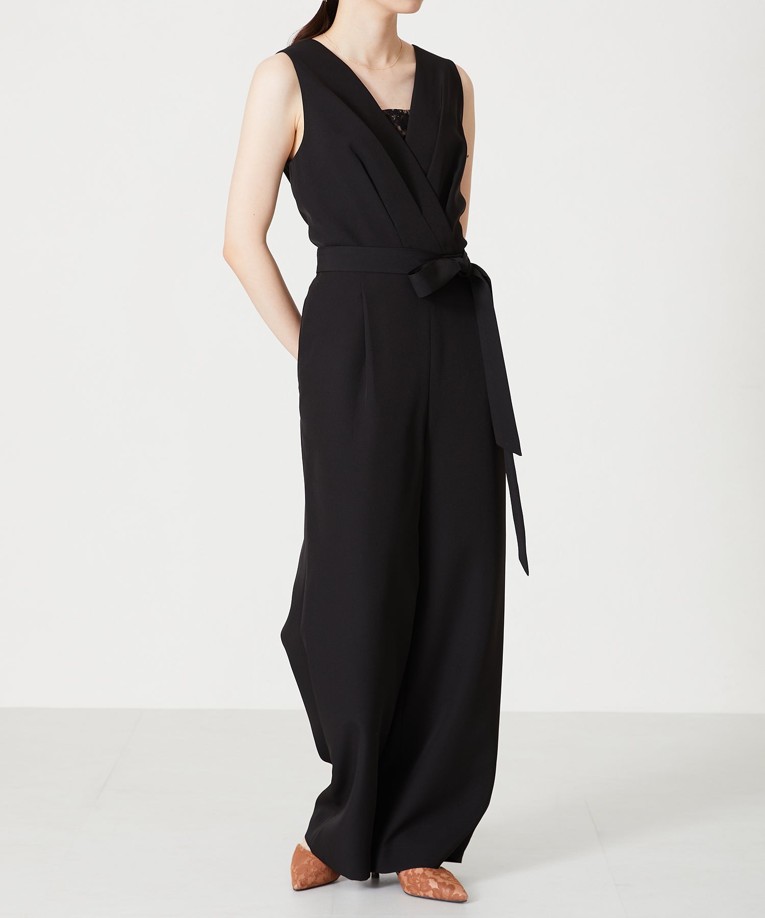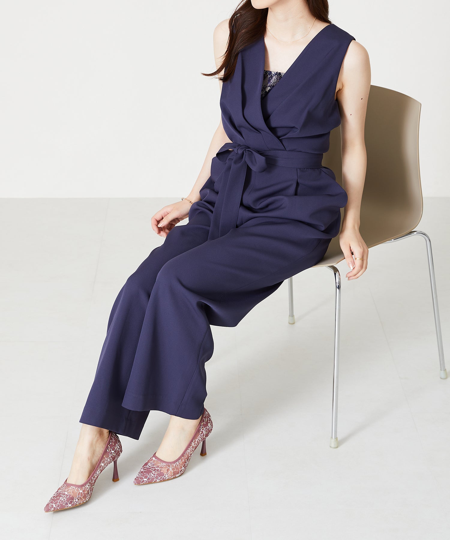 1枚で大人なスタイルを作れるコンビネゾンは、胸元から見えるさりげないレース生地や腰に巻くリボンベルトが女性らしさをぐっと高めてくれる。