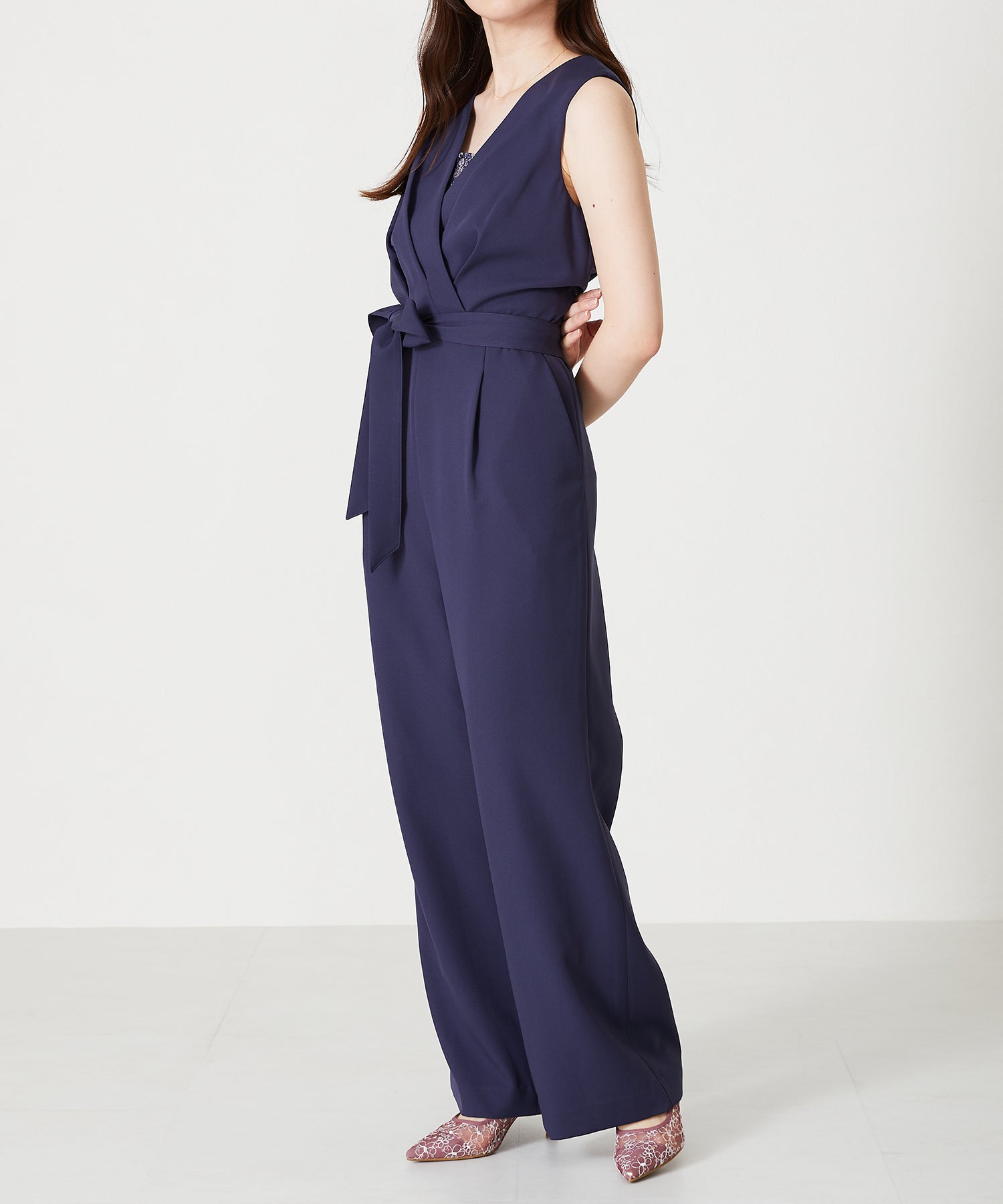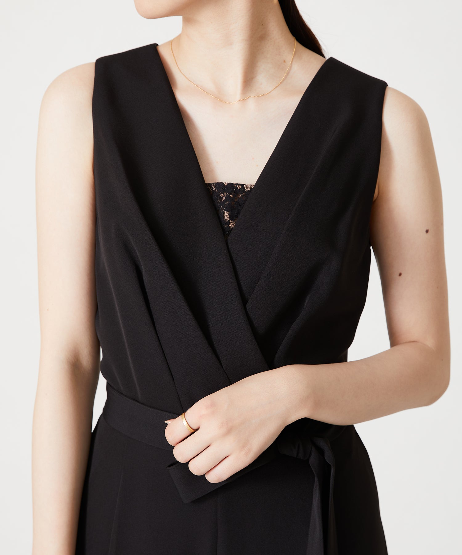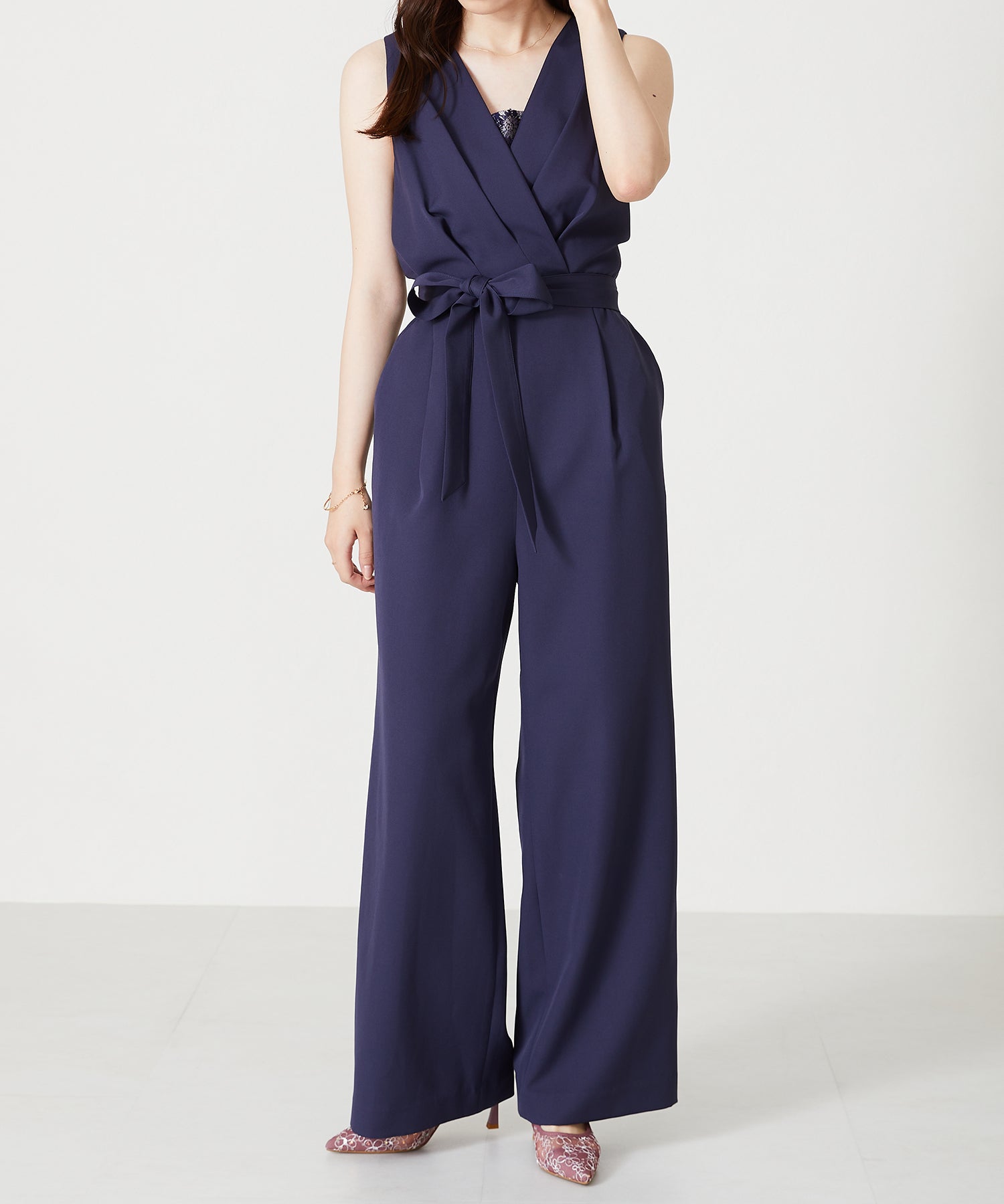 1枚で大人なスタイルを作れるコンビネゾンは、胸元から見えるさりげないレース生地や腰に巻くリボンベルトが女性らしさをぐっと高めてくれる。
