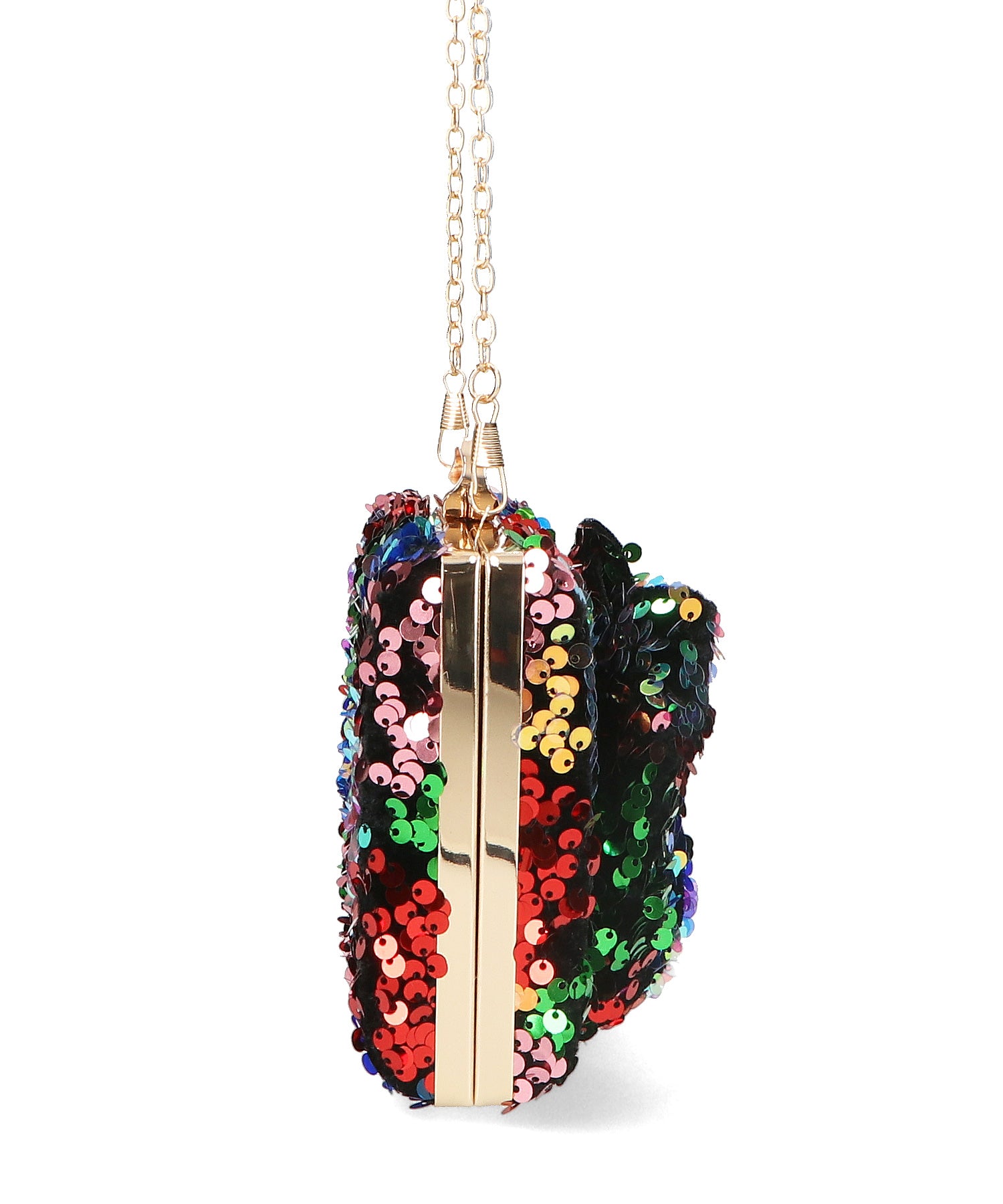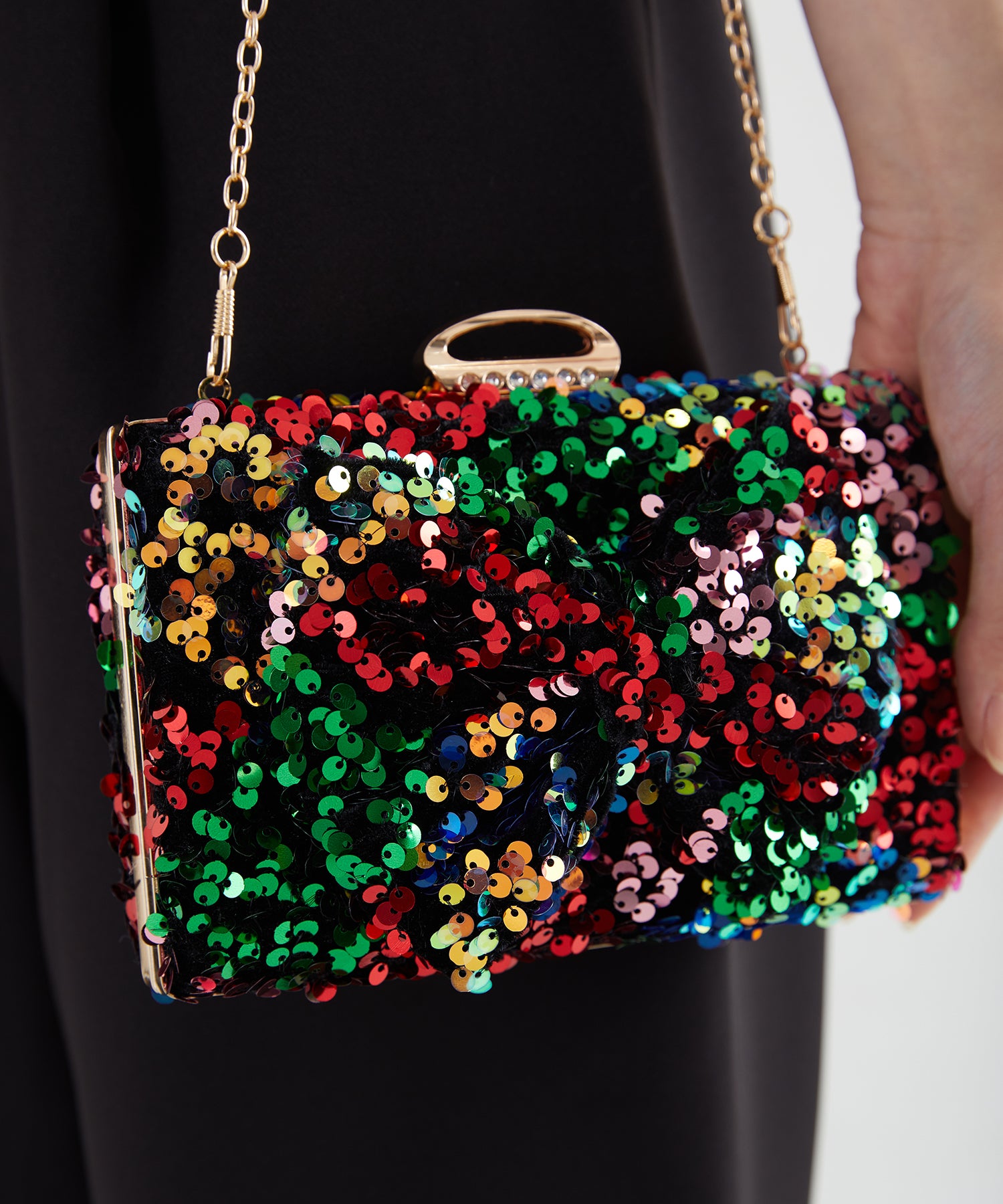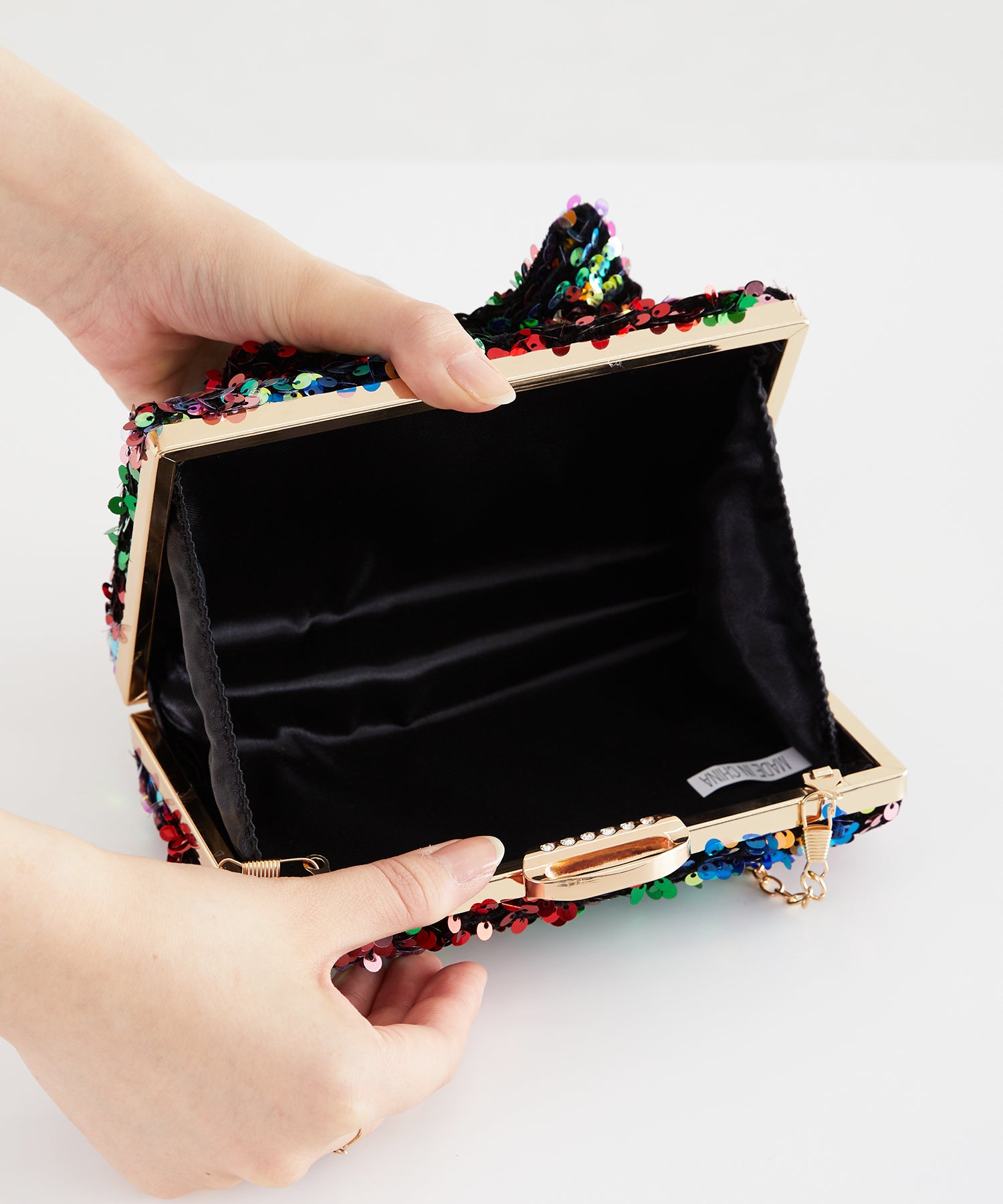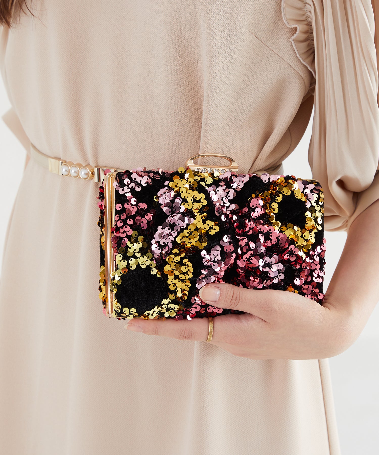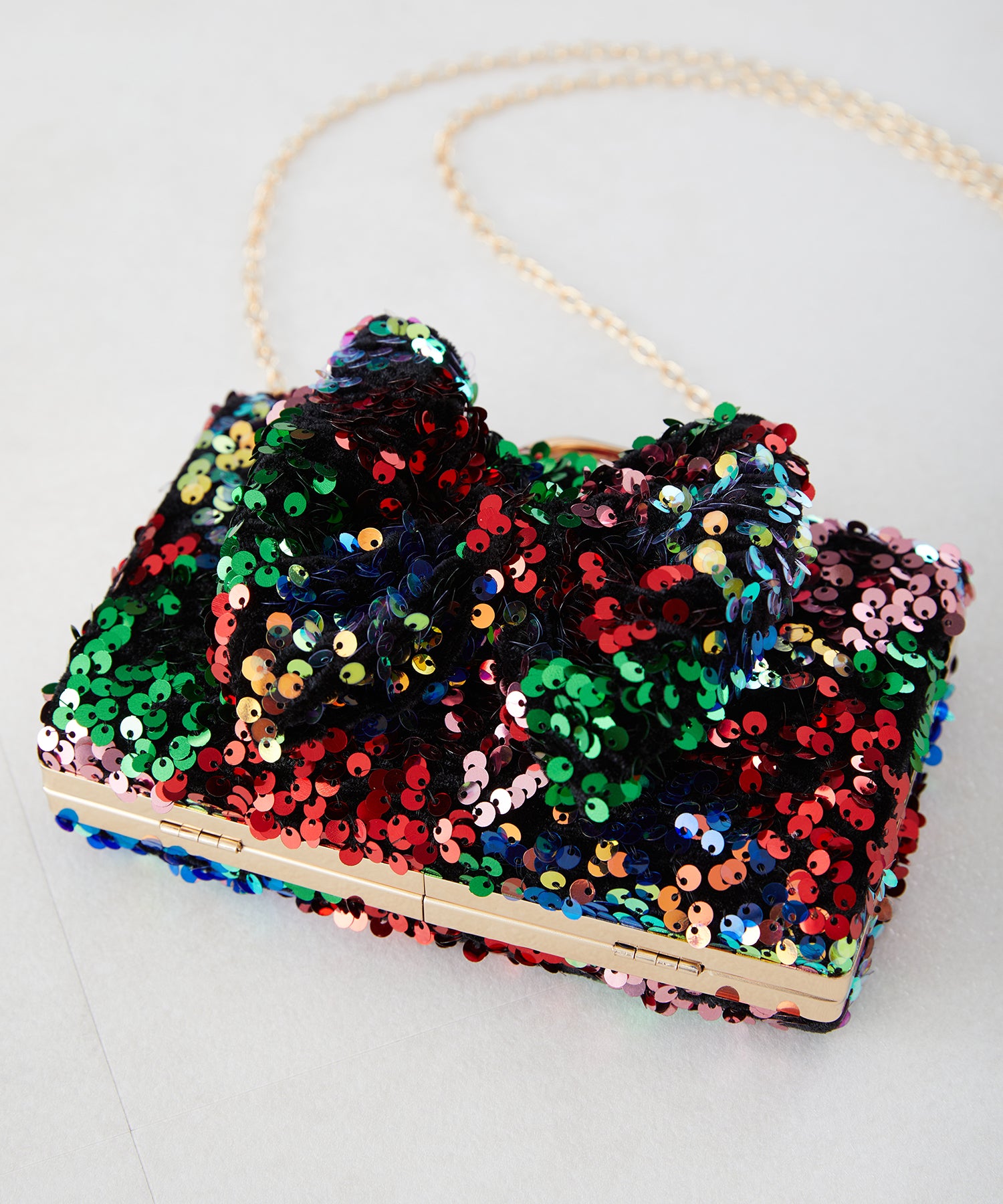 カラフルなスパンコールと大振りなリボンモチーフデザインが目を惹く、とことん可愛いクラッチバッグ。ラインストーン付きの留め具で開け閉めもしやすく、コンパクトながらも収納力抜群。スタイリングに合わせて持ち替え出来るショルダーチェーン付き。