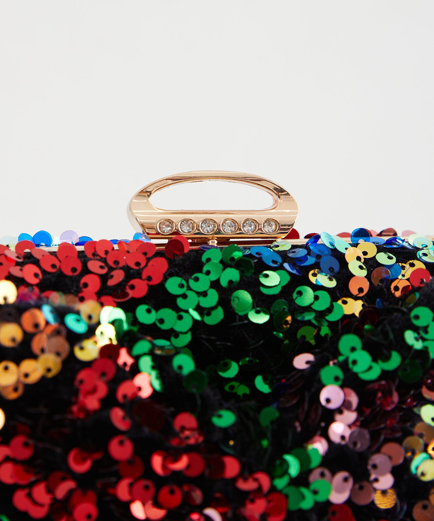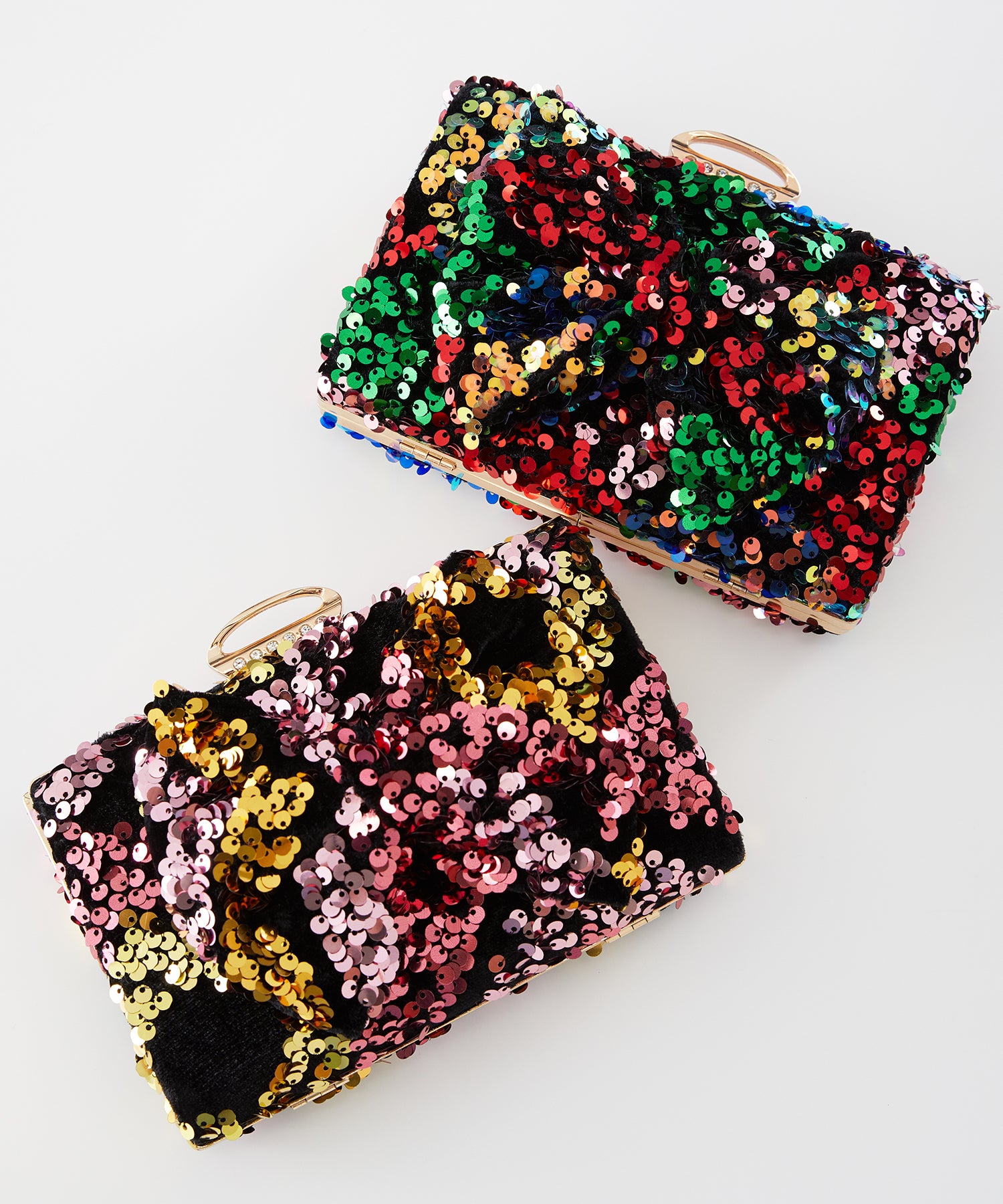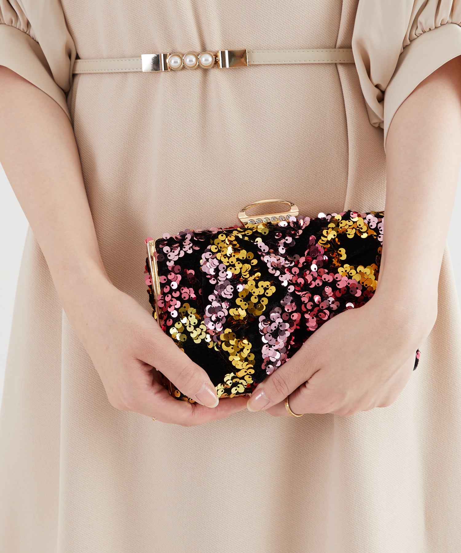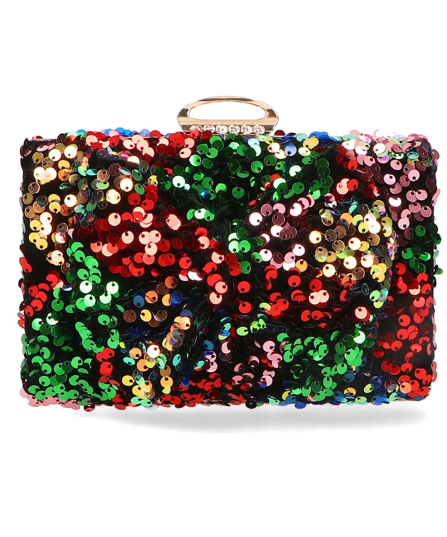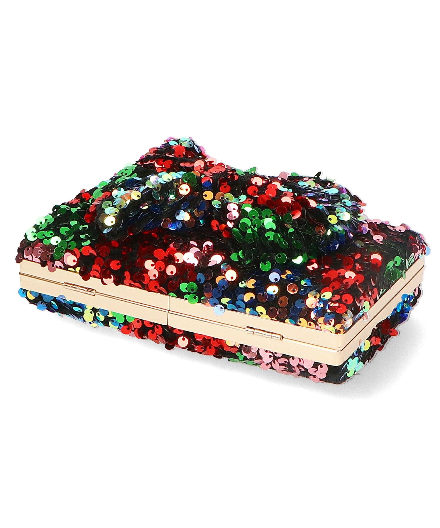 カラフルなスパンコールと大振りなリボンモチーフデザインが目を惹く、とことん可愛いクラッチバッグ。ラインストーン付きの留め具で開け閉めもしやすく、コンパクトながらも収納力抜群。スタイリングに合わせて持ち替え出来るショルダーチェーン付き。