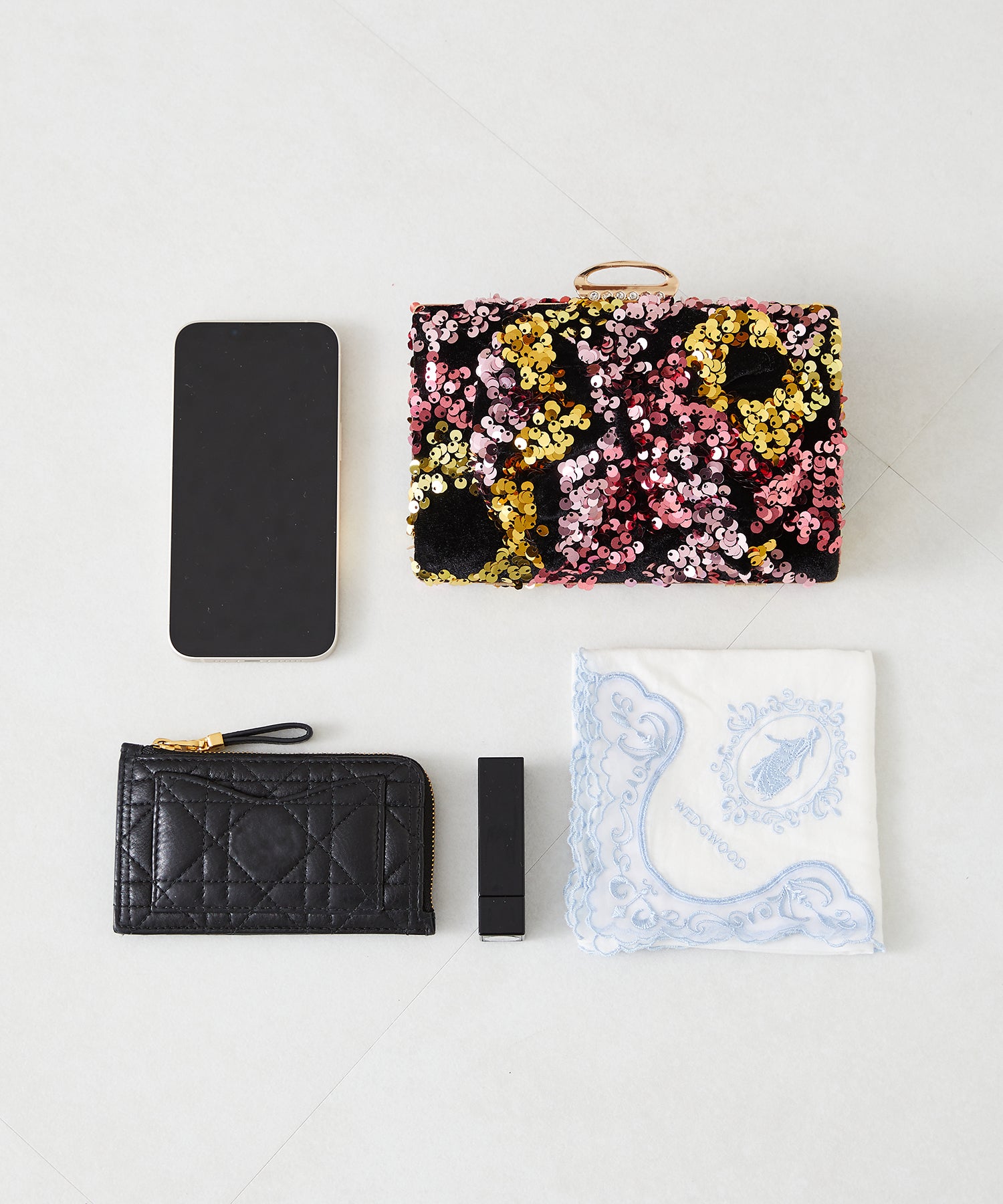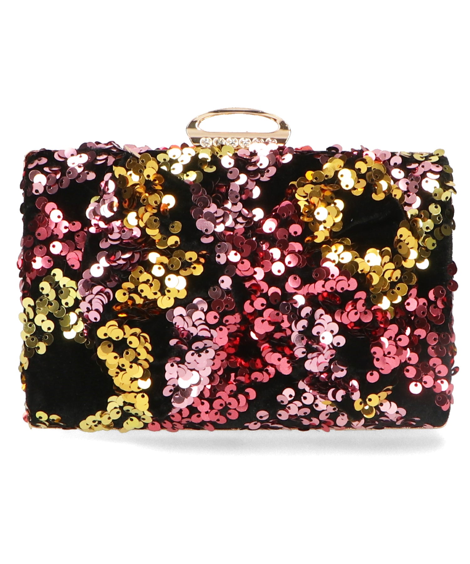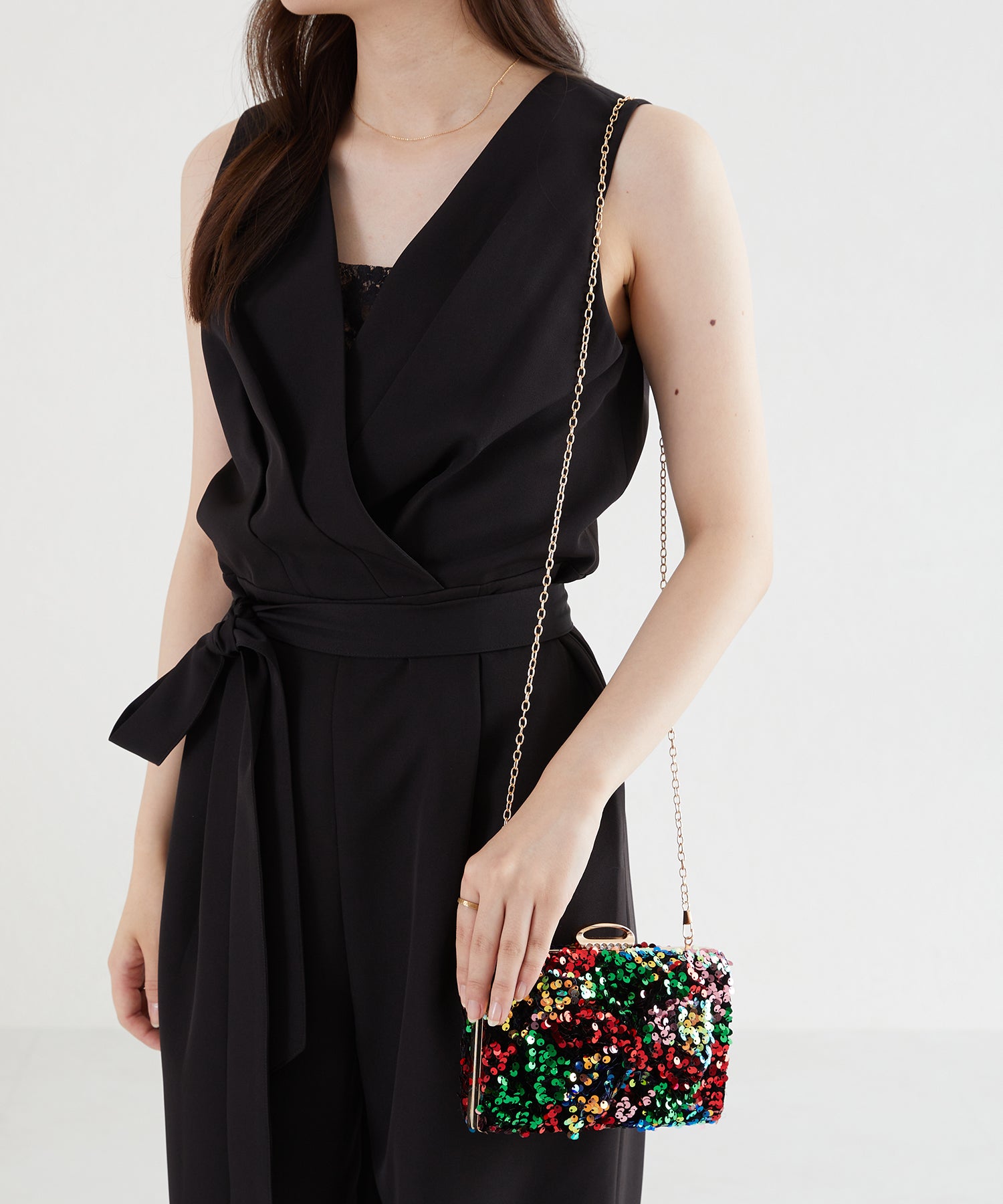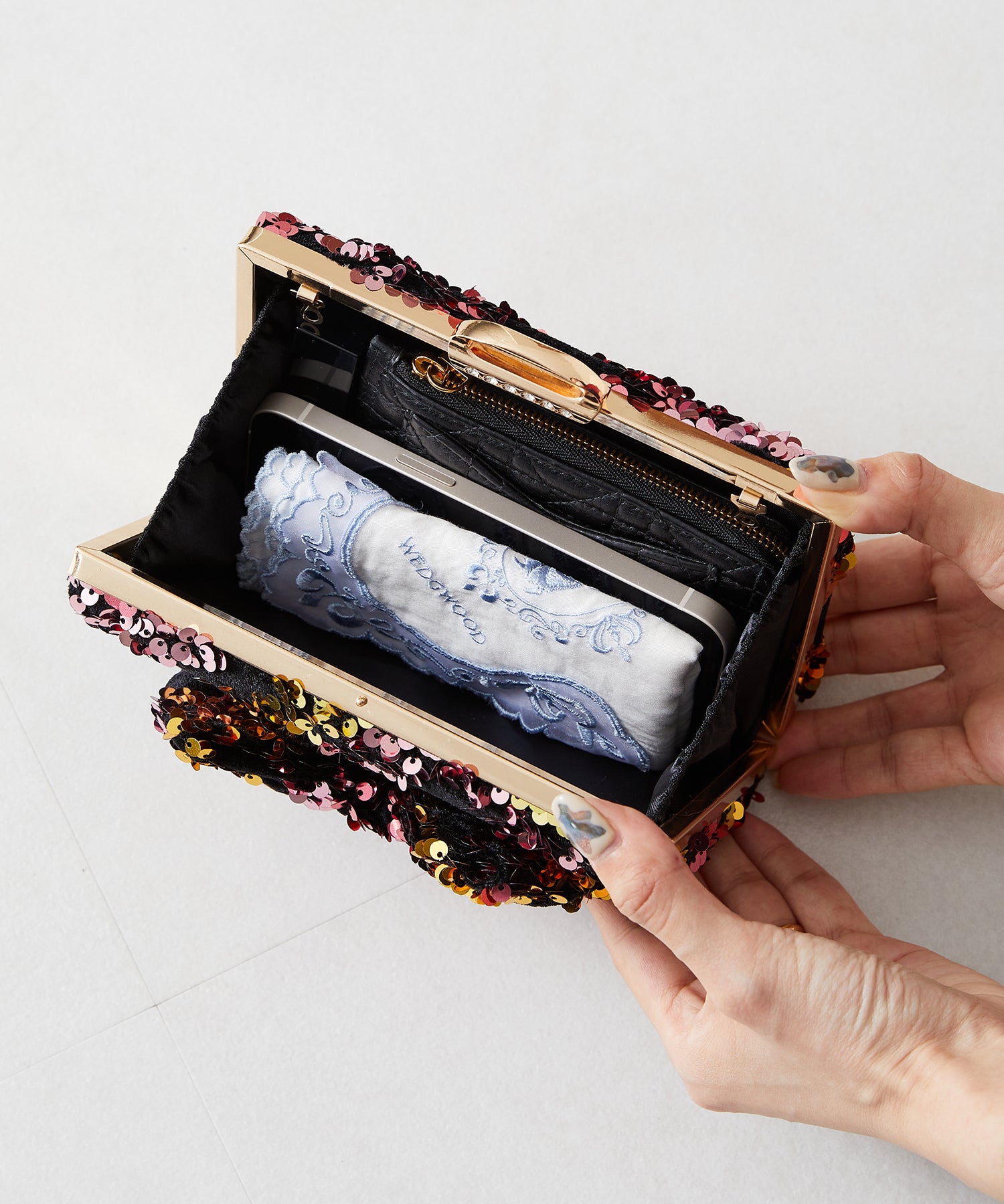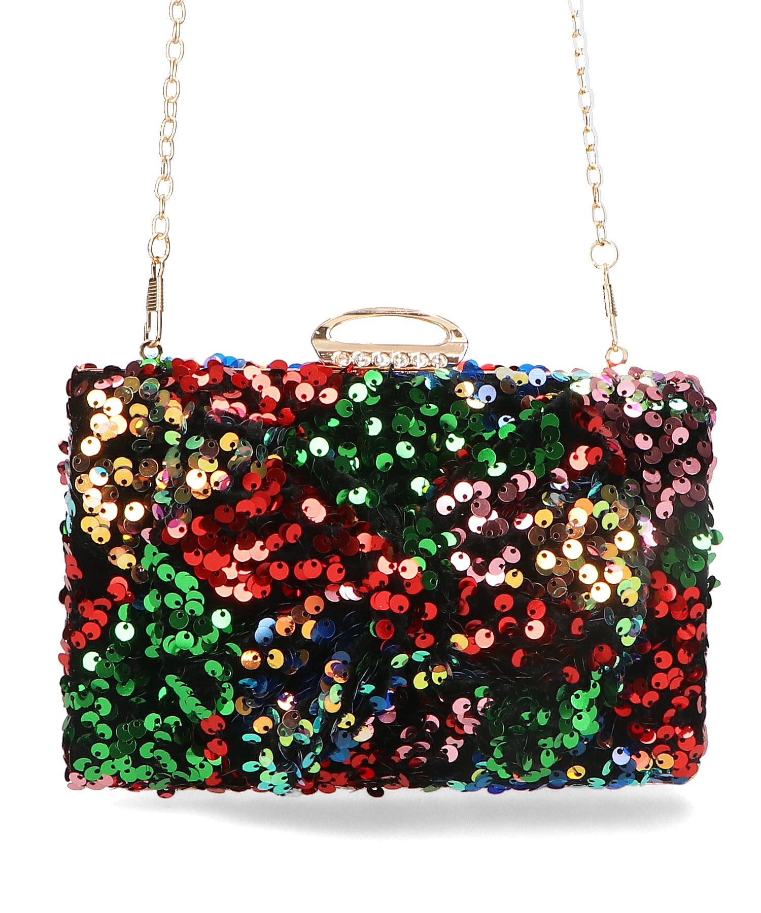 カラフルなスパンコールと大振りなリボンモチーフデザインが目を惹く、とことん可愛いクラッチバッグ。ラインストーン付きの留め具で開け閉めもしやすく、コンパクトながらも収納力抜群。スタイリングに合わせて持ち替え出来るショルダーチェーン付き。