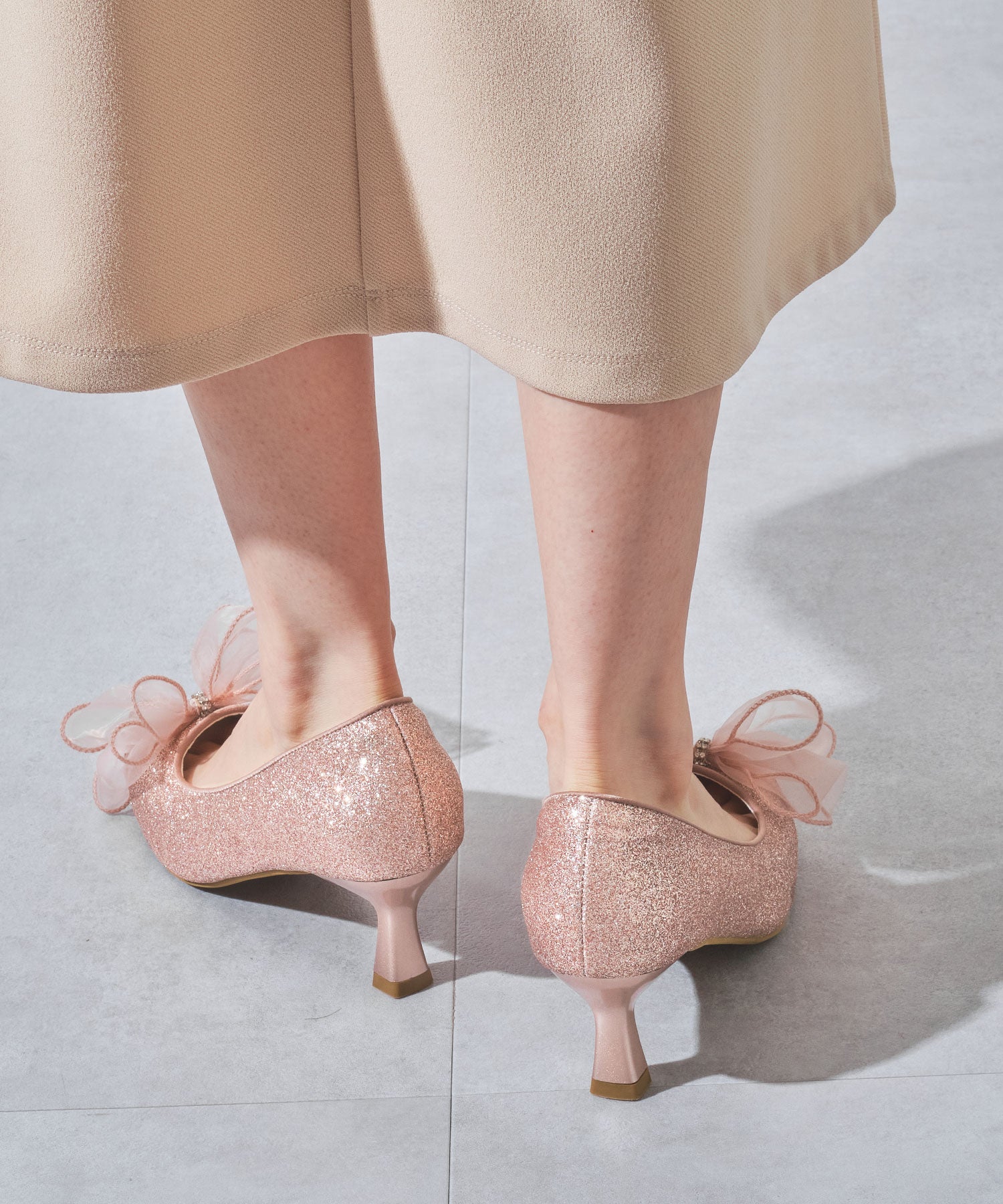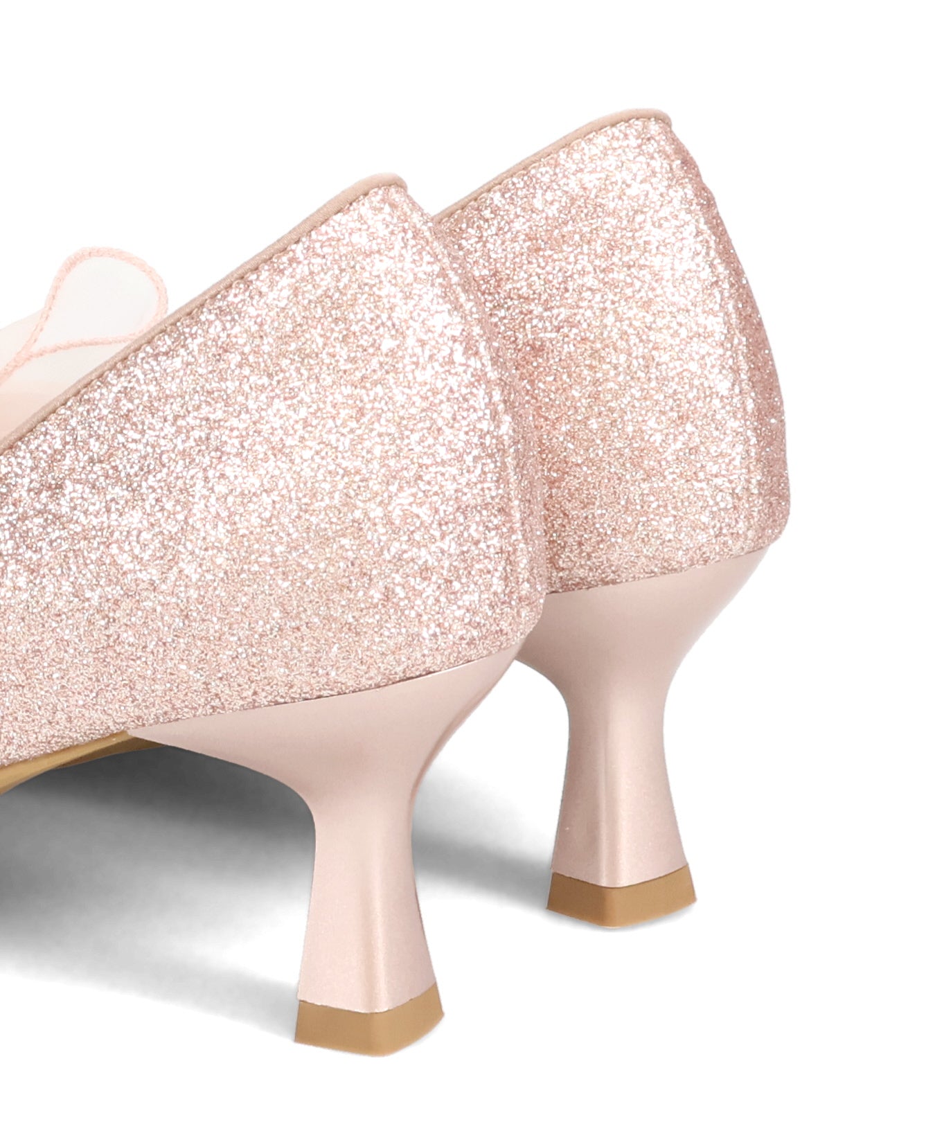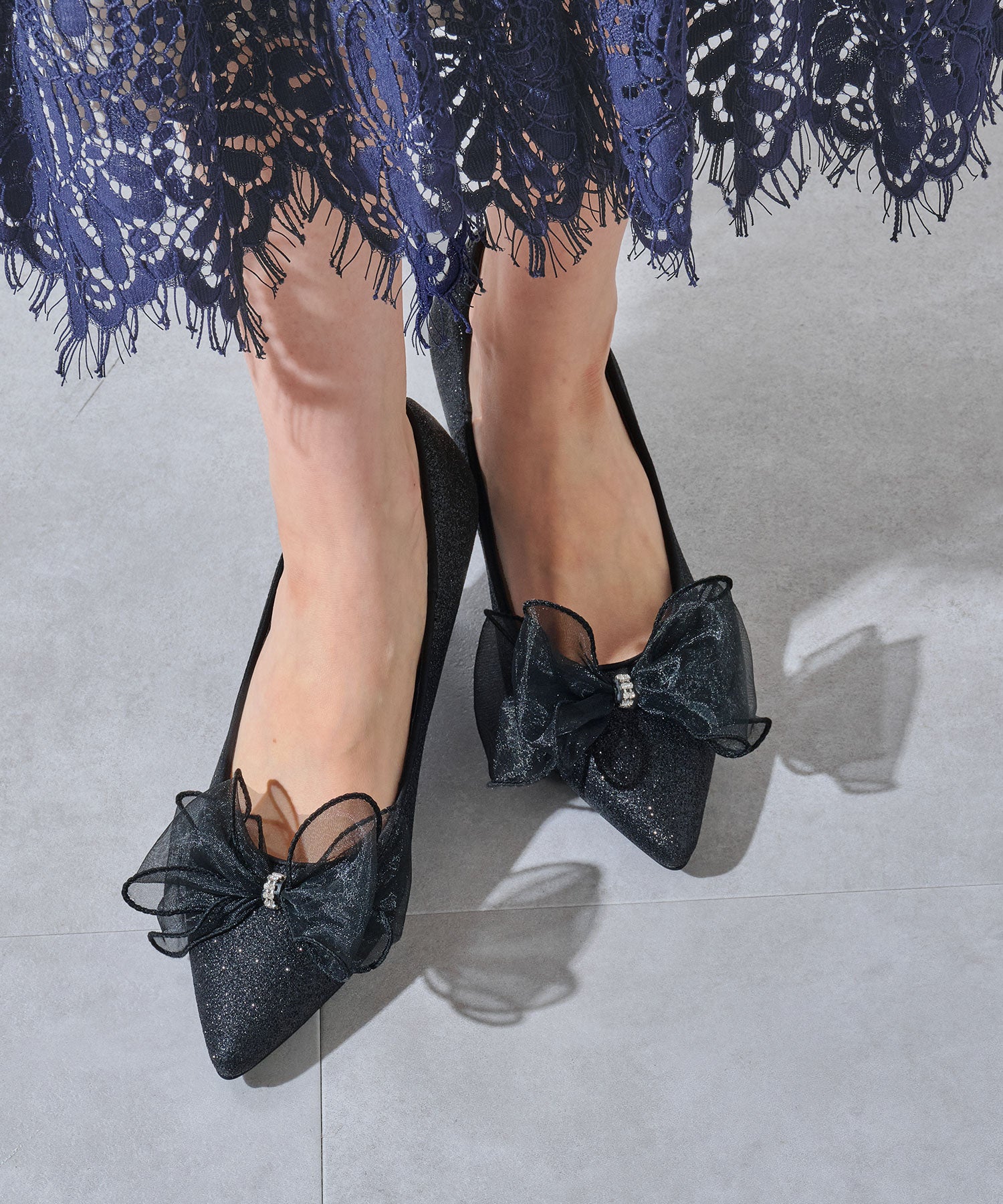 細かいグリッターが上品なパンプスは、ボリューム感たっぷりの大きなチュールリボンが華やかで特別な日の装いにぴったりなアイテム。リボンの中央には小粒のビジューをあしらってさらに高級感をプラス。シャープなポインテッドトゥでシルエットにこだわり、安定感のあるミドルヒールと踵部分のクッションが歩行をサポートしてくれる機能面にもこだわった1足。